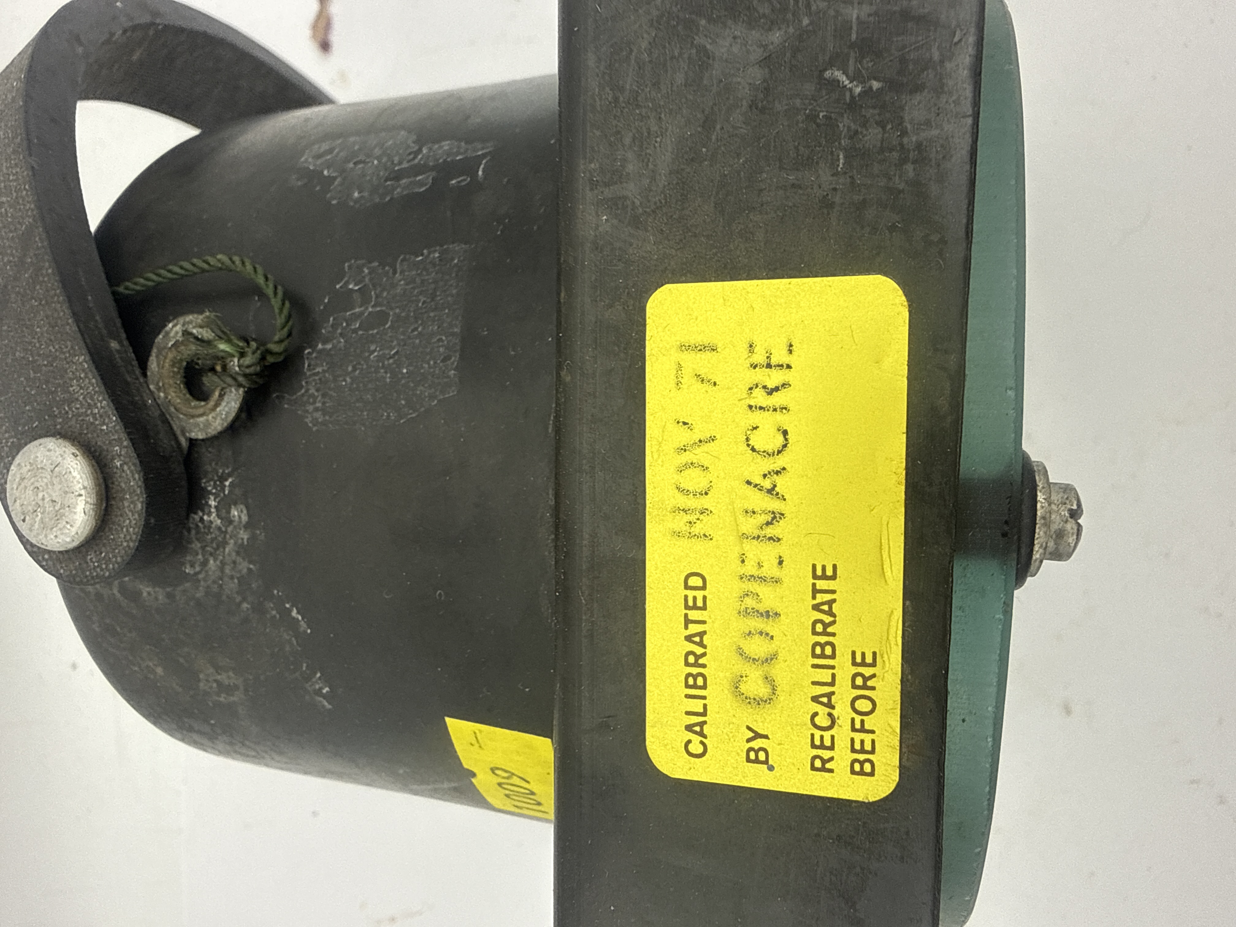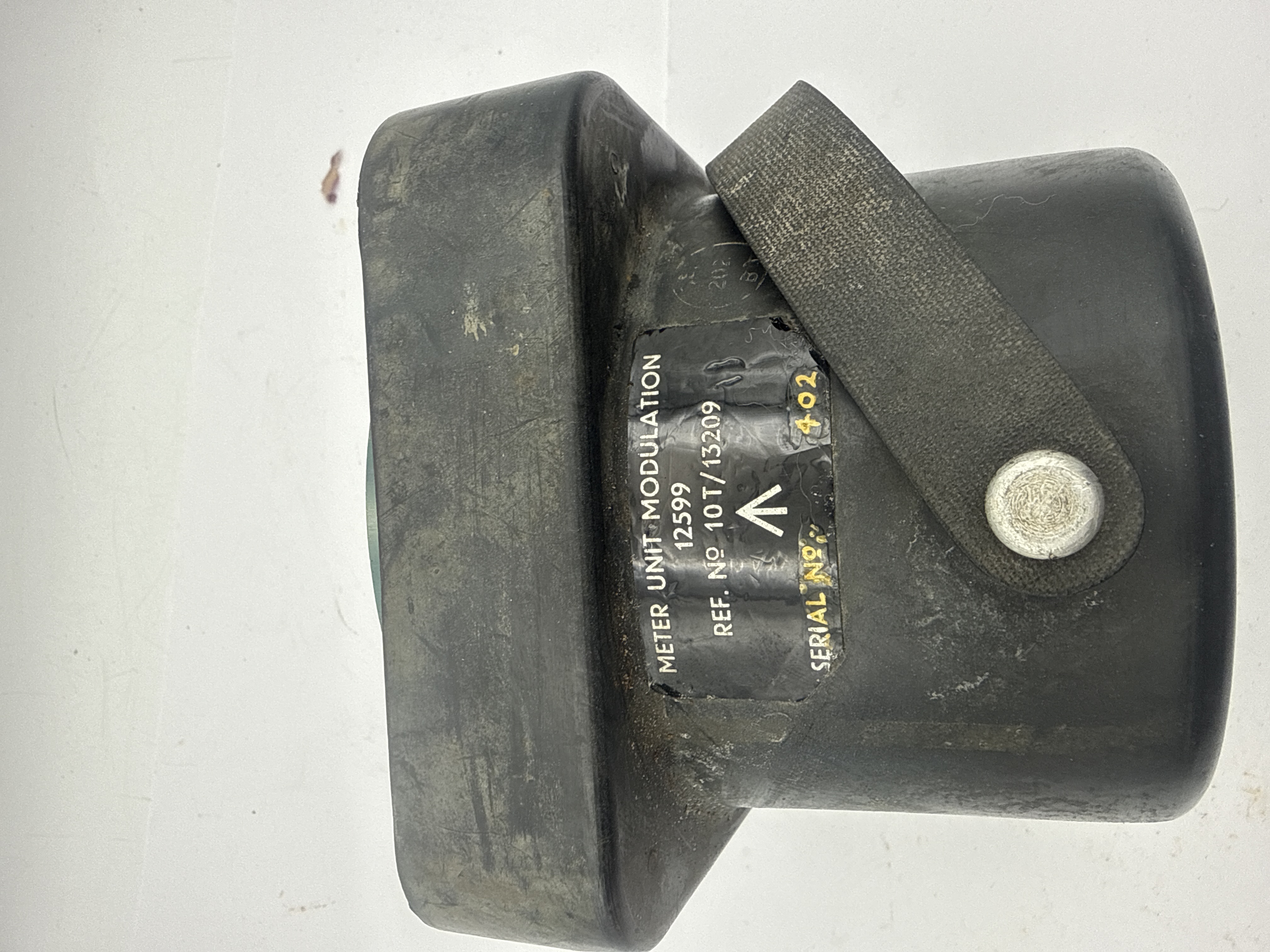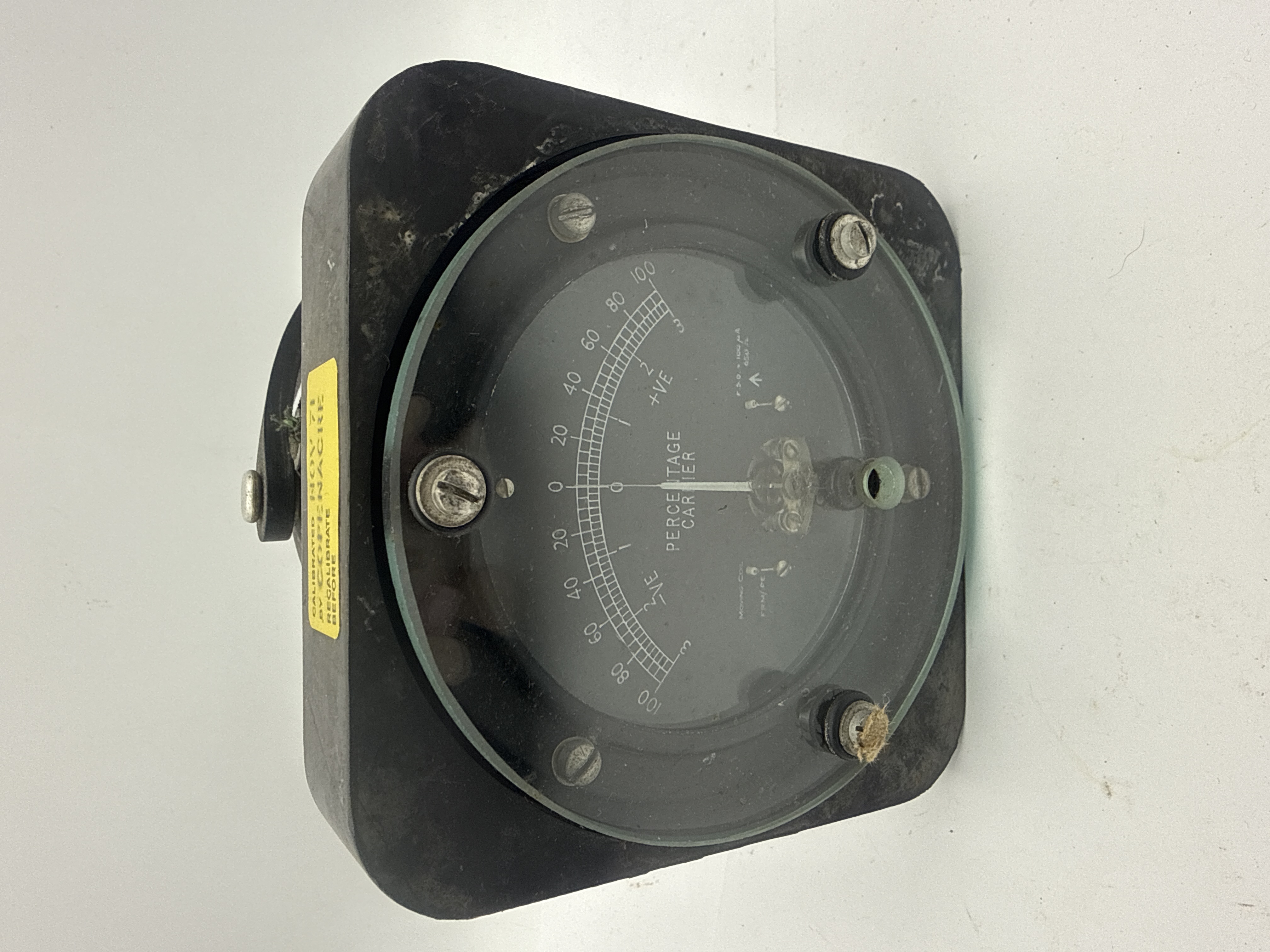 A robust, vintage Modulation Meter Unit housed in a square-shaped, heavily worn black or dark green casing, consistent with mid-20th-century military or industrial test equipment. The front features a circular glass-covered dial marked “PERCENTAGE CARRIER” with a symmetrical scale ranging from 0 to 100, marked both +VE and -VE. The meter details current ranges from 500 microamperes (μA) up to 500 milliamperes (mA). Identifying marks on the rear plaque include “METER UNIT MODULATION 12599,” “REF. NO 10T/13209,” and “SERIAL NO. [Broad Arrow] 402.” The Broad Arrow symbol indicates British government or military provenance. A yellow sticker visible on the casing indicates the unit was “CALIBRATED NOV 71 BY COPENACRE” and requires recalibration before use.