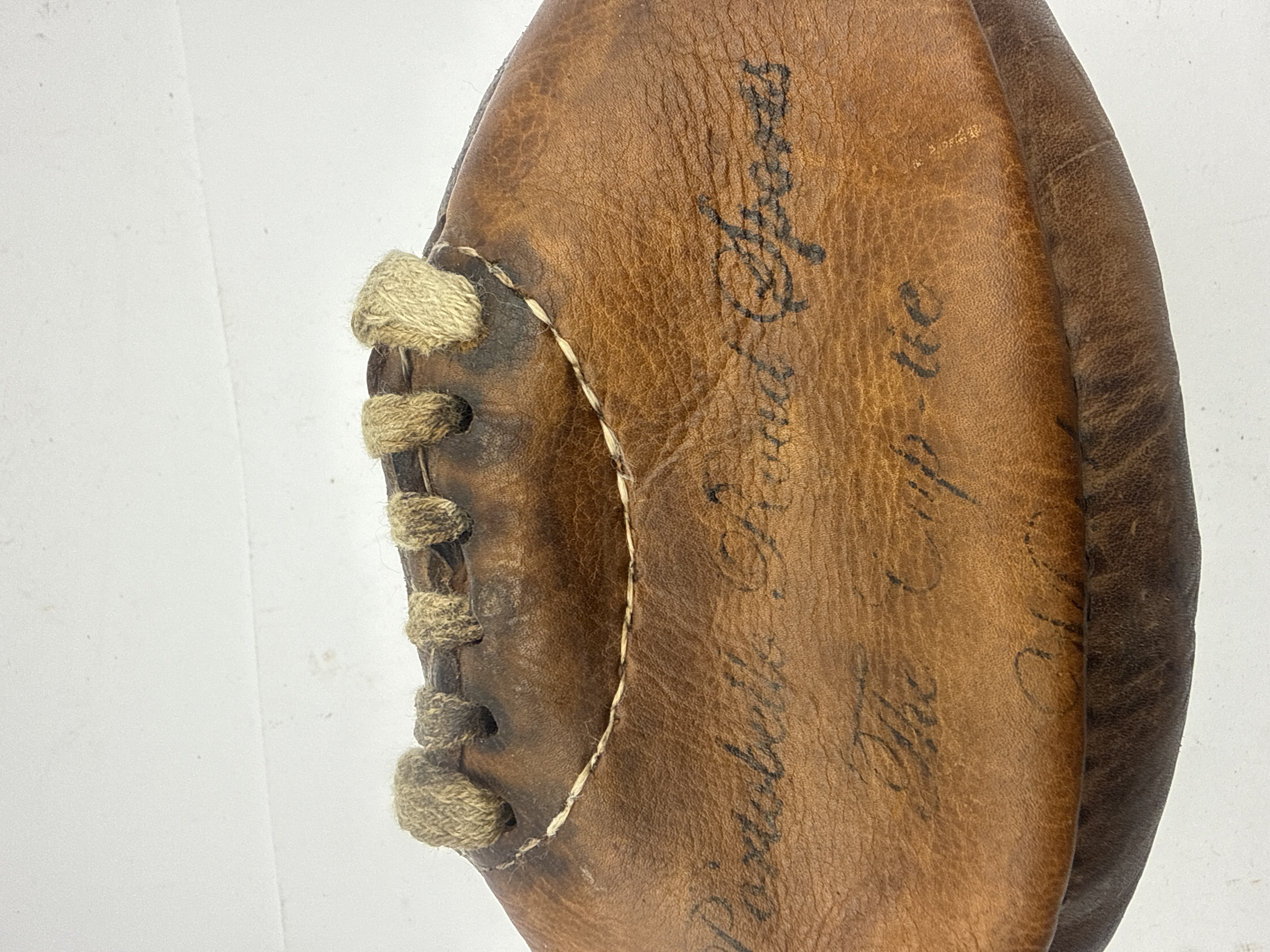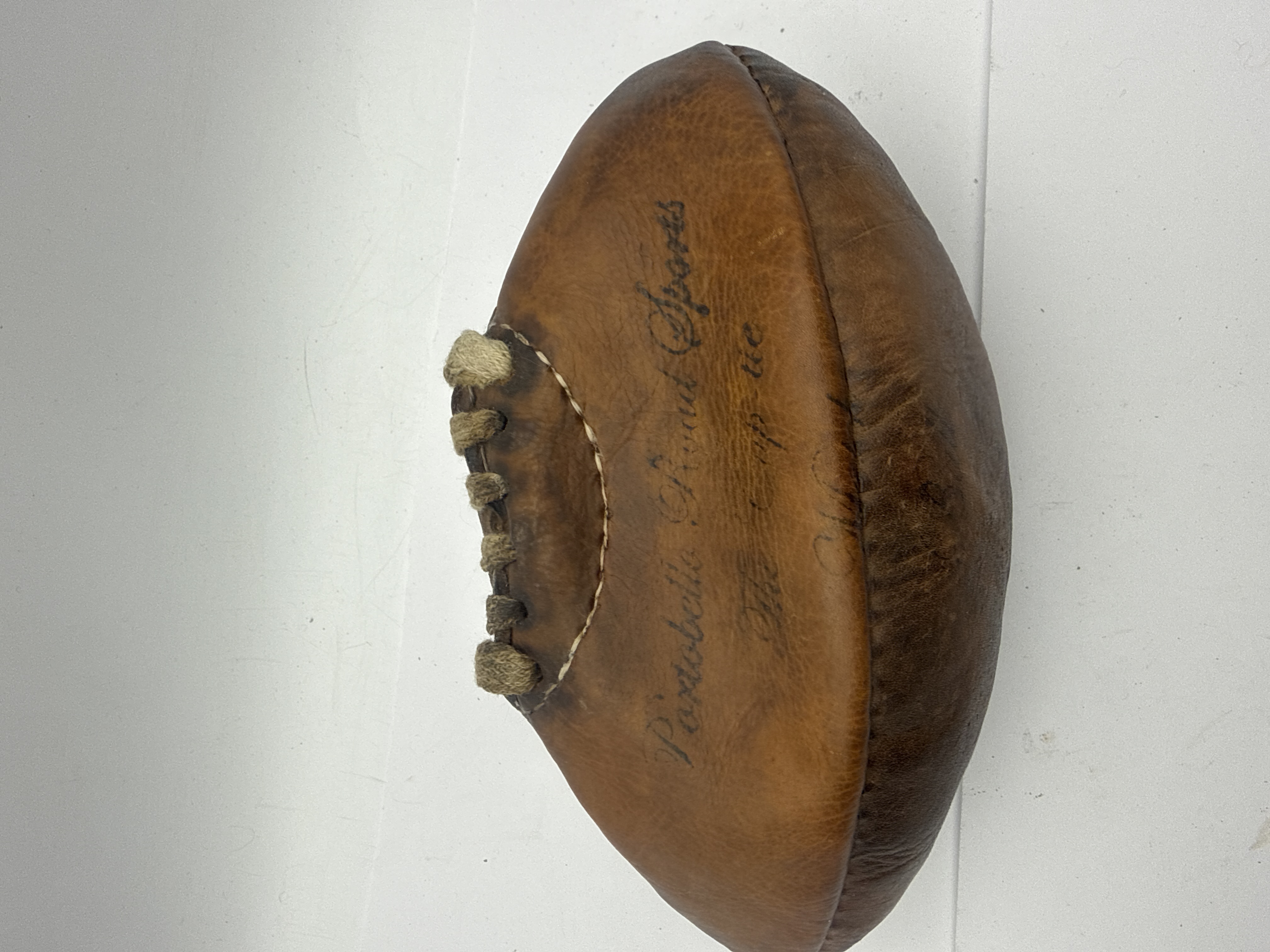 A single vintage or antique sporting ball constructed of thick, heavily patinated brown leather. The item is a traditional panel-style football featuring hand-stitched seams and an exposed opening secured by thick, natural cord lacing, where the bladder would have been inserted. The style is consistent with late 19th or early 20th-century association football or rugby balls. Handwritten inscriptions in black script ink are visible on one panel, reading Portobello Road Sports, followed by The Cup tie, and a third, fainter line beginning with Ch…. The object measures approximately 7 inches in its current deflated state.