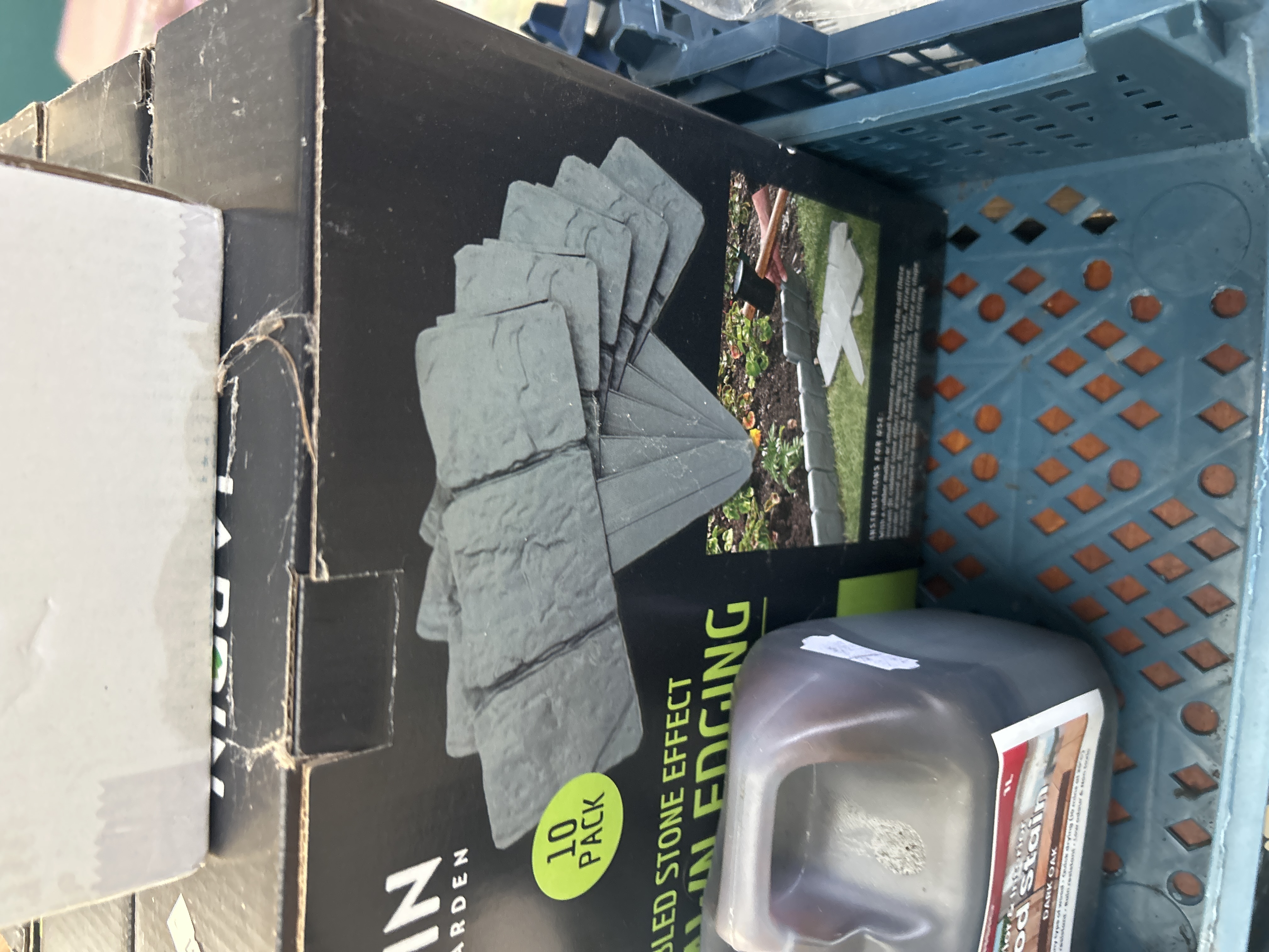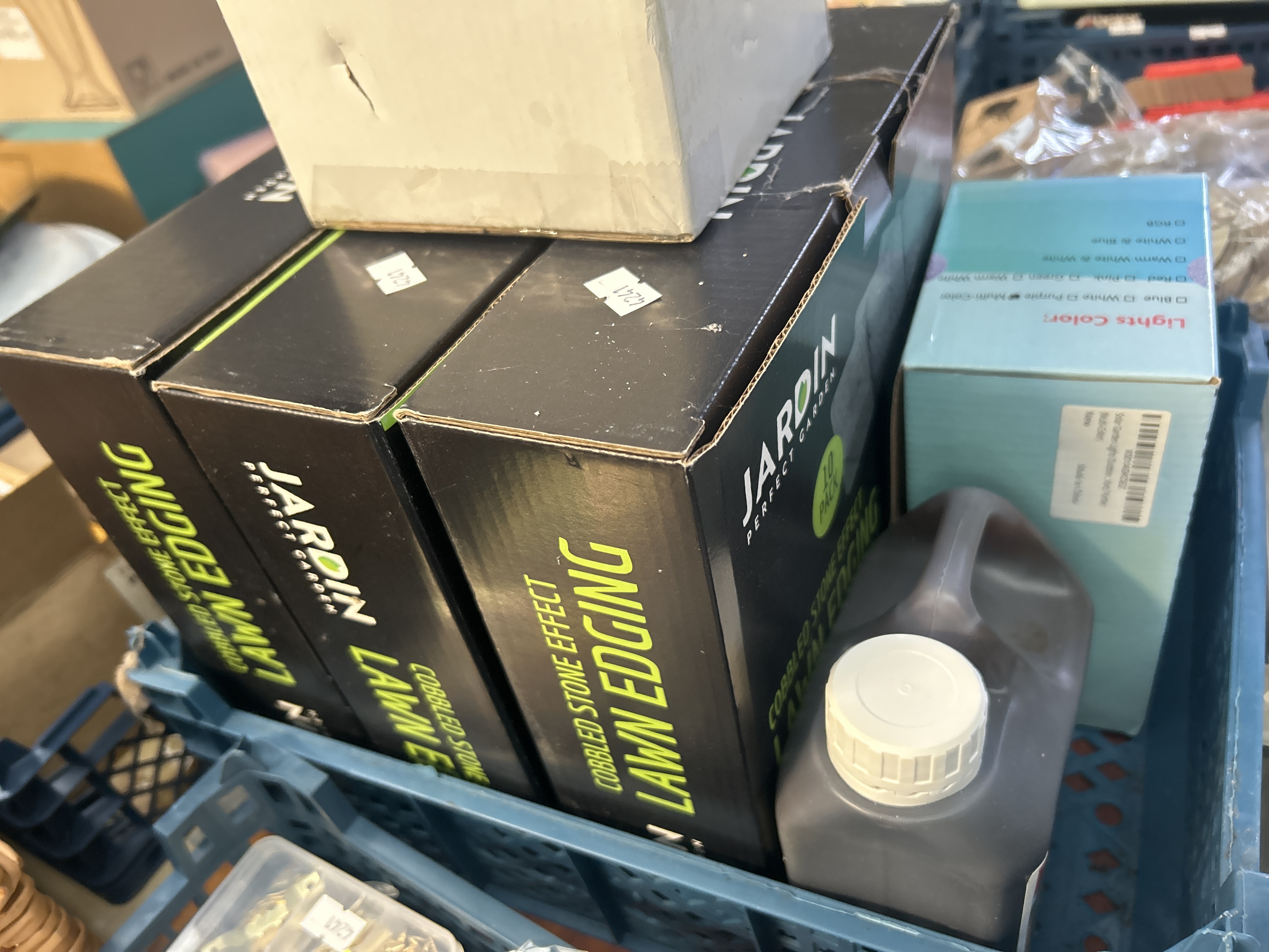 The collection comprises contemporary retail inventory items, primarily focused on home and garden maintenance and decoration, contained within a blue plastic storage crate. The lot includes three identical black cardboard boxes, each labeled “Jardin” and “Cobbled Stone Effect Lawn Edging,” with one box indicating a “10 Pack” of edging pieces. Also present is a dark grey plastic jug labeled as a “Wood Stain” (Dark Oak visible on the label), a rectangular teal retail box marked “Lights Color,” a light-colored corrugated cardboard box, and a small clear plastic container holding assorted hardware. All items are packaged in cardboard and plastic and appear to be new, packaged retail stock.