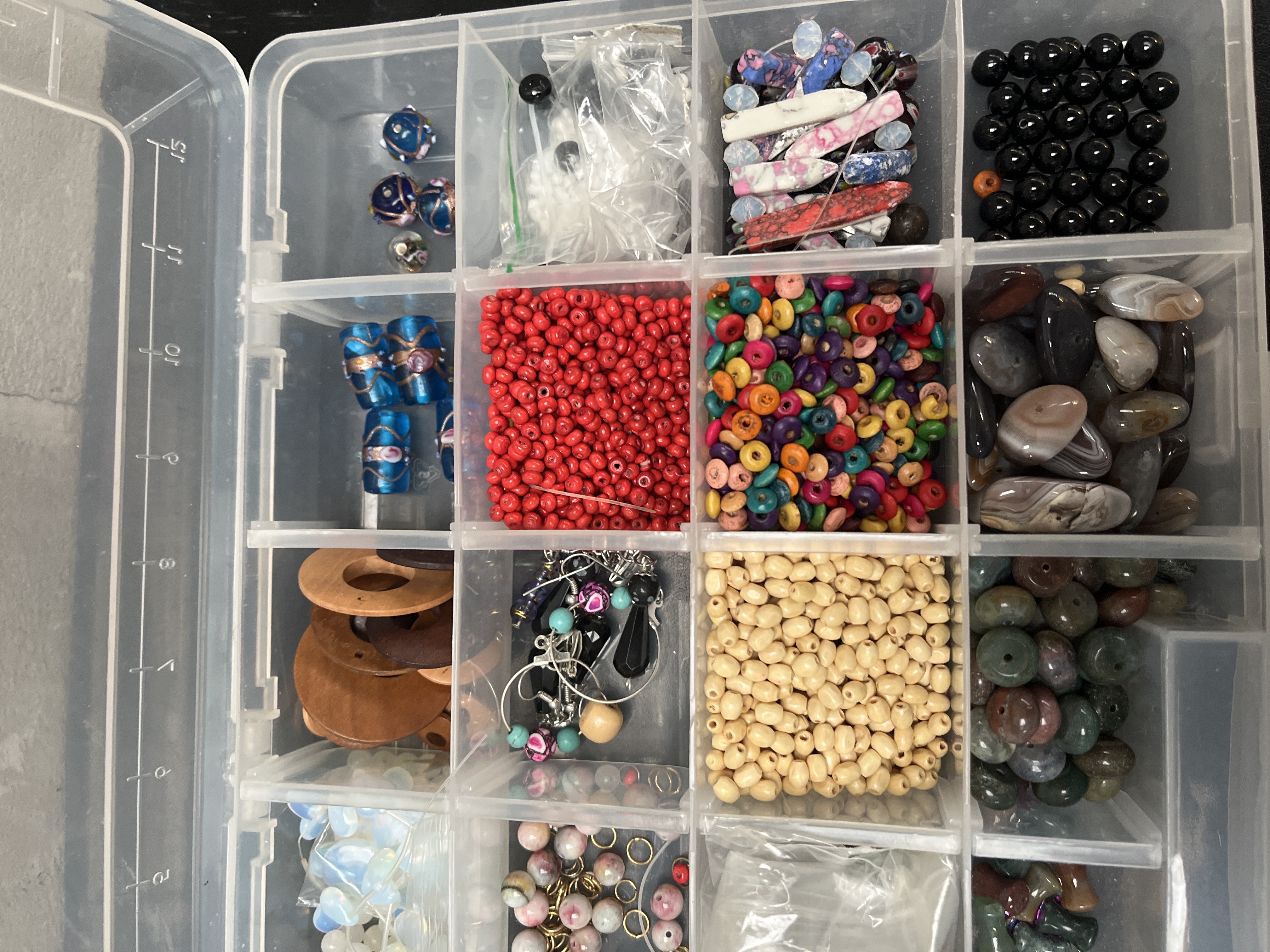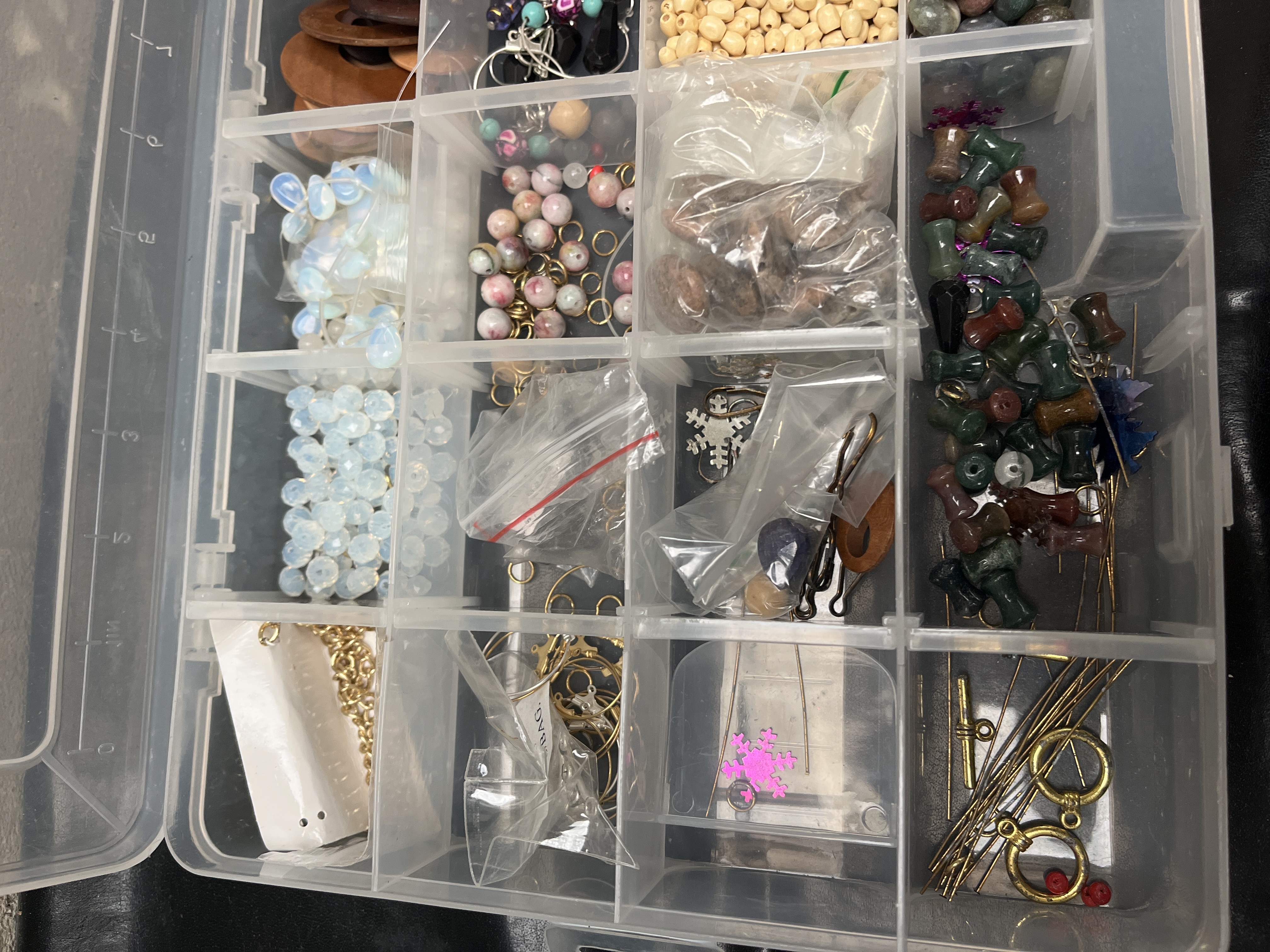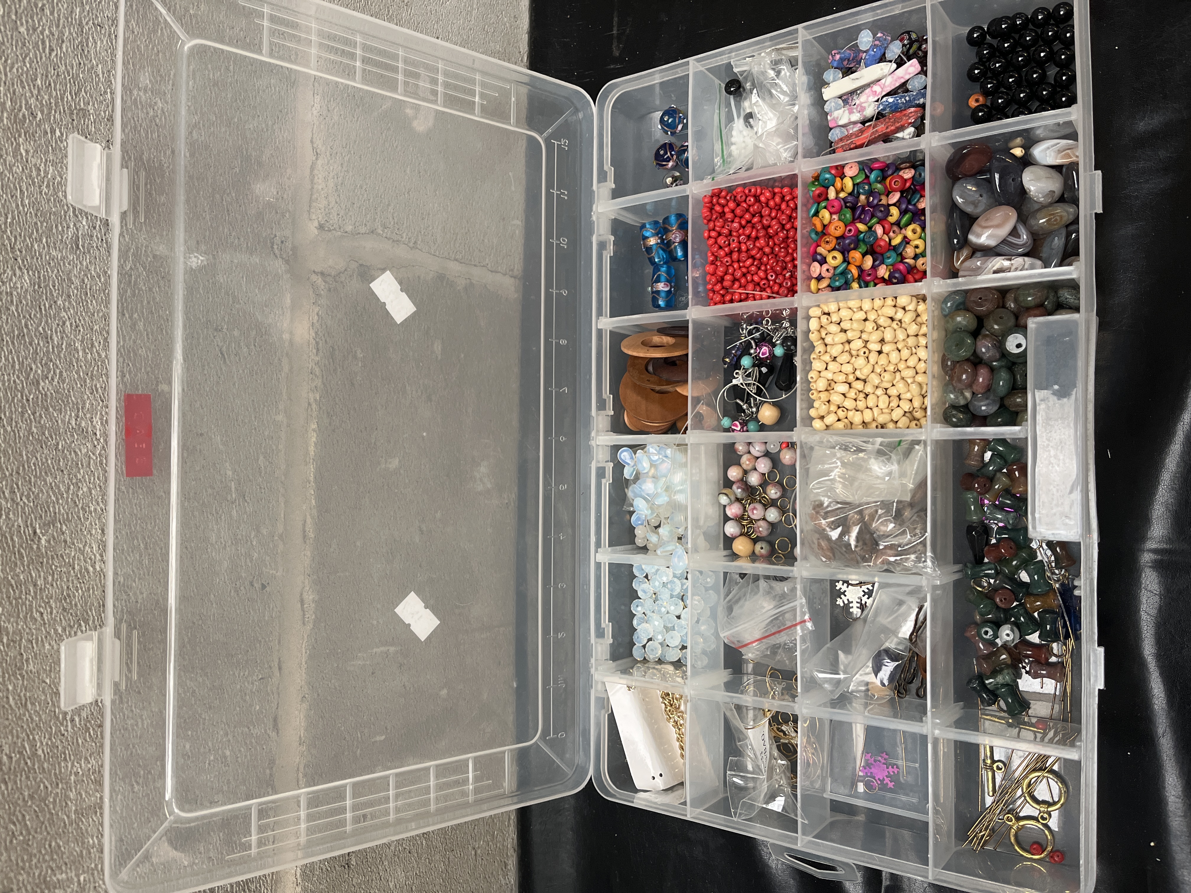 A clear, rectangular plastic storage organizer box with a hinged lid, structured into a grid of four rows and six columns, totaling 24 discrete compartments. The organizer is filled with a large assortment of mixed jewelry-making materials and findings. Contents include various gold-tone metal findings such as chain, jump rings, head pins, and earring wires. The compartments also hold strands of opalescent glass beads, multiple varieties of drilled stone beads including various jaspers, agates, and dark polished spheres. Other materials present are both natural and brightly colored wooden beads, small wooden spools of cord or thread, and numerous compartments dedicated to glass seed beads, notably a large quantity of red seed beads. Miscellaneous composite components, such as painted artificial nails, and various packaged plastic bags containing smaller metal parts are also included.