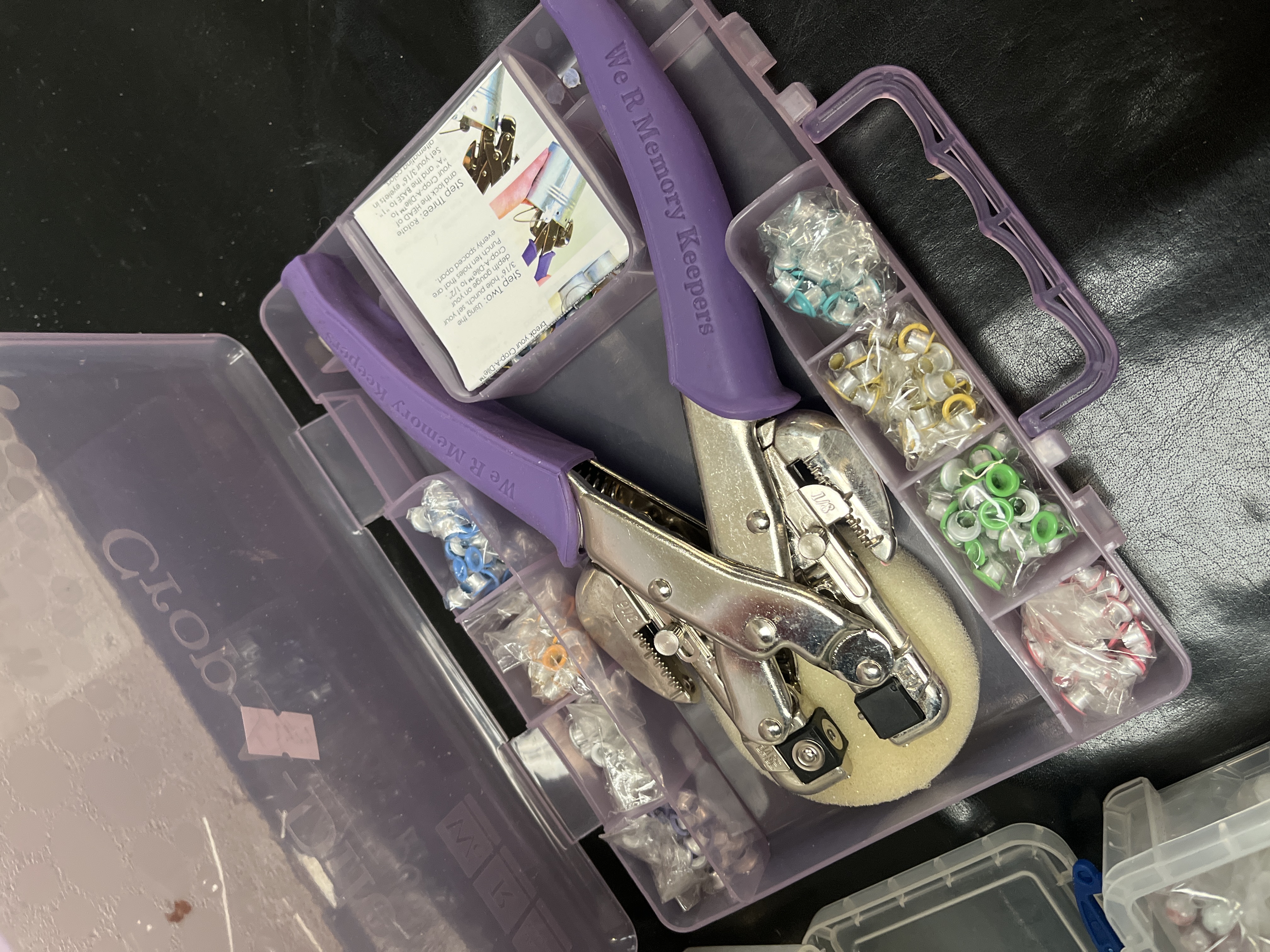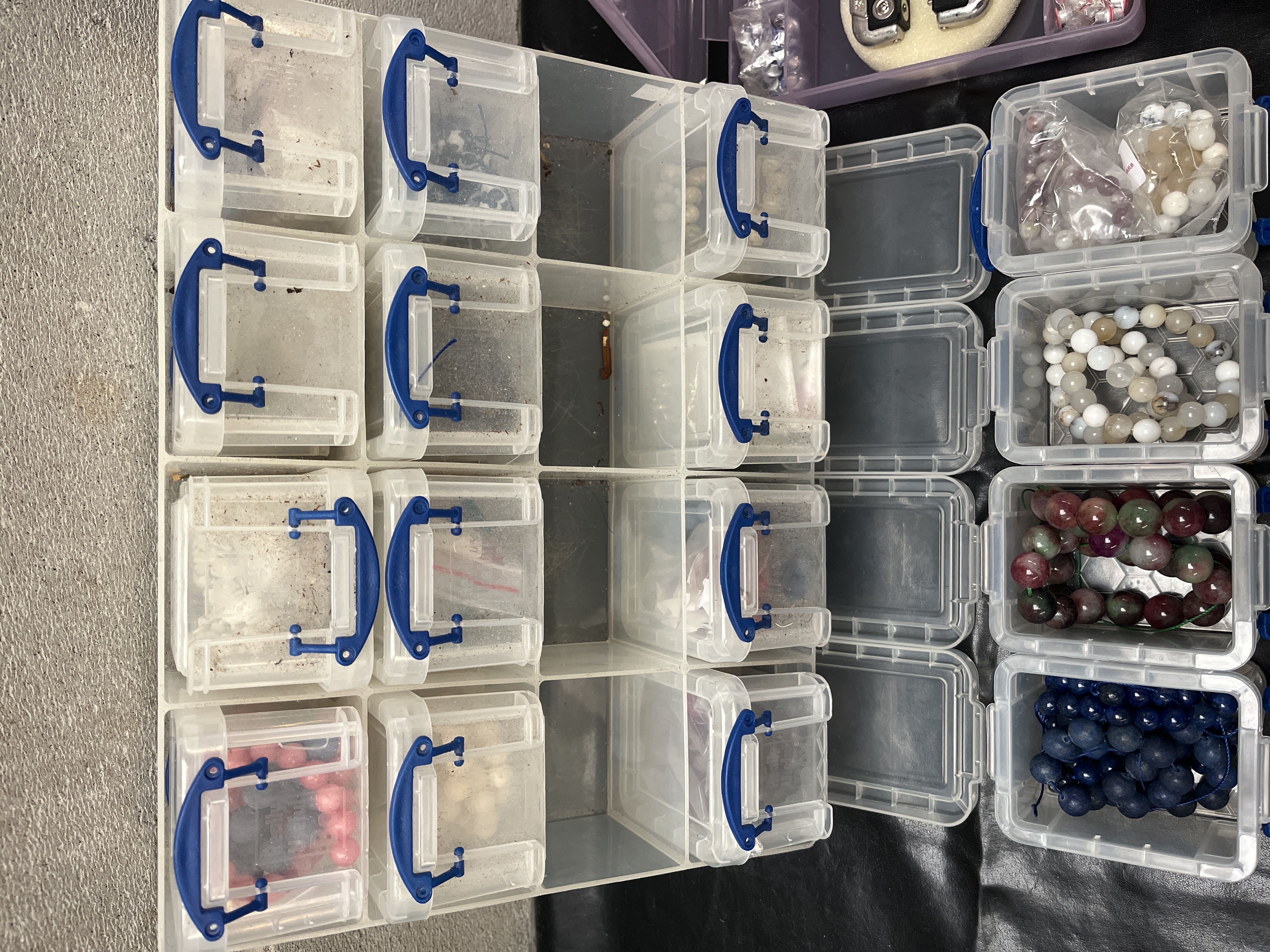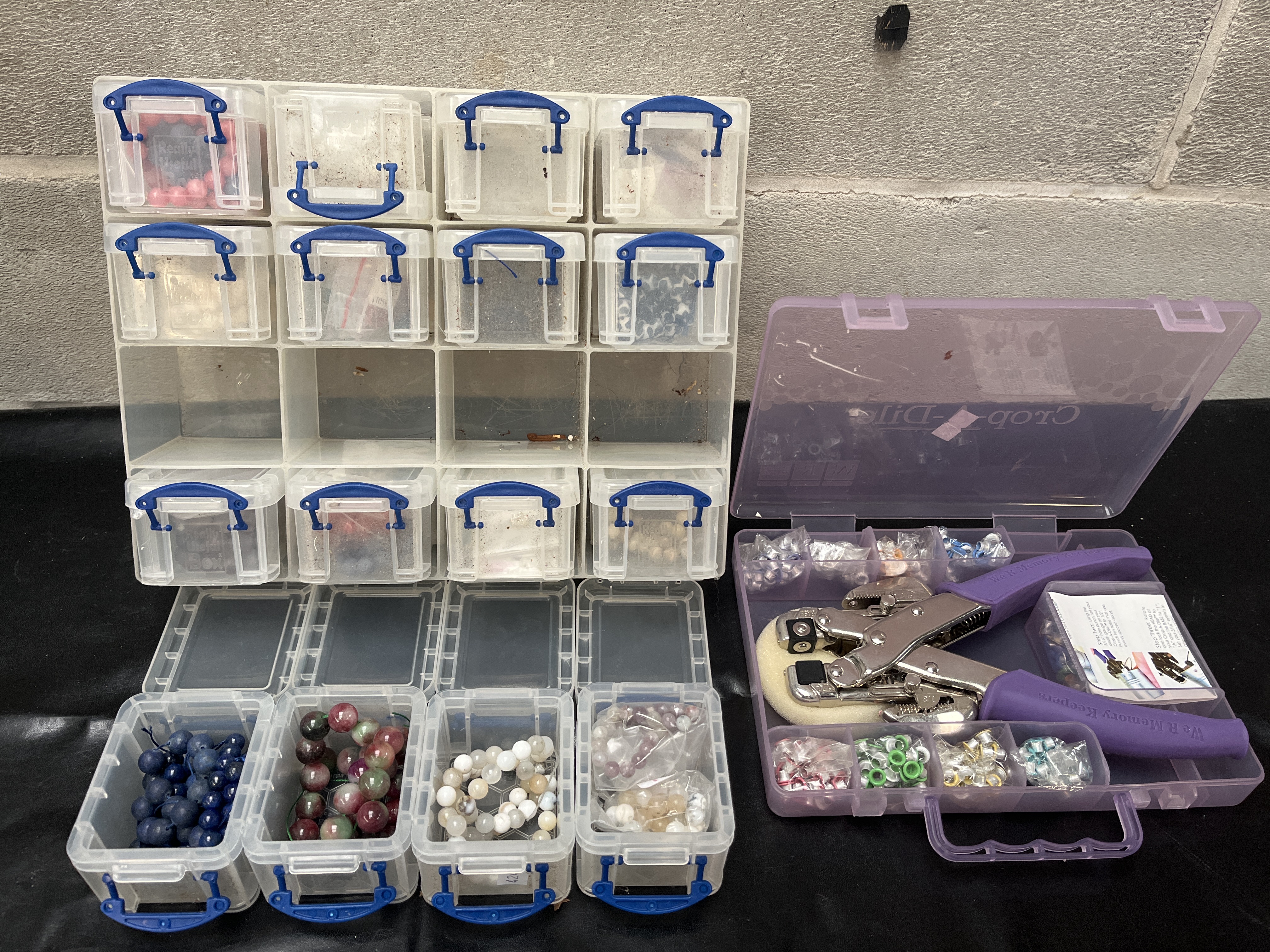 A collection of items related to modern craft and jewelry making, comprising twenty modular clear plastic storage boxes by Really Useful Box, and one translucent purple plastic tool case containing a setting/punching tool. The Really Useful Boxes feature blue plastic handles and are consistent with the small storage organiser models identified in web research. These boxes are arranged in a modular fashion, with sixteen boxes currently stored in a clear plastic rack and four boxes displayed separately. The boxes contain various craft materials, including polished stone and glass beads in mottled greens, deep blues, and opaque whites, along with miscellaneous smaller findings. The separate purple plastic tool case is marked “W R Memory Keepers” on the handle and interior compartment. This case holds a chrome-plated metal setting/punching tool with purple plastic handles, along with assorted packaged metal eyelets and grommets in various colors and finishes.