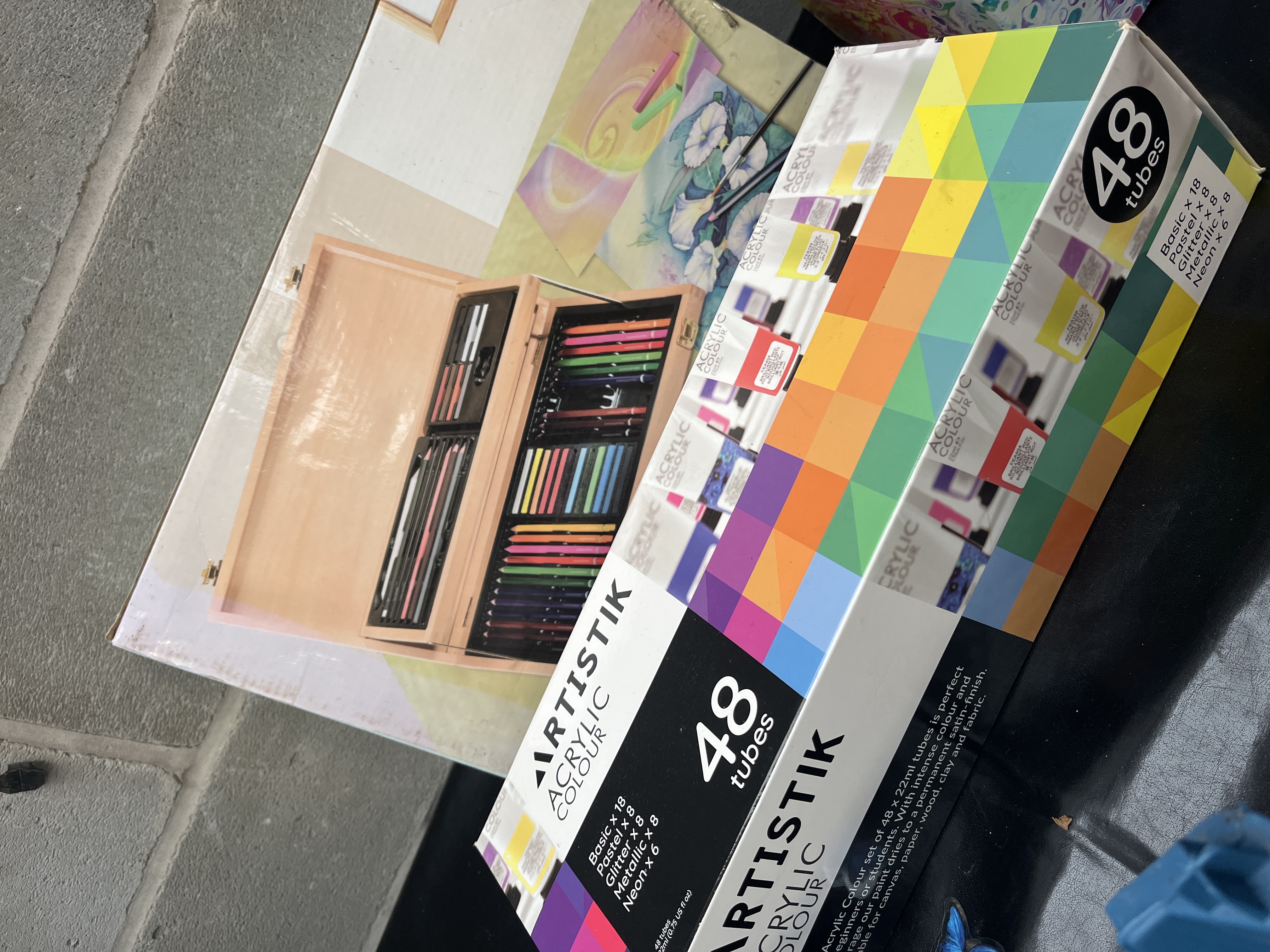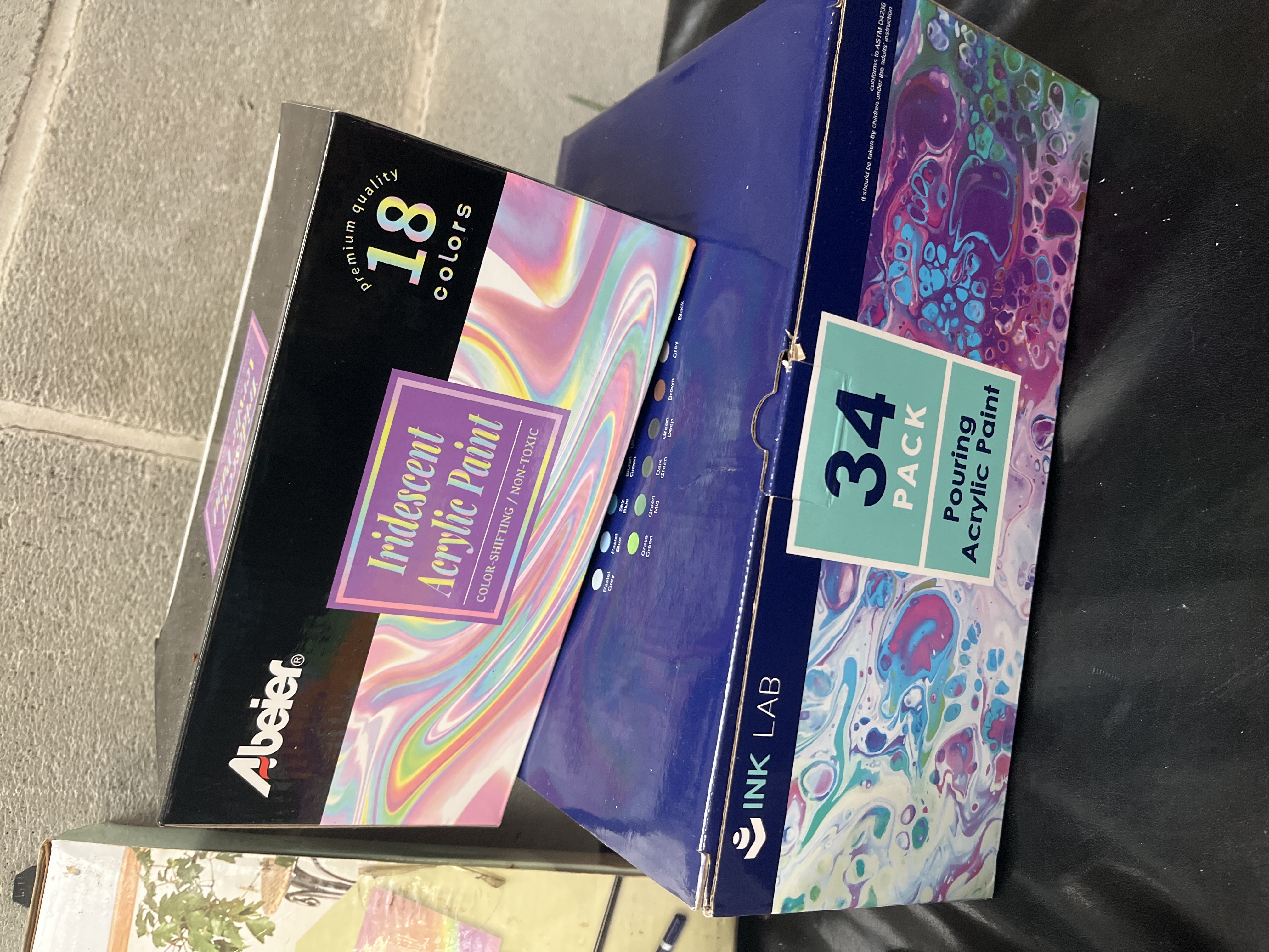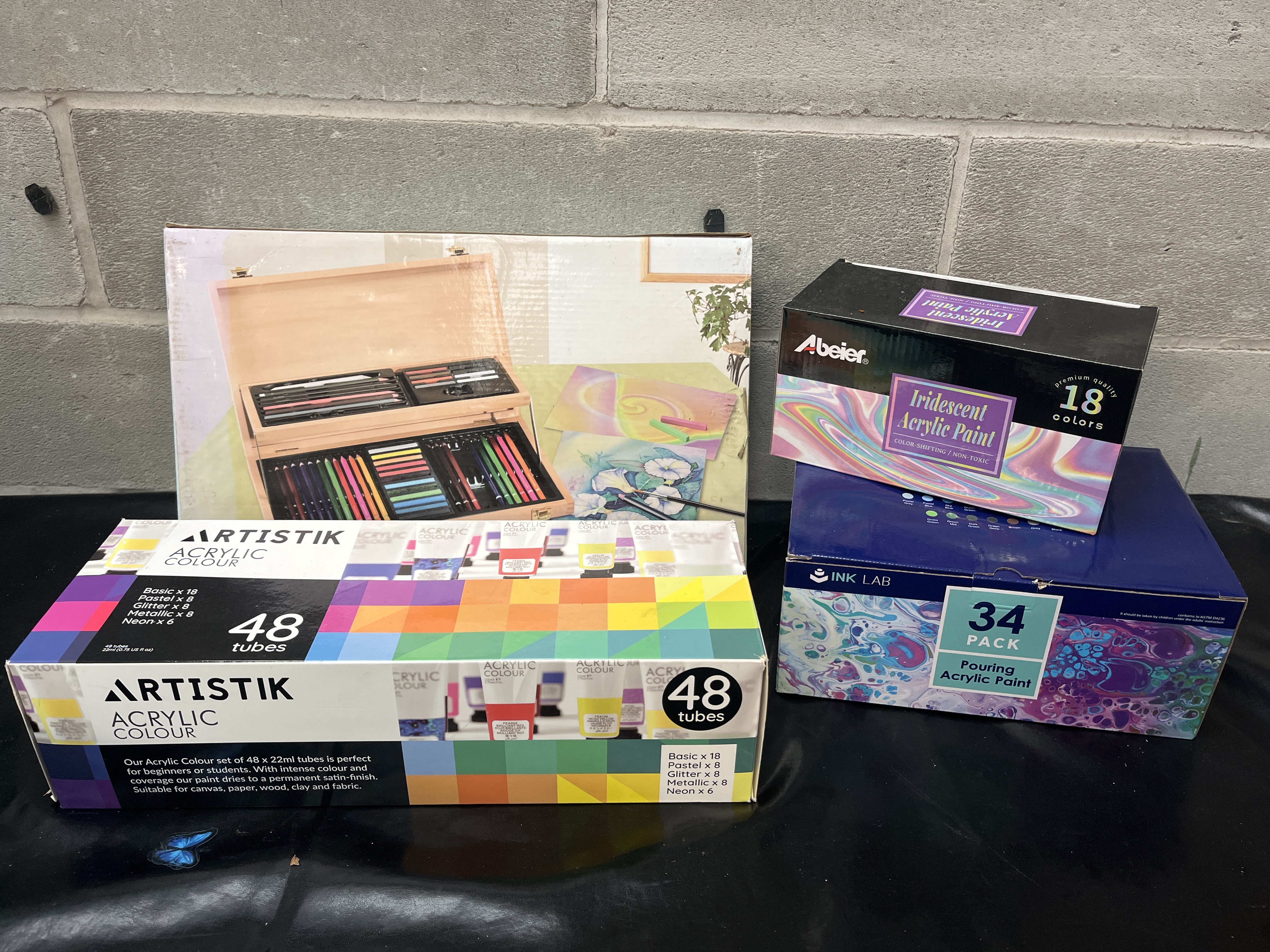 The collection consists of four boxed contemporary commercial art supply sets, primarily focused on acrylic paints. The lot includes one ARTISTIK Acrylic Colour set containing 48 tubes, specified as including 18 Basic, 8 Pastel, 8 Glitter, 8 Metallic, and 6 Neon colors. Web research suggests these are 22ml tubes. Also included is an Abeier box labeled Iridescent Acrylic Paint offering 18 colors, described on the packaging as premium quality, color-shifting, and non-toxic. The third set is a large blue INK LAB box containing a 34 PACK of Pouring Acrylic Paint. The final item is a large box depicting a wooden cased art kit, likely containing various mixed media supplies such as pencils, pastels, and paints. All items are presented in their original commercial packaging.