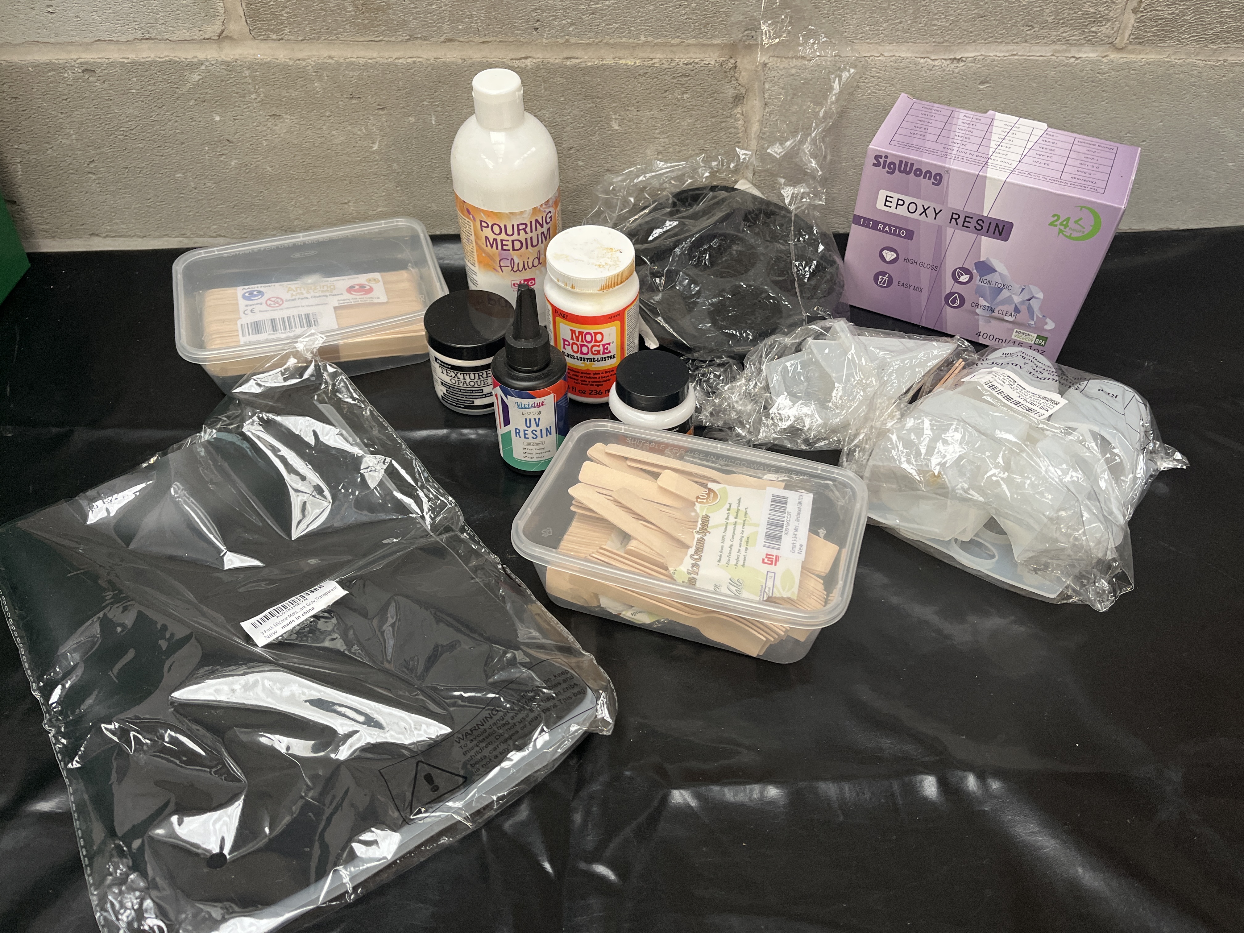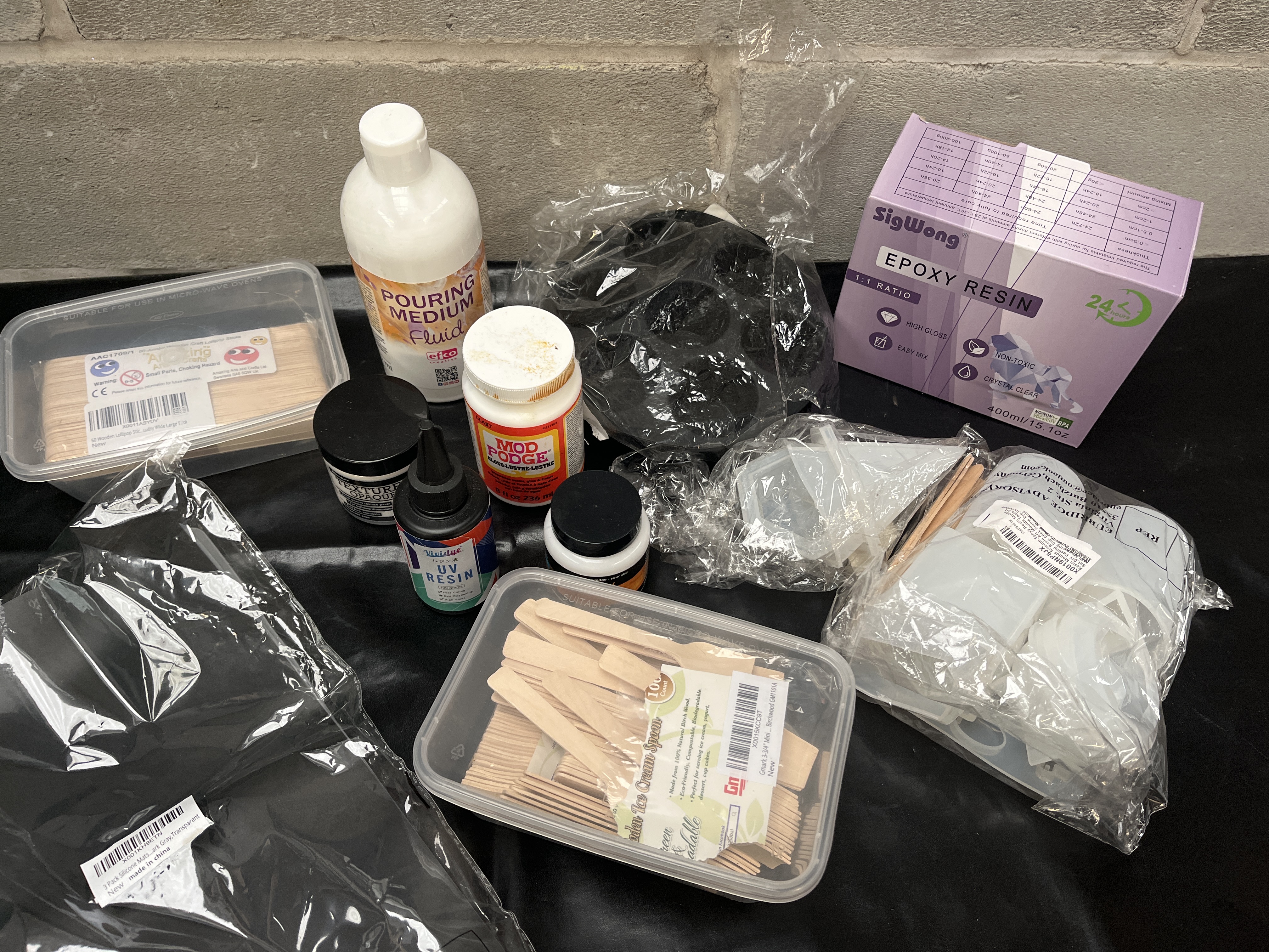 A collection of items intended for modern mixed media, fluid art, and resin casting projects. The collection includes various new and unused supplies. Key components include a large bottle of Pouring Medium Fluid Art, a jar of Mod Podge adhesive, a small bottle of UV Resin, and a boxed SigWeng Epoxy Resin 2:1 Ratio kit. The lot also contains two clear plastic containers filled with wooden craft sticks and spatulas, two small jars of black pigments or additives, two large sealed plastic bags containing black materials (likely molds or protective coverings), and two smaller bags containing clear plastic or silicone molds and accessories. All items are in their original packaging or containers.