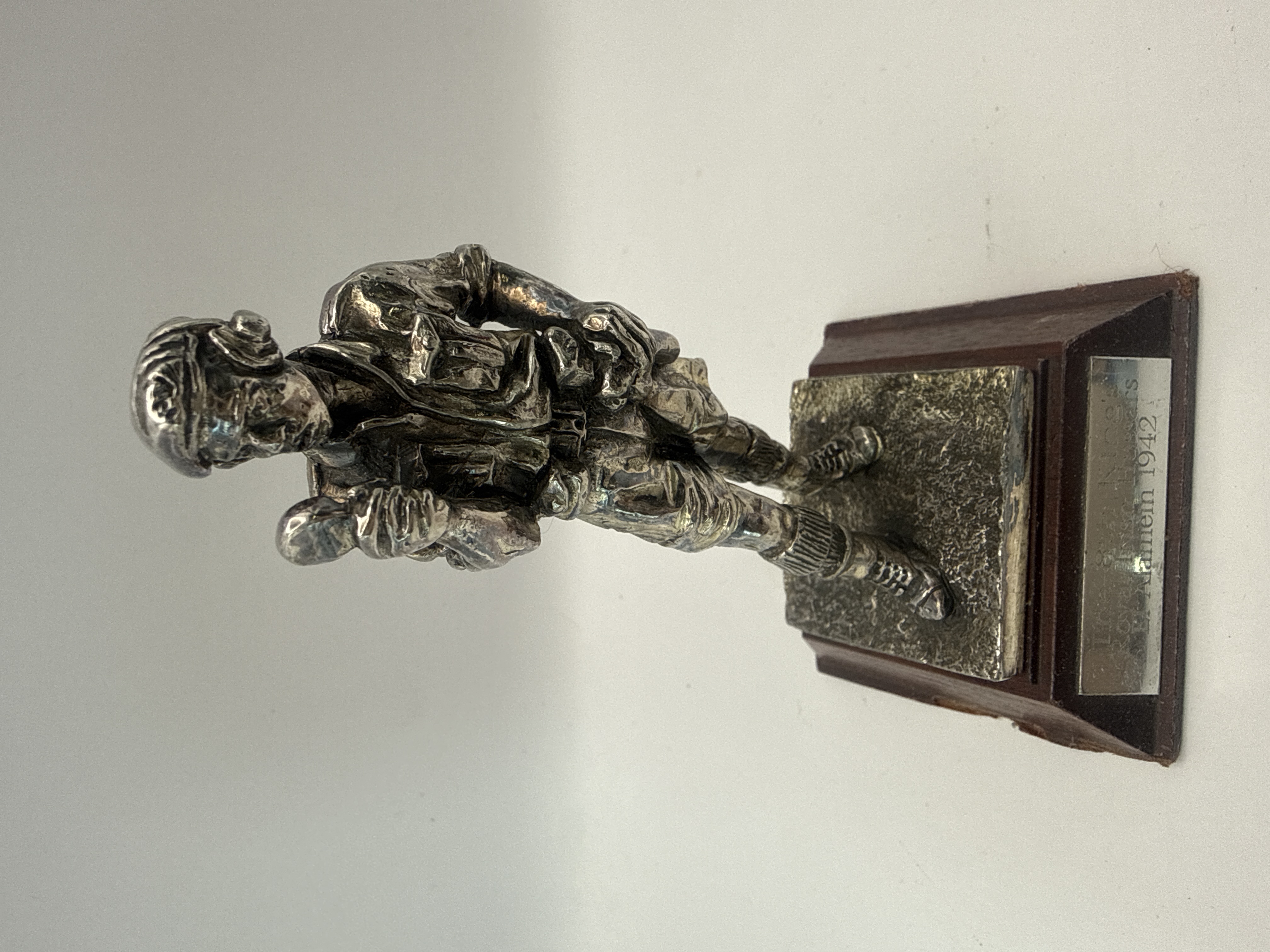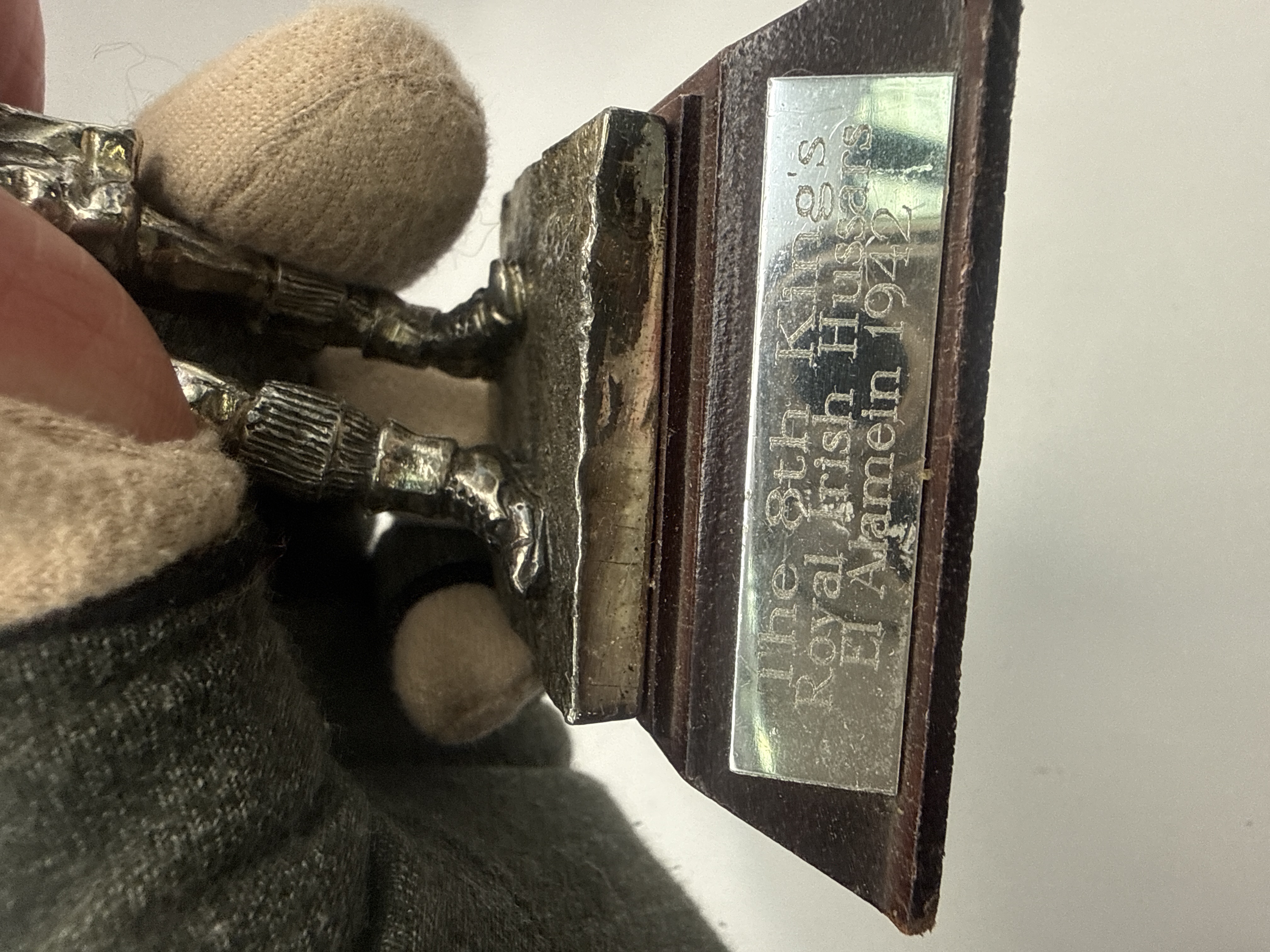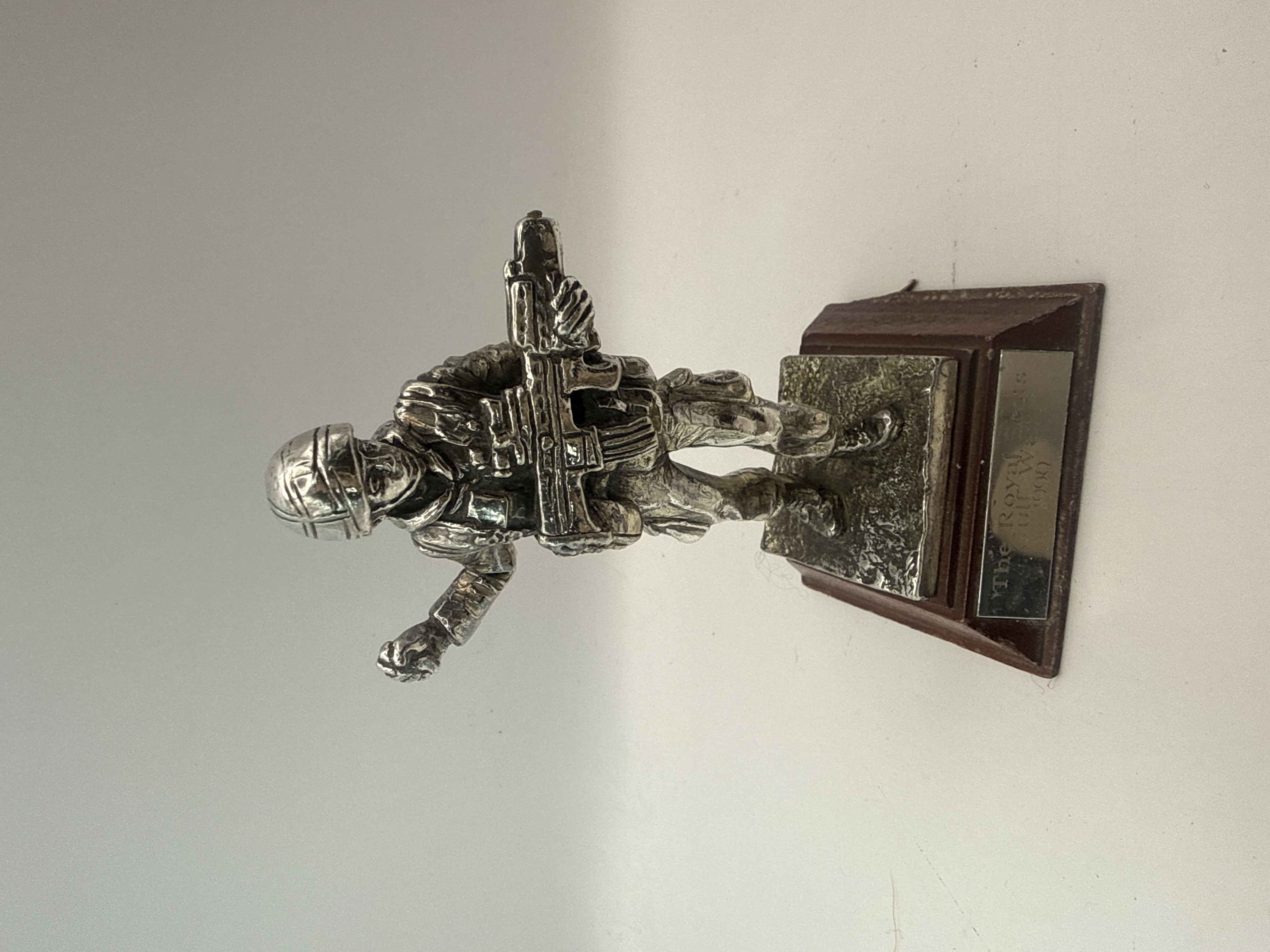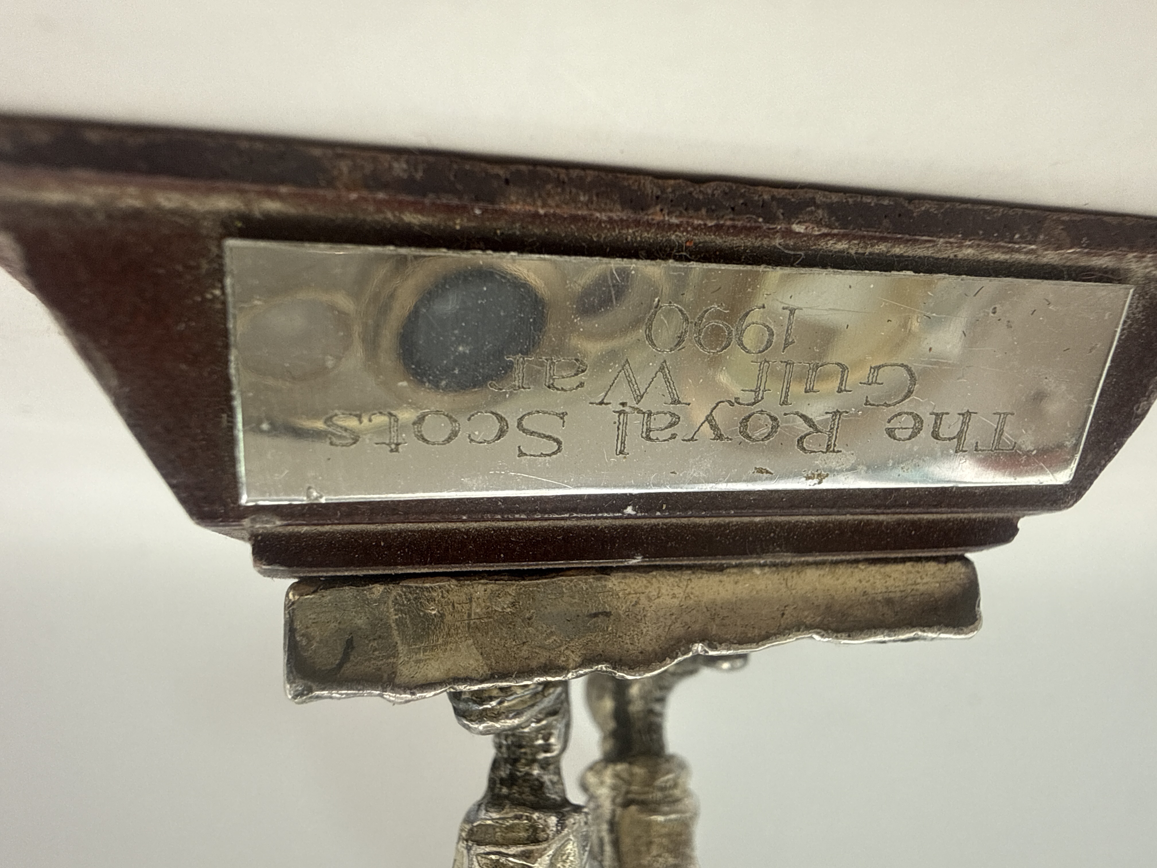 A pair of commemorative military statuettes produced by the Royal Hampshire Art Foundry. Each figure is cast in pewter with a silver-toned finish and mounted on a tiered, dark stained wood plinth. The figures are approximately 4 inches in height, excluding the base. The first statuette depicts a modern soldier in tactical gear, holding an assault rifle and grenade, commemorating “The Royal Scots / Gulf War / 1990.” The second statuette portrays a soldier or tanker wearing a helmet and radio headset, holding a microphone or handset, commemorating “The 8th King’s / Royal Irish Hussars / El Alamein 1942.”