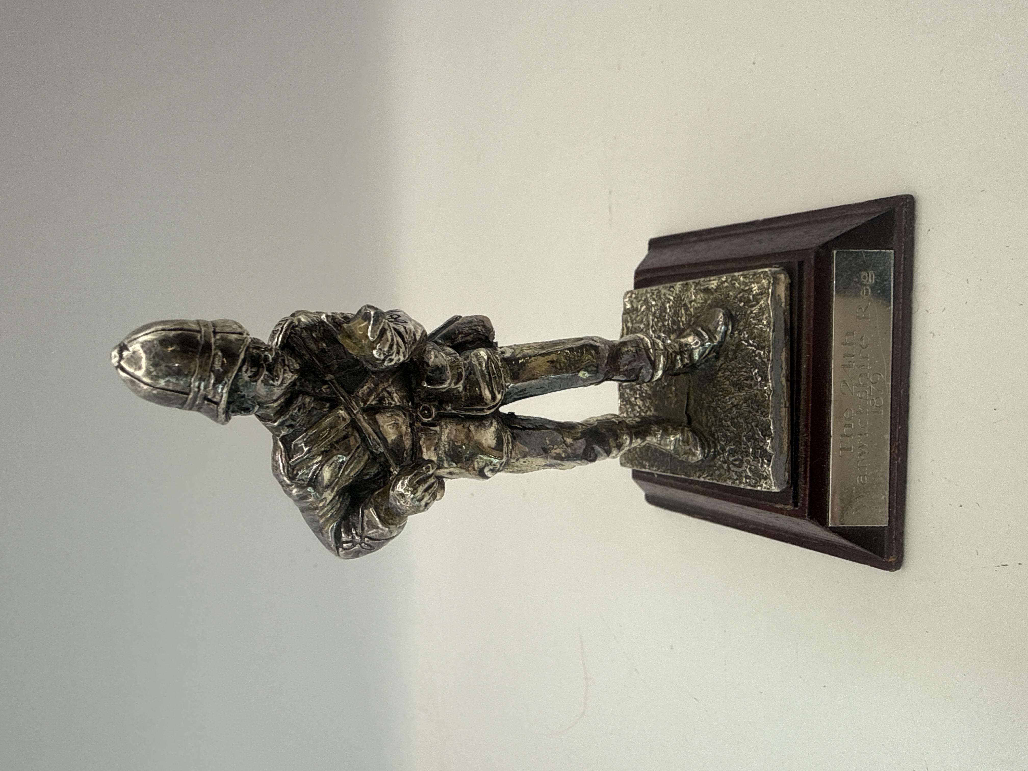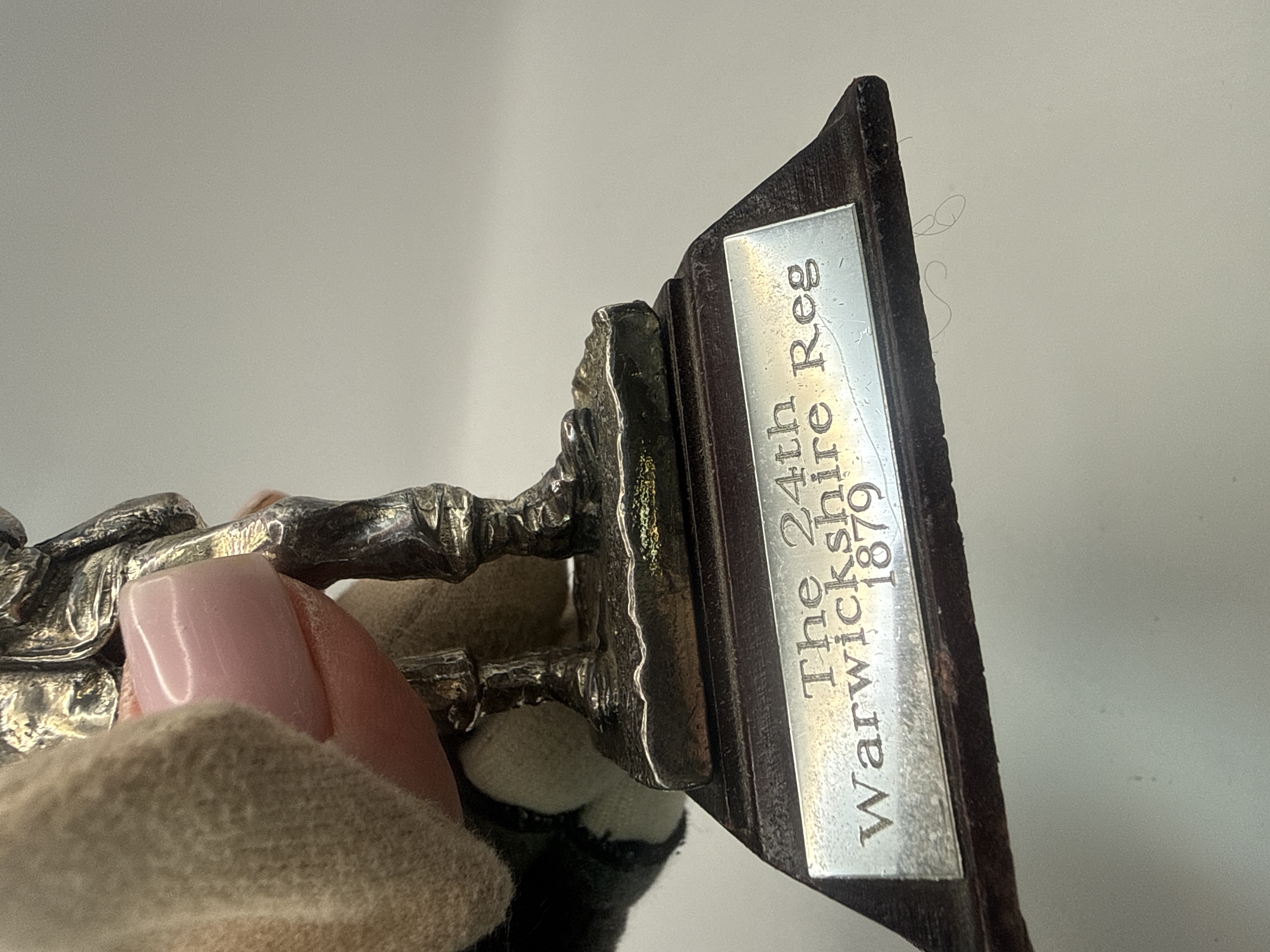 A single commemorative military statuette, cast in the style of the Royal Hampshire Art Foundry, depicting a soldier of the 24th Warwickshire Regiment in late 19th-century uniform and helmet. The figure is constructed from polished metal, likely silver-plated pewter, showing detailed casting of the uniform and equipment. The figure is mounted upon a square metal platform which is affixed to a dark stained wooden plinth. The front of the wooden base features an engraved rectangular metal plaque inscribed with the text: The 24th Warwickshire Reg 1879. The figure stands approximately 4 inches tall.