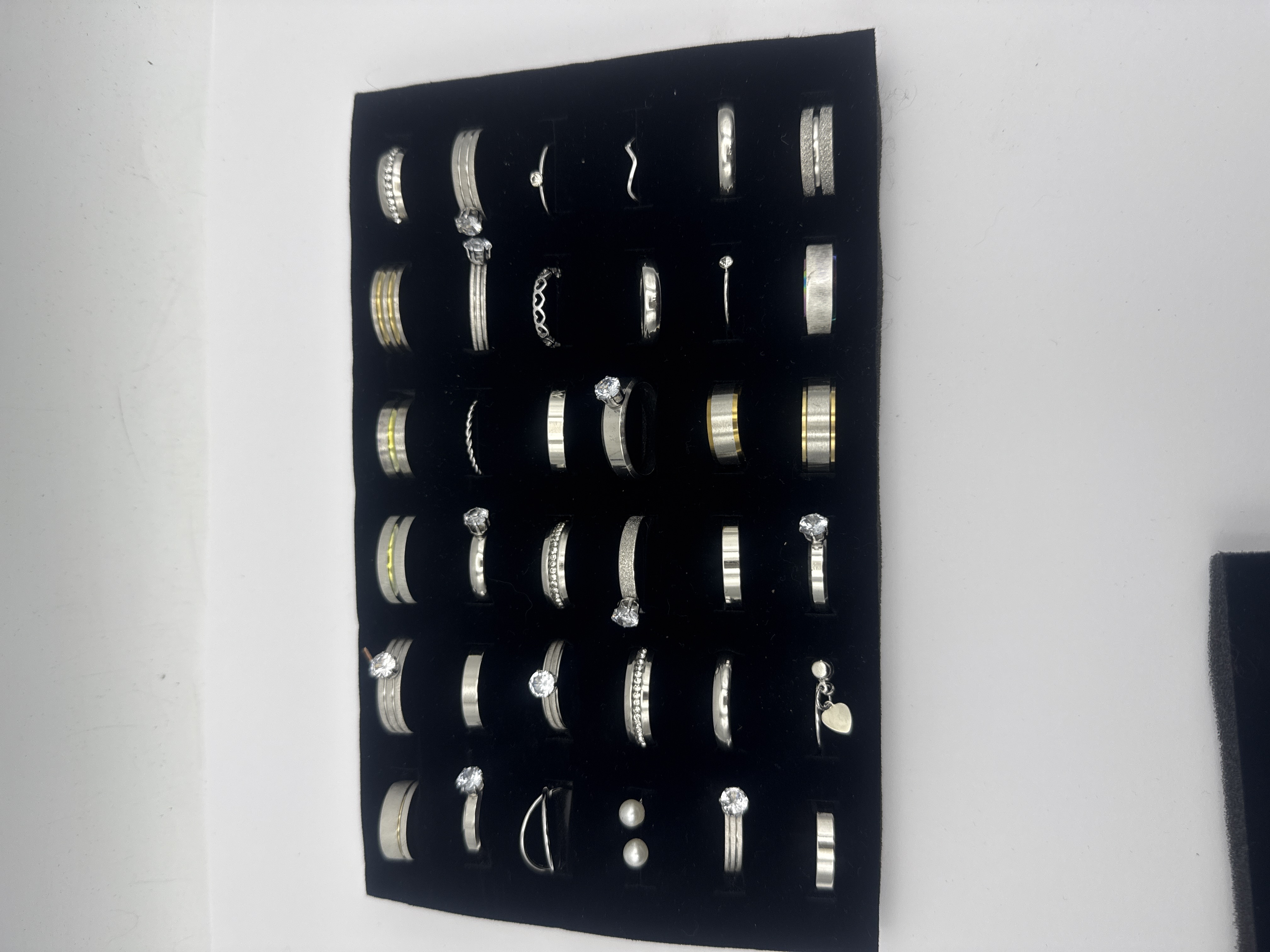A collection of 36 contemporary fashion rings displayed on a black velvet jewelry tray. The items are constructed primarily from non-precious silver-tone metal, likely stainless steel or costume alloy, with some pieces featuring two-tone silver and gold accents. The assortment includes a variety of styles such as wide, brushed, and textured wedding band types, as well as several solitaire settings utilizing clear, faceted stones, likely cubic zirconia or glass simulants. Specific designs include thin twisted bands, an open curved band, a band with a dangling heart charm, and one loose spherical pearl-like object included in the lot. No visible hallmarks or maker’s marks were noted on the items.