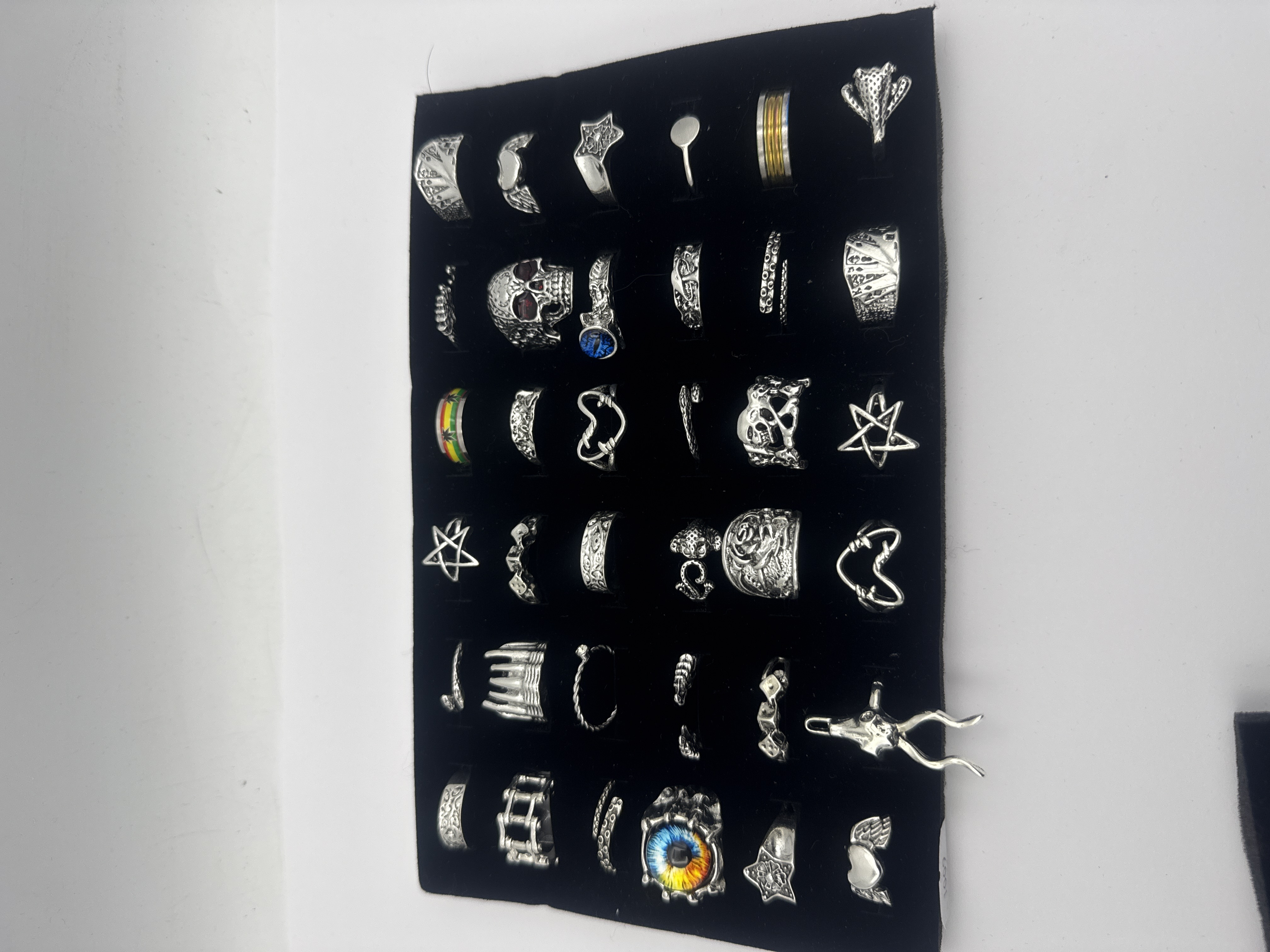 This lot comprises a collection of contemporary fashion rings, presented on a black velvet display tray. The rings are constructed primarily of silver-toned base metal or steel, featuring an artificially oxidized finish consistent with the gothic and punk aesthetic. The collection includes a wide variety of novelty and alternative motifs, such as full skeletal skulls, pentagrams, dragons, organic forms including a prominent multicolored eye cabochon, and playing card designs. The lot also includes a wide band ring featuring two-tone gold and silver striping. The rings are intended as wholesale or bulk costume accessories, consistent with market listings for similar fashion jewelry sets.