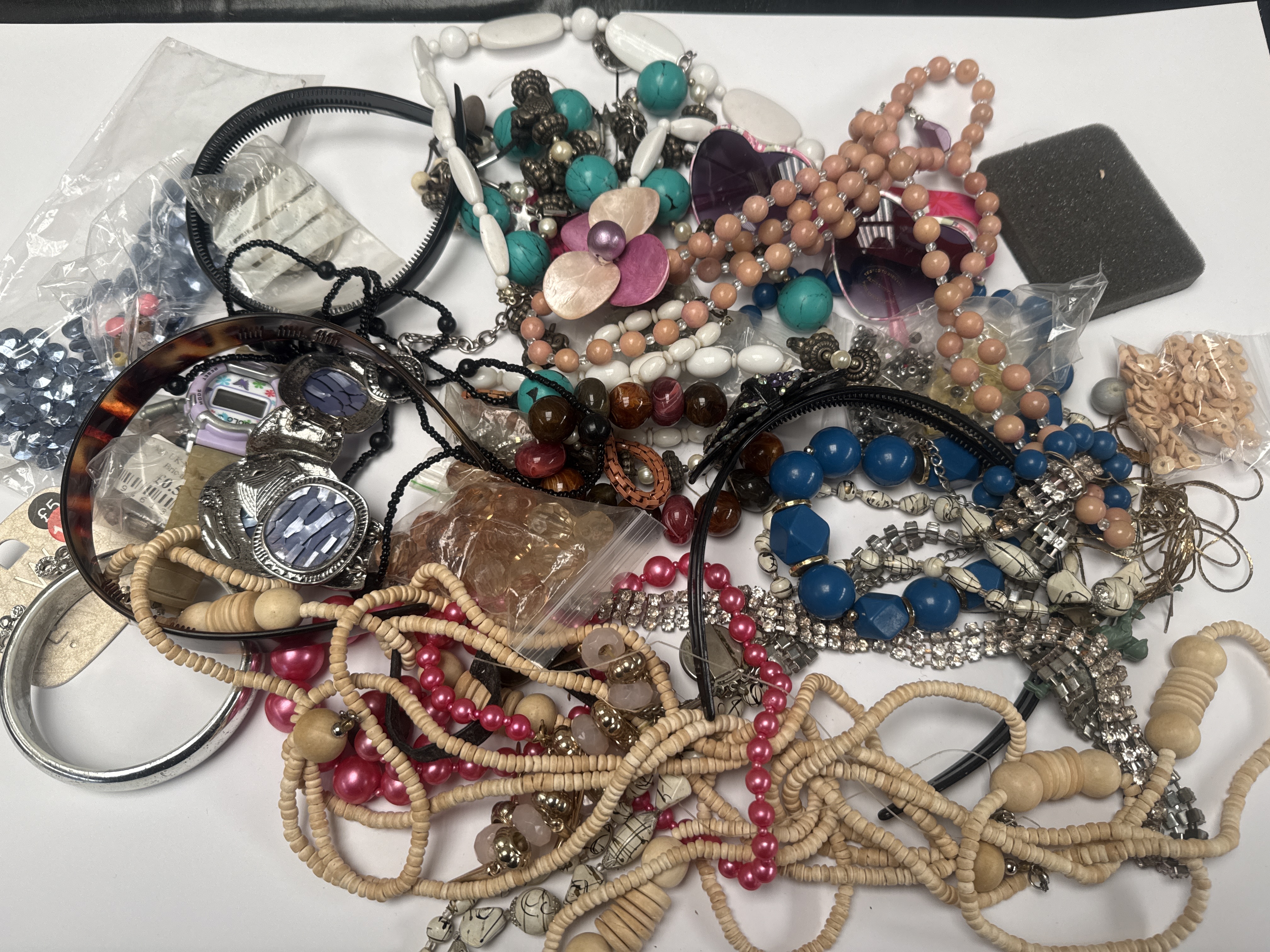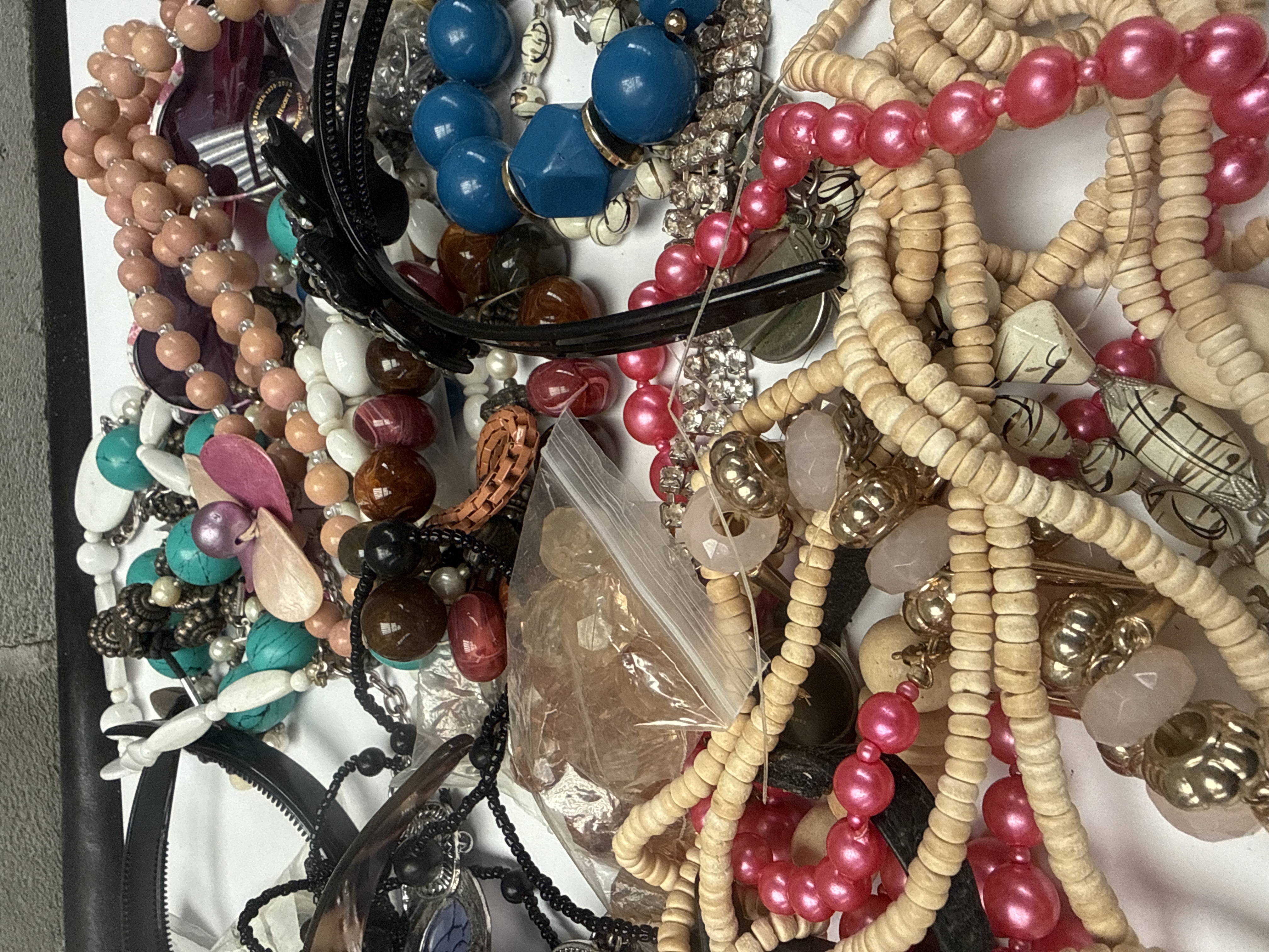 A collection of mixed costume jewelry and hair accessories. The lot includes various necklaces, bracelets, earrings, and headbands, typical of mass-produced fashion jewelry from the early 21st century. Materials include plastic, resin, wood, and base metals (silver-tone and gold-tone). Specific items include multiple long strands of natural wooden beads, bright pink faux pearl necklaces, chunky blue resin bead necklaces, and various hair accessories such as black and faux tortoiseshell plastic headbands. Also included are a simple silver-tone bangle, a pair of blue faux pave clip-on earrings, and four small clear plastic zip bags containing loose components or beads.
