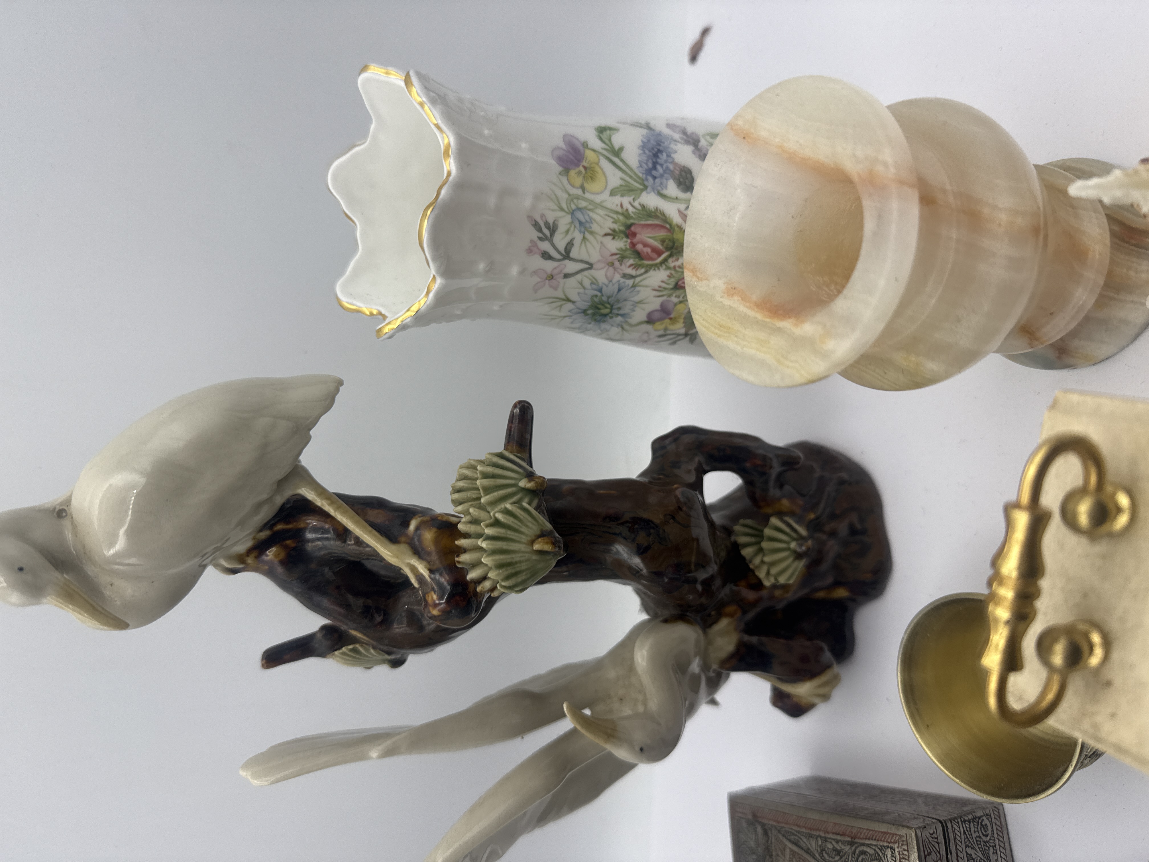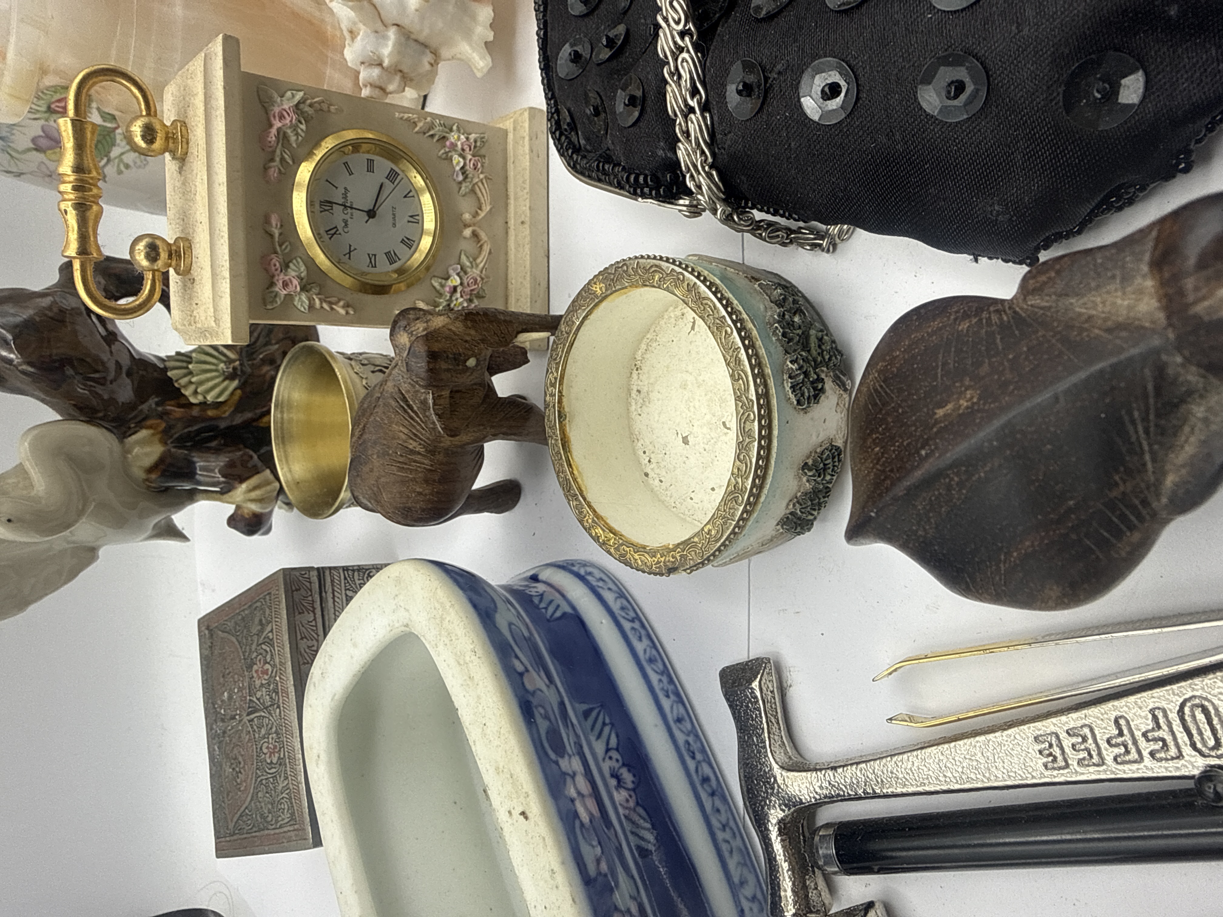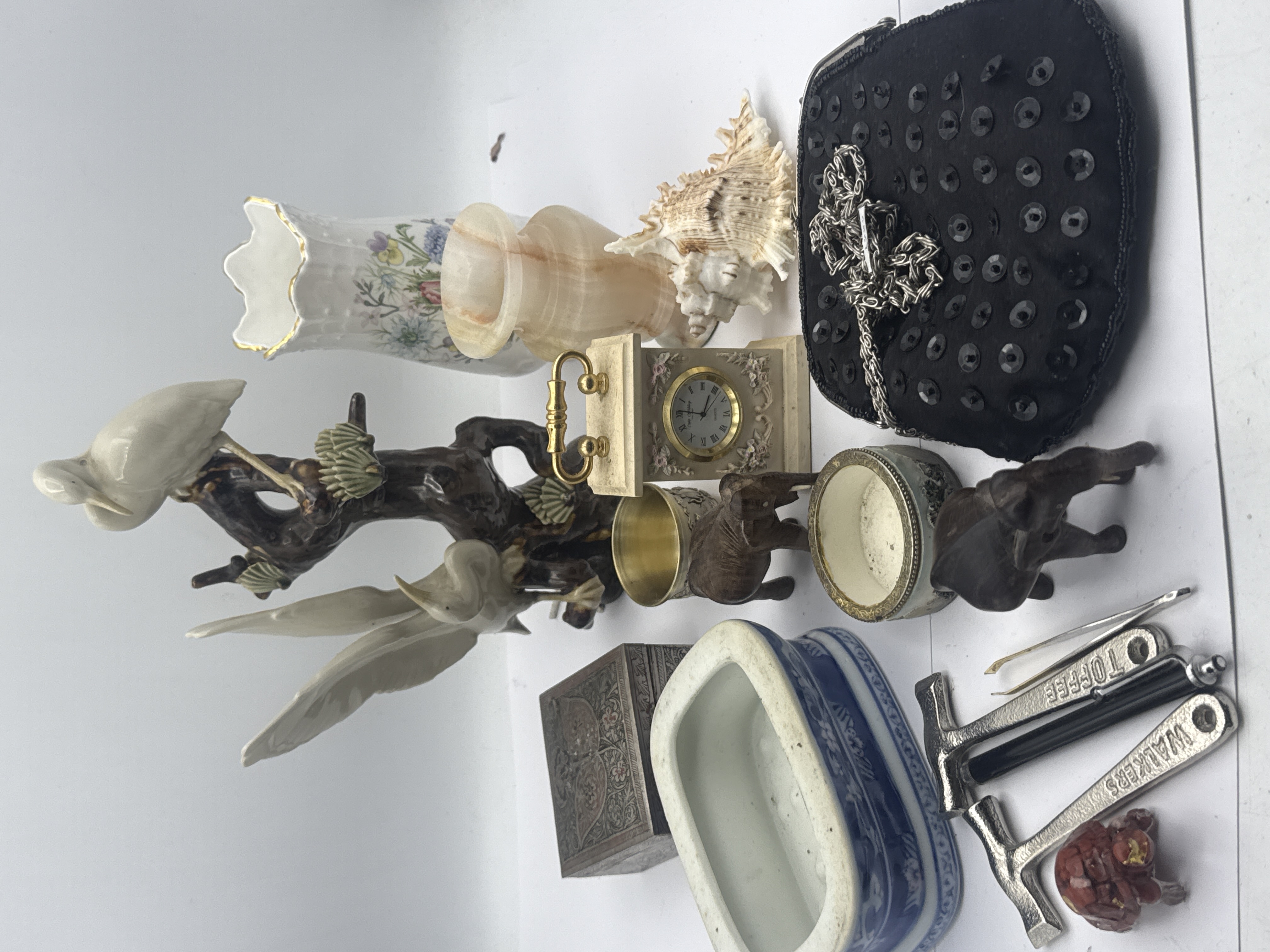 A collection of seventeen assorted decorative and utilitarian objects spanning various materials including ceramic, porcelain, metal, wood, natural shell, and textile. The most identifiable item is a black satin evening bag attributed through market consensus to Jessica McClintock, featuring sequin detailing and a metal chain strap. The lot also includes a large ceramic figural group depicting two white egrets perched on a brown glazed branch; a tall fluted porcelain vase with floral decal decoration and a gilt rim; and a rectangular vase carved from onyx or alabaster. Further items comprise a small beige quartz mantel clock, a blue and white ceramic basin dish, two carved wooden elephant figurines, a natural seashell, a rectangular embossed metal box, a small brass cup, and a circular ceramic trinket dish. Utilitarian items include two metal shaving razors, small tweezers, a reddish-brown carved animal figure, and a silver-toned metal tool handle marked WALKER’S TOFFEE.