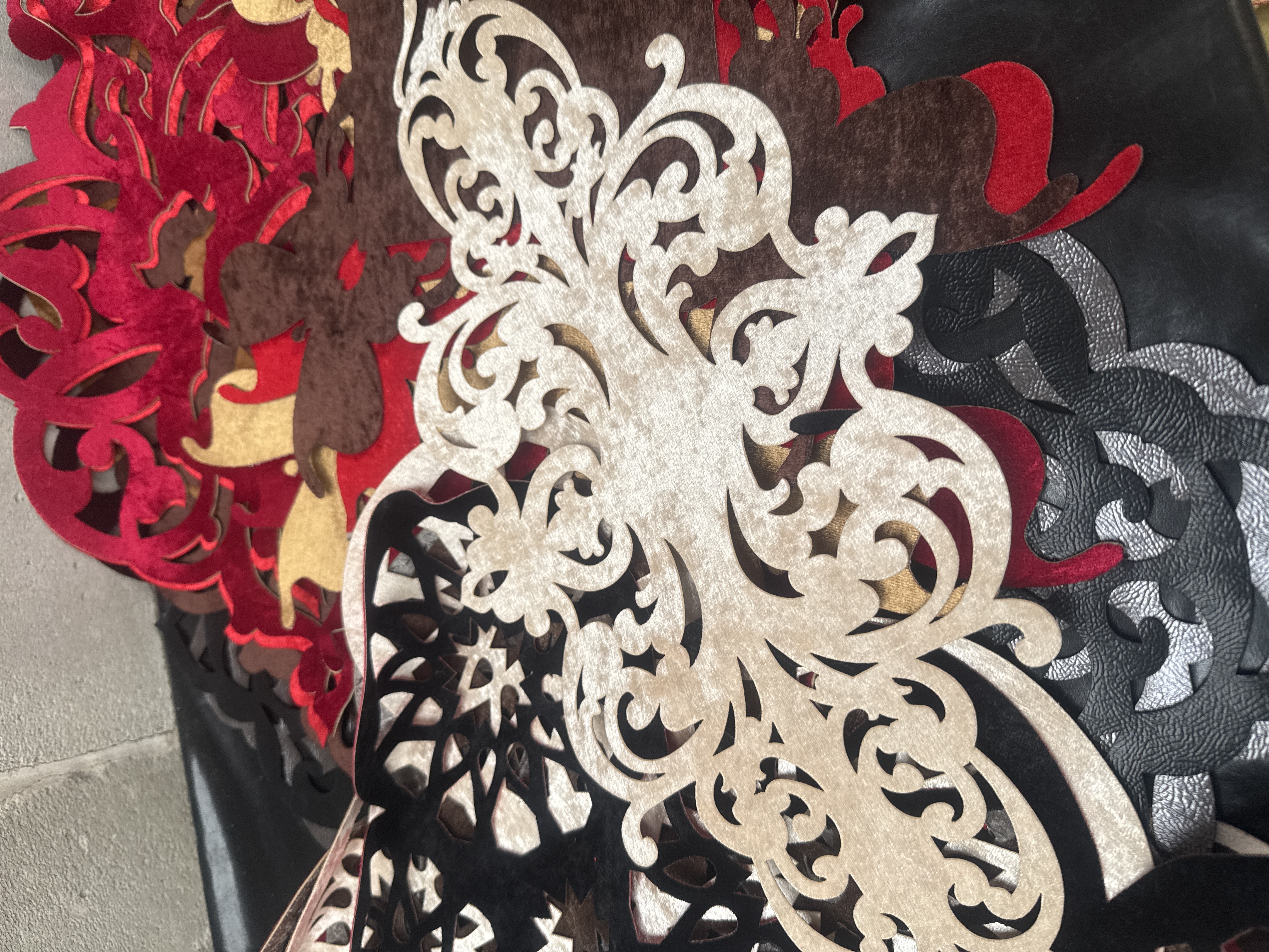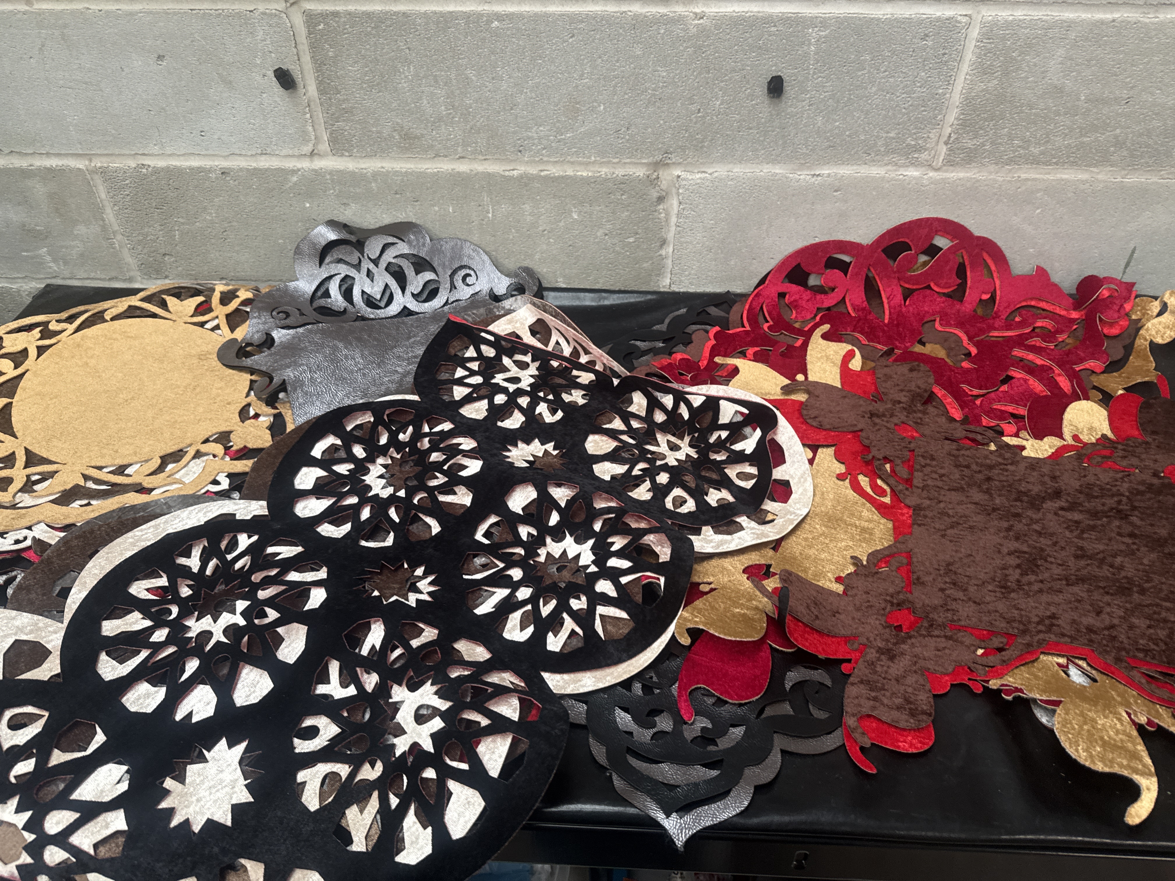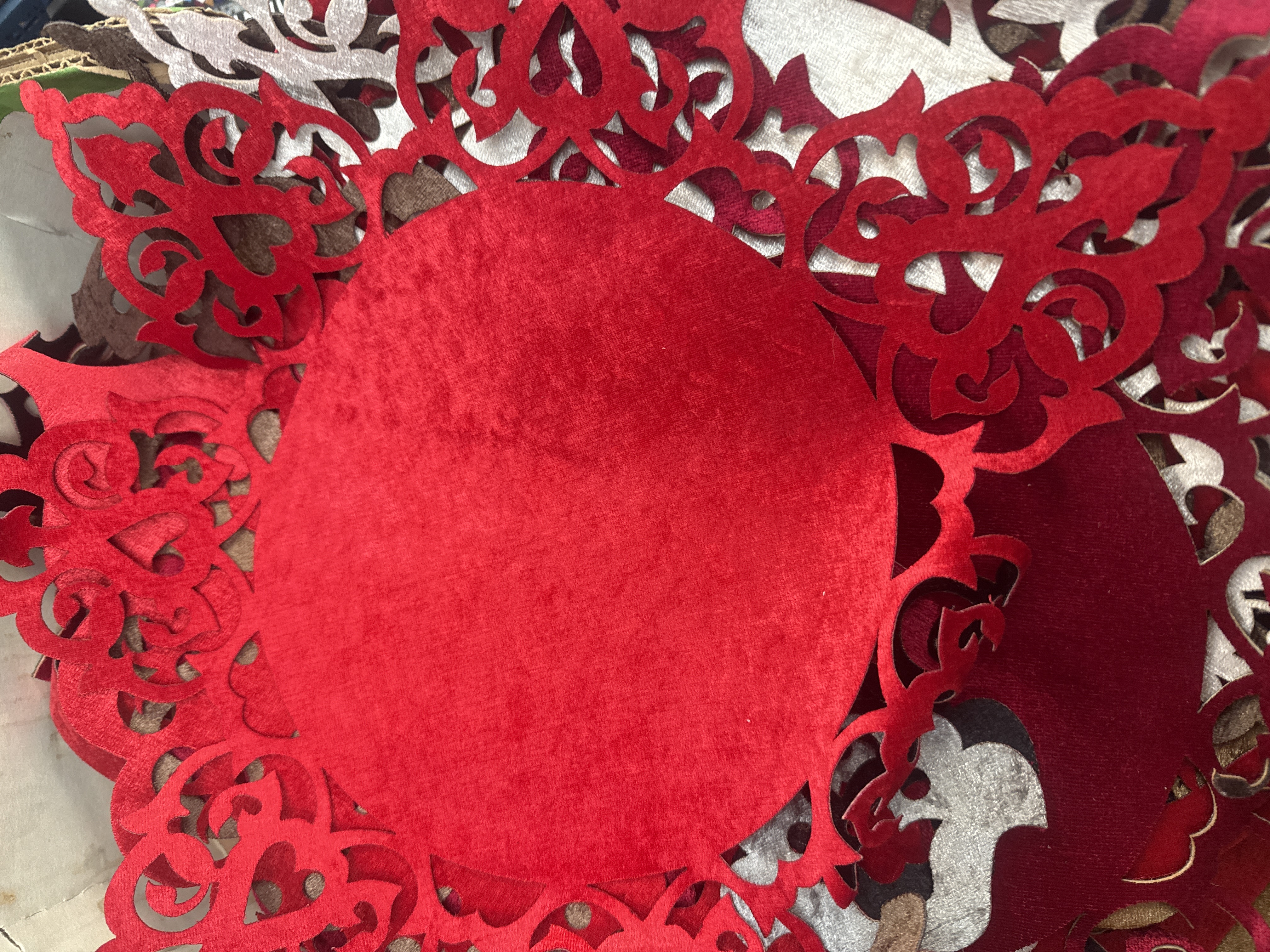 A substantial collection of 22 decorative mats or placemats constructed from a textile material resembling felt or synthetic velvet. The items feature complex openwork designs created using a laser-cut or die-cut technique. The patterns include intricate geometric motifs, reminiscent of Islamic star designs, and detailed scrolling foliate or arabesque motifs. The collection presents a varied palette of colors and finishes, including solid red, black, dark brown, beige/cream, and metallic finishes in gold and silver. The style is consistent with modern decorative craft production. No visible manufacturer markings, stamps, or inscriptions are present.