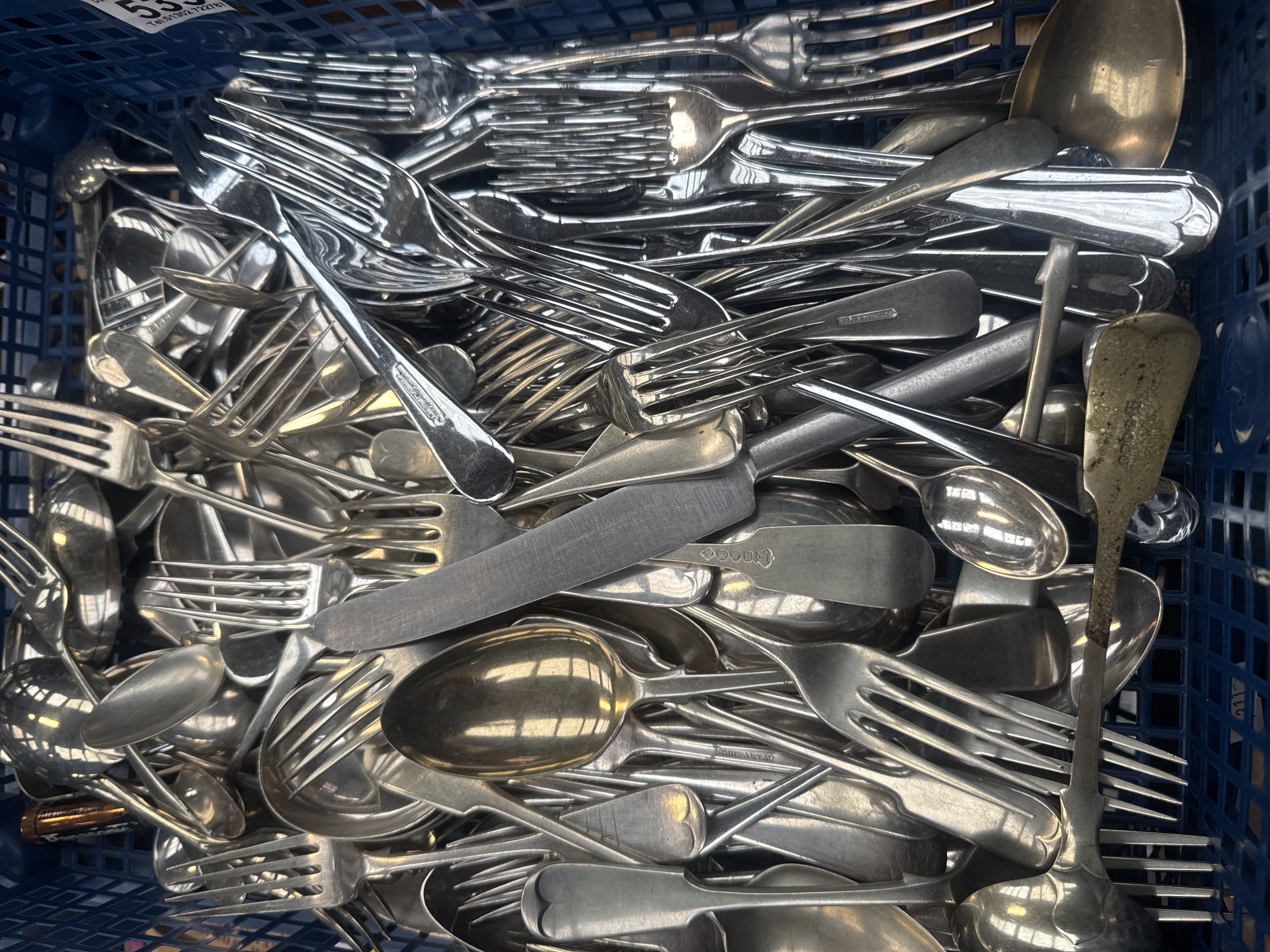 This is an extensive bulk lot of mixed flatware, haphazardly stored in a blue plastic crate. The collection includes various utensils such as forks, spoons, and knives, representing a heterogeneous mix of styles, including examples resembling the Fiddle pattern, plain handles, and decorative edging. Materials are mixed, comprising stainless steel, with some knife blades and handles marked SHEFFIELD STAINLESS, and plated metals, evidenced by visible hallmarks and crests on the reverse of some spoon handles, suggesting silver plate or EPNS origins.