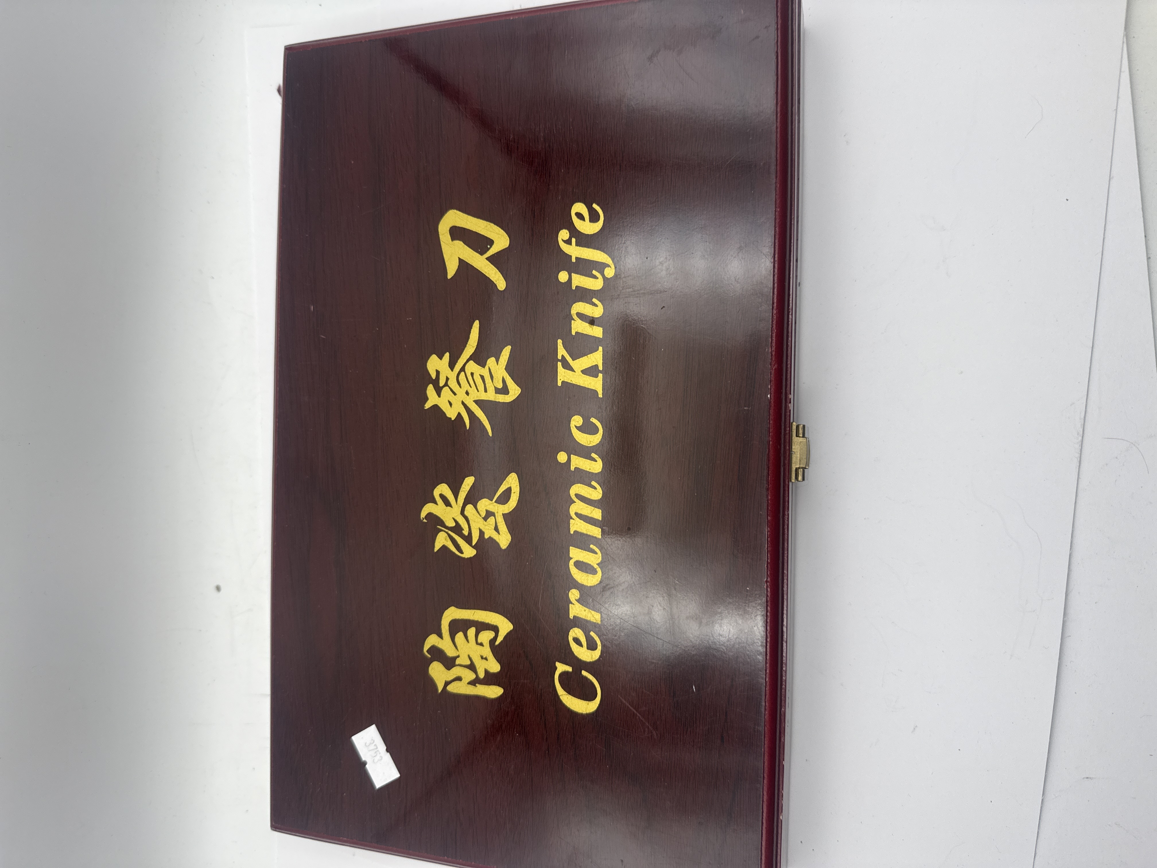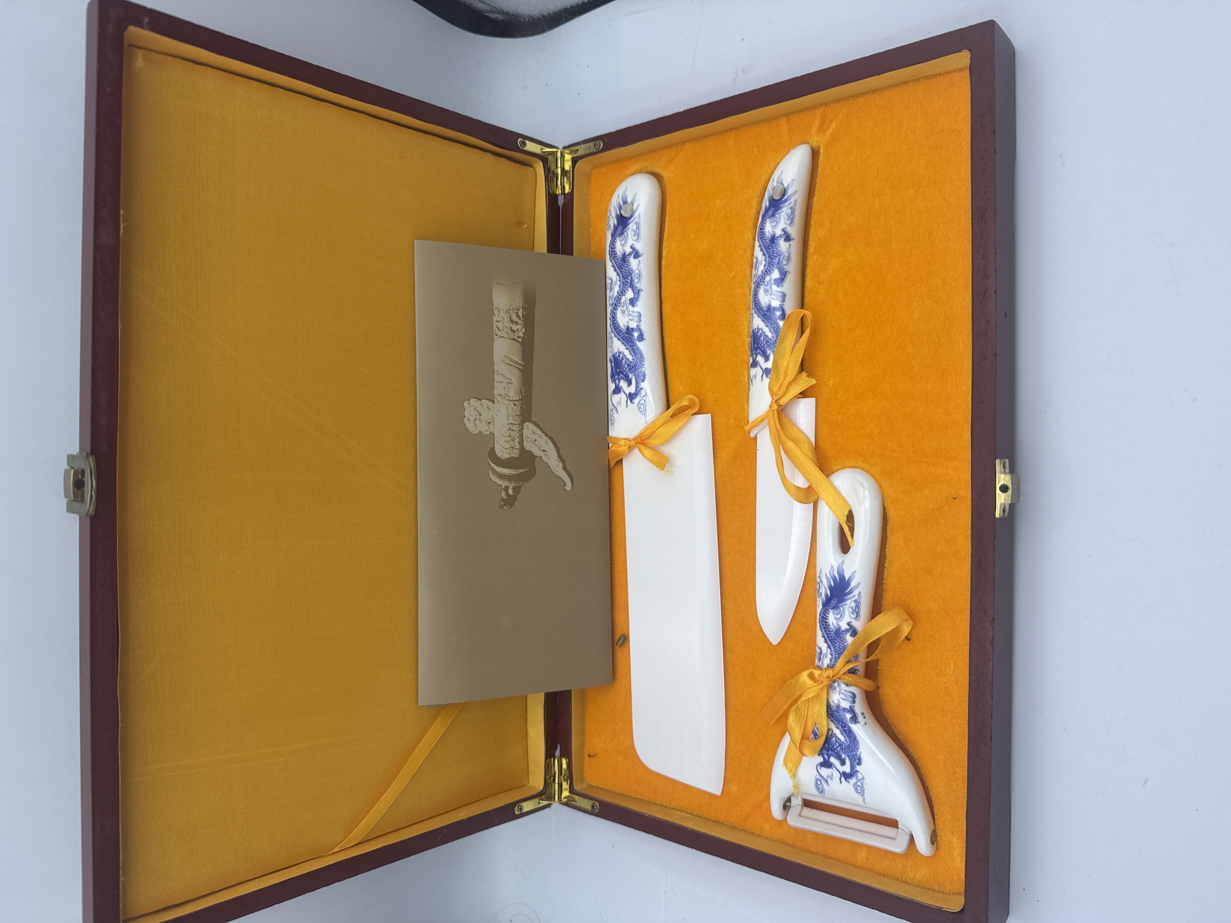 The lot consists of a four-piece ceramic kitchen tool set housed within a fitted wooden presentation box. The tools include a broad cleaver-style knife, a smaller utility knife, and a handheld peeler, along with one tan informational envelope. All three tools feature white ceramic blades and handles decorated with a cobalt blue underglaze dragon motif executed in a traditional Chinese style. Each handle is tied with a small yellow ribbon. The presentation box is constructed of dark, reddish-brown stained wood, lined internally with fitted yellow satin fabric. The exterior lid bears painted gold lettering reading the Chinese characters “陶瓷餐刀” (Táo cí cān dāo), translated underneath as “Ceramic Knife.” The set is consistent with modern manufacture and is intended for kitchen or gift use.