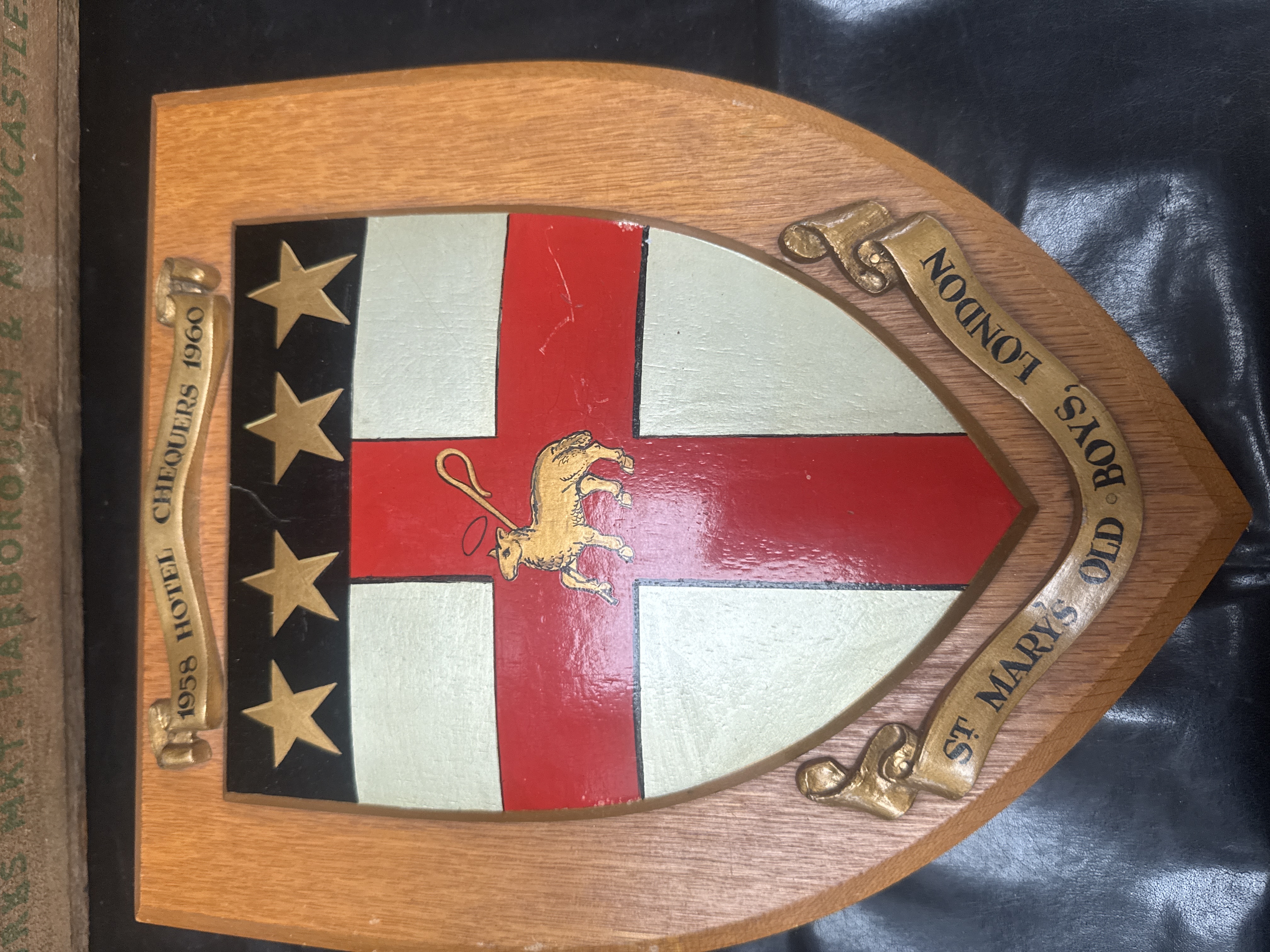 This two-piece lot consists of a wooden heraldic presentation plaque and a utilitarian wooden shipping crate. The shield-shaped plaque is executed in the style associated with the Terra Sancta Guild, featuring a customized coat of arms. The arms display a black chief charged with five gold stars, a red cross centered on a silver field, and the Agnus Dei (Lamb of God) depicted in gold at the center. Gold-toned scrolls carry the inscriptions “ST MARY’S OLD BOYS, LONDON” and “1958 HOTEL CHEQUERS 1960.” The accompanying rough-sawn wooden storage crate is marked with large green stenciled text reading “TUNGSTONE,” followed by location identifiers: “37 SAYER SQ. LONDON E.C.4” and “WORKS MKT. HARBOROUGH & NEWCASTLE.”
