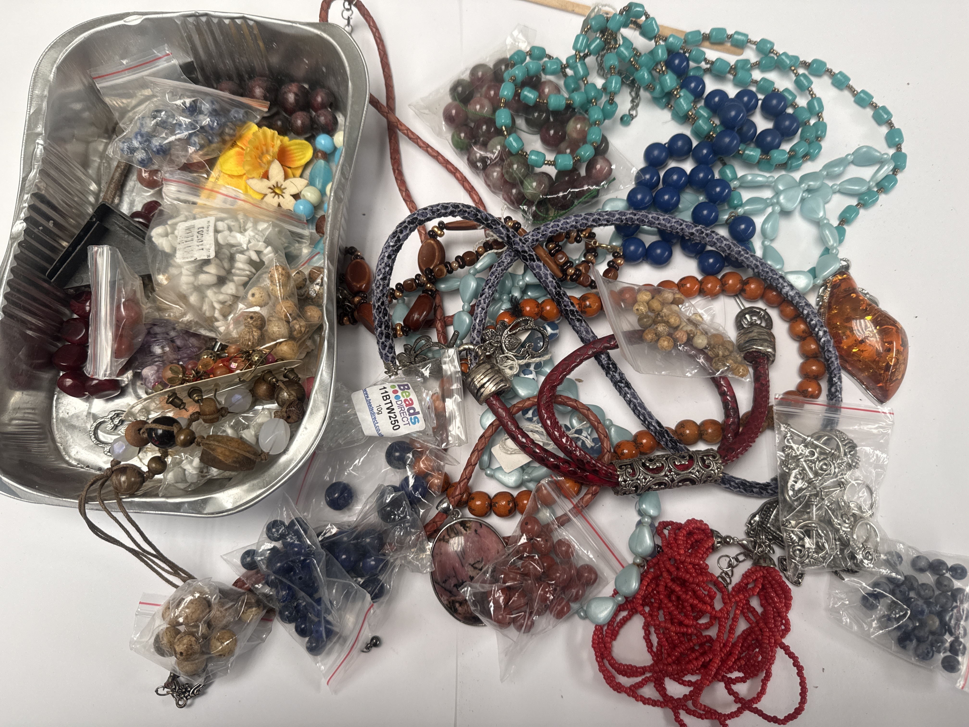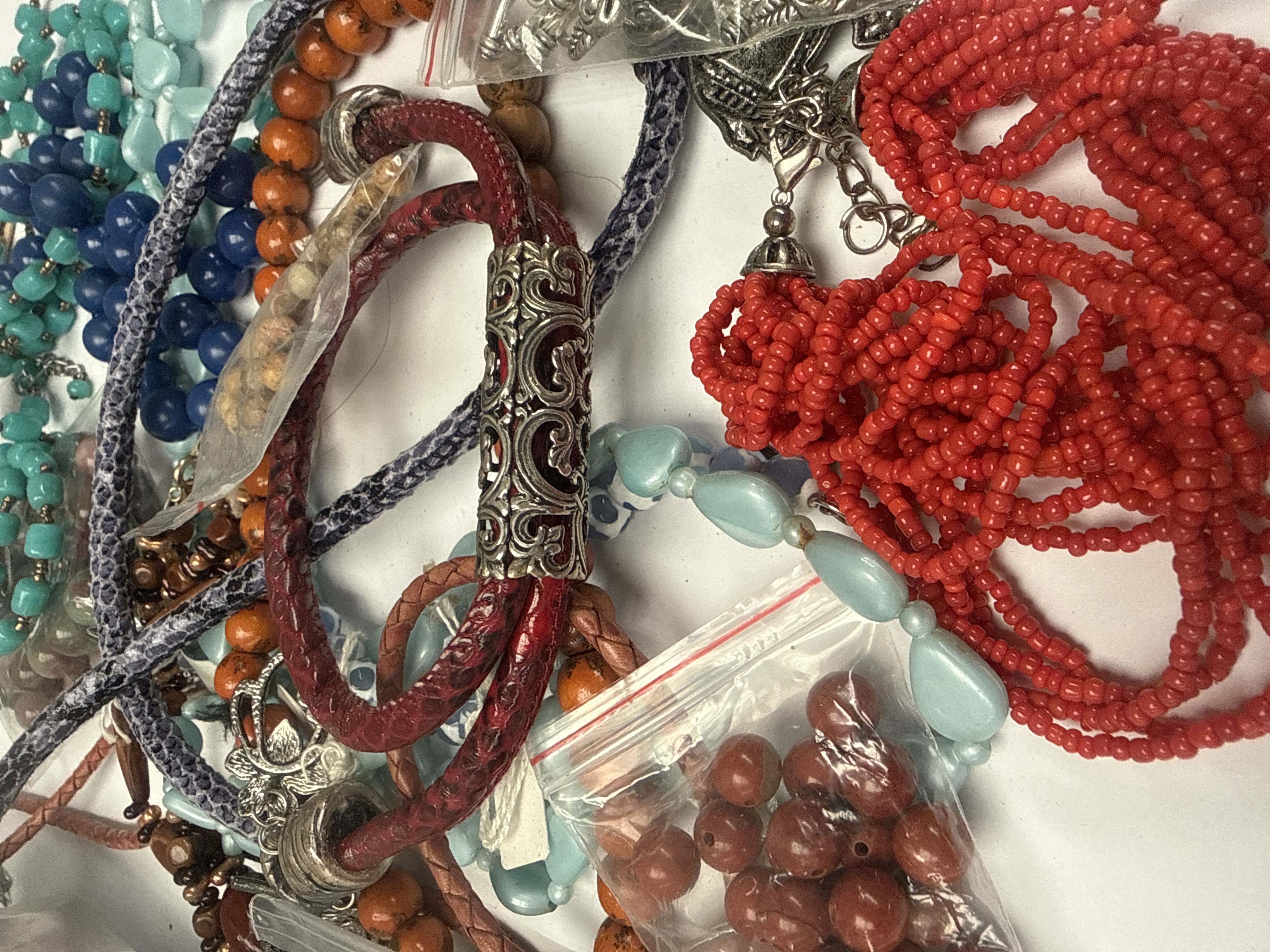 This collection consists finished costume jewelry pieces, loose components, and packaged bead supplies. The lot features a variety of styles, primarily bohemian and crafted designs, utilizing materials such as natural stone, glass, wood, base metal findings, and leather cord. The color palette is extensive, encompassing strands of red seed beads, large dark blue and turquoise beads, and earthy brown and speckled tan beads. Notable finished pieces include a prominent red snake-skin embossed style leather bracelet secured by a heavy silver-tone metal clasp, and several long strands of beads in dark blue, turquoise, and light blue glass or stone. Bead supplies are packaged in small clear plastic bags, featuring various colors and materials such as speckled tan/brown stone, dark blue stone, and white/grey stone. One visible bag contains the printed marking READS 118TW250. The entire collection is partially contained within a disposable metal foil tray.