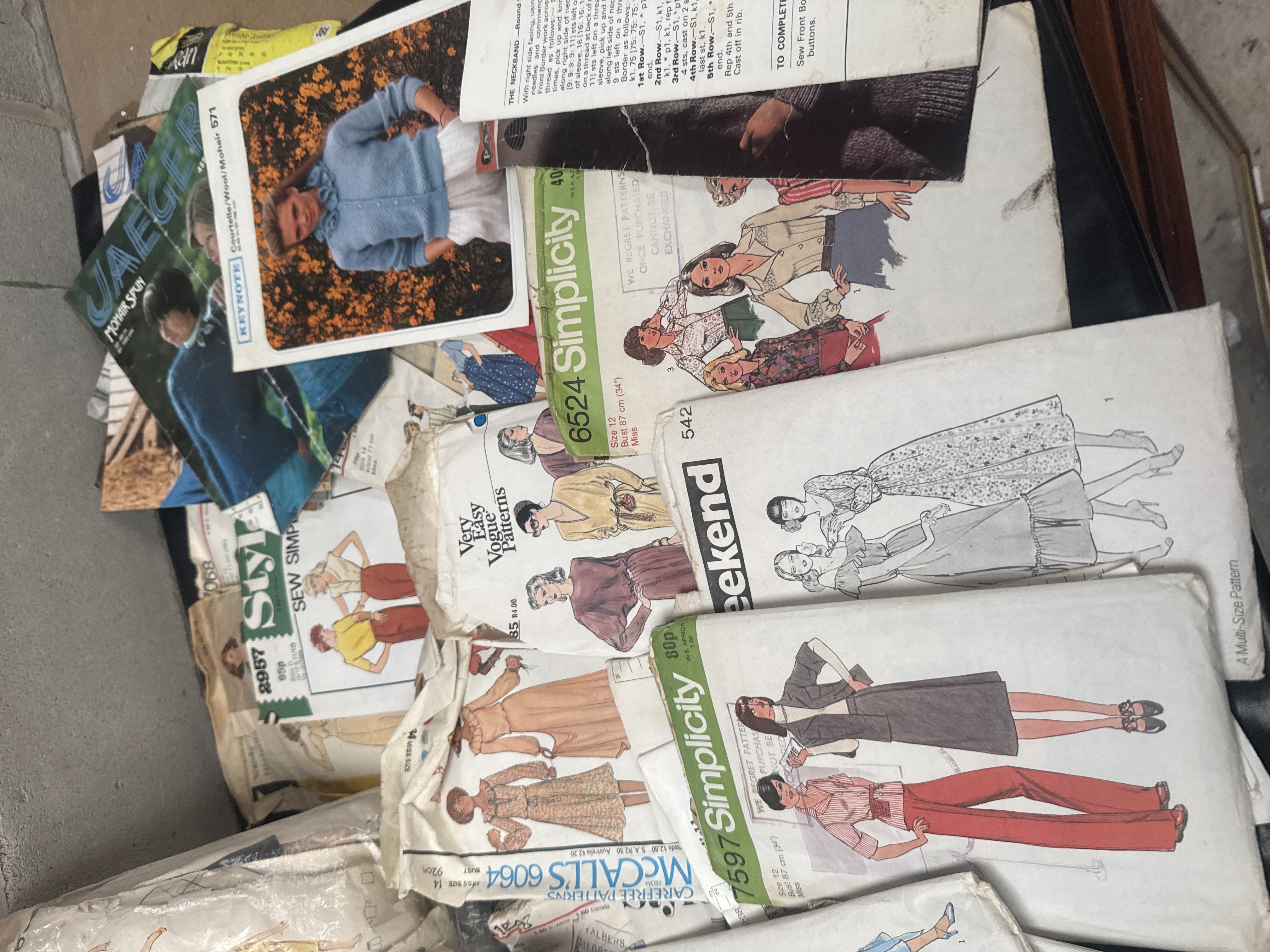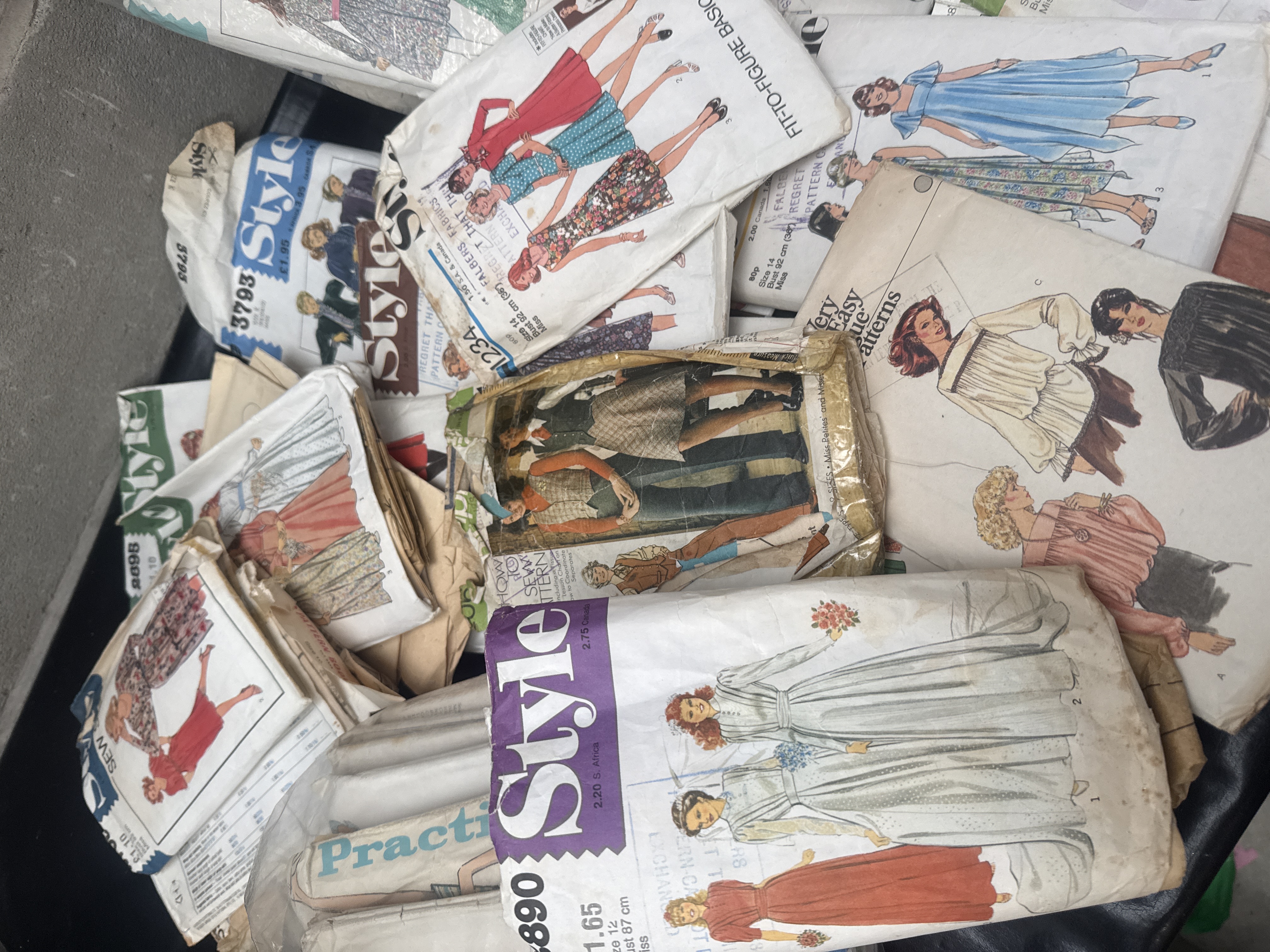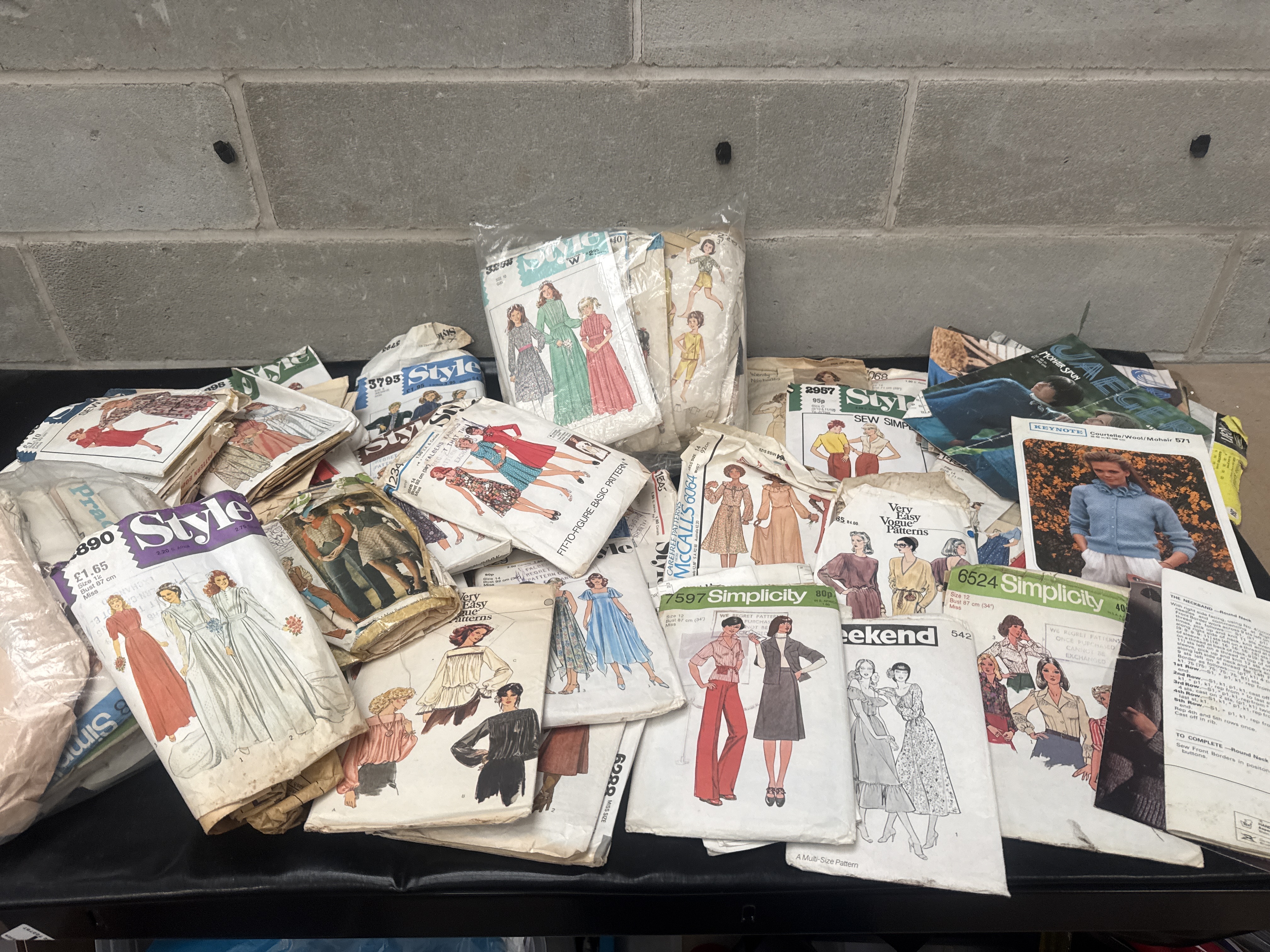 A large collection of 26 vintage commercial sewing patterns, primarily dating to the 1970s and 1980s. The lot includes patterns for various garments such as bridal wear, suits, dresses, shirts, and trousers, reflecting the fashion styles of the period. Manufacturers represented include major commercial brands such as Style, Simplicity, McCall’s, Vogue (including ‘Very Easy Vogue Patterns’), and Keynote. The patterns are constructed of paper and housed in cardstock envelopes. Visible pattern numbers include 3890, 7597, and 6624, among others. Original price markings such as £1.65 and 80p are visible on several envelopes. Some patterns are bundled together in clear plastic bags.