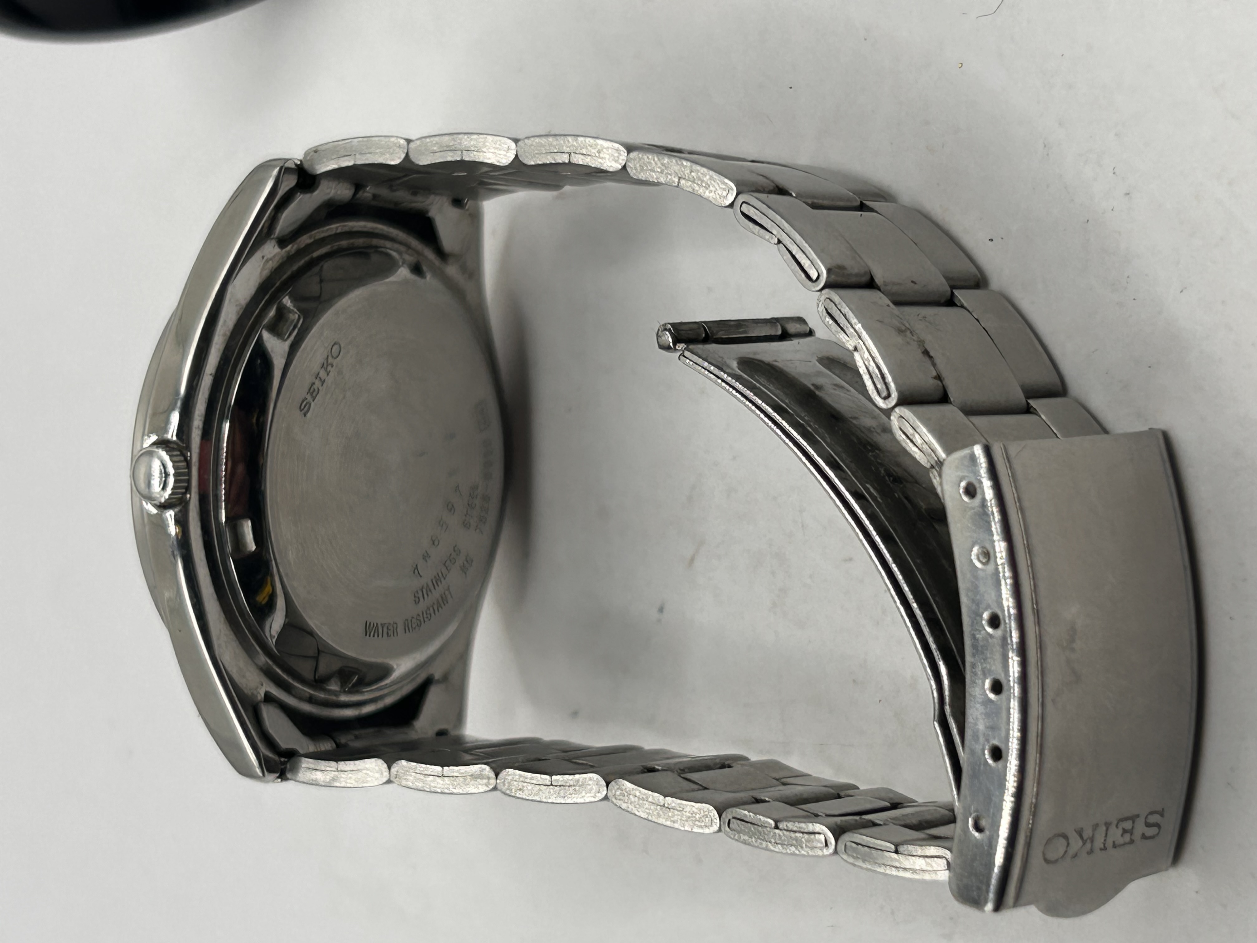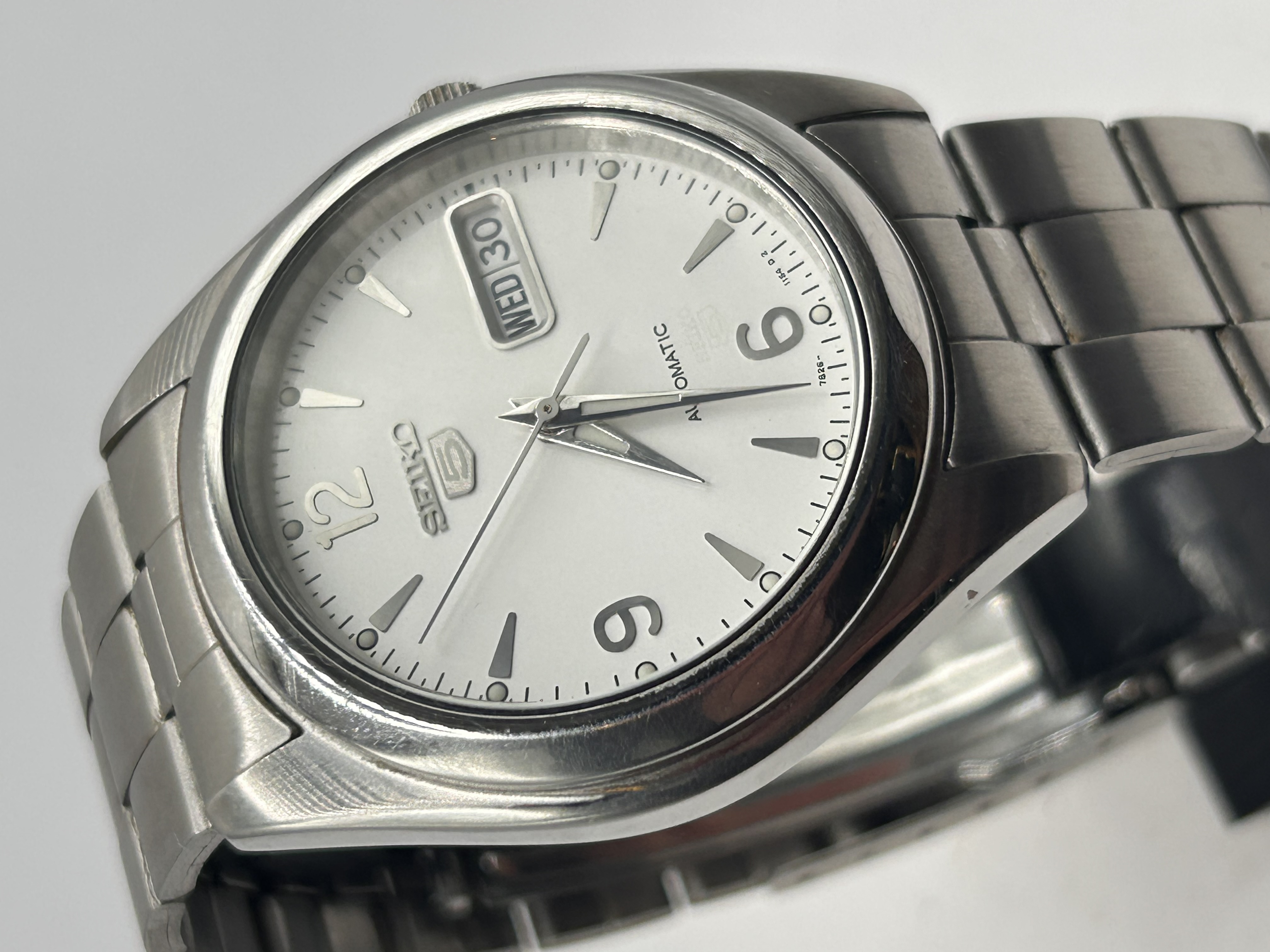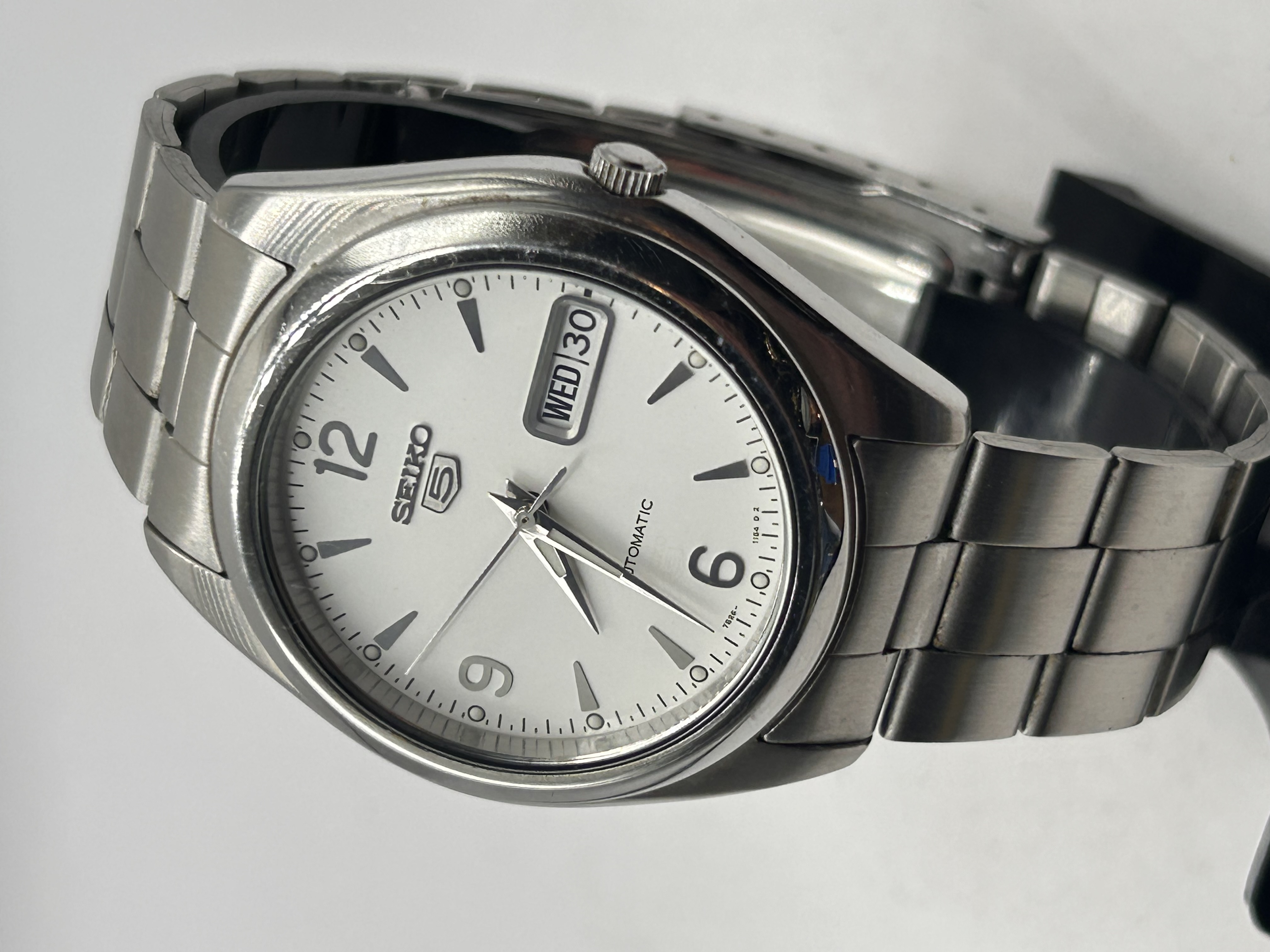 An automatic analog wrist watch identified by market consensus as a Seiko 5 model, utilizing the 7S26 caliber movement. The watch features a round stainless steel case and an integrated three-link stainless steel bracelet secured by a fold-over deployant clasp signed SEIKO. The dial is white/silver with applied baton indices and Arabic numerals at the 12, 9, and 6 positions. A day/date complication window is located at the 3 o’clock position, currently displaying WED 30. Dial markings include SEIKO, the 5 logo, AUTOMATIC, and the small text 7S26- 11S4 R 2. The caseback is marked SEIKO, STAINLESS STEEL, and WATER RESISTANT, along with various manufacturing codes.