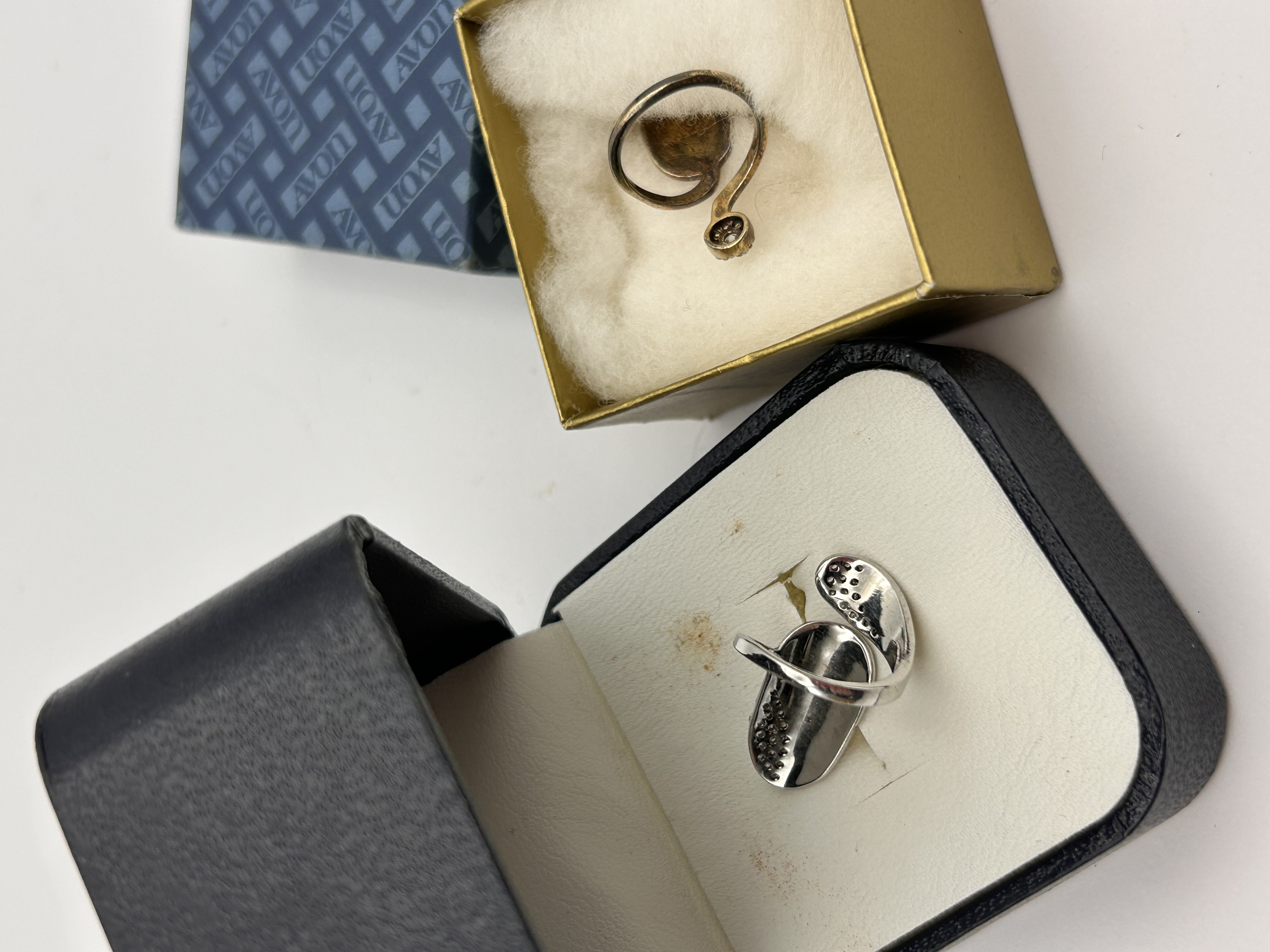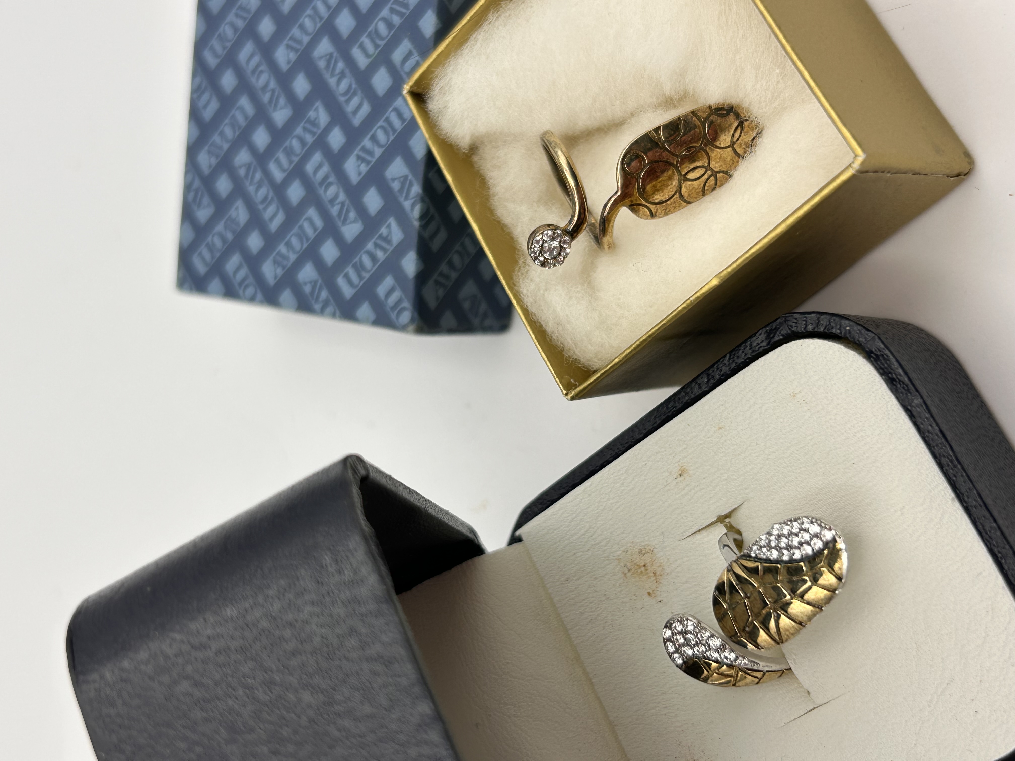 A collection of four pieces of vintage costume jewelry, primarily consisting of fashion nail rings (phalange rings) and one standard finger ring. The items are constructed of base metal, finished in gold-tone and silver-tone plating, accented with clear, colorless paste stones or rhinestones. The lot includes a gold-toned spiral wrap nail ring featuring a textured, stylized oval form and a single rhinestone accent; a two-tone nail ring with a textured center flanked by rhinestone-set wings; an elongated silver-tone nail ring with a perforated textured pattern; and a substantial gold-toned finger ring with a scalloped band design. The lot is accompanied by three open jewelry boxes, one of which features a repeating ‘AVON’ pattern on the lid, suggesting the items are vintage Avon costume jewelry.