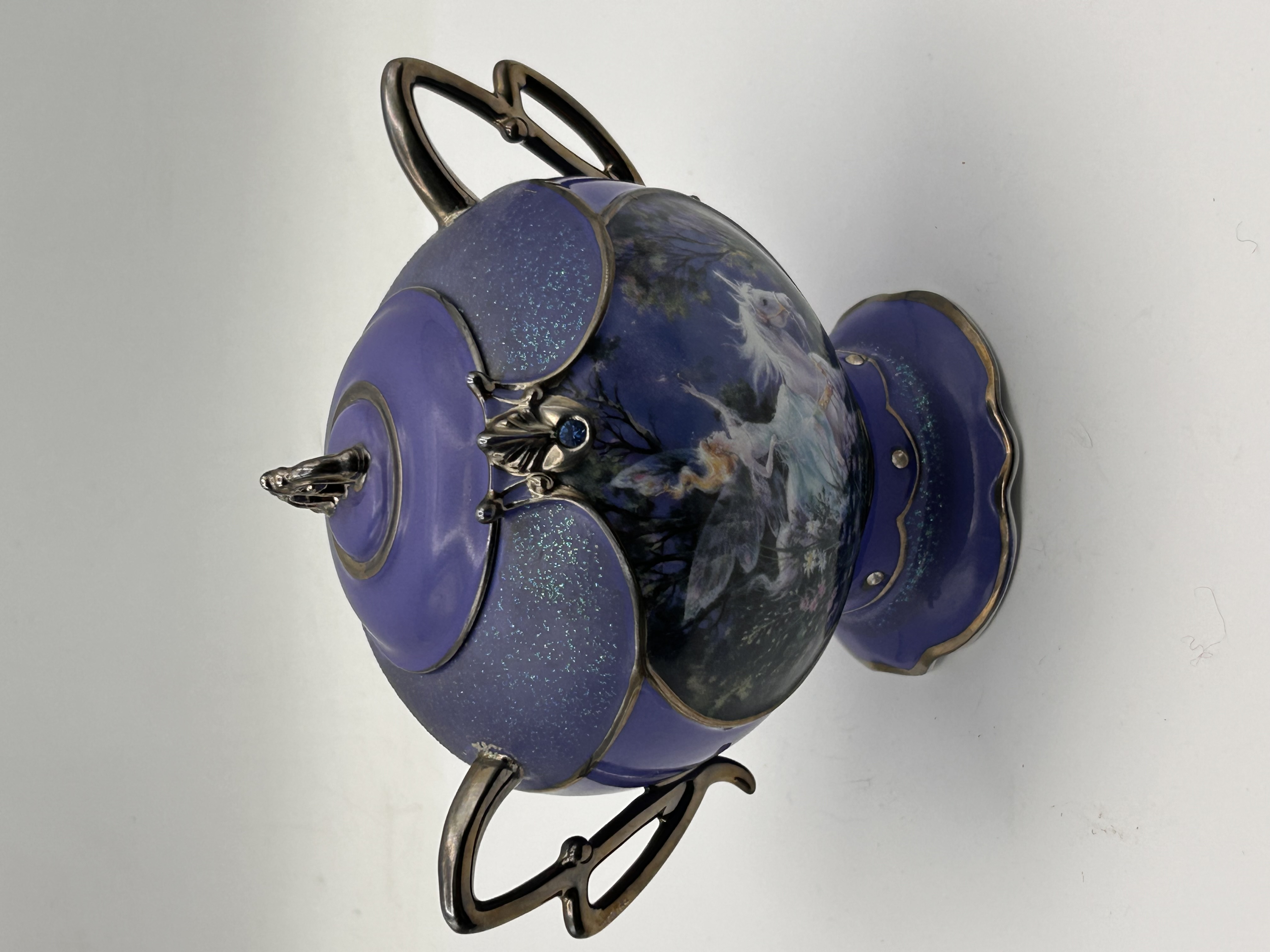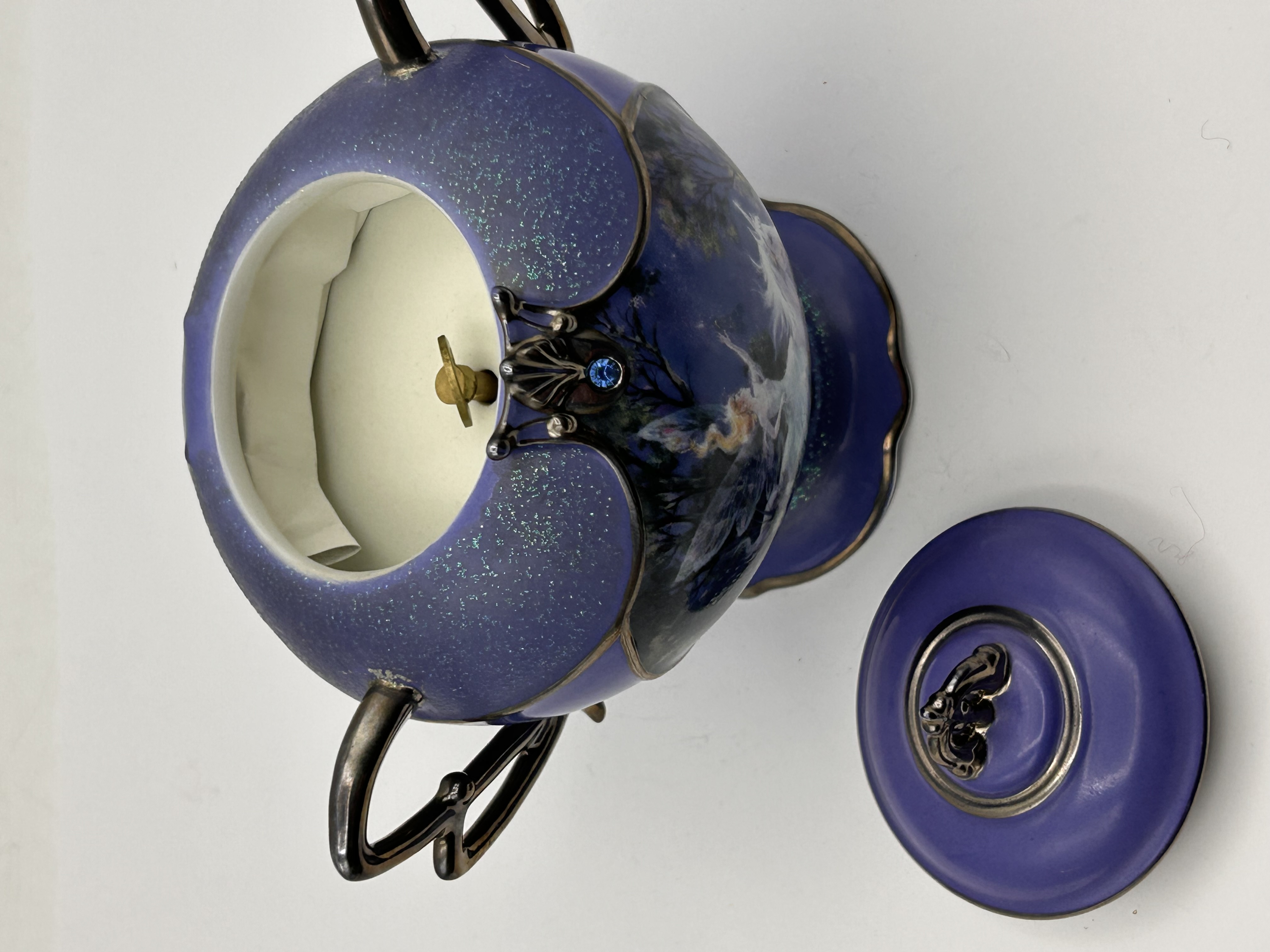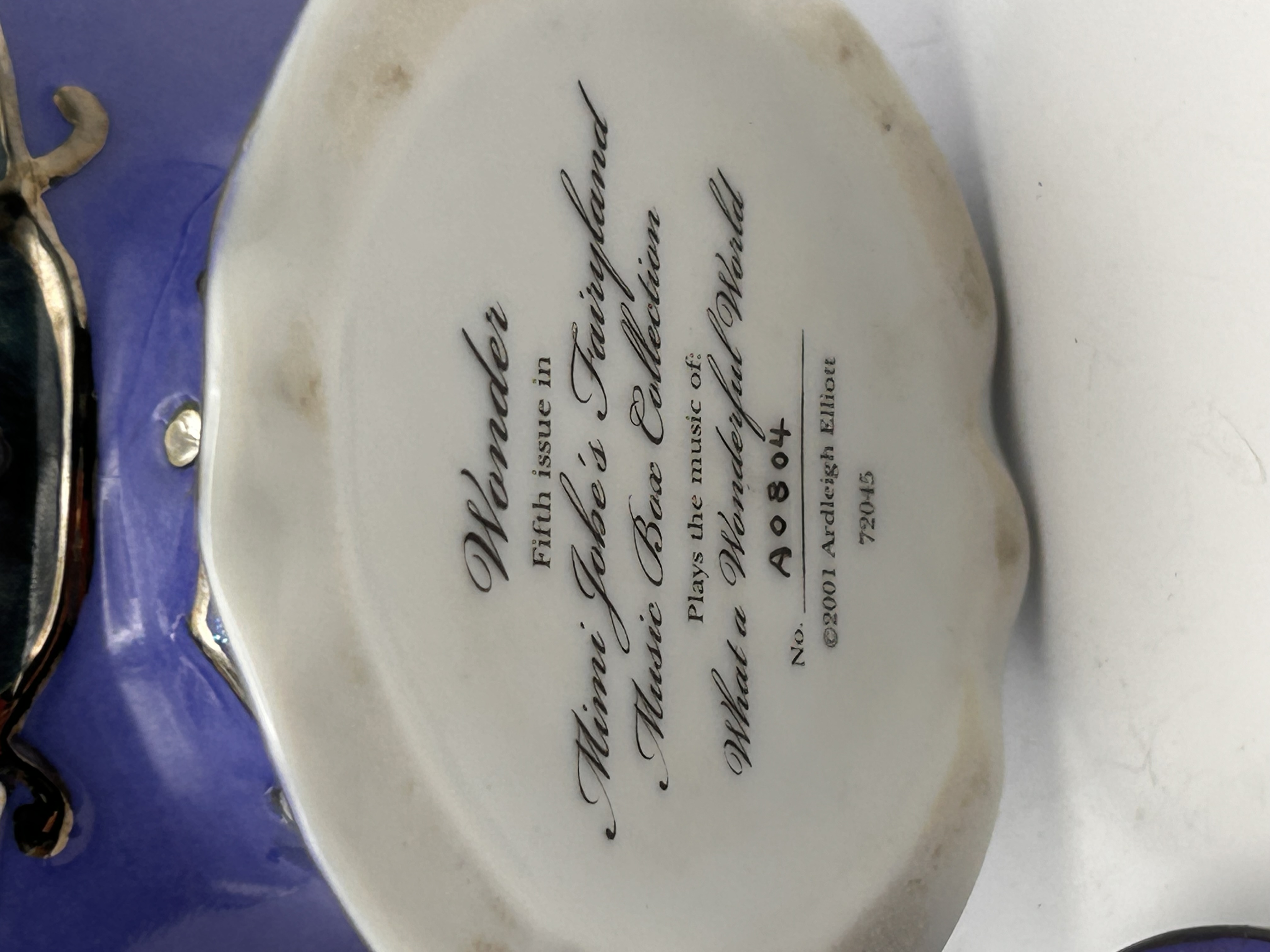A single ceramic lidded music box produced by Ardleigh Elliott in 2001, identified as ‘Wonder,’ the Fifth issue in Mimi Jobe’s Fairyland Music Box Collection. The vessel is finished in a deep purple, glitter-speckled glaze, featuring a transfer decoration around the central body depicting a nighttime woodland scene with fairies and a unicorn. The piece is accented with silver-tone metallic handles, gold-tone trim, and a small finial figure on the lid. A blue faux gemstone detail is mounted on the front of the vessel. The music box mechanism is housed within the unglazed white interior and plays the tune “What a Wonderful World.” The base contains extensive printed markings identifying the piece as ‘Wonder,’ ‘Fifth issue in Mimi Jobe’s Fairyland Music Box Collection,’ ‘Plays the music of: What a Wonderful World,’ the unique number ‘No. A0804,’ and the copyright ‘©2001 Ardleigh Elliott 72045.’