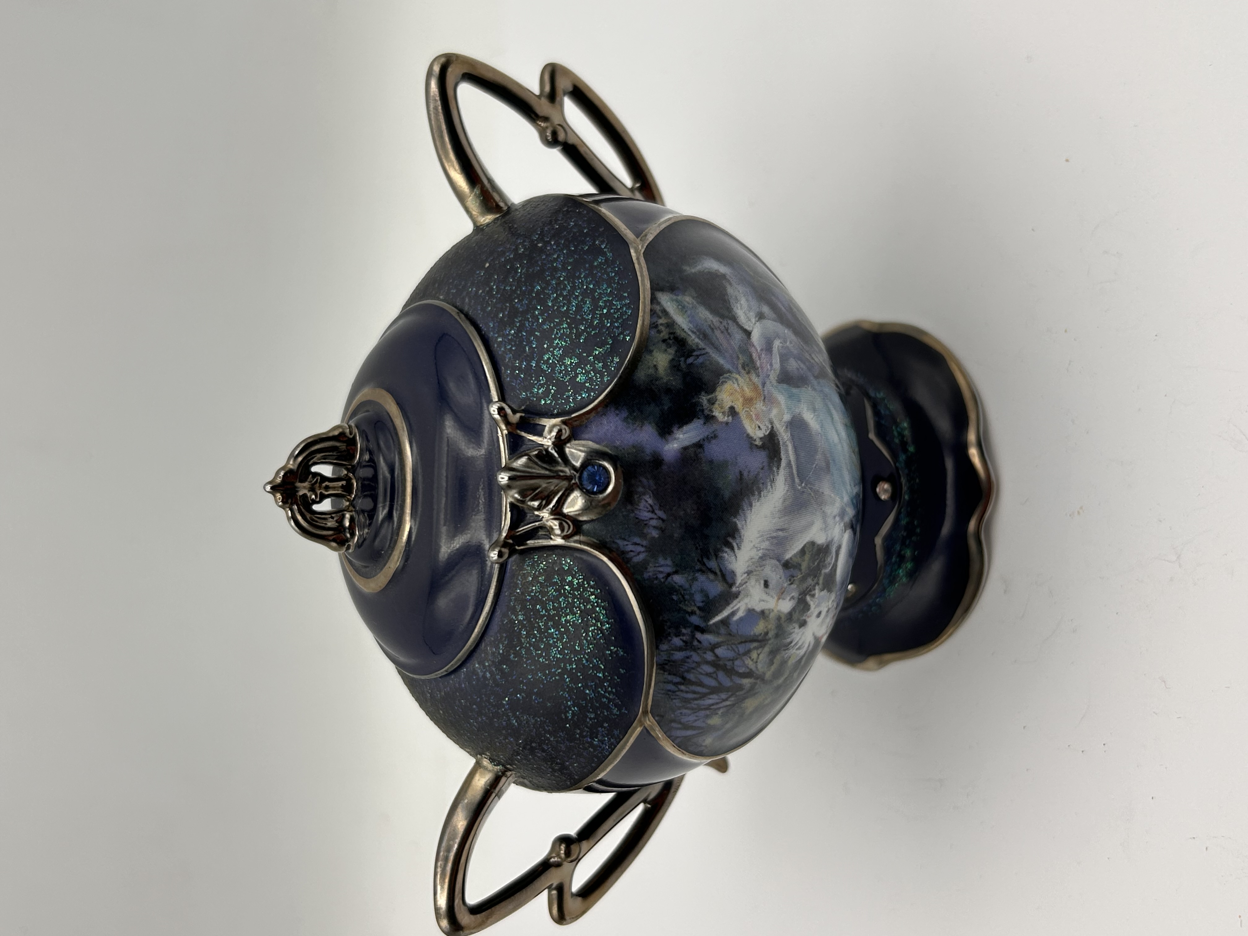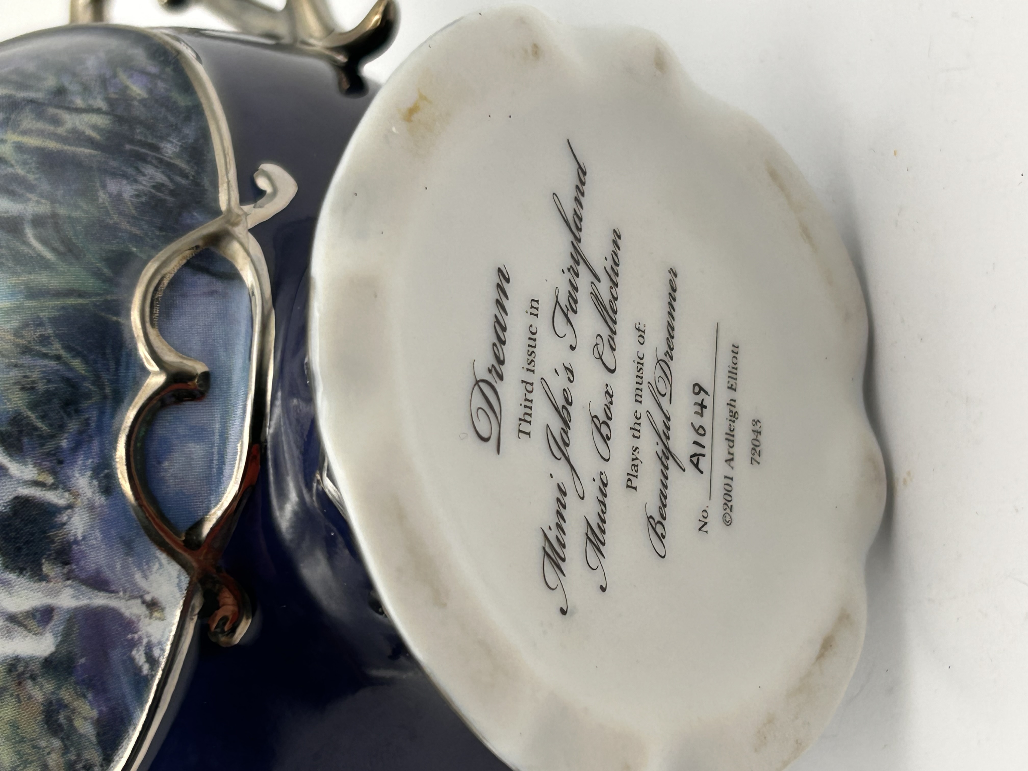 A single lidded music box manufactured by Ardleigh Elliott, copyrighted 2001, titled “Dream.” This piece is identified on the base as the “Third issue in Mimi Jobe’s Fairyland Music Box Collection.” The music box is constructed of dark navy blue porcelain or ceramic, styled as a two-handled, globe-shaped urn in the Fantasy style. Decoration includes silver-toned metal handles, trim, and a crown-shaped finial. The body features a central transfer-printed scene depicting a unicorn and a fairy in a dark forest setting. The upper portion is accented with iridescent blue glitter, and a small blue cabochon stone is set at the front. The base is marked with the issue number A1649 and notes that the music box plays the tune “Beautiful Dreamer.”
