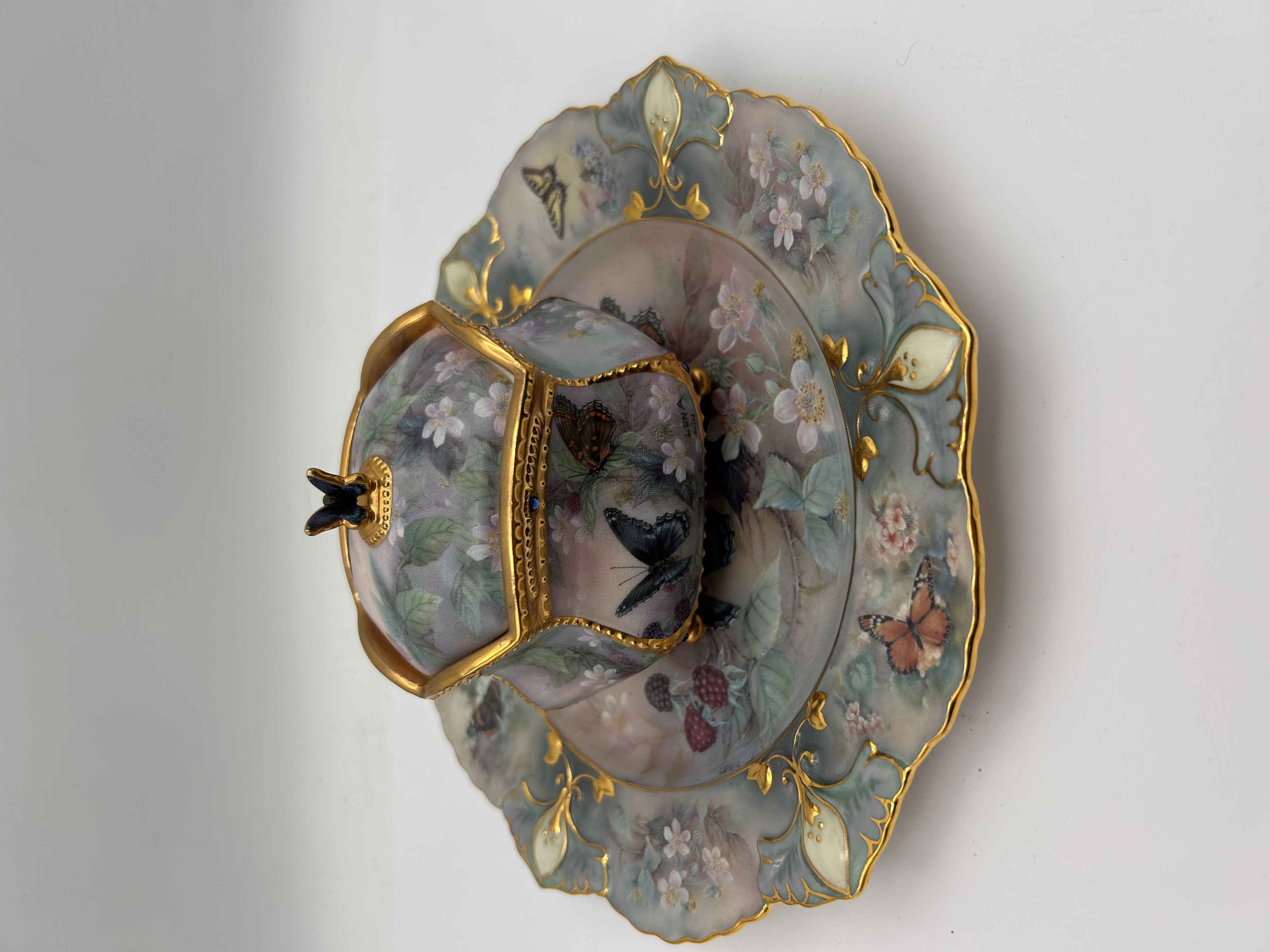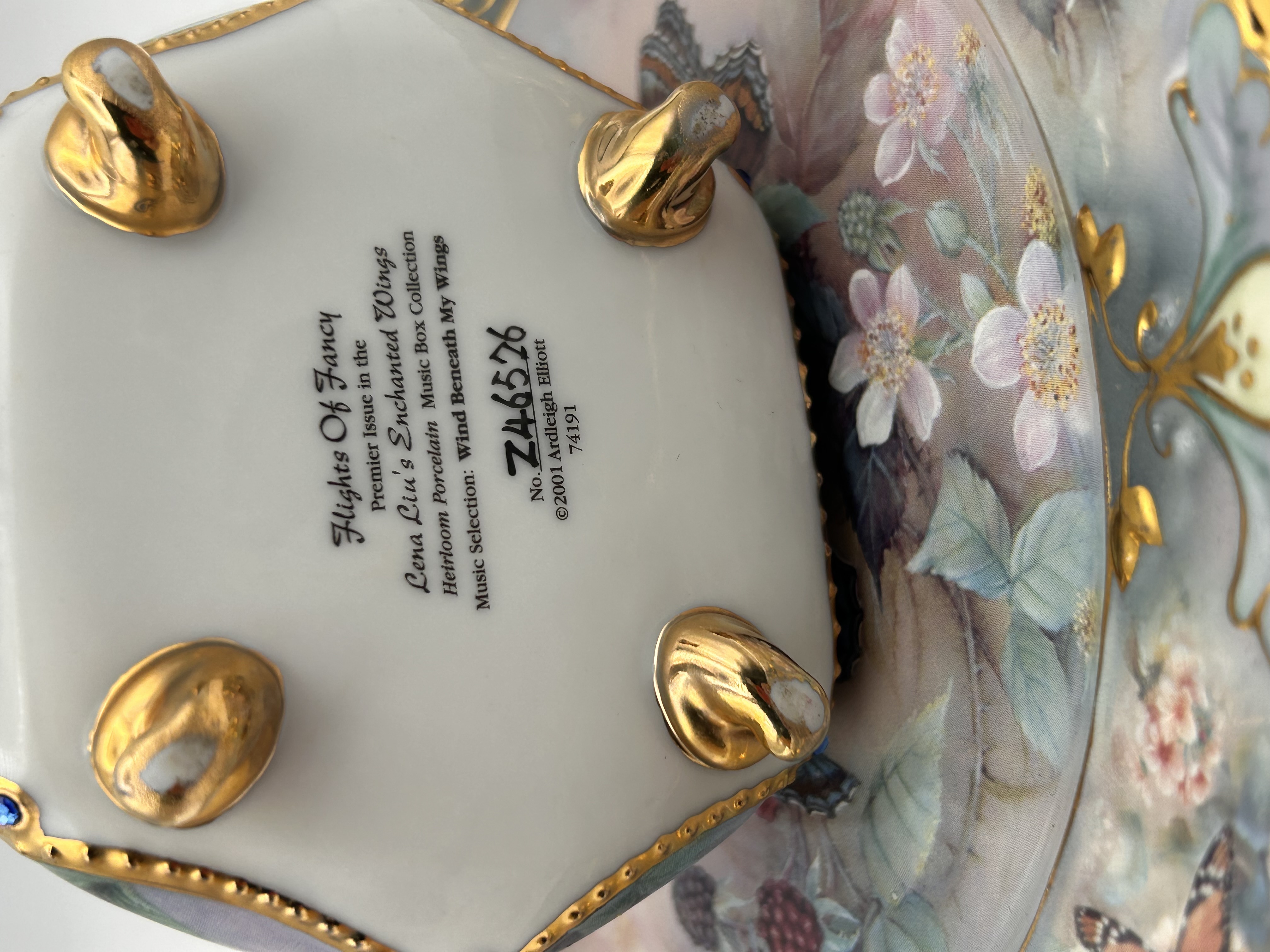 A pair of coordinating porcelain items from the Lena Liu’s Enchanted Wings Heirloom Porcelain Music Box Collection, dated 2001. The set includes a hexagonal lidded music box and a scalloped underplate. Both pieces feature detailed transfer-printed decoration of butterflies, berries, and pastel florals set against grayish-green and pink grounds. The pieces are heavily accented by bright gold trim on the rims. The music box stands on four ornate gold feet and is topped with a small black butterfly finial. The underside of the lidded box bears black printed text identifying the piece as “Flights Of Fancy,” the “Premier Issue in the Lena Liu’s Enchanted Wings Heirloom Porcelain Music Box Collection,” with a “Music Selection: Wind Beneath My Wings,” dated ©2001 Ardleigh Elliott, and numbered Z46526.
