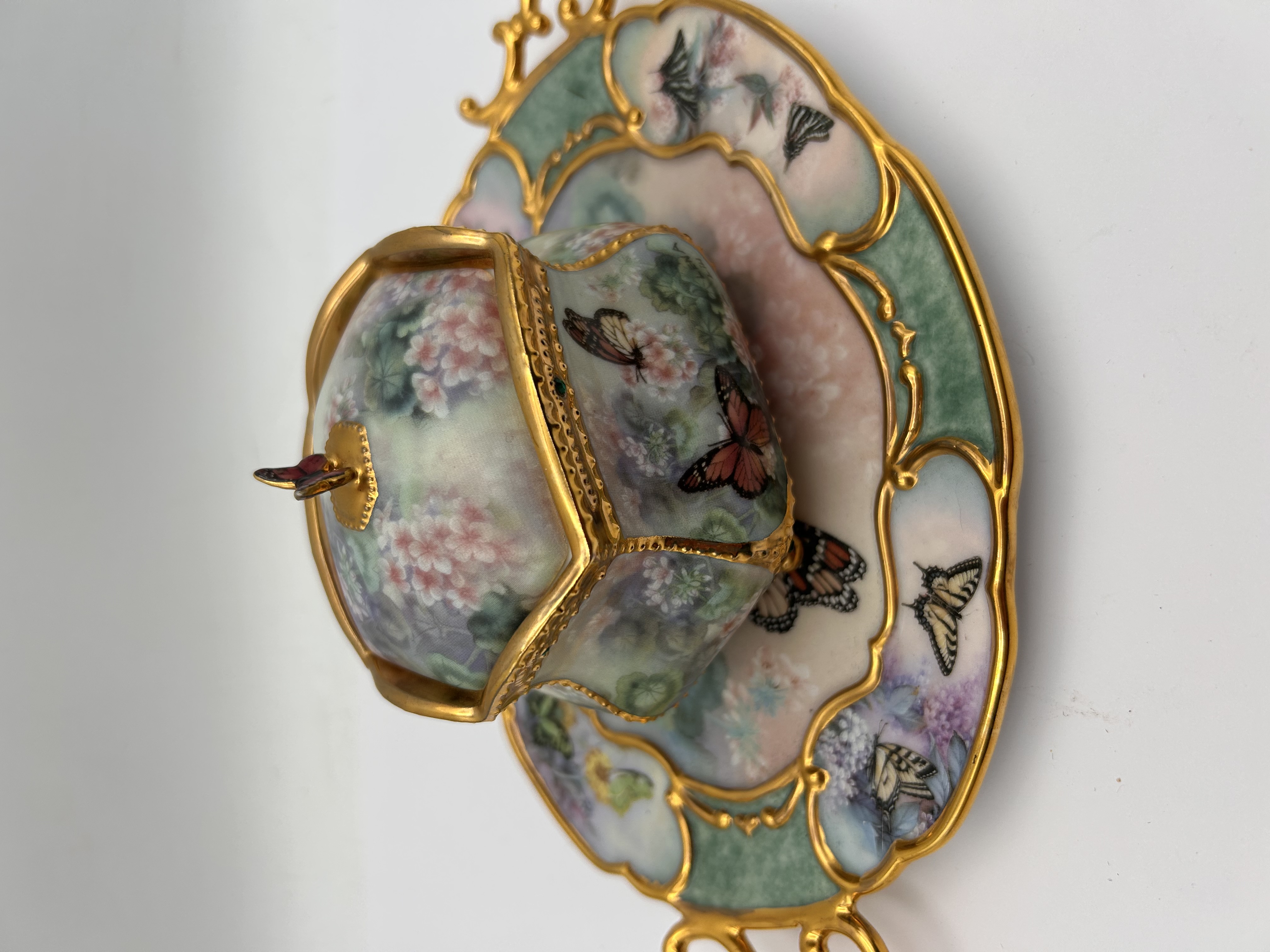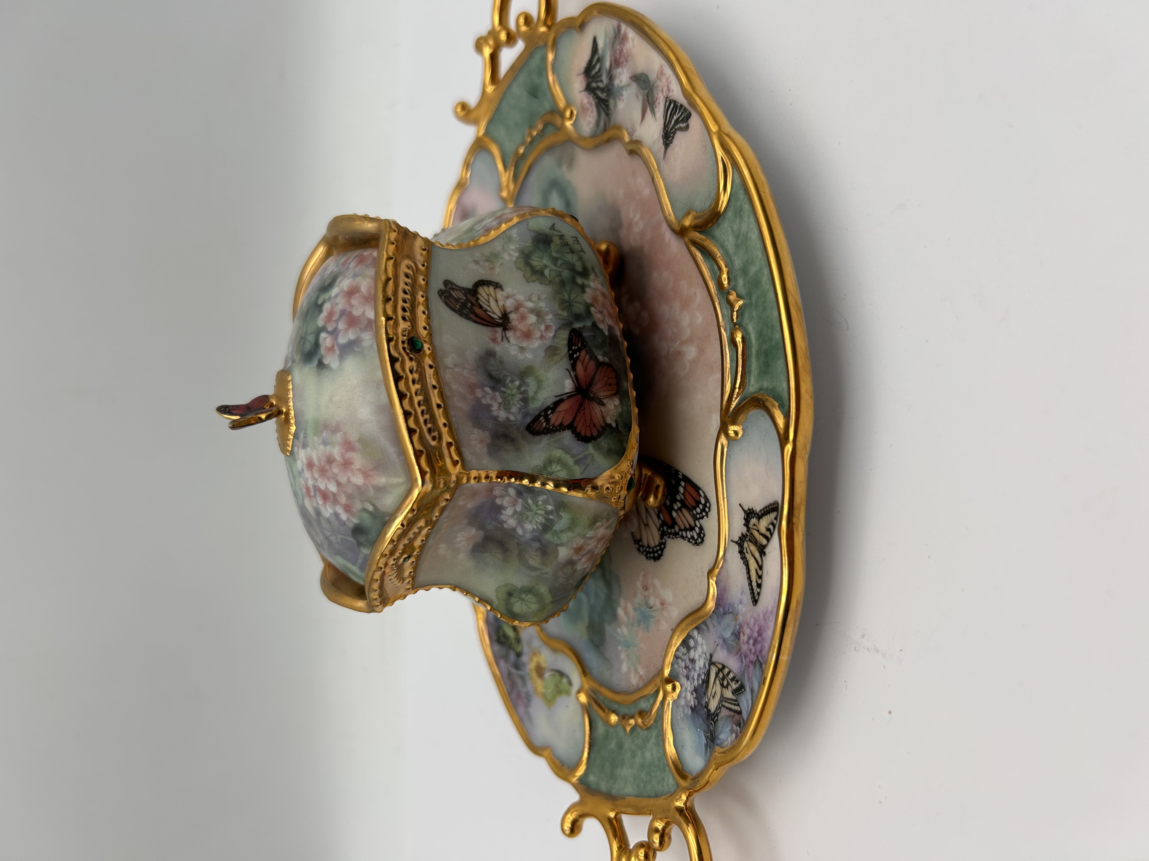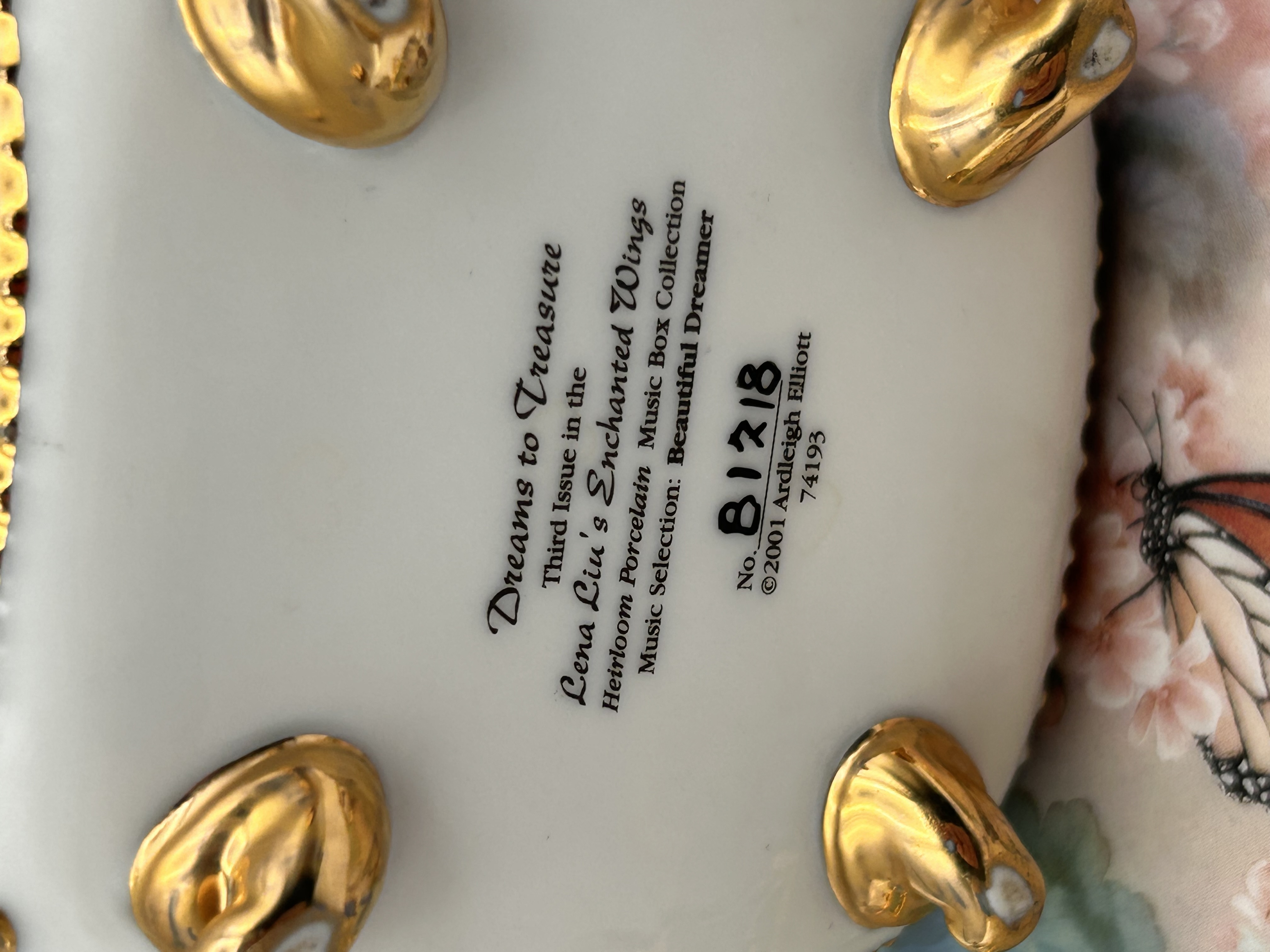 A two-piece set consisting of a lidded music box and an accompanying oval serving tray, produced by Ardleigh Elliott in 2001 as part of the Lena Liu’s Enchanted Wings Heirloom Porcelain Music Box Collection. The set is constructed of ceramic or porcelain and features extensive gilt accents applied to the scalloped rims, the scrolling handles of the tray, and the four feet and butterfly finial of the box. The decoration utilizes detailed transfer prints and painting depicting flowering gardens and numerous butterflies rendered in pastel shades of green, pink, and purple. The music box is quadrangular in form. The base of the box is marked with the collection details, identifying the specific issue as “Dreams to Treasure,” the Third Issue in the collection, and the specific issue number as B1218. The Music Selection is “Beautiful Dreamer.”