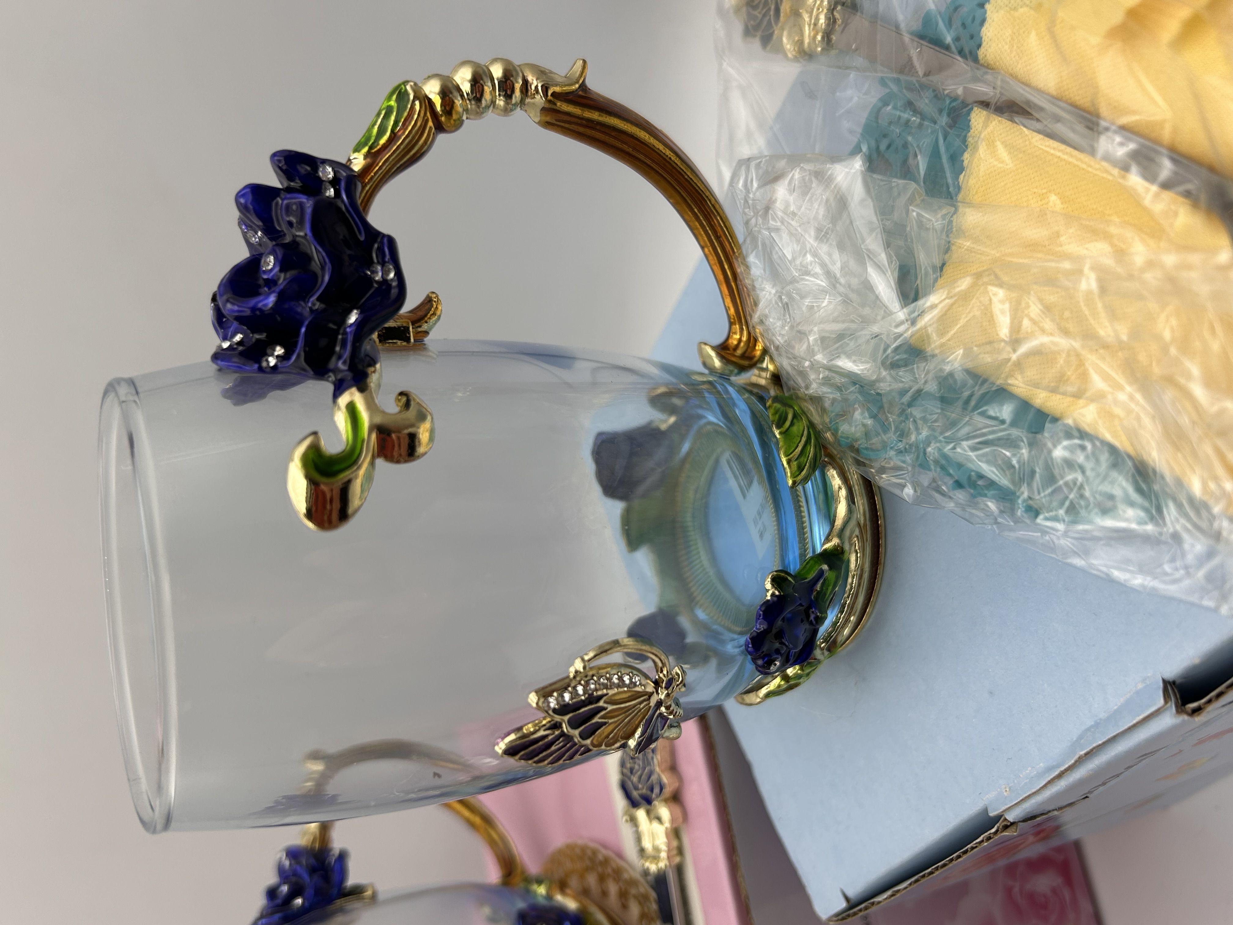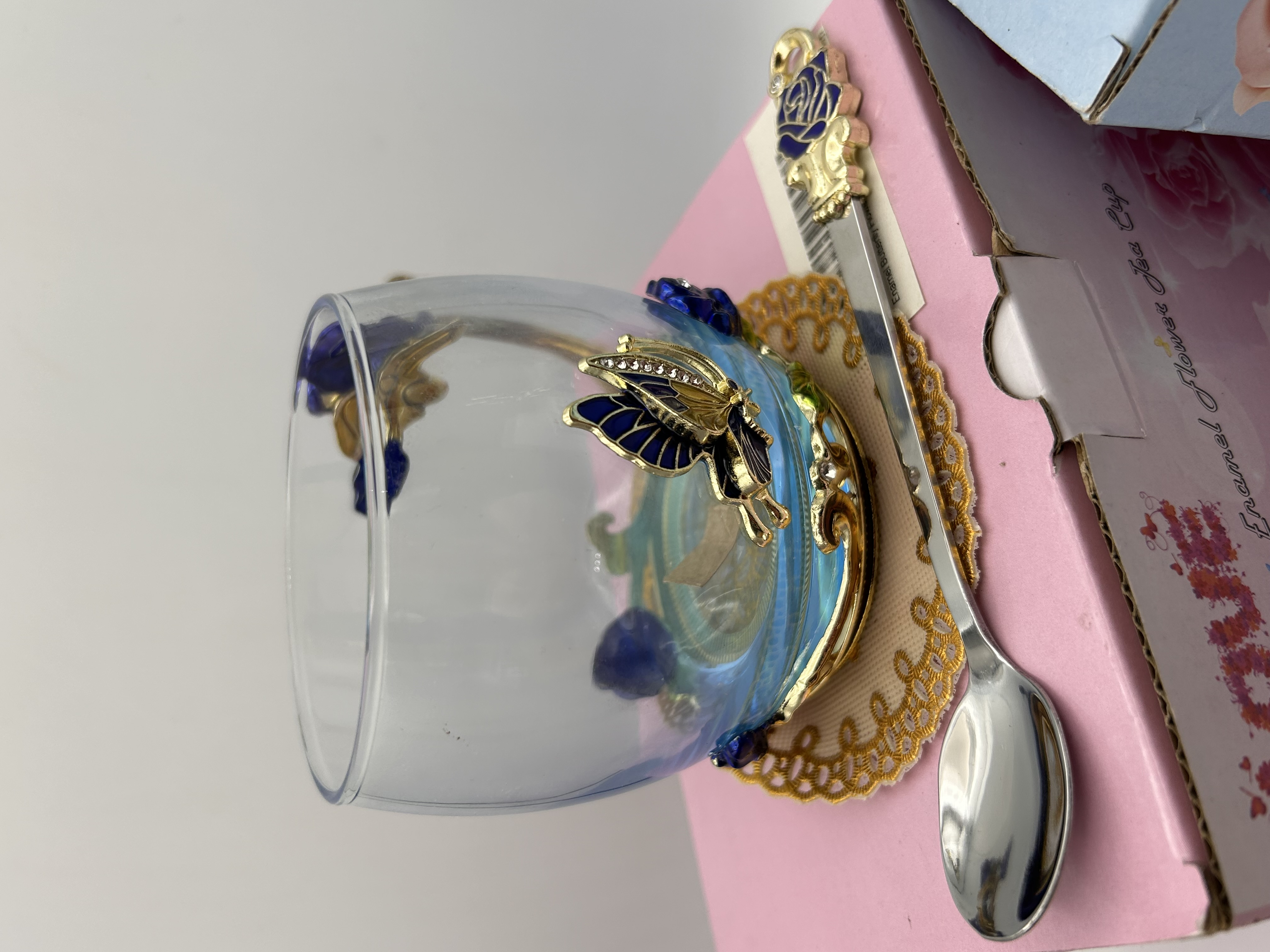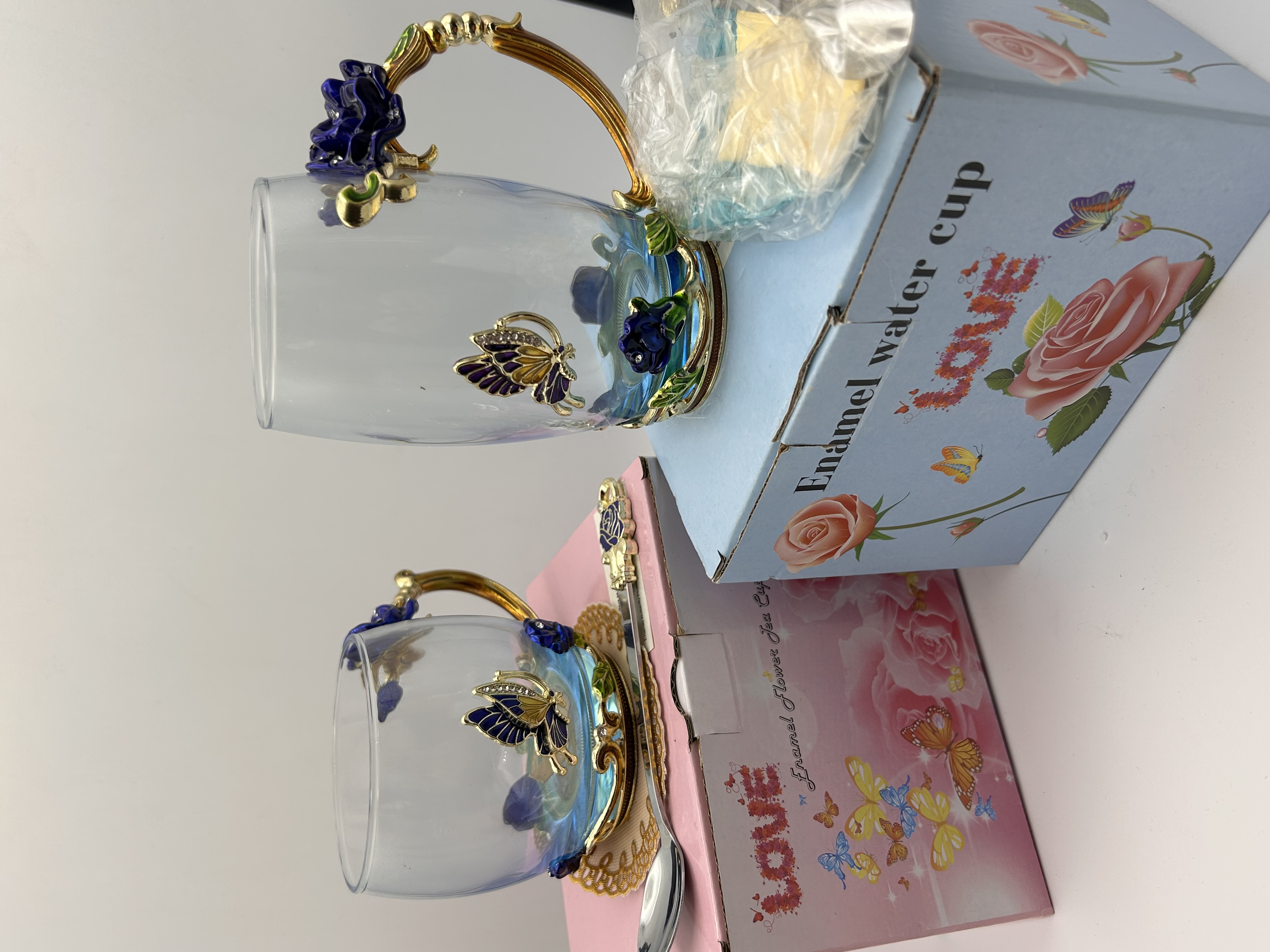 A collection of items comprising two distinct sets of contemporary decorative glass drinkware, commonly marketed as Enamel Flower Tea Cups. The collection includes two clear glass cups/mugs, each featuring ornate, applied gold-toned metal and enamel decoration depicting dark blue flowers and butterflies accented with small rhinestones, characteristic of 3D vintage handicraft style. The first set includes a shorter, rounded cup, a coordinating metal spoon with an enameled handle, a lace-patterned circular coaster, and a pink cardboard retail box marked LOVE and Enamel Flower Tea Cup. The second set includes a taller, cylindrical cup, a clear plastic bag containing an additional accessory, and a blue cardboard retail box marked Enamel water cup and LOVE. The items are presented in their original retail packaging.
