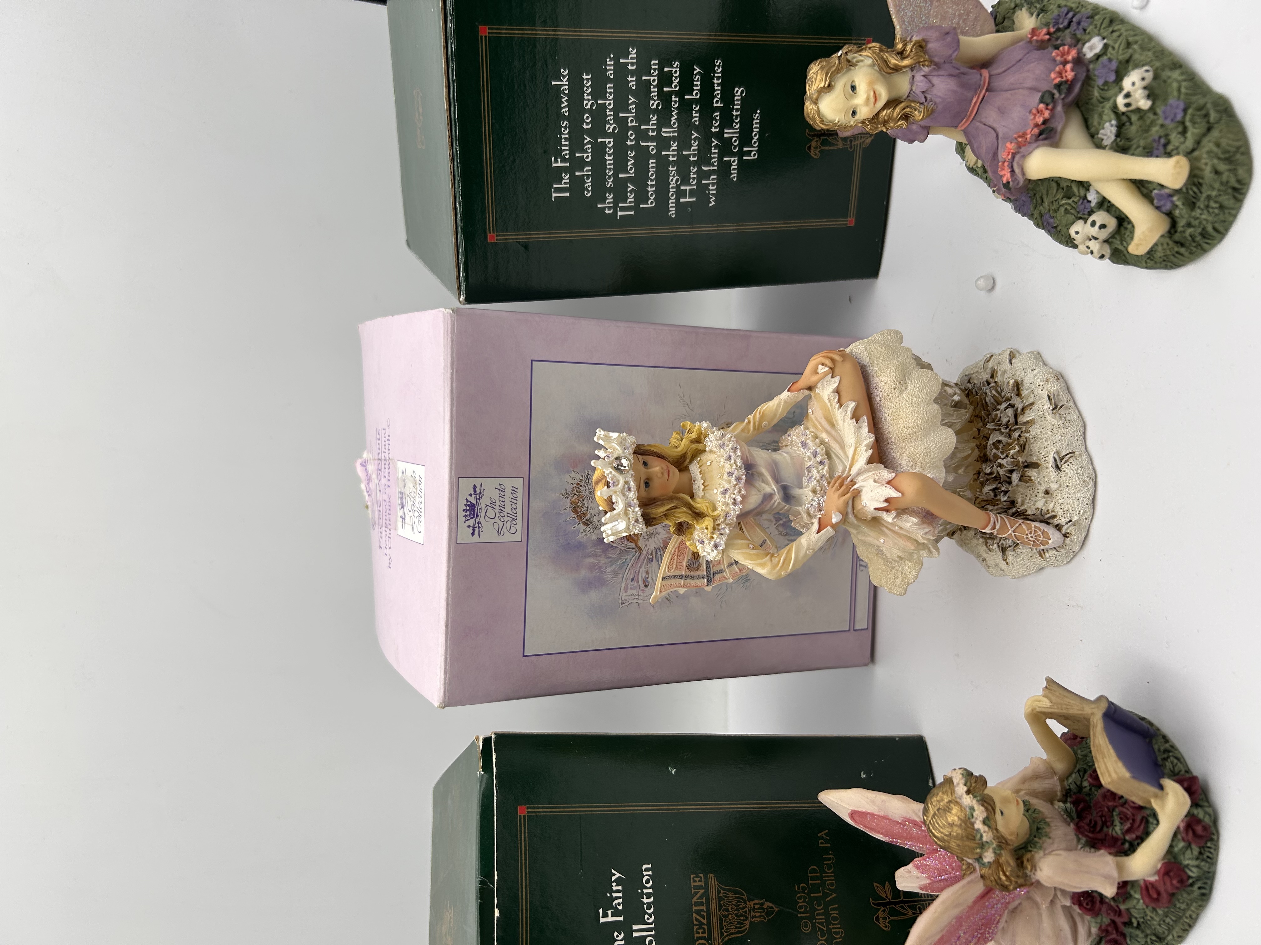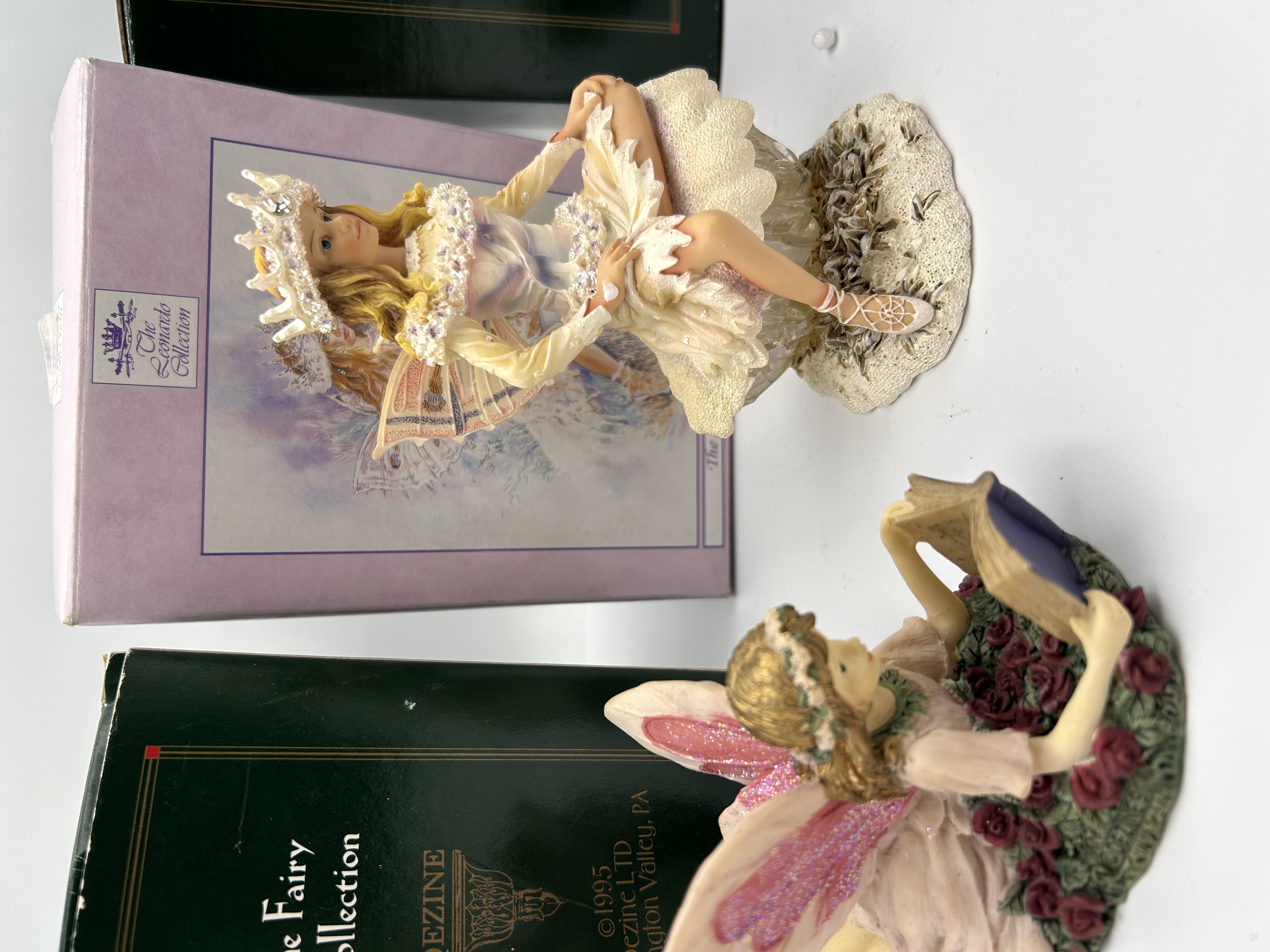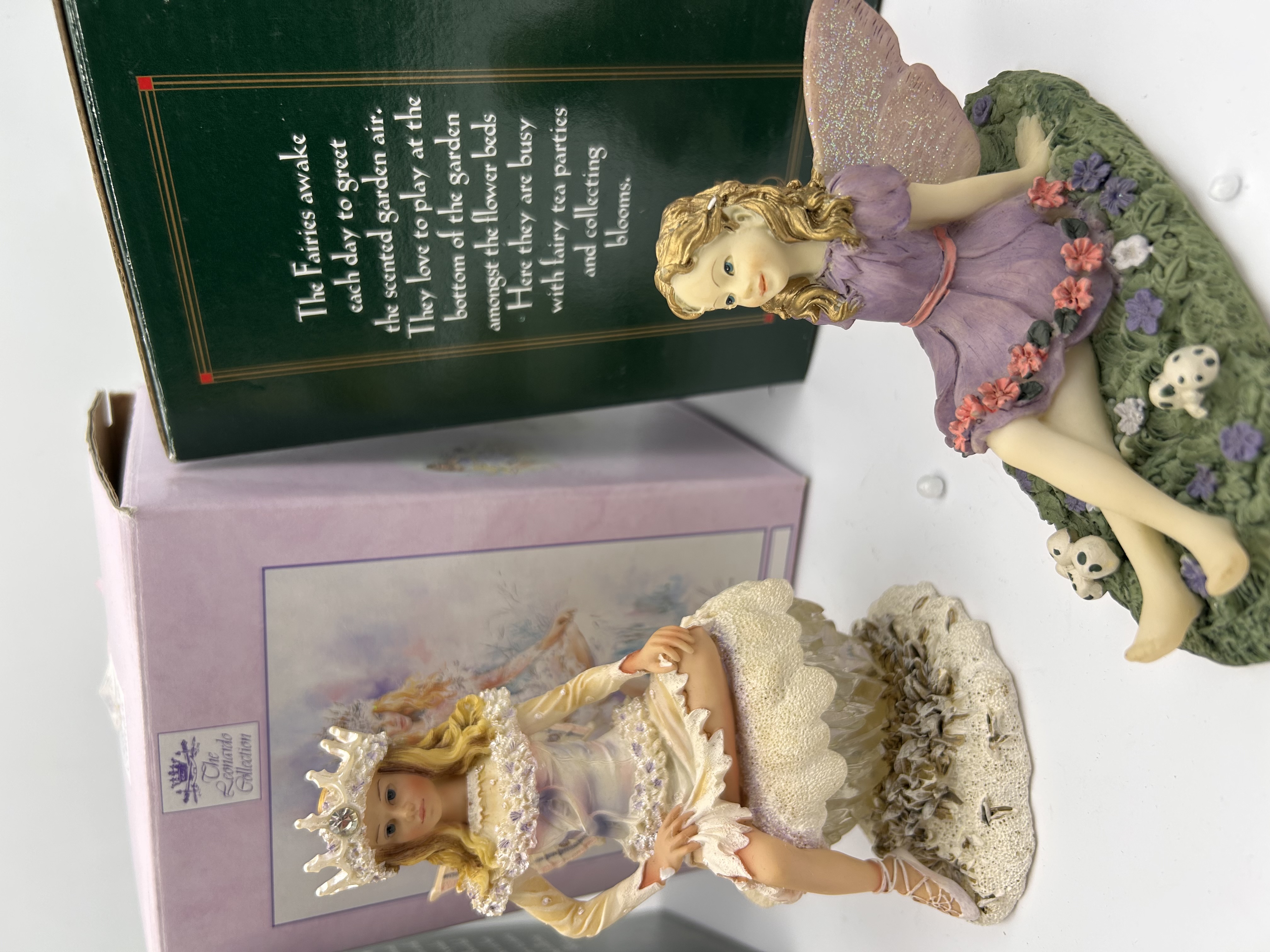 A collection of six late 20th-century decorative collectible figurines and their associated storage boxes. The central figurine is attributed to The Leonardo Collection, designed by Christine Haworth, identified by the pink box as part of “The Snowflake Collection.” This figurine depicts a seated fairy wearing a crown on a textured base. The lot includes two additional painted resin figurines. One figurine, associated with a dark green box marked “©1995 De Dezine LTD” and “The Fairy Collection,” shows a fairy reading a book among roses. The third figurine depicts a fairy reclining on a grassy base adorned with flowers and toadstools. All figurines are constructed from painted resin or cold-cast porcelain and feature applied glitter detailing on the wings. The lot includes three original boxes, two dark green from De Dezine and one pink from The Leonardo Collection.