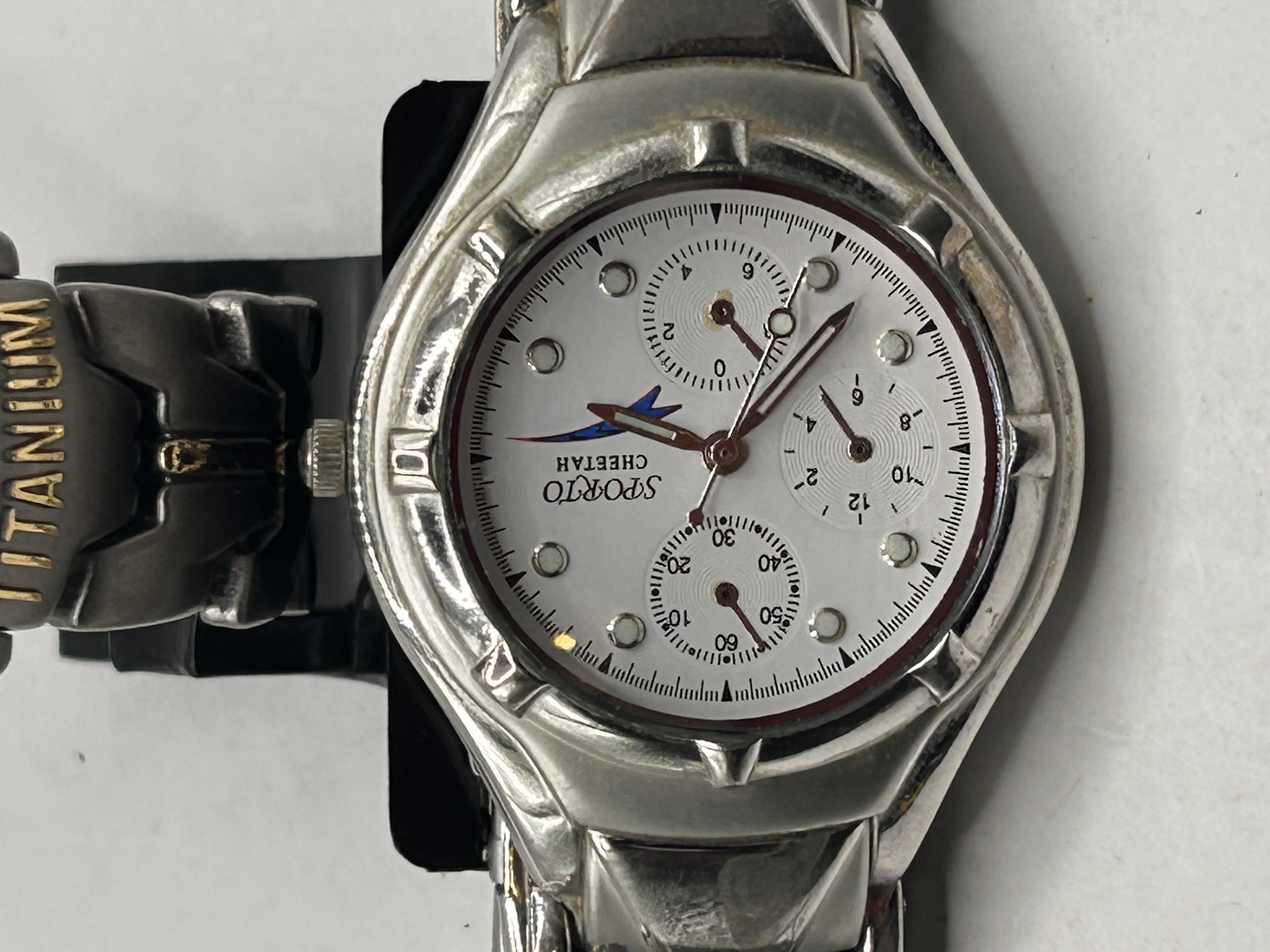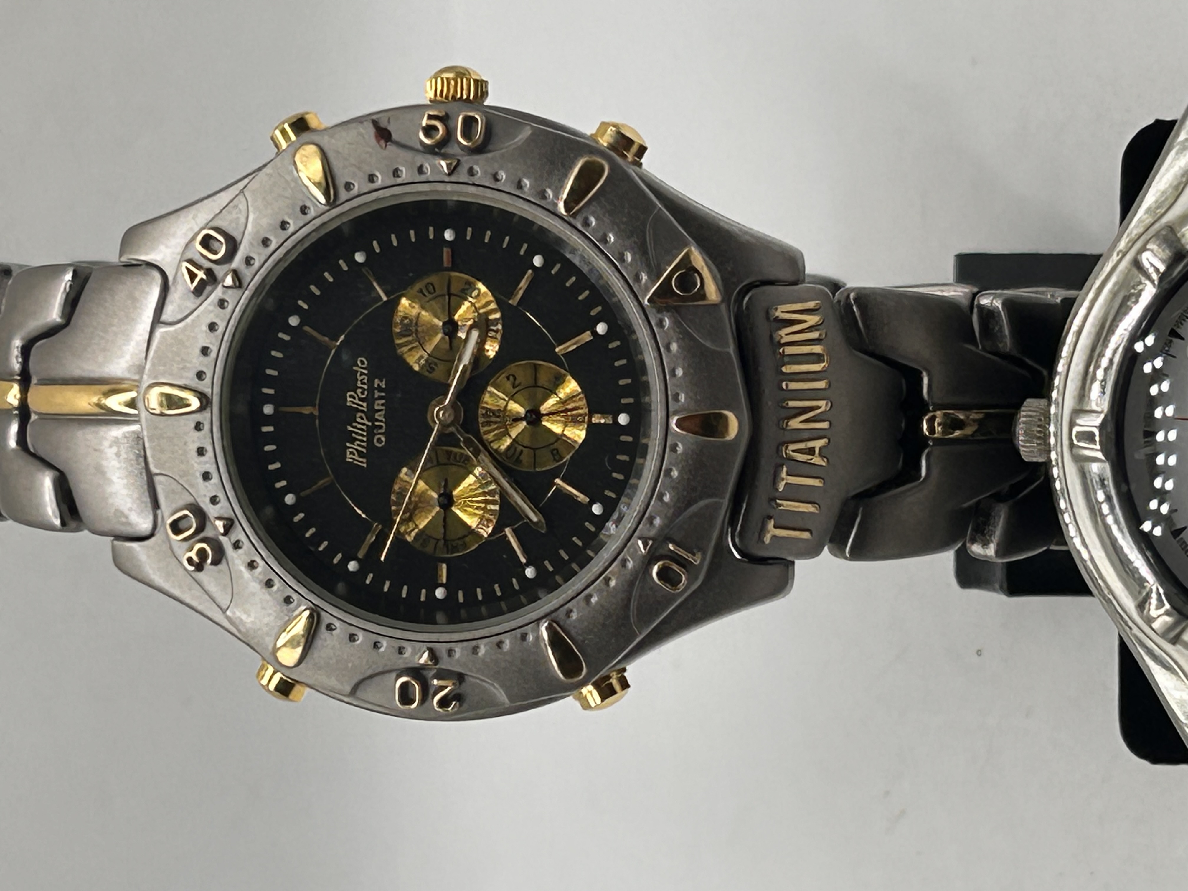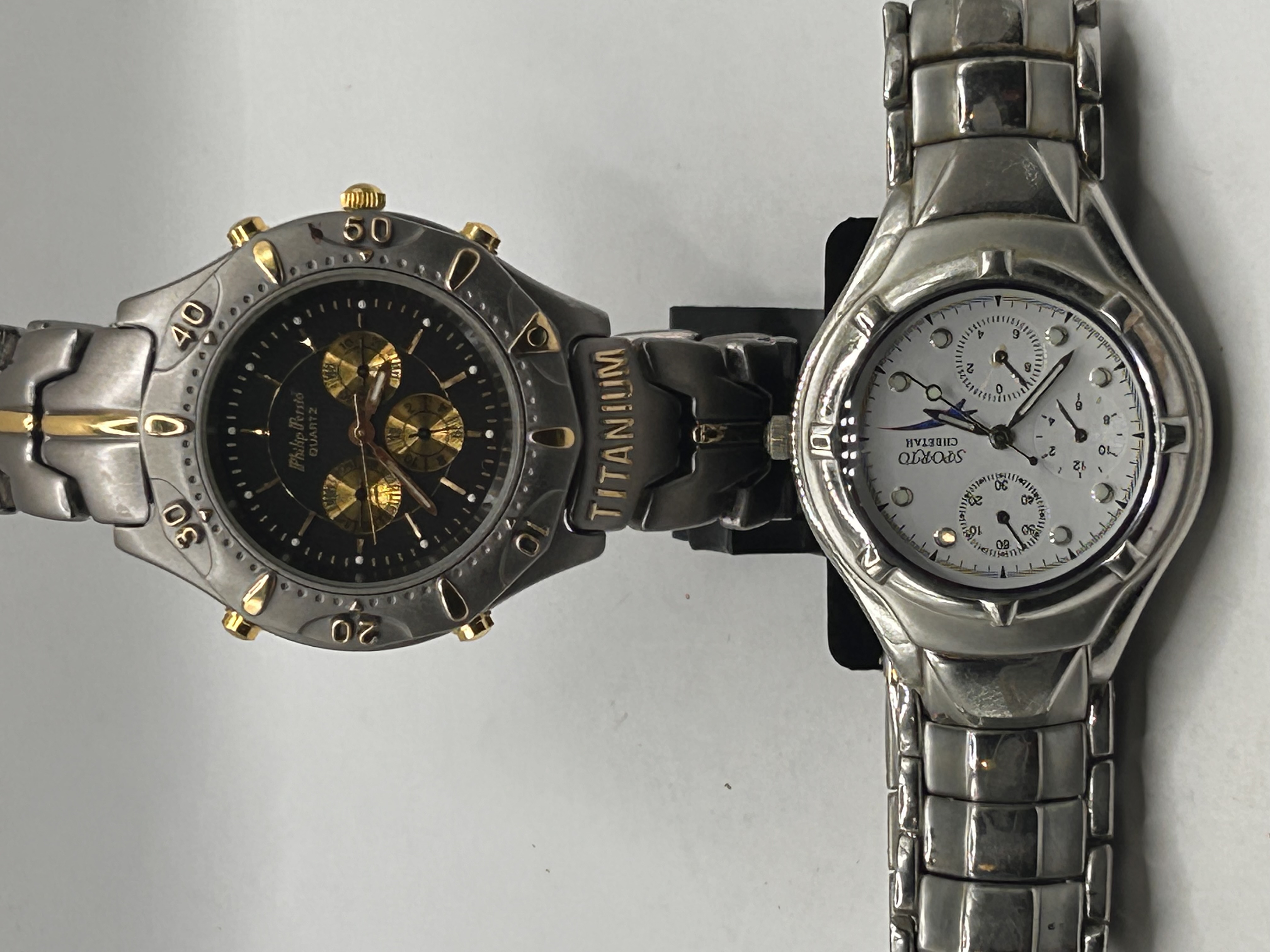 A pair of quartz wristwatches. The first watch is identified through web consensus as a Philip Persio Universal Titanium Chronograph-Style Mens Watch. This watch features a gunmetal gray case and integrated bracelet with gold-tone accents on the bezel, hands, and subdials. The connecting link is prominently marked TITANIUM in gold lettering. The dial is black with three gold-tone subdials and is marked Philip Persio QUARTZ. The second watch is a Sporto Cheetah chronograph-style watch, executed in polished silver-tone metal, featuring a white dial with three subdials and marked SPORTO CHEETAH. Both watches operate on quartz movements.