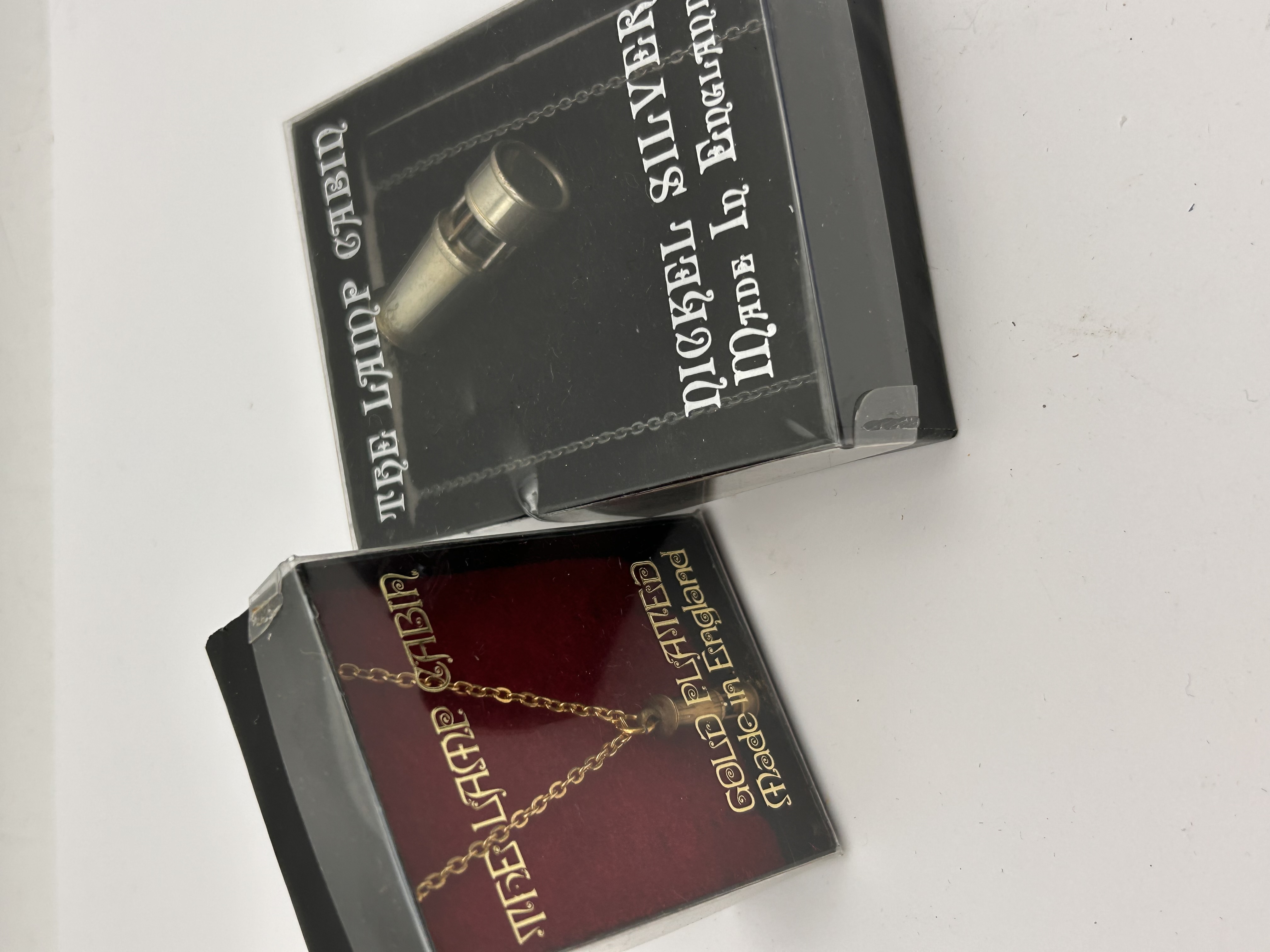 A pair of novelty or souvenir miniature pendants/charms manufactured under the brand name “THE LAMP CABIN.” Both items are sealed in their original black rectangular retail boxes with clear plastic sleeves. The first item is a gold-toned miniature lantern pendant attached to a fine chain, displayed against a red velvet interior, and is explicitly marked “GOLD PLATED” and “Made In England.” The second item is a silver-toned miniature object, possibly a lamp component or burner tip, displayed against a black interior, and is explicitly marked “NICKEL SILVER” and “Made In England.” Both boxes feature the brand name “THE LAMP CABIN” in gold lettering.