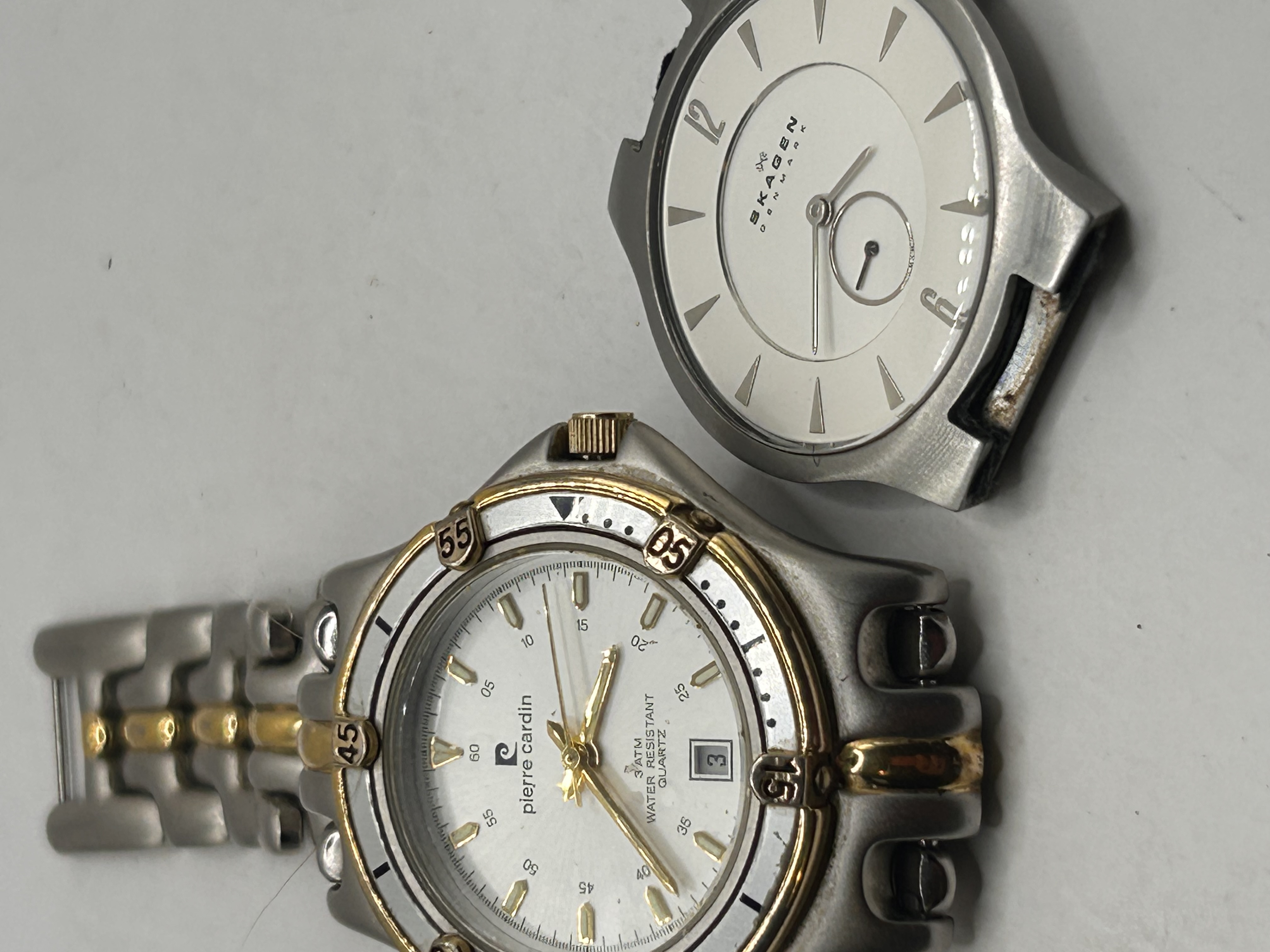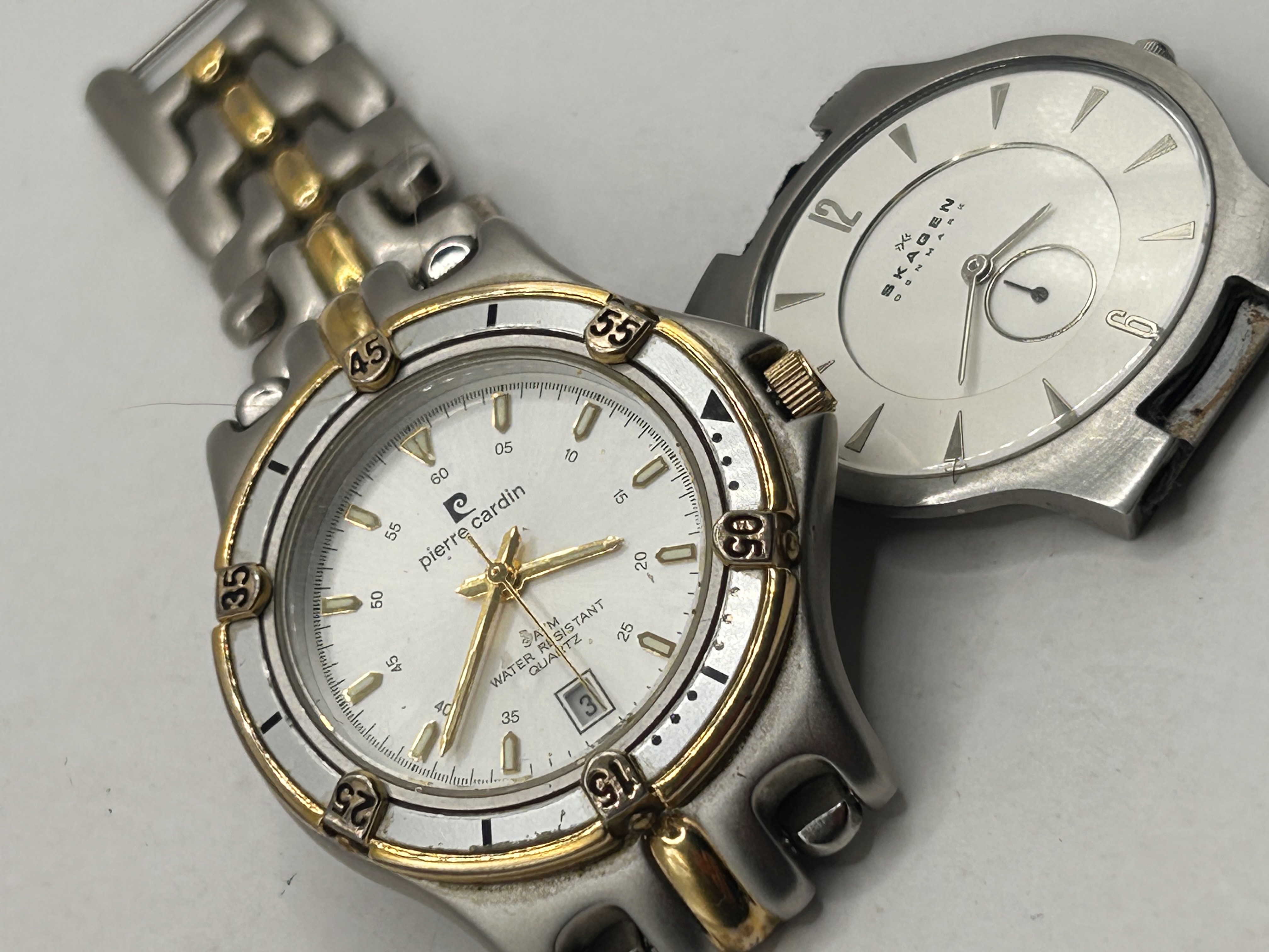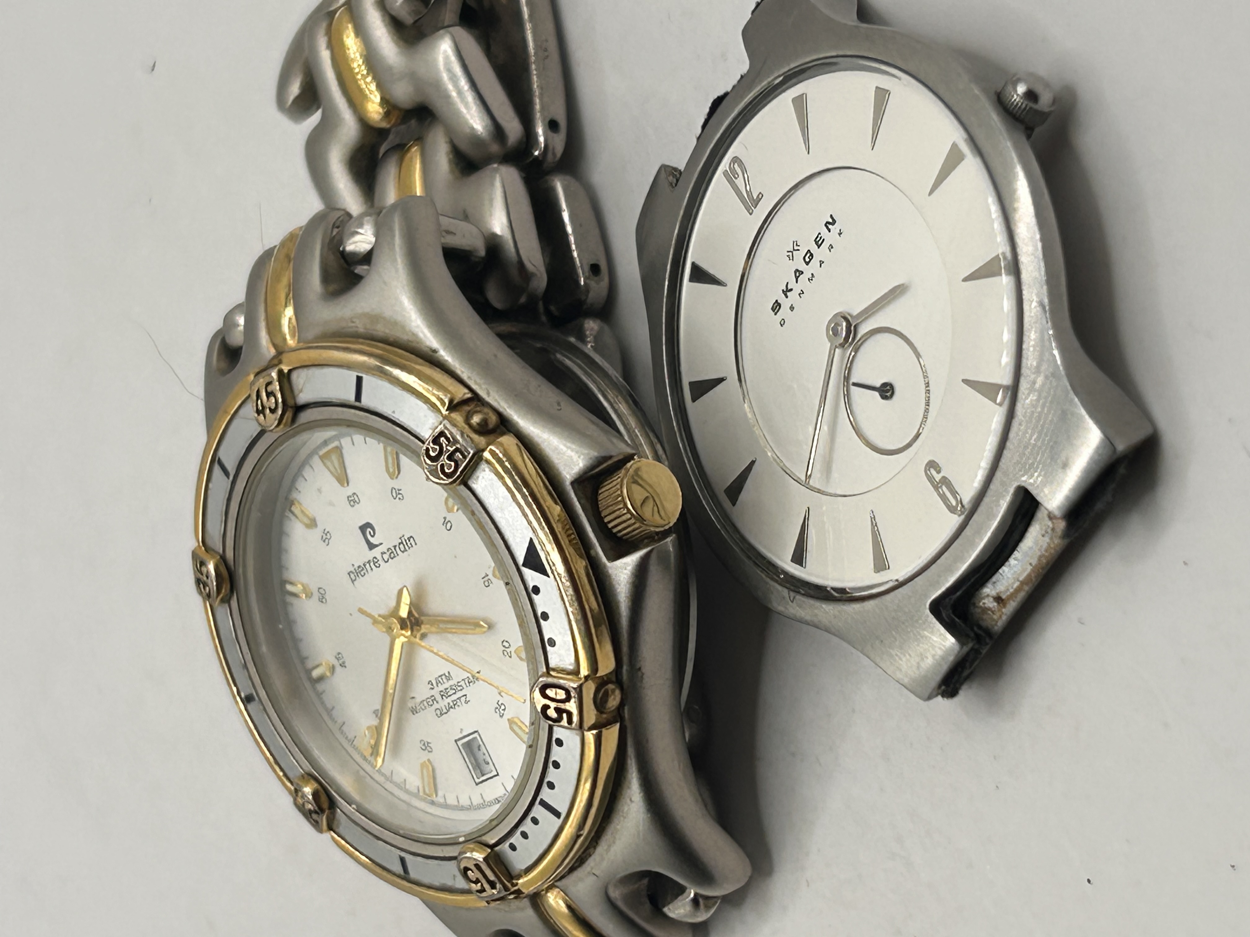 This lot consists of two quartz timepieces. The first is a Pierre Cardin wristwatch featuring a two-tone design with a silver-tone case and link bracelet accented by gold-tone segments. The watch includes a gold-tone rotating bezel marked with numerals such as 45, 50, and 05. The white dial displays gold-tone hands, a date window at the 3 o’clock position, and is marked pierre cardin, 3 ATM / WATER RESISTANT / QUARTZ. The construction appears to be stainless steel or base metal. The second item is an incomplete Skagen watch case and dial assembly. This piece features a minimalist silver-tone case, marked SKAGEN DENMARK, with a white dial displaying applied stick hour markers, Arabic numerals at 12 and 6, and a subsidiary seconds register. The Skagen item is missing its band.