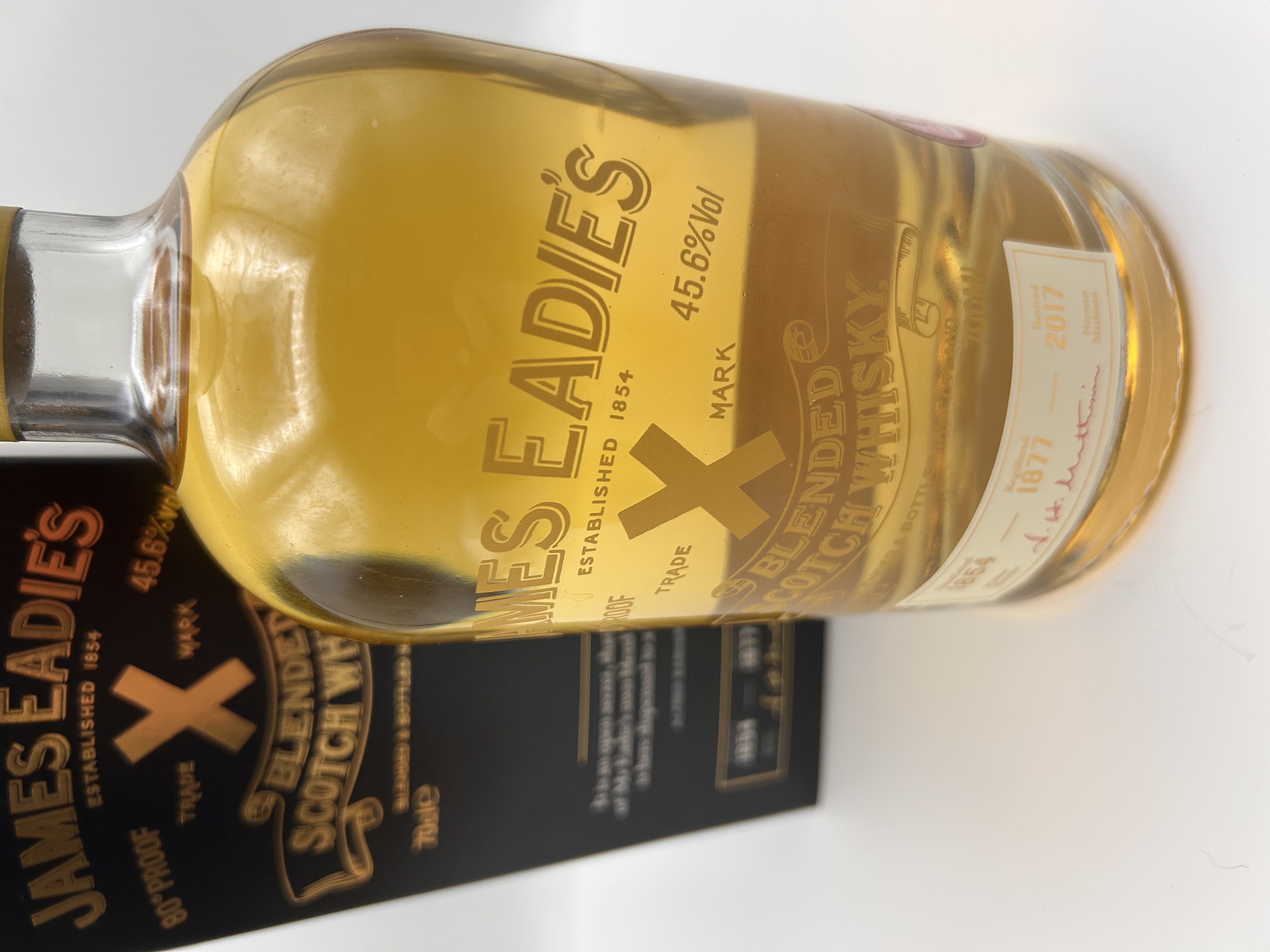 A bottle of James Eadie’s Trademark X Blended Scotch Whisky presented in its original black and gold cardboard presentation box. The consensus identification confirms the product name and specifications. The clear glass bottle contains amber-colored liquid and is sealed with an intact gold screw cap bearing the inscription JAMES EADIE LTD. Both the bottle labels and the presentation box prominently display the brand name JAMES EADIE’S, the designation TRADE X MARK, and the founding inscription ESTABLISHED 1854. The whisky is specified at 45.6% Vol. The volume is marked as 700ml on the bottle and 70cl on the box, with the box also listing 80º PROOF. A lower label section on the bottle indicates historical revival dates of 1877 and 2017.
