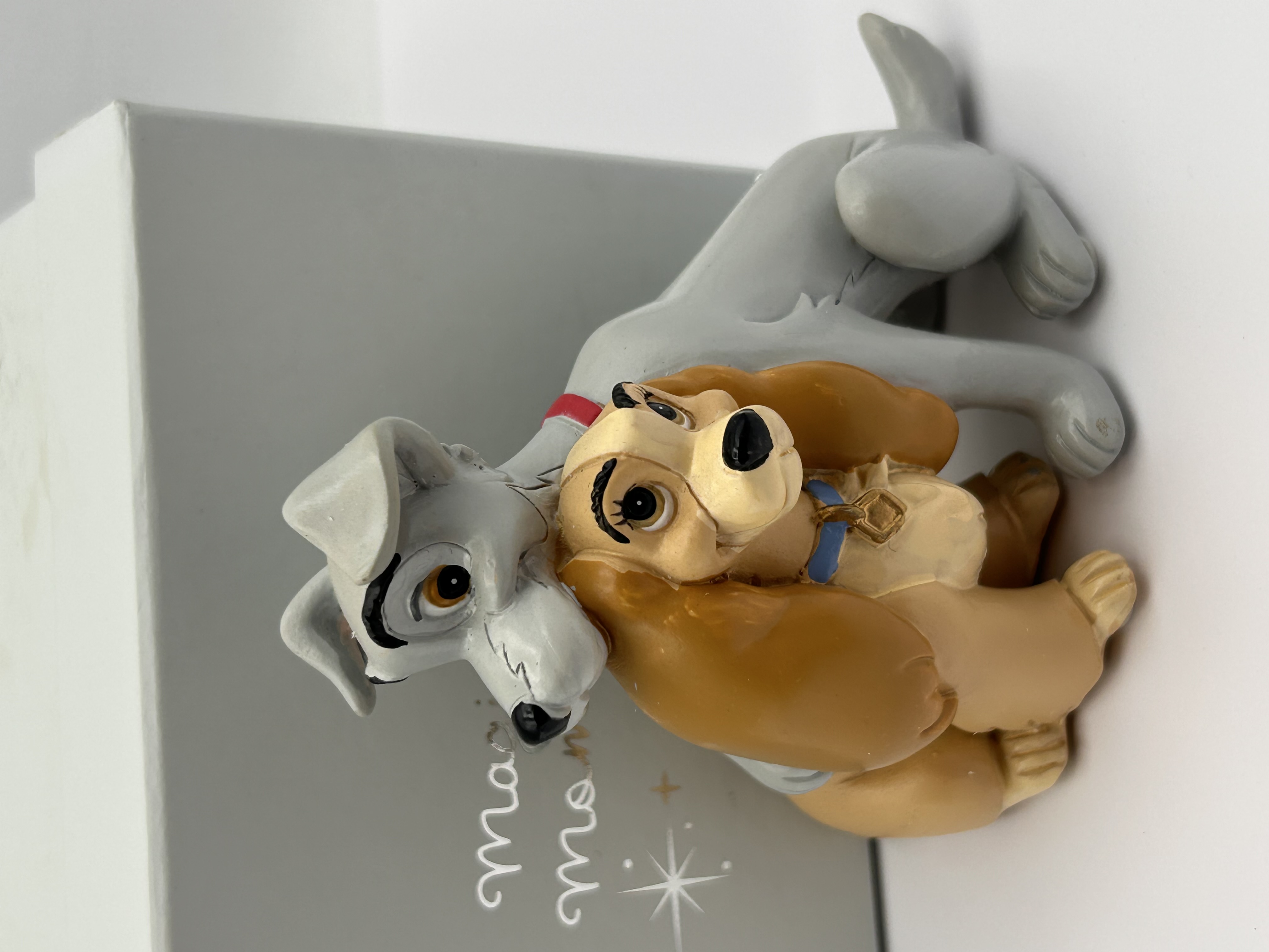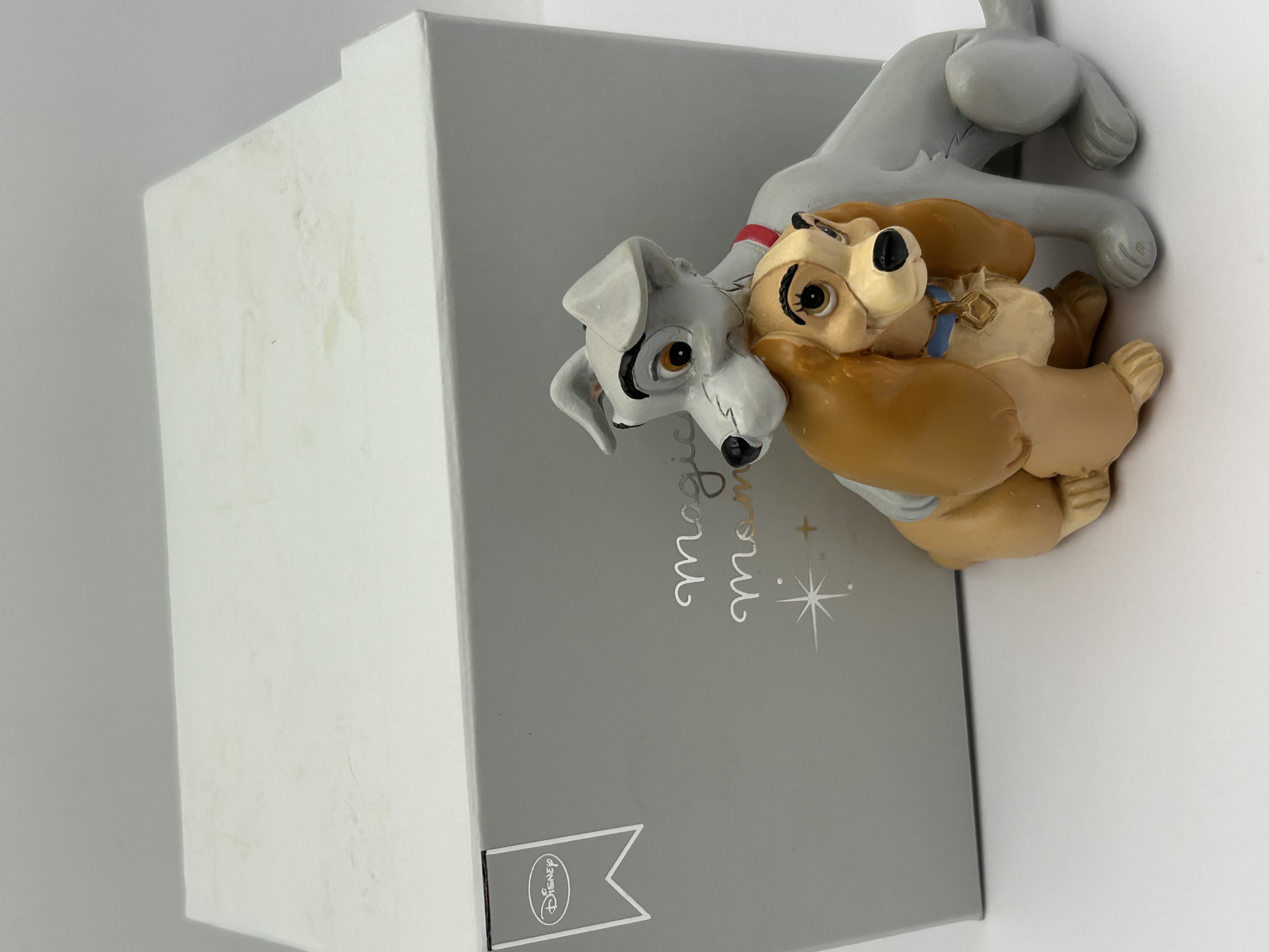 A contemporary Disney collectible figurine depicting the characters Lady and Tramp from the film Lady and the Tramp. The single figurine is constructed of molded and painted resin or plastic, showing the spaniel Lady (tan/brown) and the mongrel Tramp (gray) seated together in an affectionate pose. Lady is detailed with a blue collar and a gold tag, while Tramp wears a red collar. The figurine is accompanied by its original light gray rectangular presentation box, which features a silver Disney logo tag and silver script text reading “Magic Moments” on the front panel.