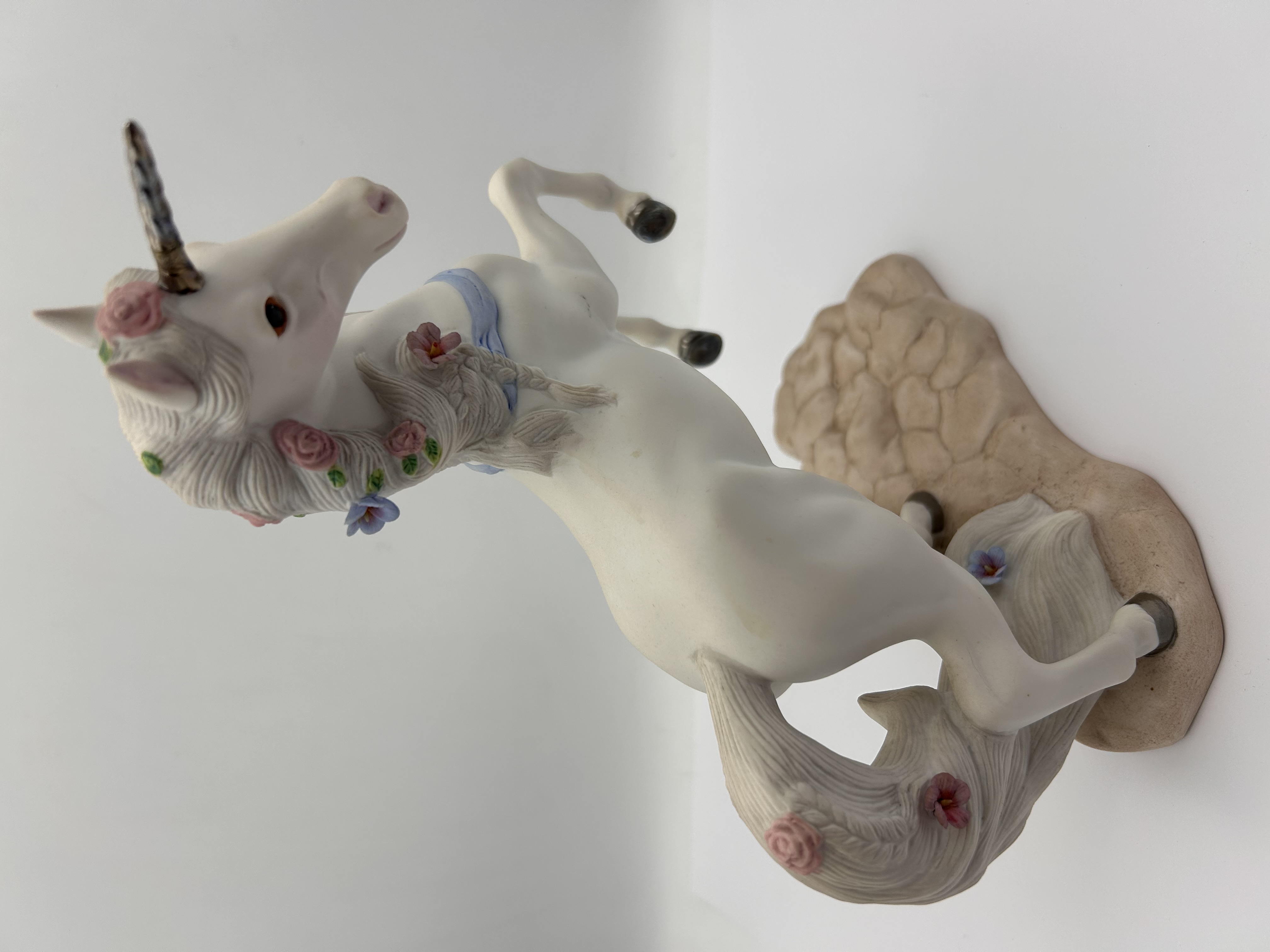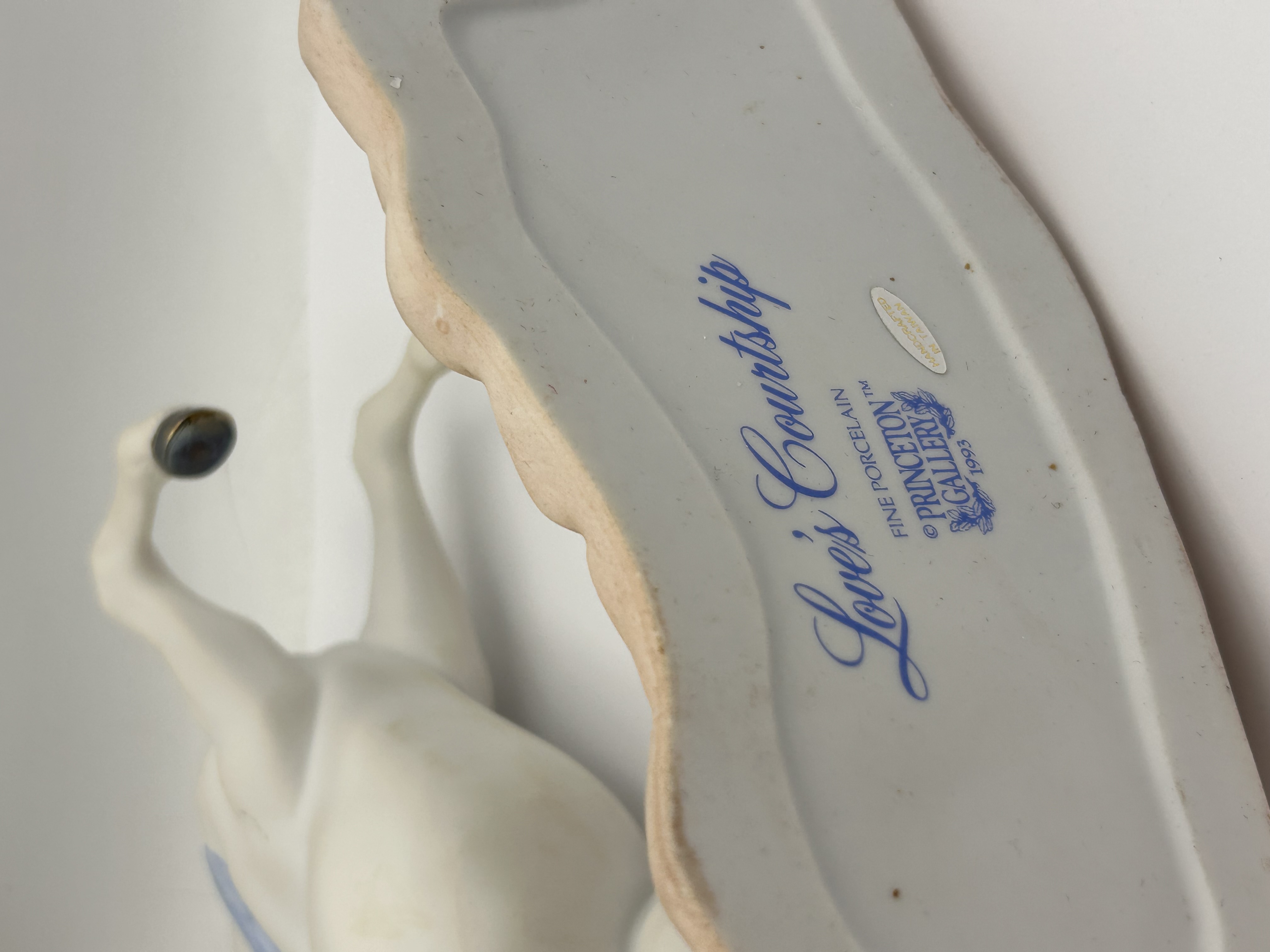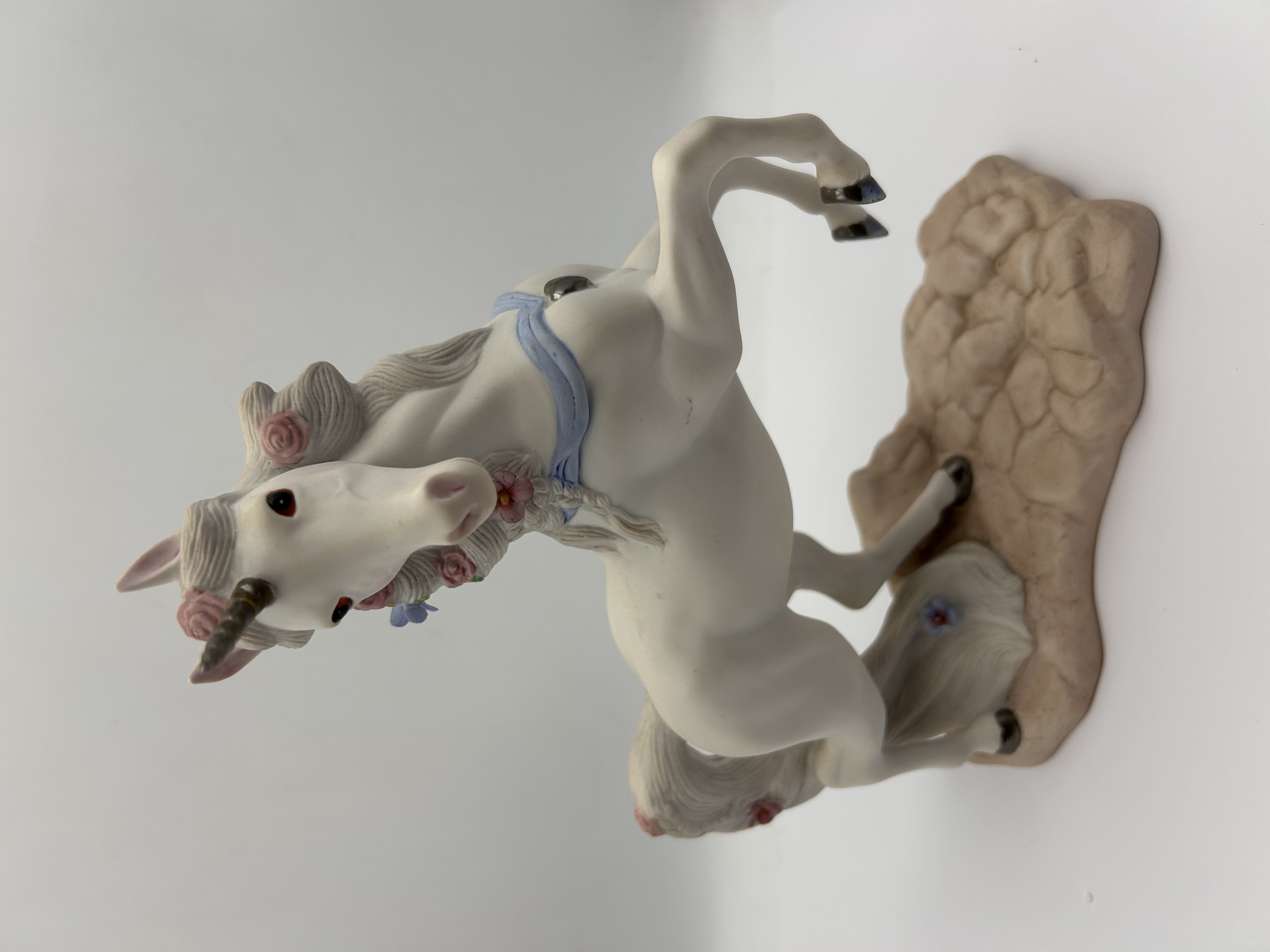 A single porcelain figurine titled “Love’s Courtship,” produced by Princeton Gallery in 1993. The sculpture depicts a white unicorn rearing on its hind legs atop a textured, tan-colored base. The figurine is executed in Fine Porcelain and features hand-painted details, including pink roses and blue blossoms woven into the mane and tail, and a light blue ribbon draped across the chest. The underside of the base is marked “Love’s Courtship,” “FINE PORCELAIN,” “PRINCETON GALLERY,” and dated “1993.” A sticker on the base indicates the piece was “HANDCRAFTED IN MALAYSIA.”