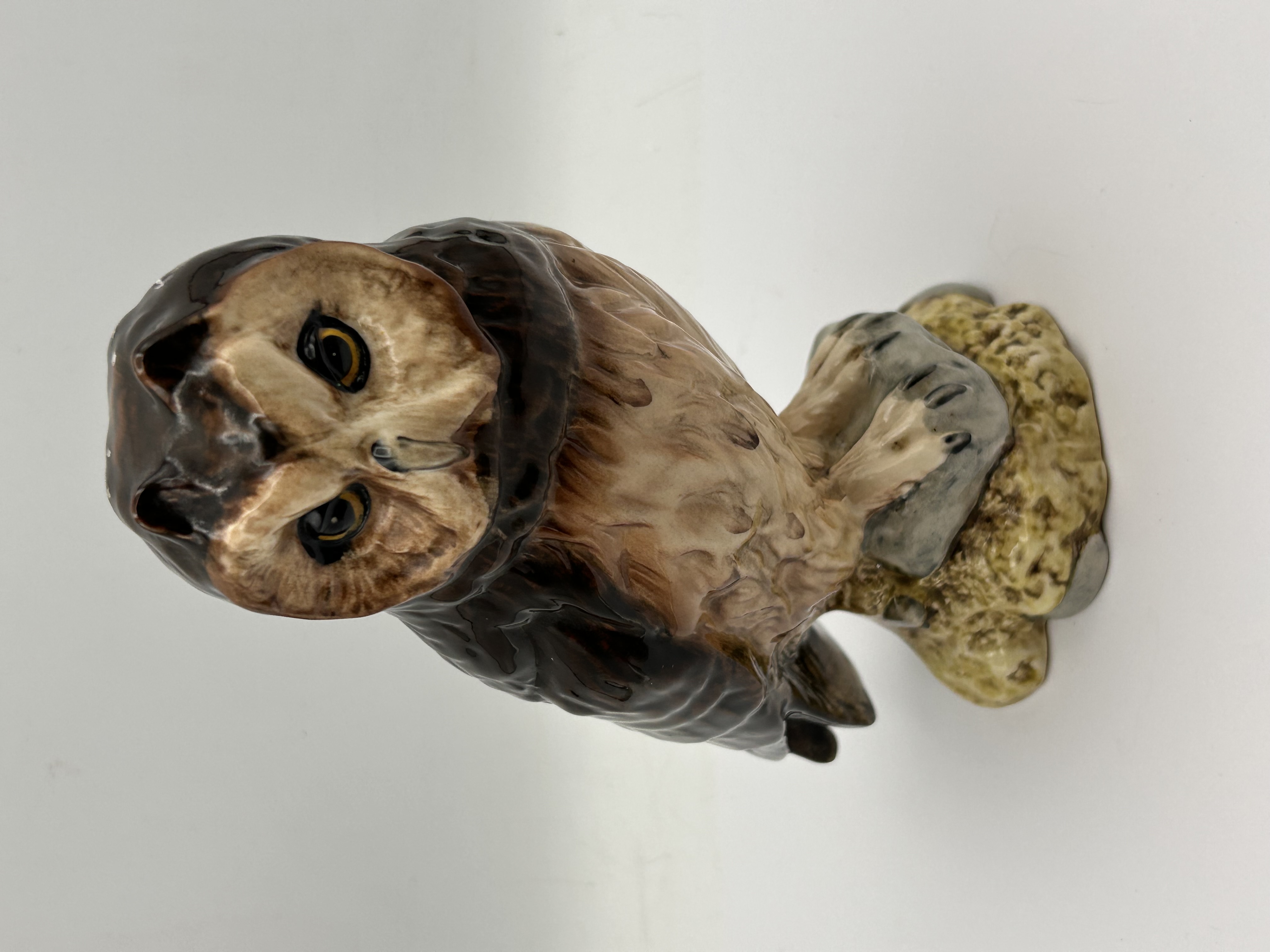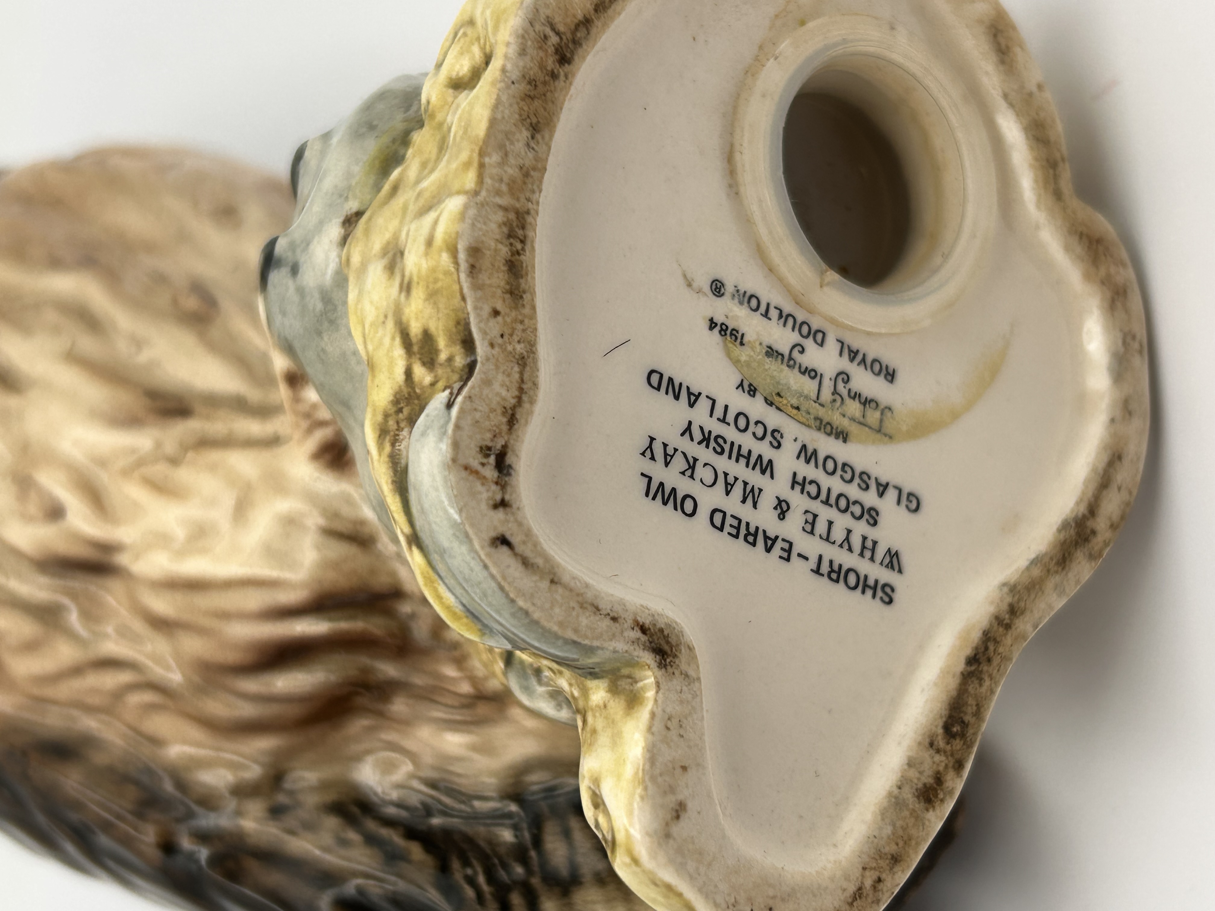 A single glazed ceramic decanter modeled by Royal Doulton for Whyte & Mackay Scotch Whisky. The piece is sculpted in the form of a Short-Eared Owl perched on a textured rocky base. The figurine is executed in naturalistic colors, including high-gloss browns, tans, creams, and beige glazes. The base includes an opening designed for a stopper, confirming its function as a decanter or flask for spirits. The underside is extensively marked with stamped text, including the model name “SHORT-EARED OWL,” the commissioner “WHYTE & MACKAY SCOTCH WHISKY, GLASGOW, SCOTLAND,” the modeler “MODELED BY John T. Tongue 1984,” and the official Royal Doulton mark.