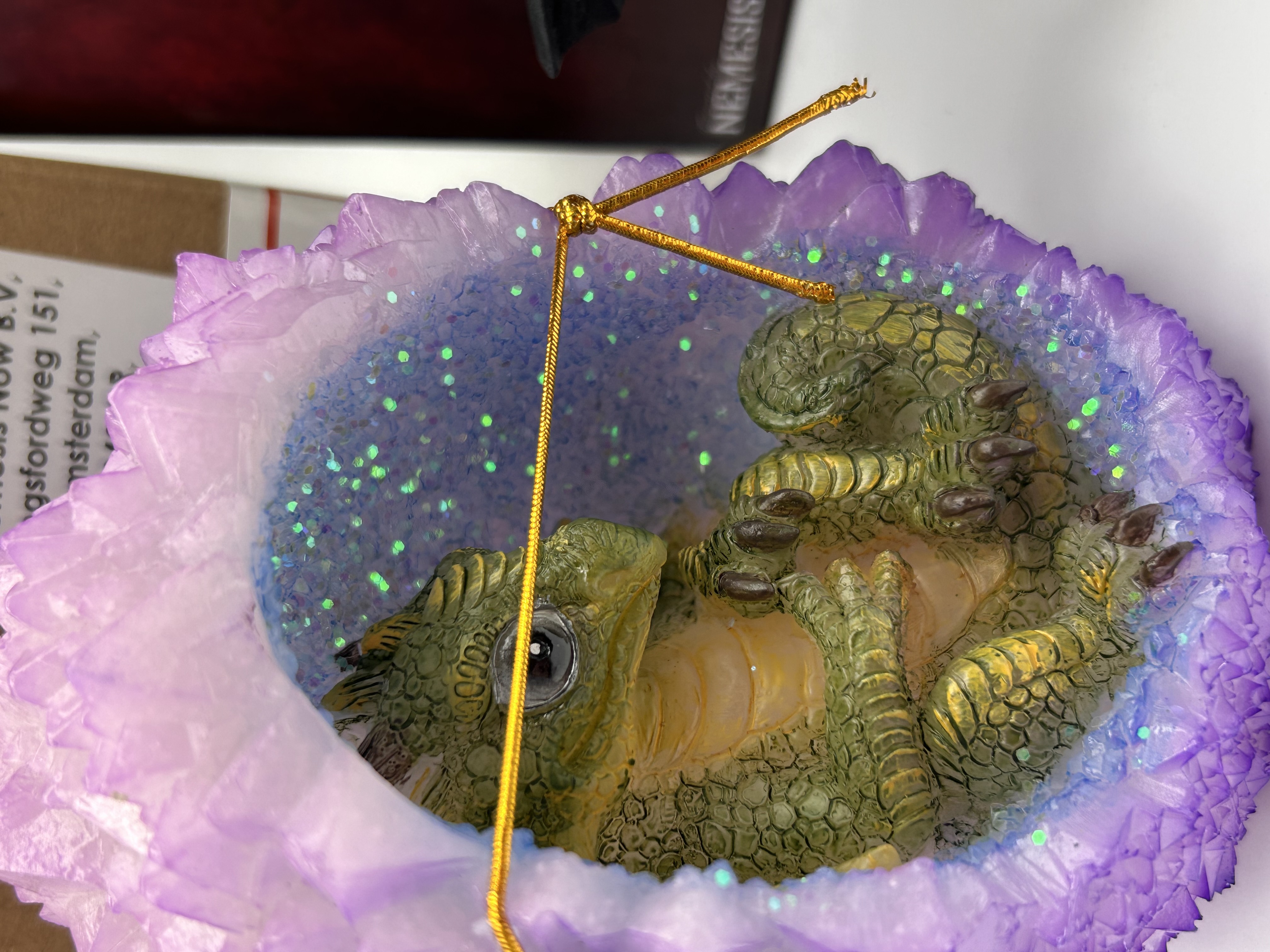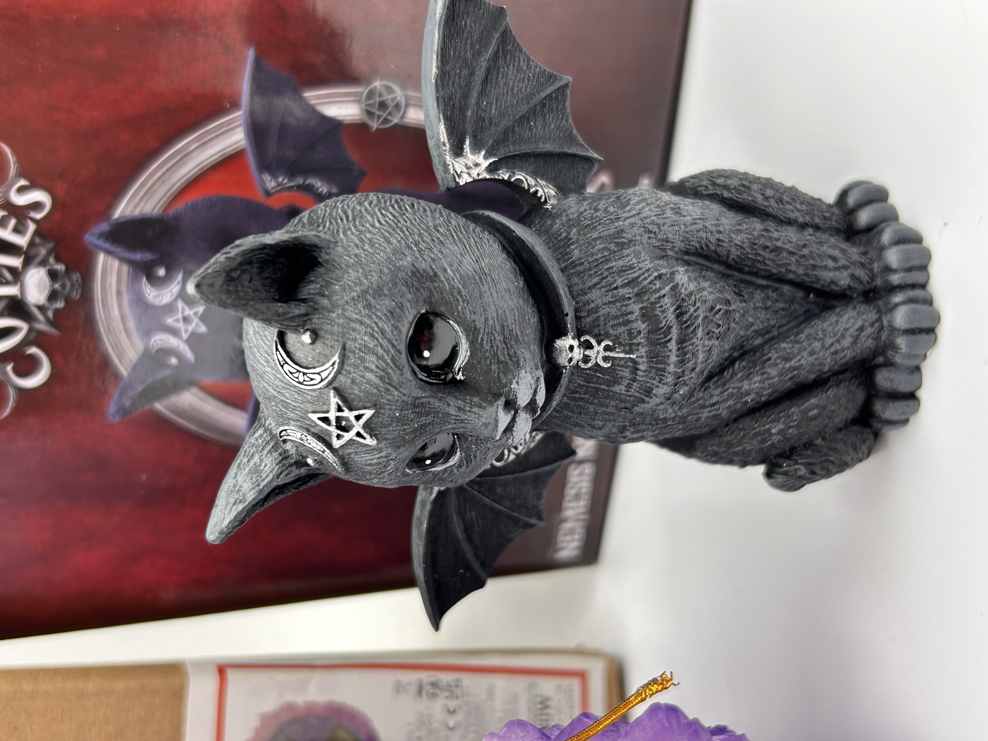 A collection of four items primarily manufactured by Nemesis Now, consisting of two fantasy resin decorative objects and their associated packaging. The first object is a dark gray molded resin statuette of a winged cat, styled as a gothic gargoyle. The figure features bat-like wings and is decorated with occult symbols, including a pentagram and multiple crescent moons on its forehead, and a skull-shaped pendant hanging from its collar. This figurine is associated with its original black and deep red retail box marked CULT CUTIES and NEMESIS NOW. The second object is a molded resin hanging ornament shaped like a purple crystalline geode or egg, with the interior housing a green, glitter-dusted dragon figure curled up inside. The geode features faux crystal formations around the rim and includes an attached gold hanging cord. Web research suggests this style is associated with the Nemesis Now Geode Nest series, sometimes featuring LED lighting. The lot also includes an open, brown corrugated cardboard shipping box featuring a sticker indicating importation by Nemesis Now B.V. of Amsterdam, Netherlands.