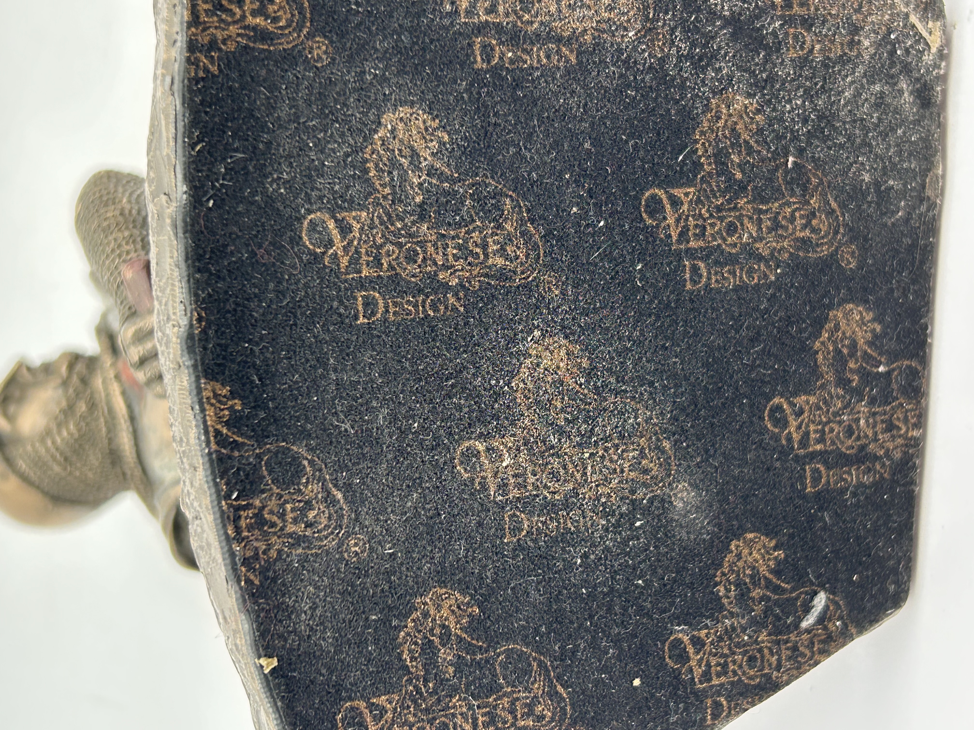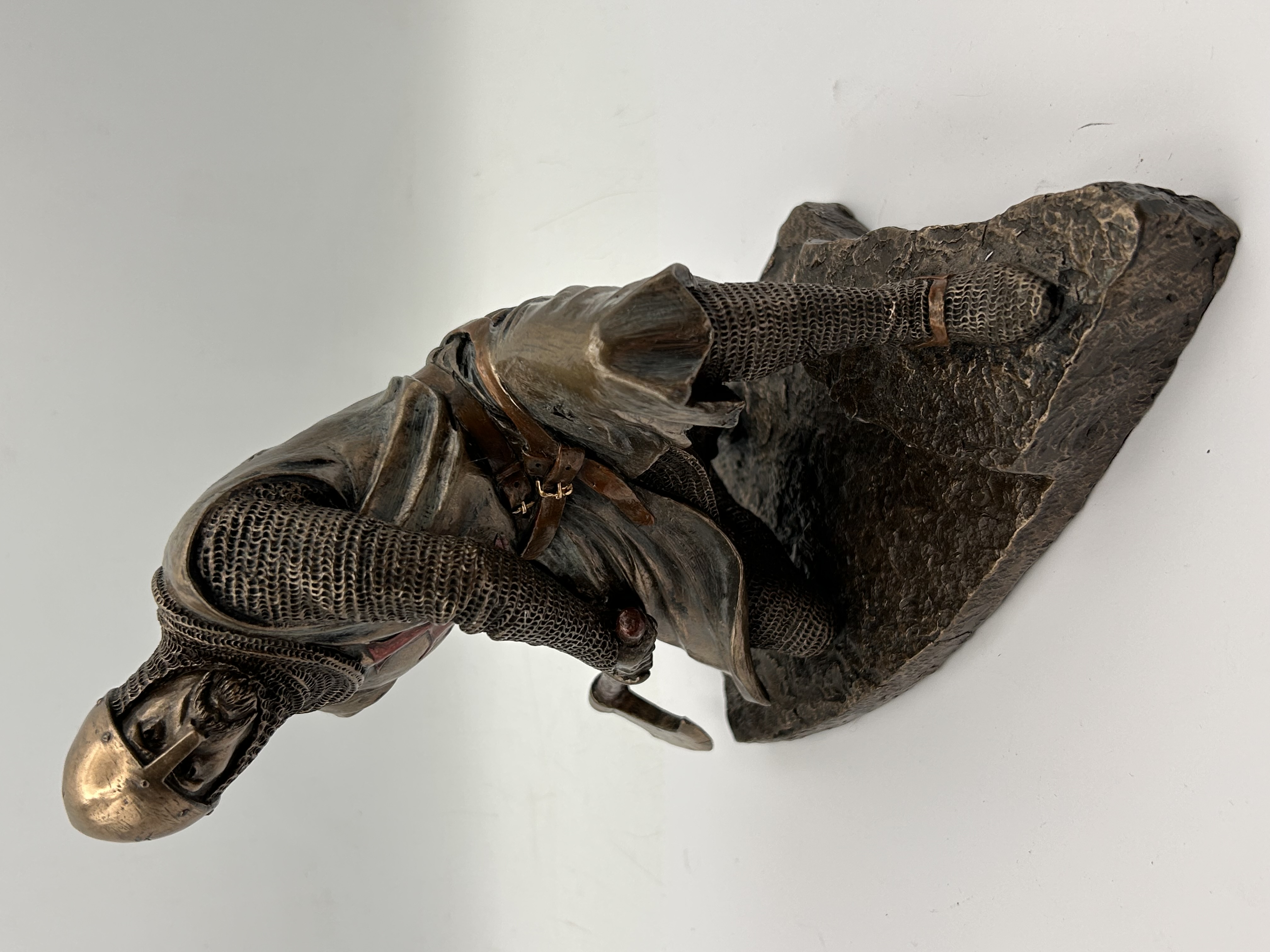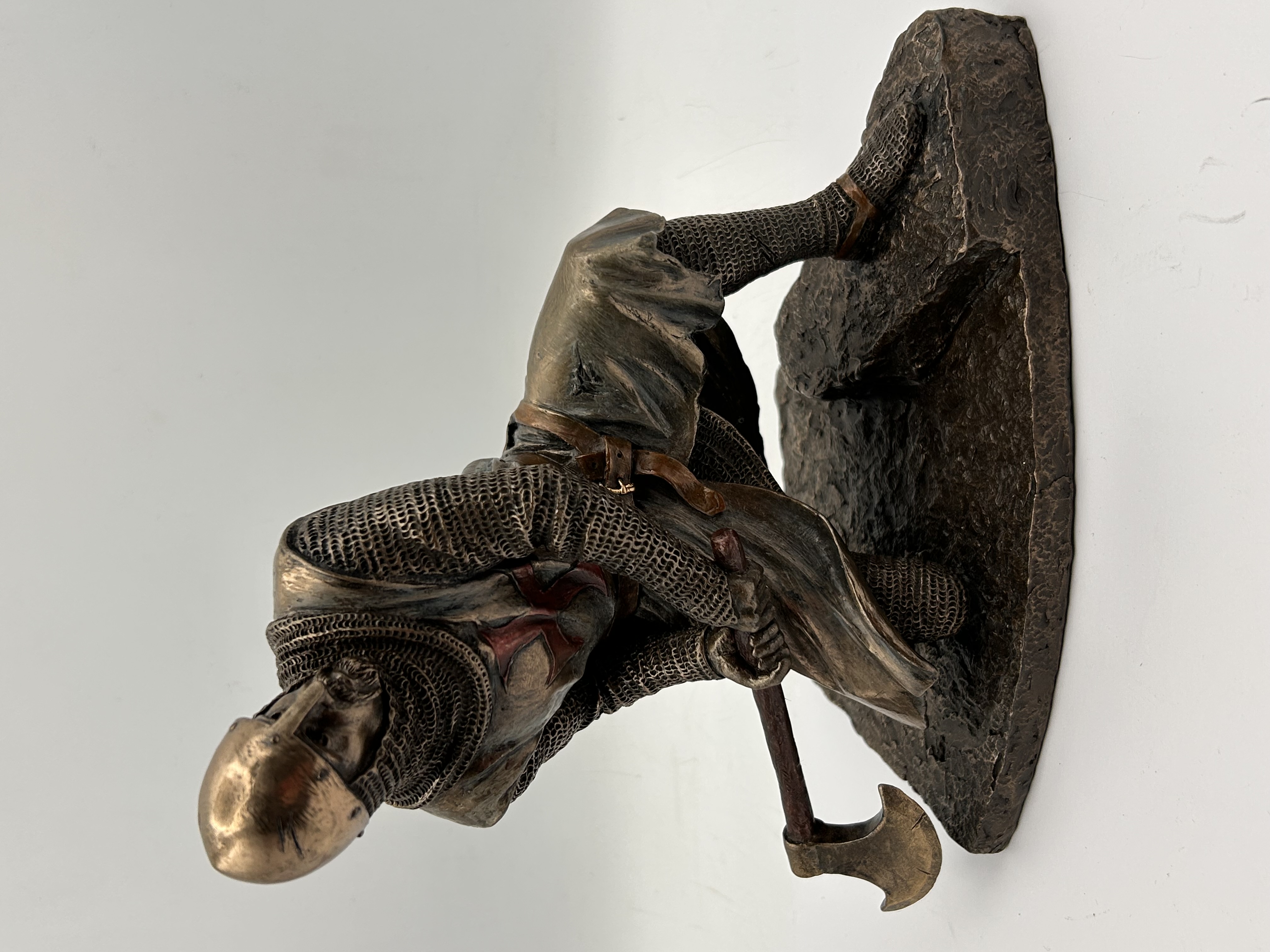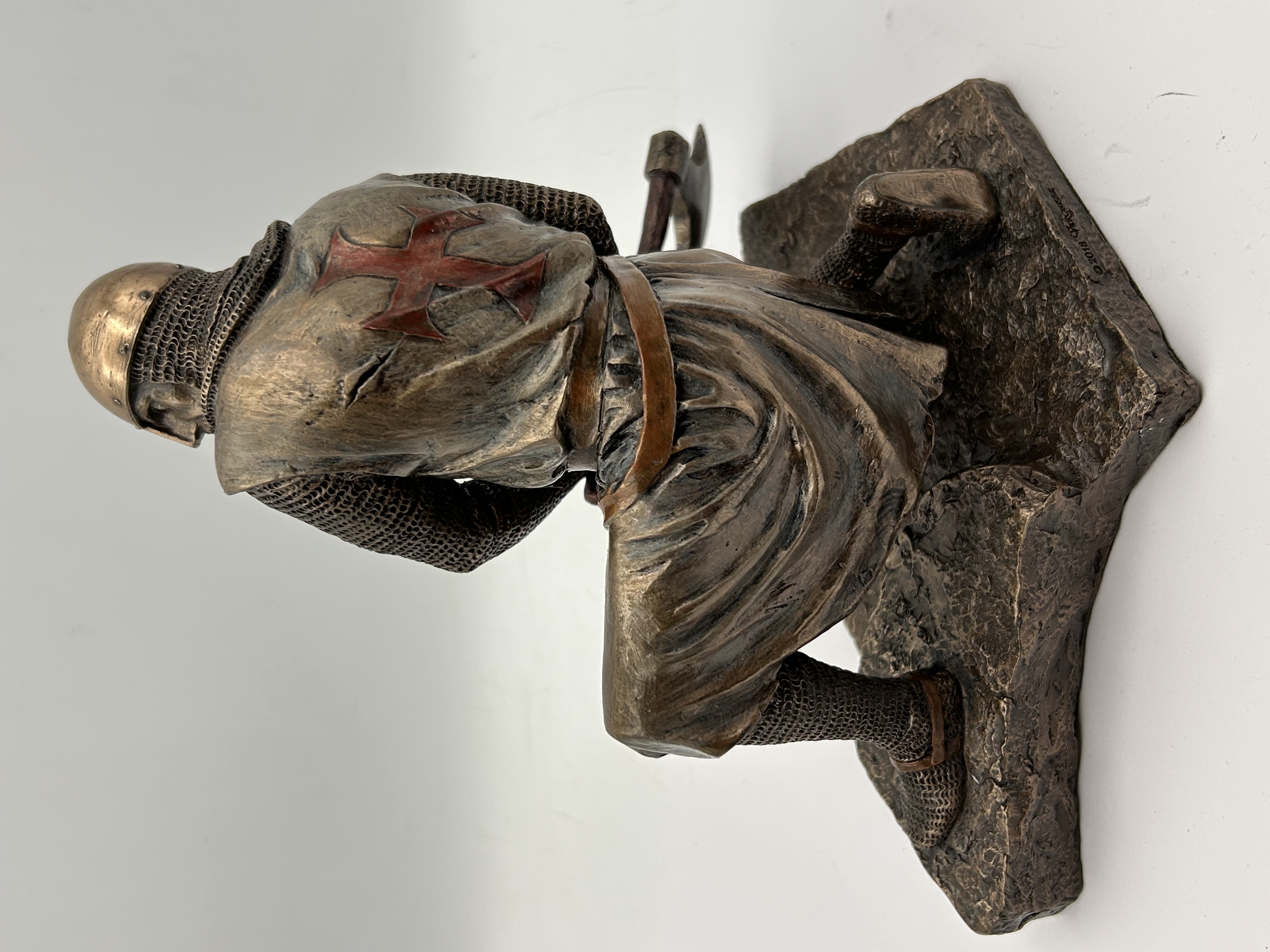 A contemporary decorative figurine produced by Veronese Design, depicting a kneeling Knight Templar or Crusader in a defensive stance. The sculpture is cast in cold-cast bronze or polyresin, finished with a dark bronze patina accented by coppery tones on the helmet and belt. The knight is realistically rendered wearing chainmail armor and a surcoat prominently marked with a red cross on the chest and back. The figure grips a battle axe and is set upon a rugged, rocky base. The base is etched with the copyright mark “© 2018 Veronese.” The underside is covered with a black velvet felt repeating the gilded “VERONESE DESIGN” logo.