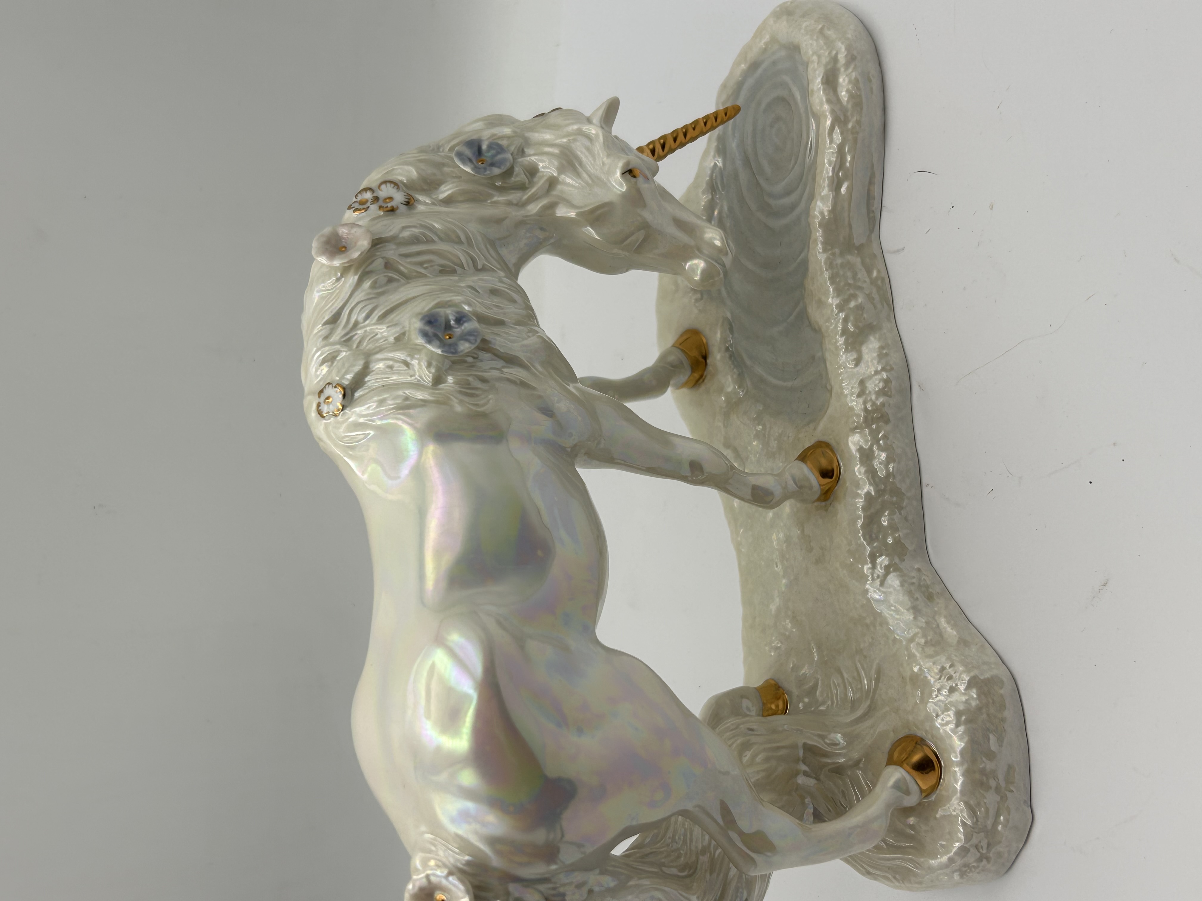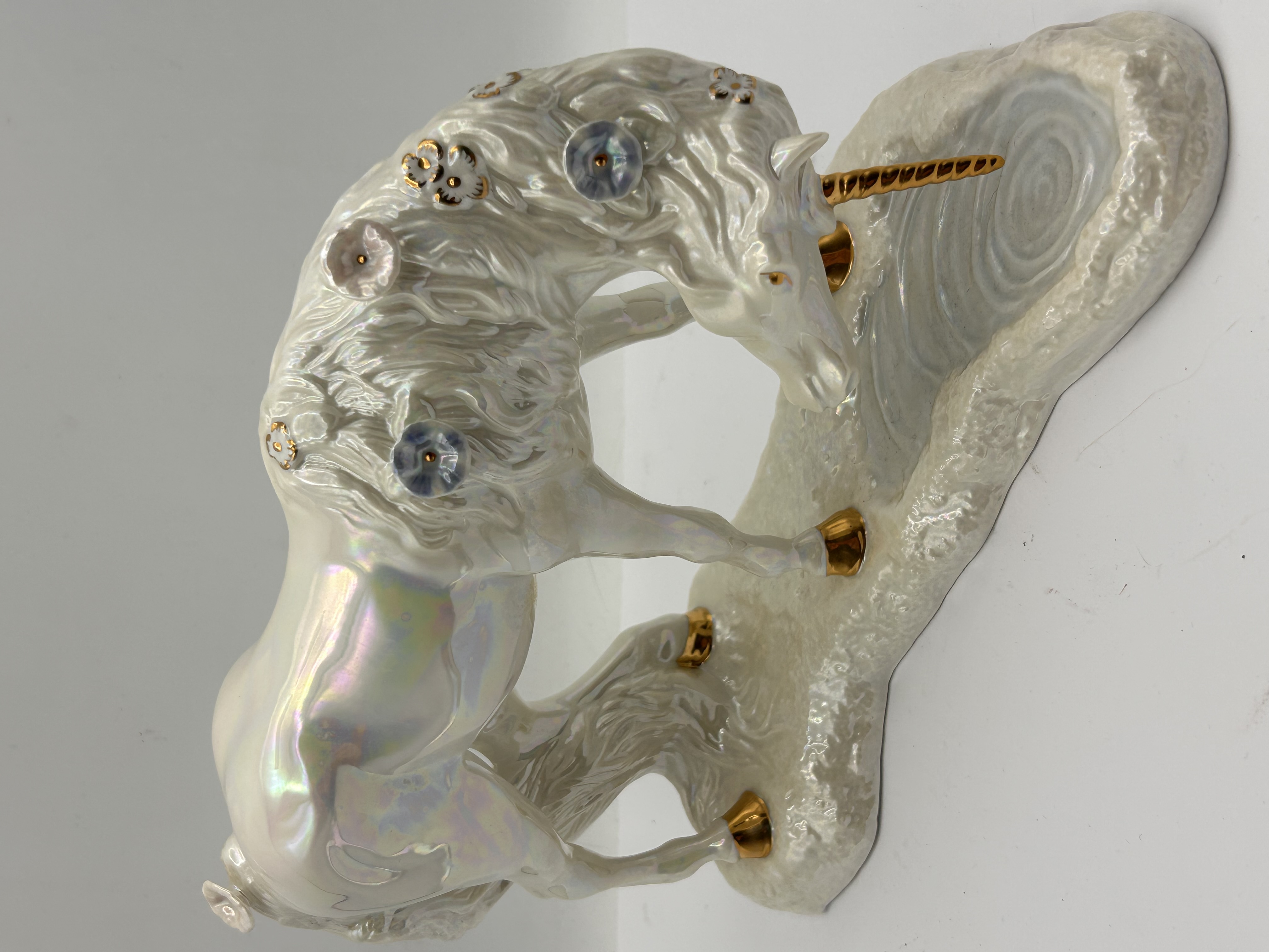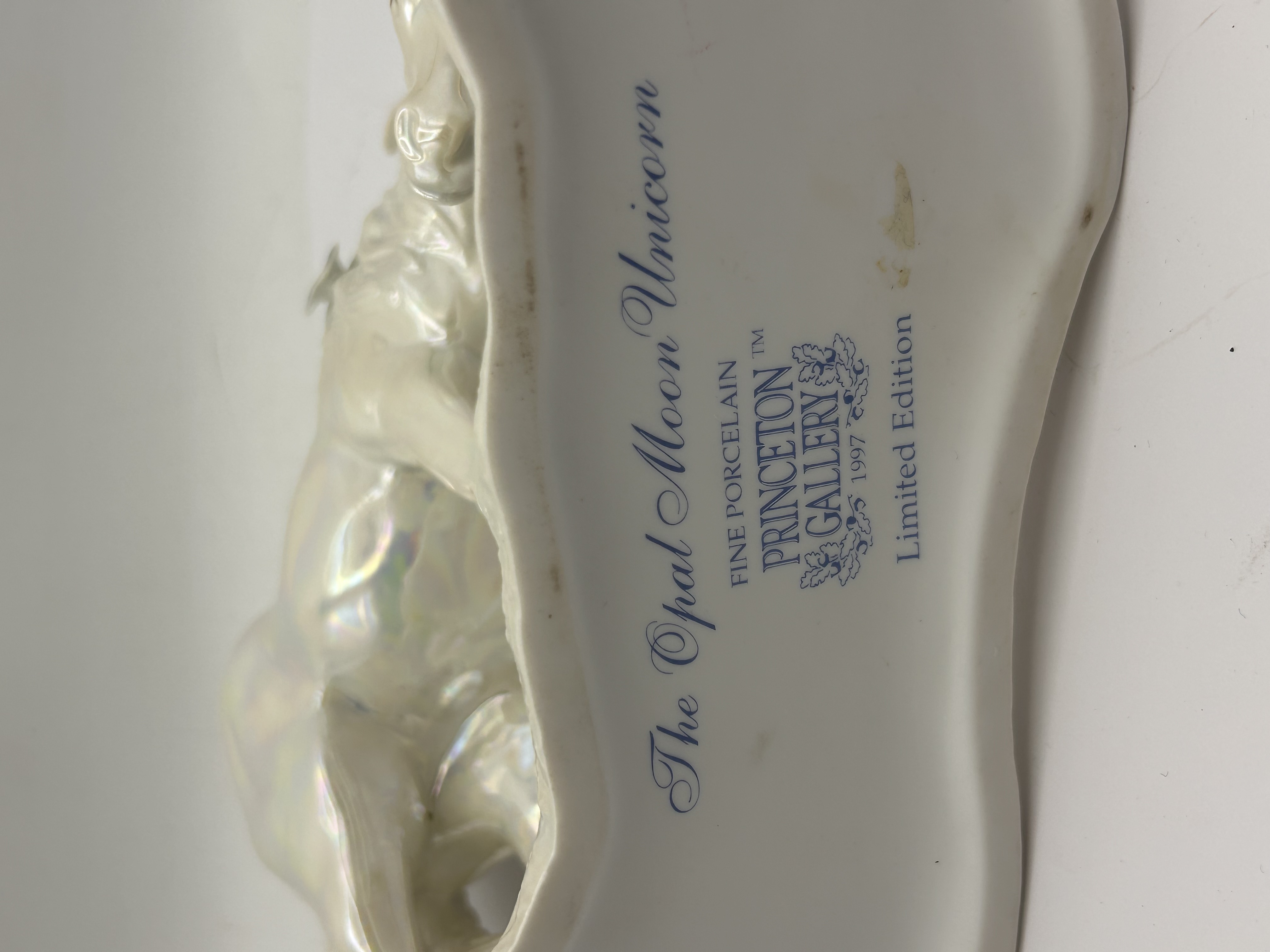 A single limited edition fine porcelain figurine titled “The Opal Moon Unicorn,” produced by Princeton Gallery and dated 1997. The sculpture depicts a unicorn standing on an integrated base designed to simulate a shallow pool of water, with the horn dipping toward the ripples. The figure is finished in a highly lustrous, iridescent, pearlescent glaze that exhibits color shift. The conical horn and hooves are accented with gold gilt. The stylized mane and tail are heavily detailed, and the mane is further embellished with small, applied porcelain flowers in pale blue and pink/mauve tones, secured by gilt rings. The base bears blue printed markings: “The Opal Moon Unicorn,” “FINE PORCELAIN,” “PRINCETON GALLERY,” and “Limited Edition 1997.”