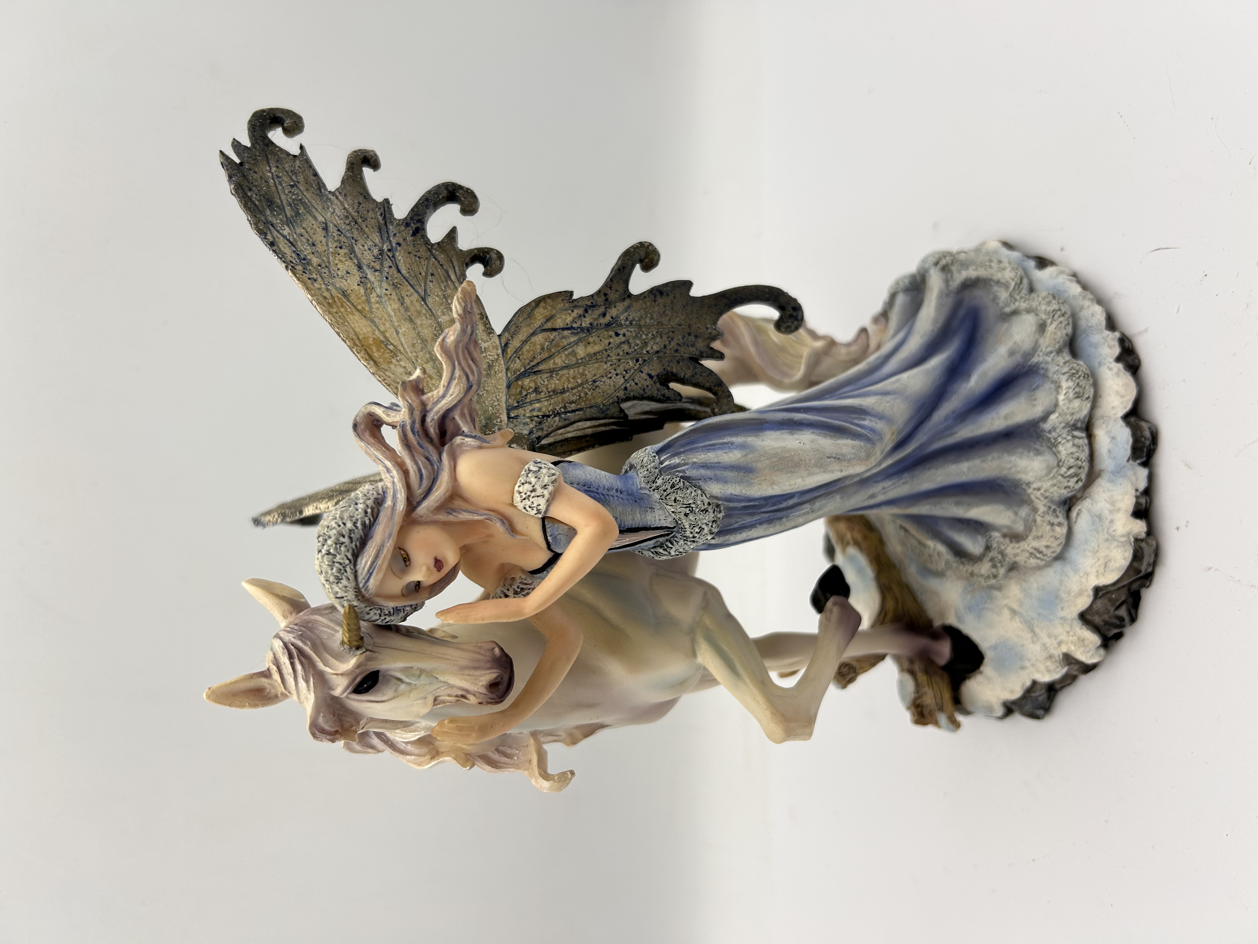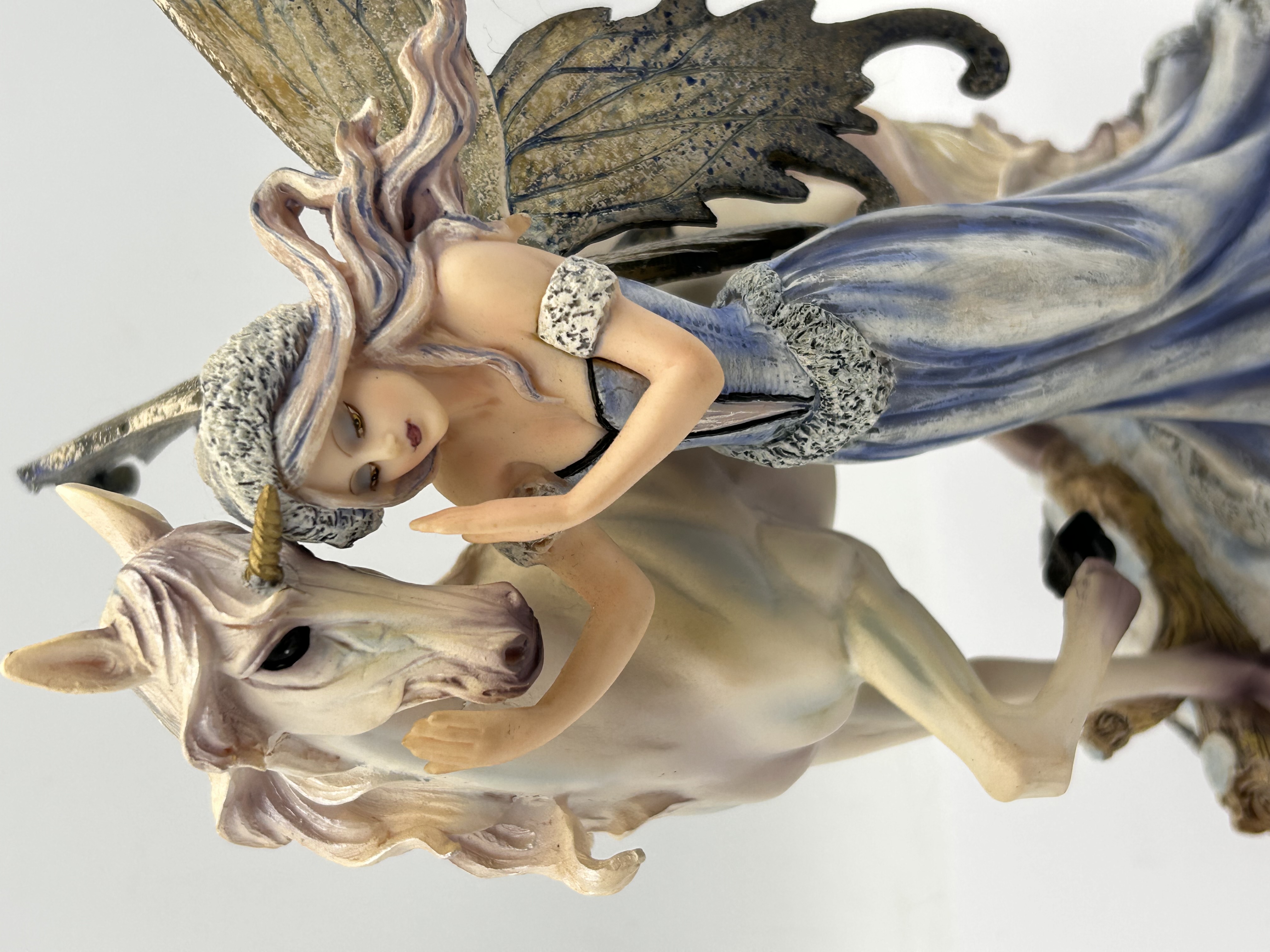 A single contemporary fantasy figurine produced by Nemesis Now, identified by the title Comfort and often referred to as the ‘Enchanted Ice Fairy and Unicorn’. The piece is constructed from cold-cast resin or polystone and finished with detailed polychrome painting. The sculpture depicts a female fairy figure wearing a long blue and silver gown with faux-fur trim on the bodice and hat, possessing large, highly detailed wings painted in metallic brown and gold tones. She is shown embracing a pale pink-maned unicorn with a small golden horn. The figures stand together on a sculpted base suggesting snowy woodland terrain. The base features a round decal with stylized, partially obscured text referencing the brand and title structure, including the words “RISE” and “NOW”.