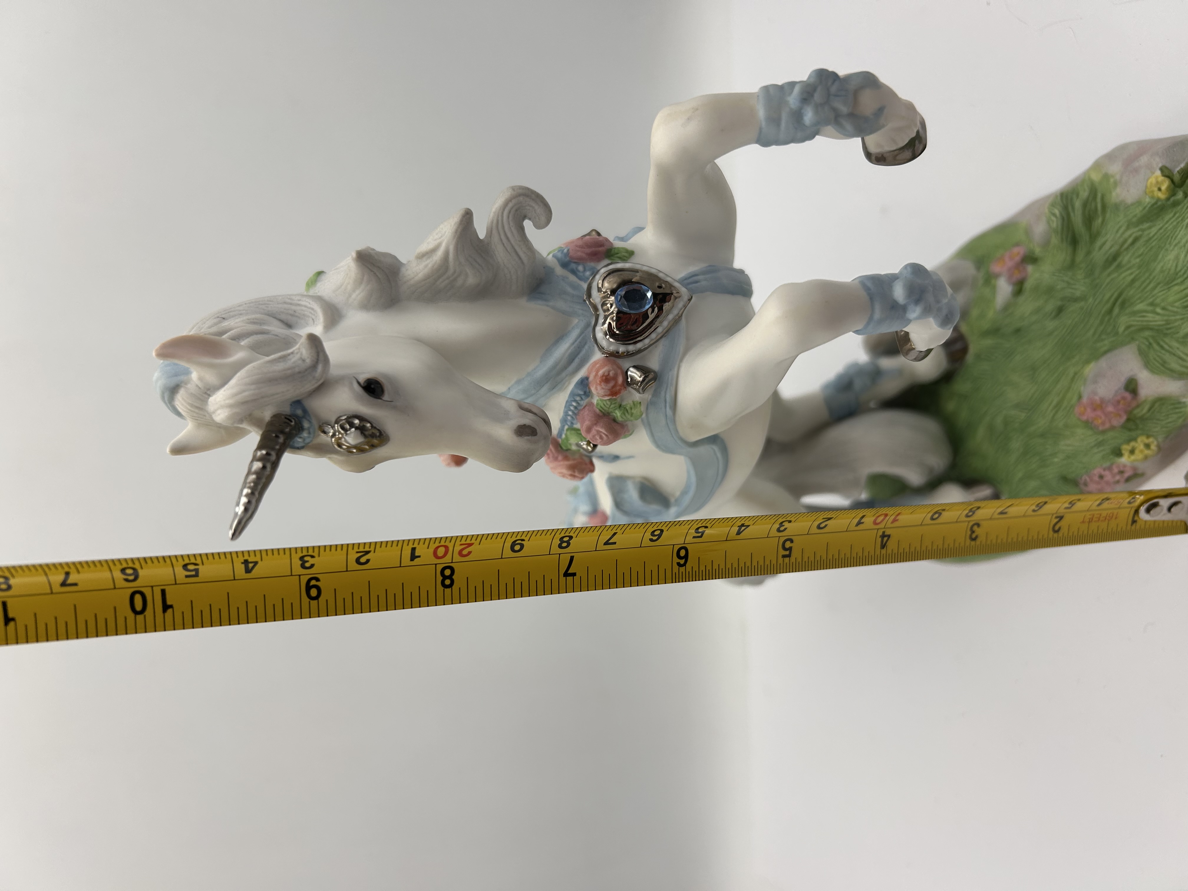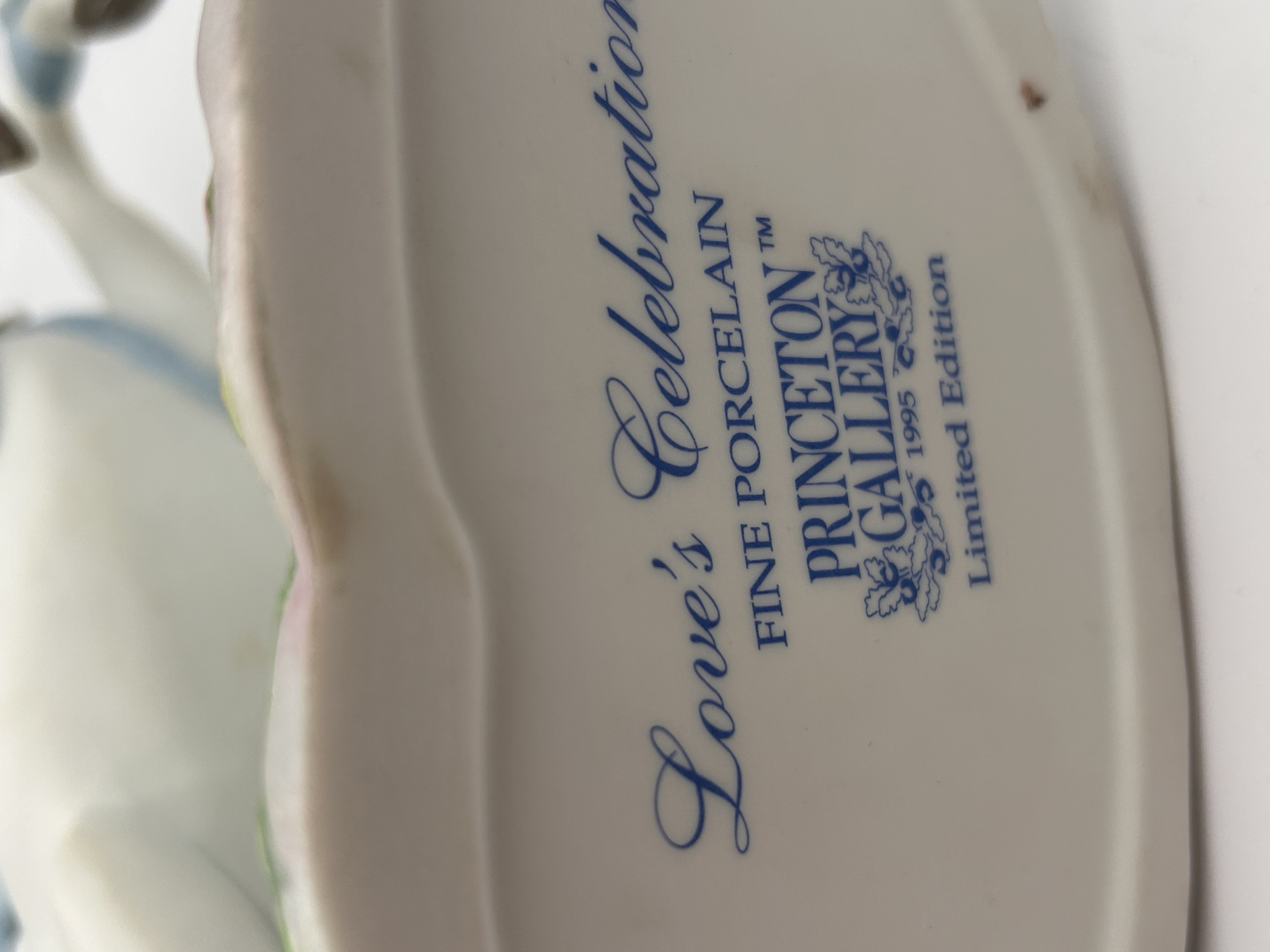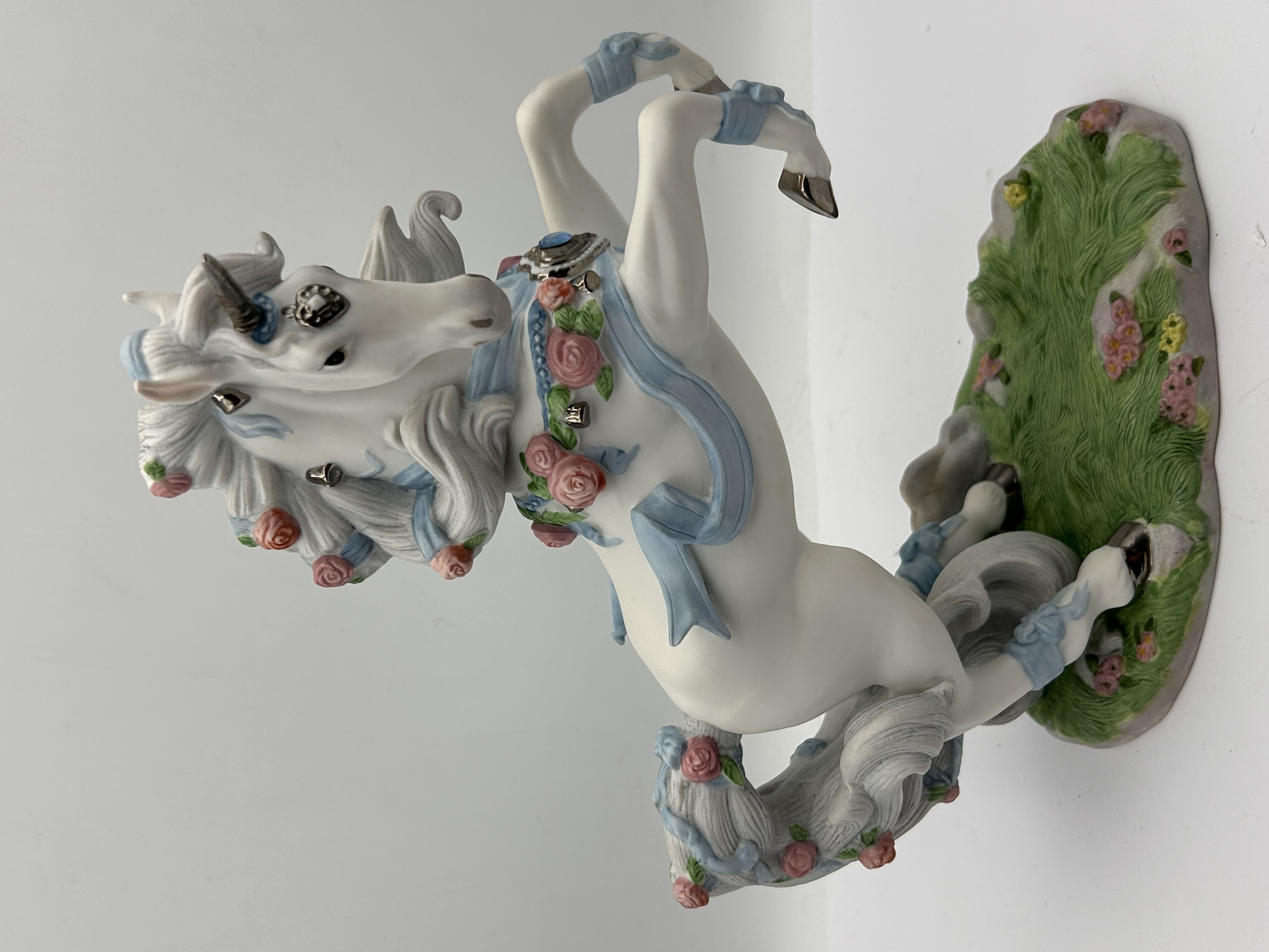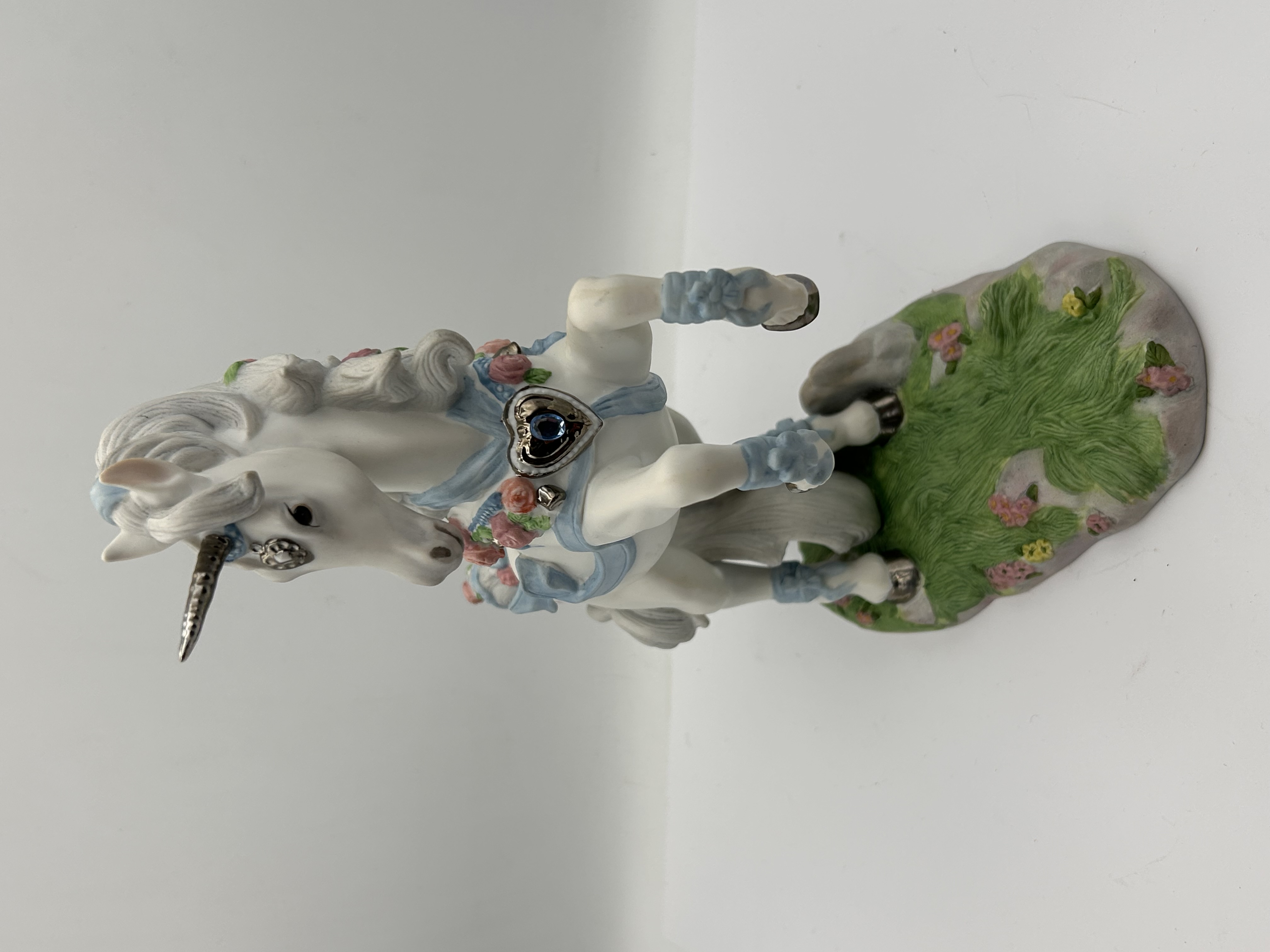 A single glazed porcelain figurine titled Love’s Celebration, produced by Princeton Gallery in 1995 as a Limited Edition piece. The sculpture depicts a white unicorn rearing on its hind legs, mounted on an oval base sculpted to resemble green grass scattered with small flowers. The unicorn is decorated in a romantic style, featuring light blue ribbons applied along the mane, tail, and legs, and pink roses applied along the mane and body. Metallic silver-toned embellishments include the horn and two heart-shaped settings, which are inset with clear and blue imitation gems. Visible markings on the base include the title Love’s Celebration, FINE PORCELAIN, PRINCETON GALLERY™, 1995, and Limited Edition.