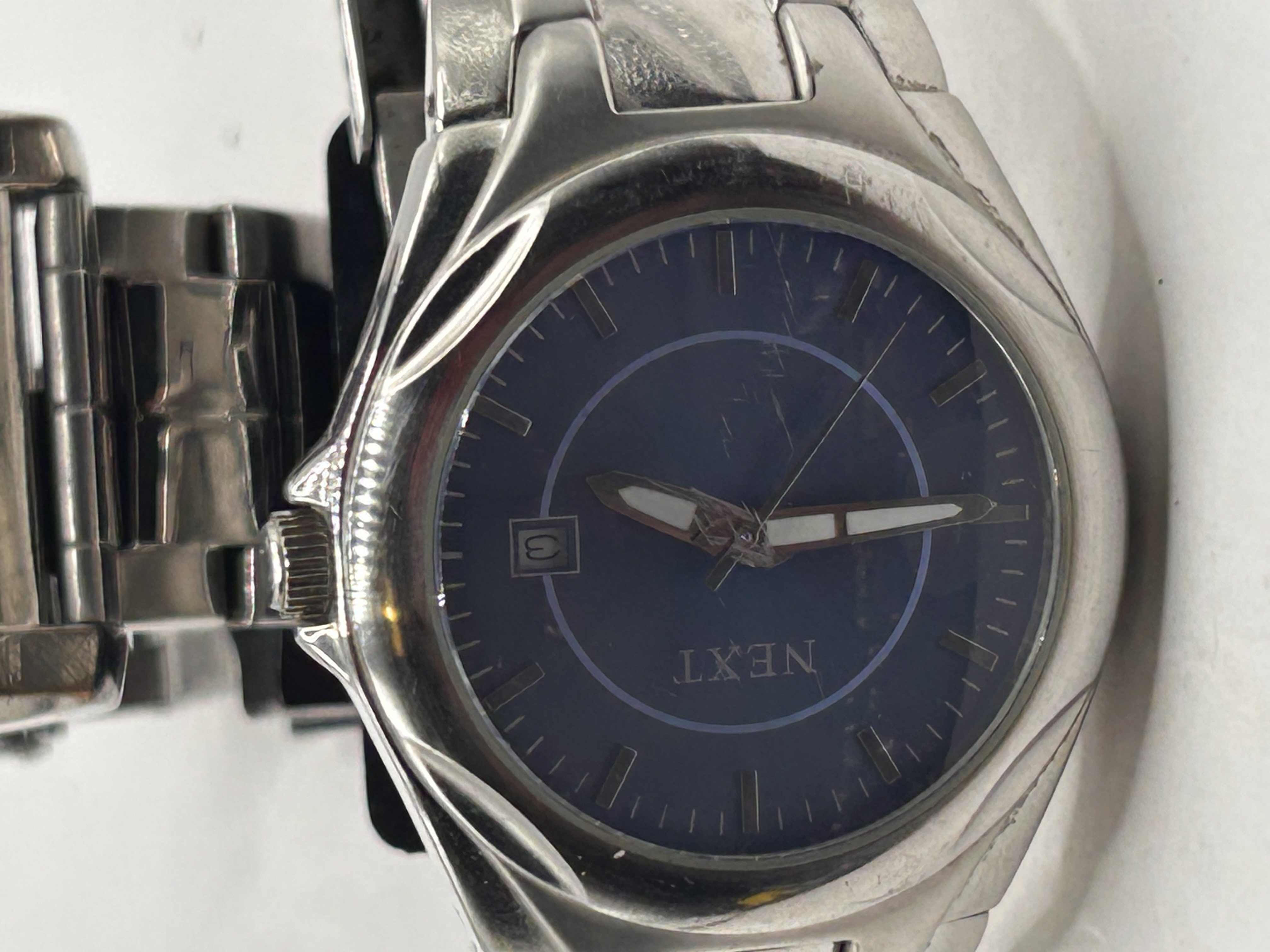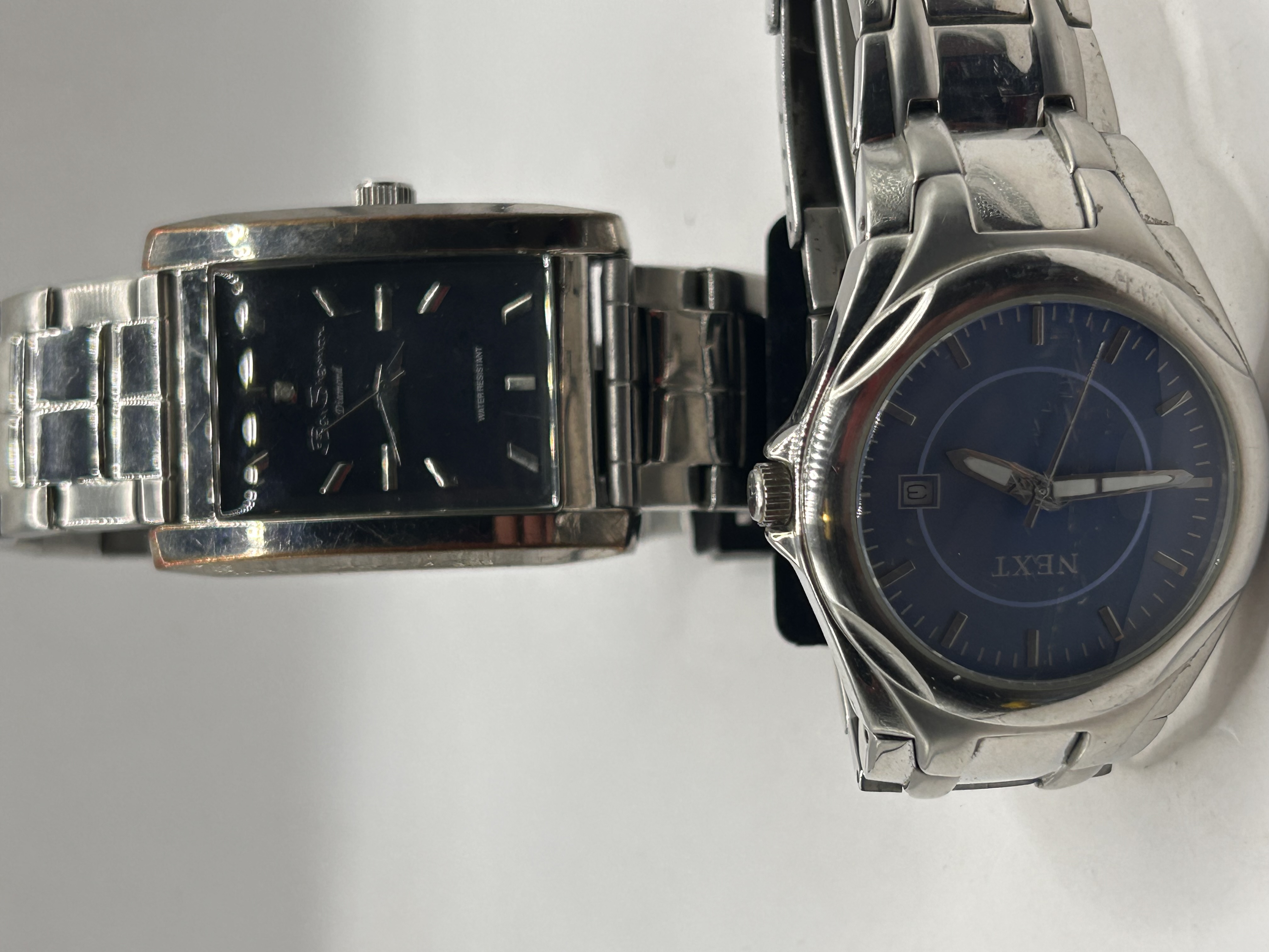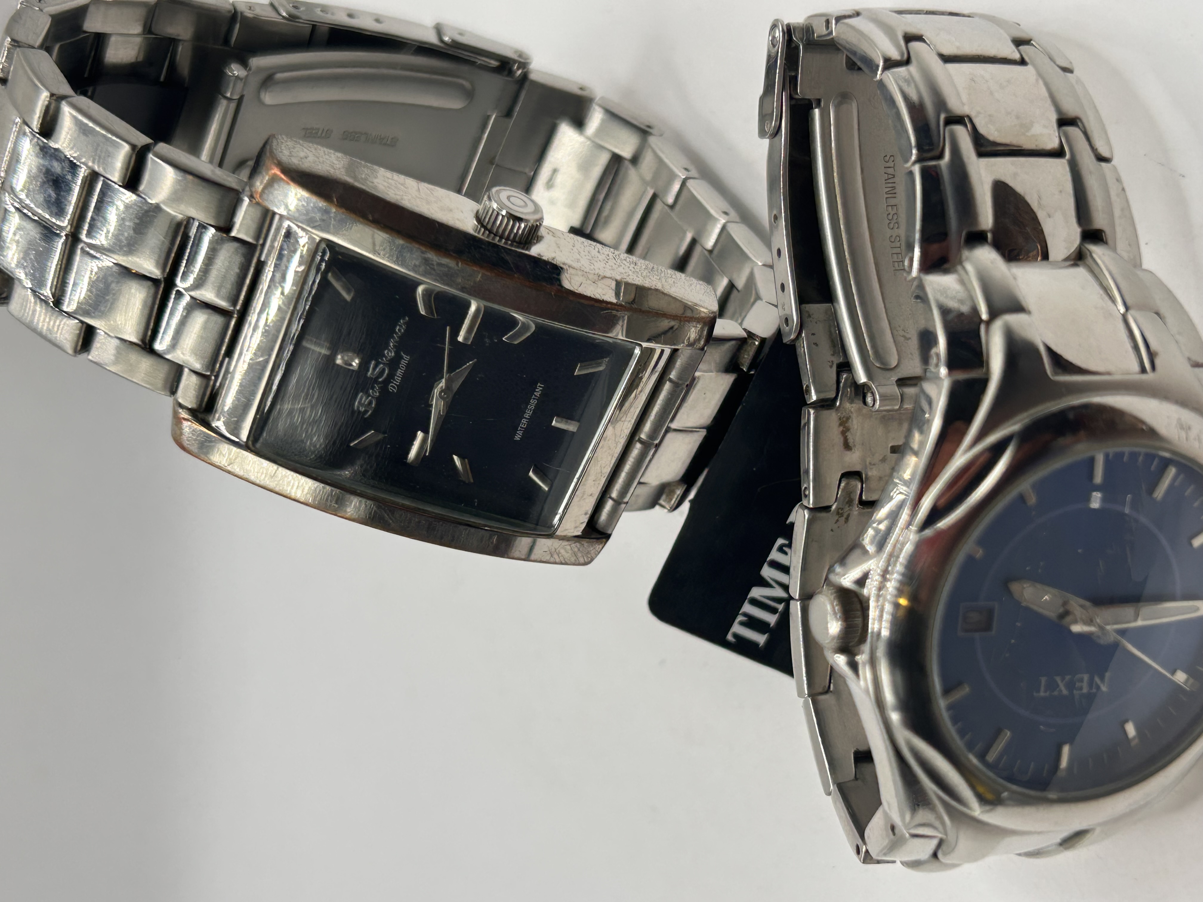 This lot comprises two modern stainless steel wristwatches. The first timepiece is identified via web consensus as a Ben Sherman R741 Diamond model. It features a rectangular stainless steel case and a black dial marked “Ben Sherman Diamond” and “WATER RESISTANT.” The second timepiece is a NEXT brand watch, characterized by a rounded, stylized stainless steel case and a deep blue dial with stick hour markers and a date window positioned at 3 o’clock. Both watches utilize stainless steel link bracelets, confirmed by “STAINLESS STEEL” inscriptions visible on the bands. The Ben Sherman watch is displayed resting against a partial black stand marked “TIME.”