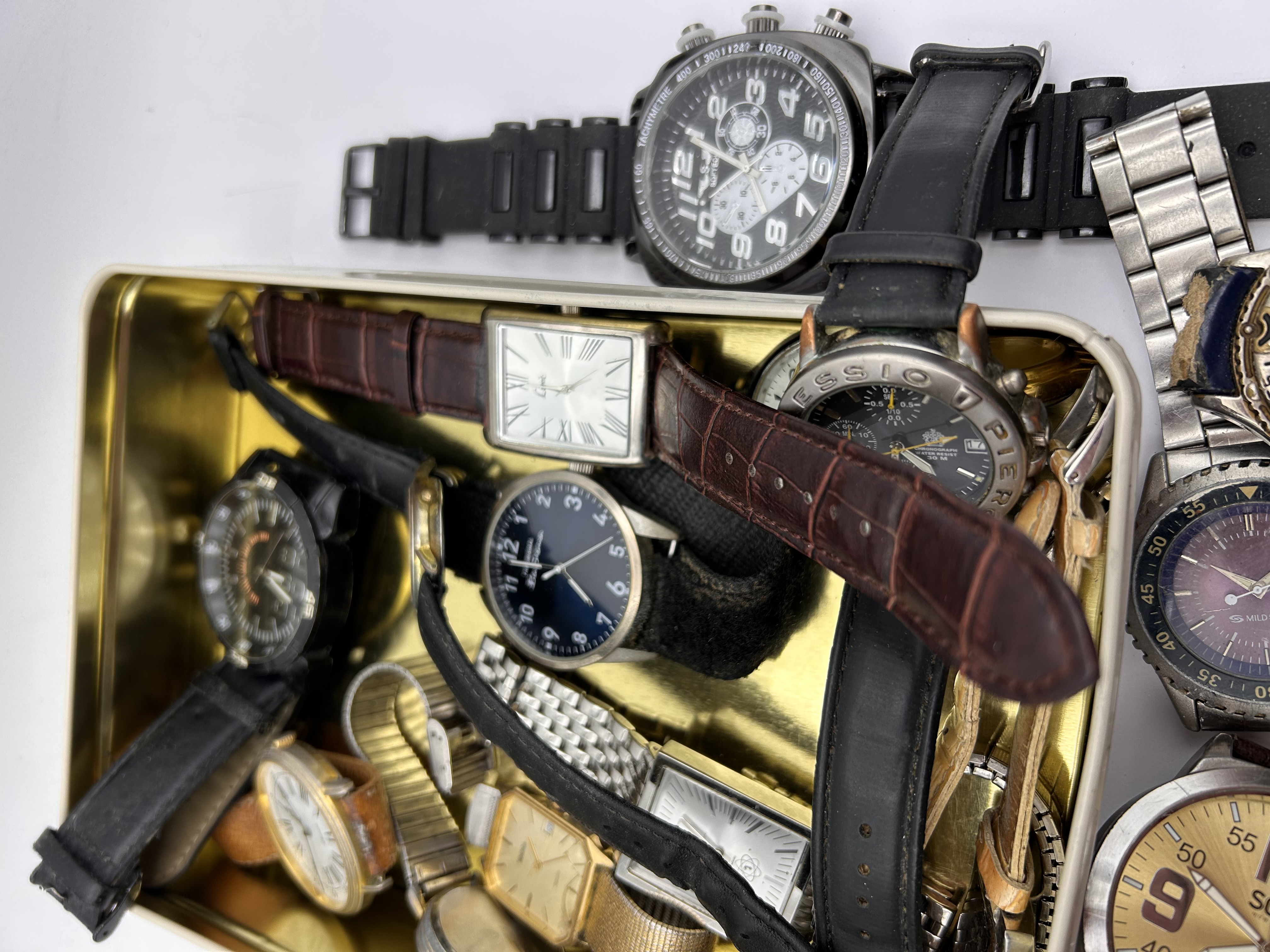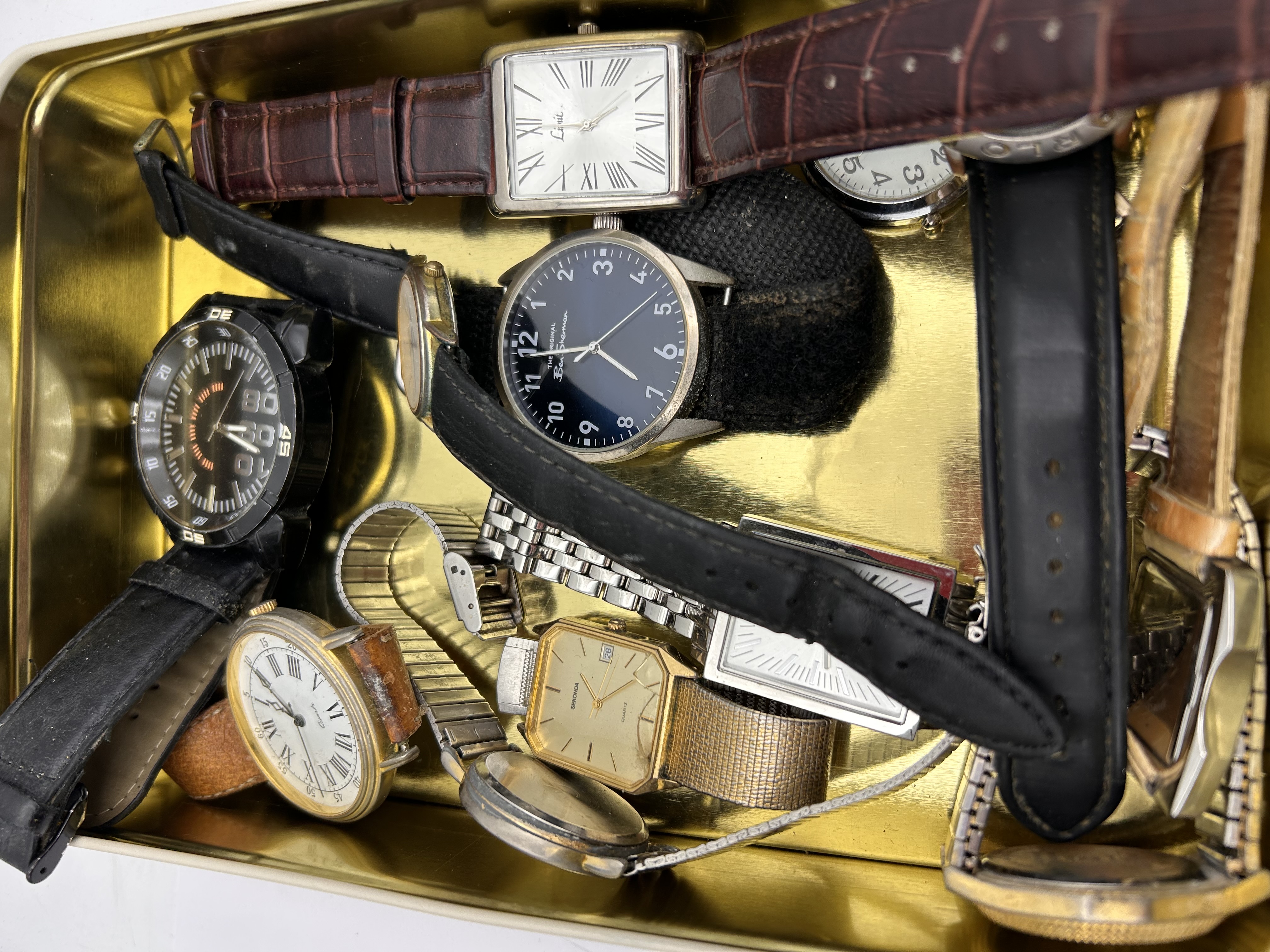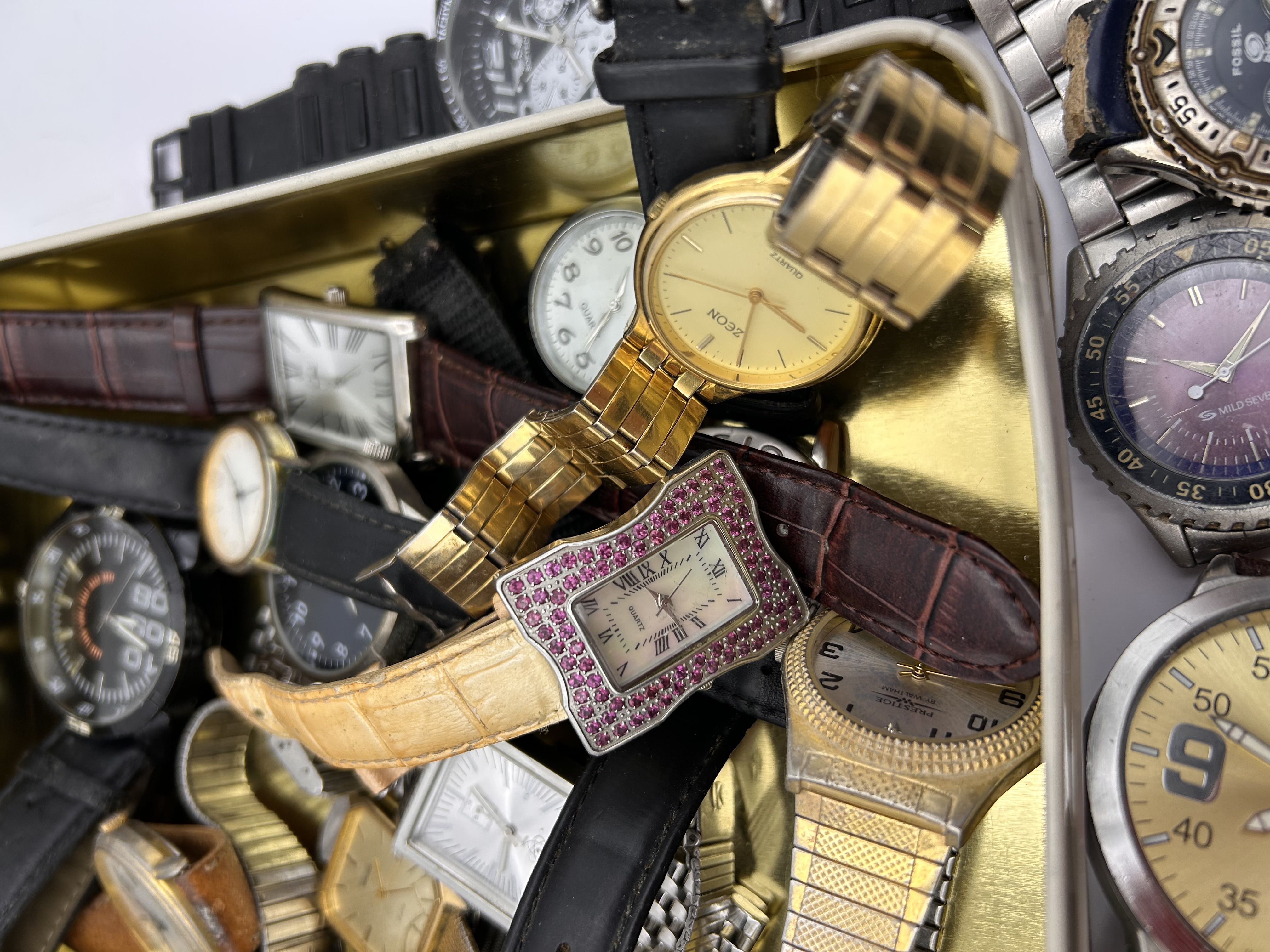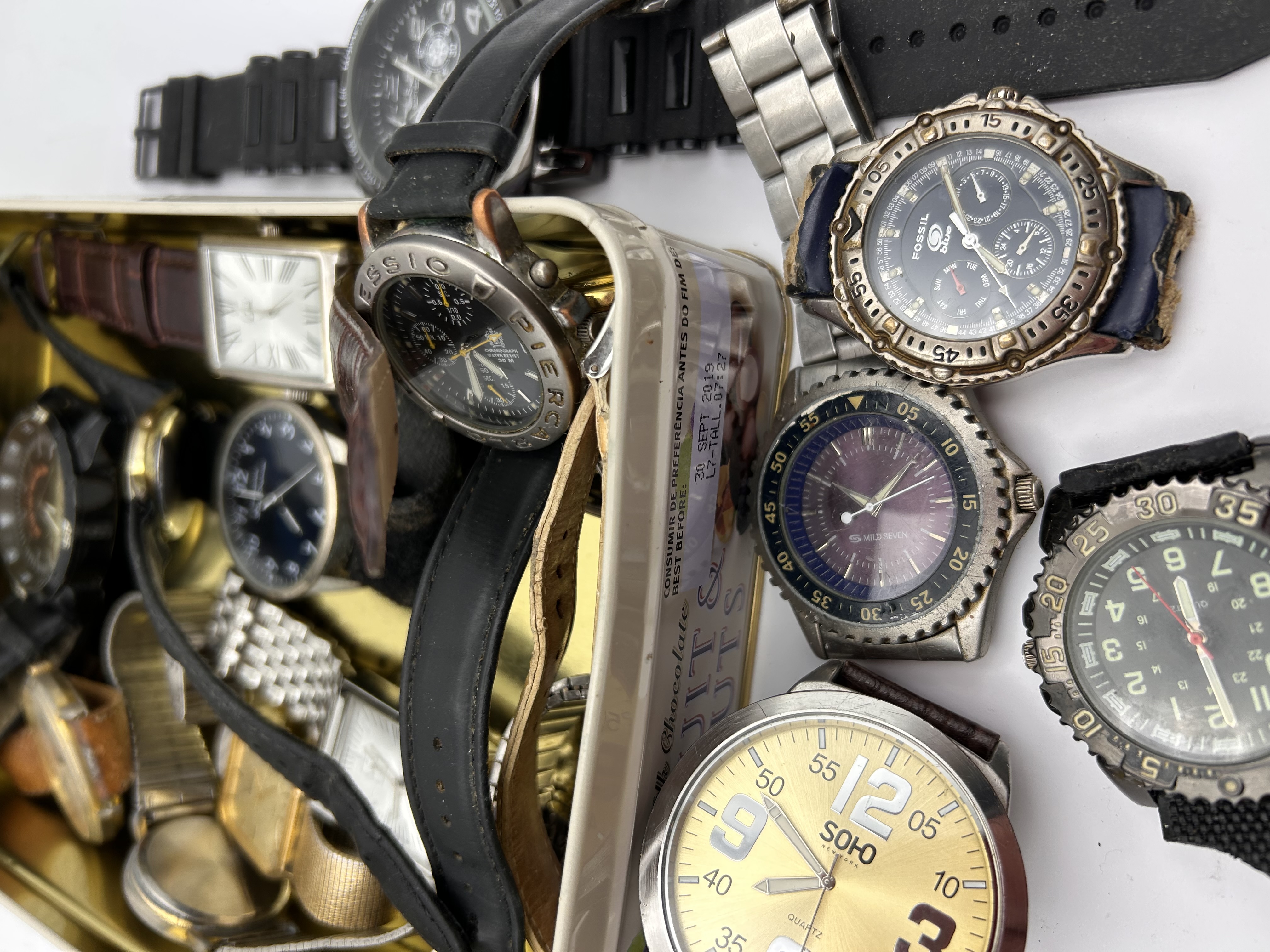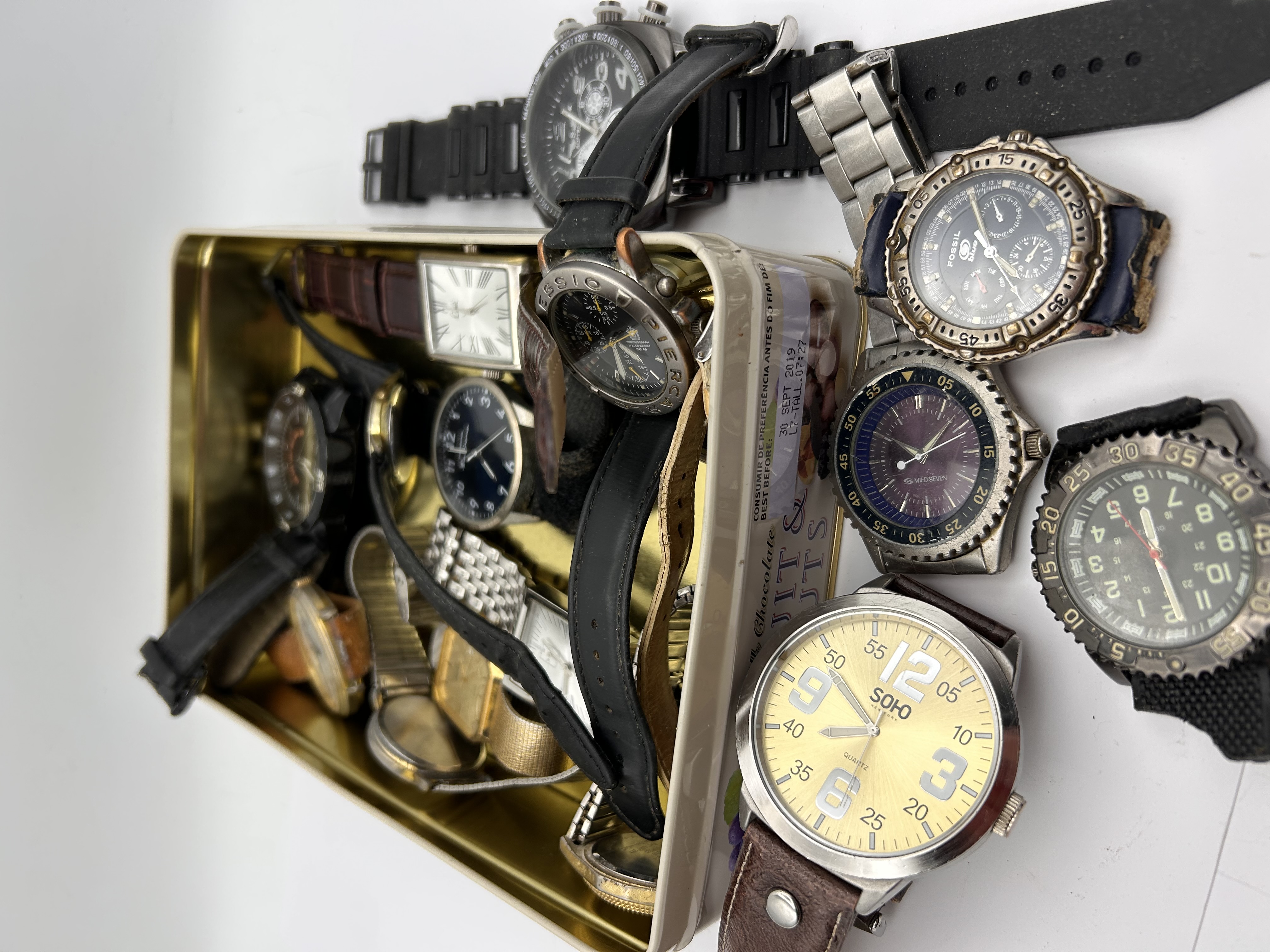 A collection of twenty (20) assorted wristwatches, primarily quartz movements, presented scattered inside and around a rectangular metal tin. The collection includes a variety of styles, including oversized sport/diver watches, chronograph functions, rectangular and square cased dress watches, and standard round analog watches. Visible materials include stainless steel, gold-tone plated metal, plastic/rubber, and mixed leather straps (black, brown, croc-embossed). Visible brands and markings include SOHO, FOSSIL, Liu Jo, XEON, and ZENTRA, often alongside the QUARTZ designation. One rectangular watch features a bezel set with decorative pink/red stones. The watches are mixed men’s and women’s styles. The metal tin is marked in Spanish with the inscription CONSUMIR DE PREFERENCIA ANTES DE: 30. SEPT. 2018. The lot is sold as untested for parts or salvage.
