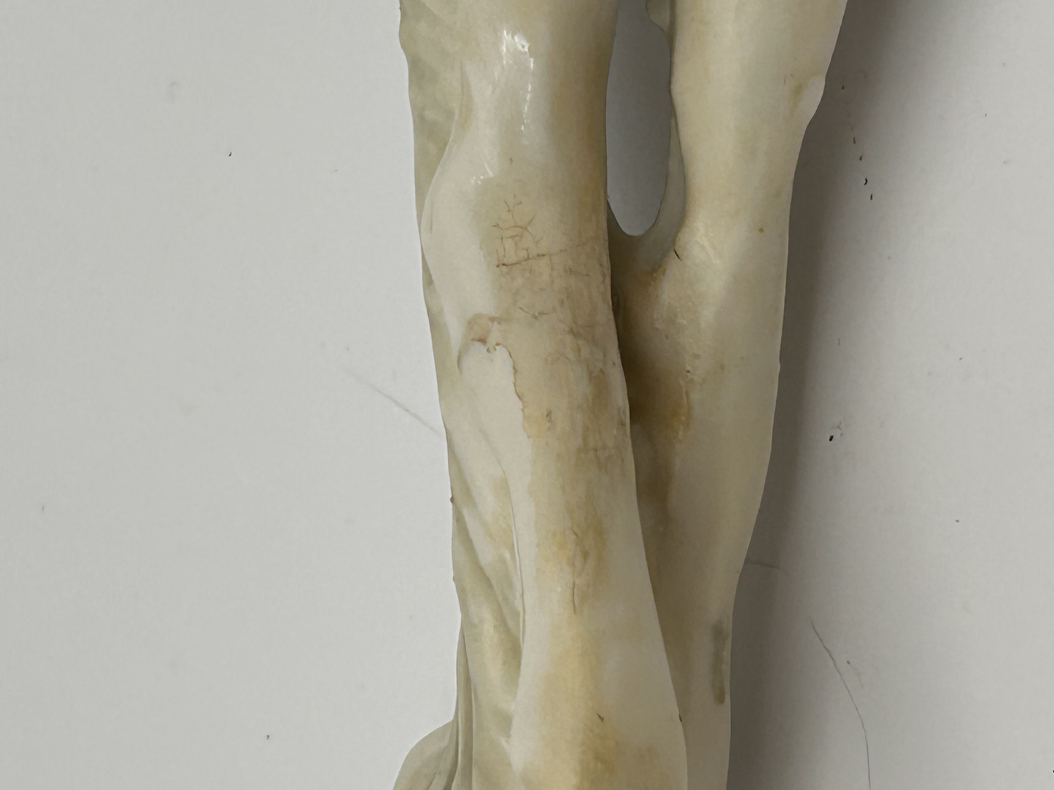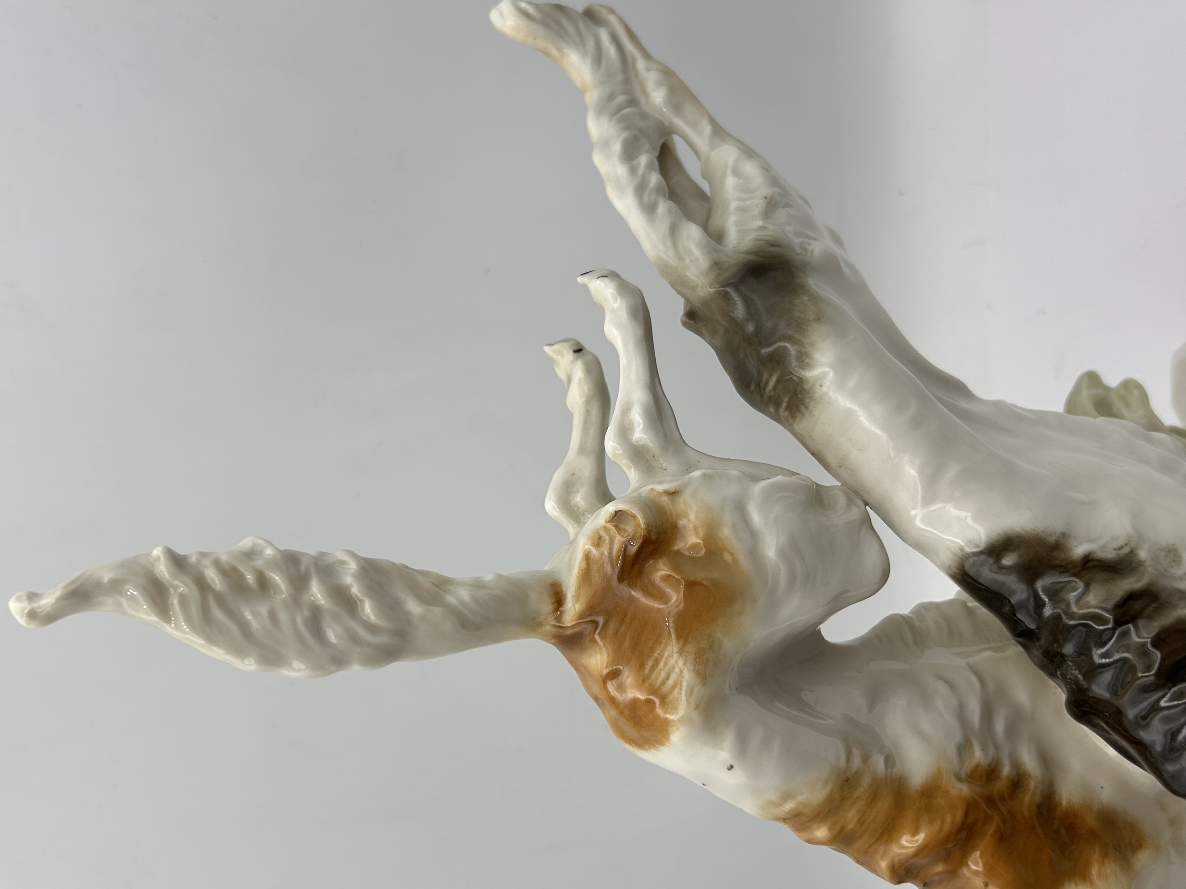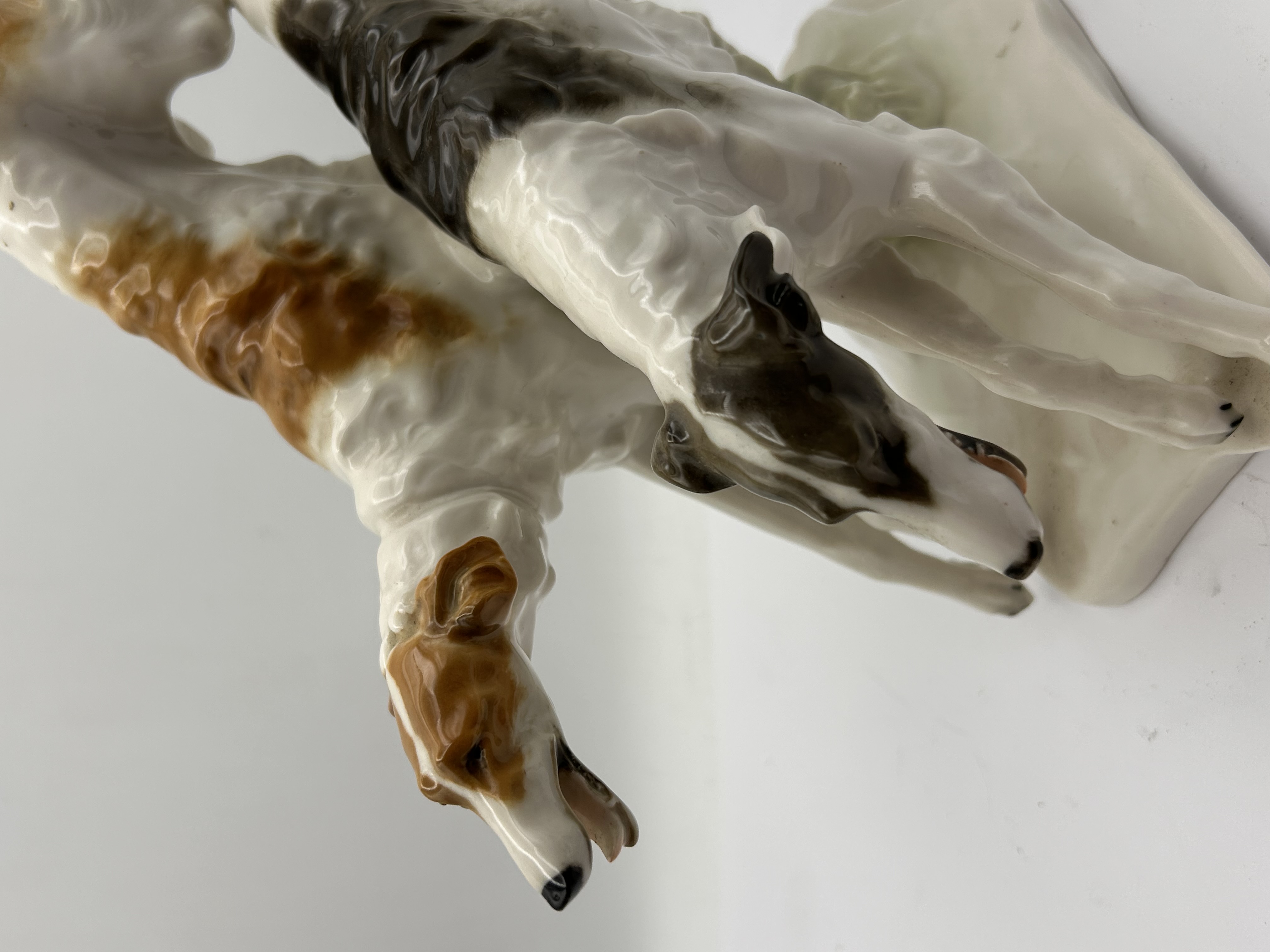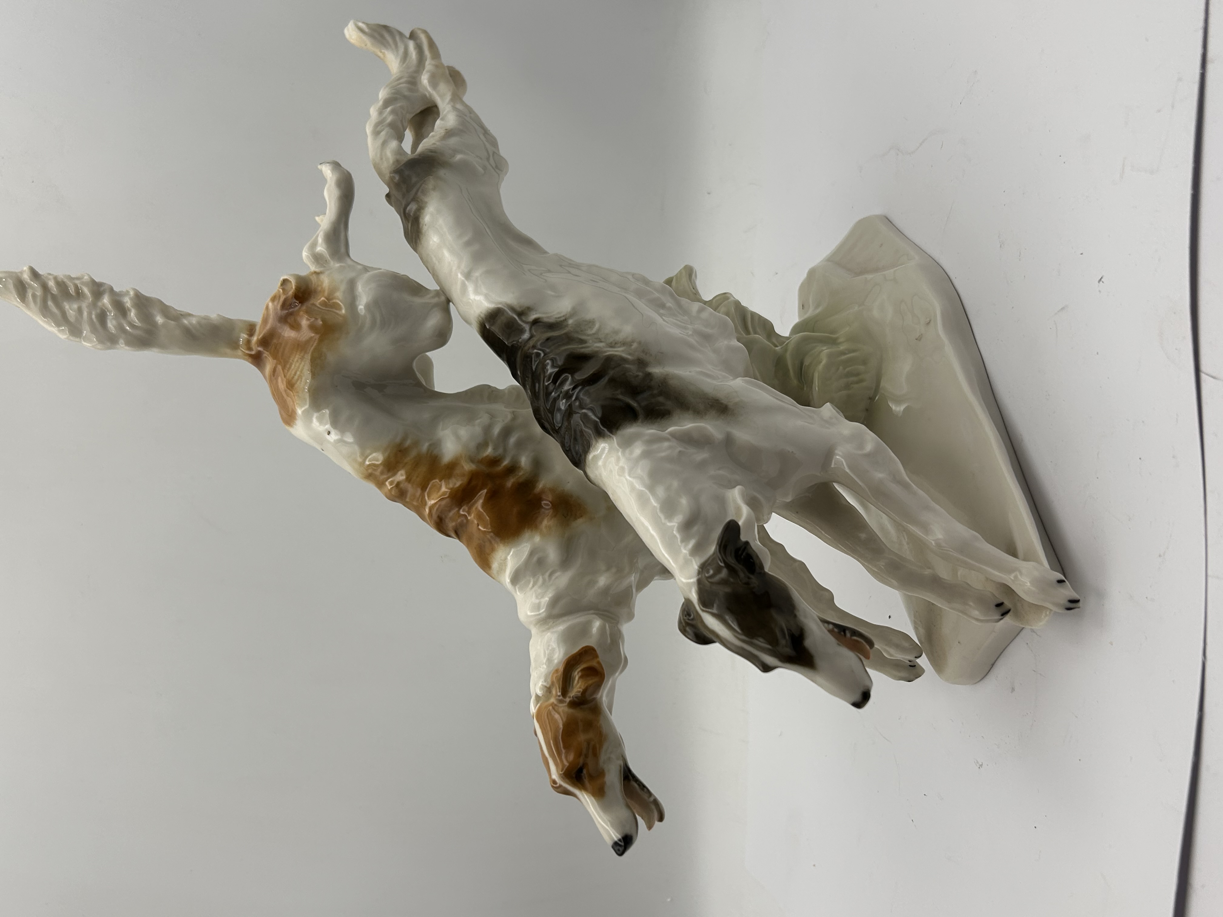 A glazed porcelain figural group depicting two Borzoi (Russian Wolfhounds) hounds mid-run, mounted on a rectangular base. The sculpture is attributed to Karl Tutter for Hutschenreuther. The dogs feature white coats with contrasting patches, one russet/orange-brown and the other dark gray/black. The underside bears a green stamped Hutschenreuther logo featuring the lion and the year ‘1914,’ accompanied by the text “HUTSCHENREUTHER GERMANY KUNSTABTEILUNG” (Art Department) and the model number ’12.’ The piece is incised with the designer’s name “K. TUTTER” and retains an adhesive paper label reading “Lorenz Hutschenreuther Kunstabteilung 1272/21.” Possible Repair??