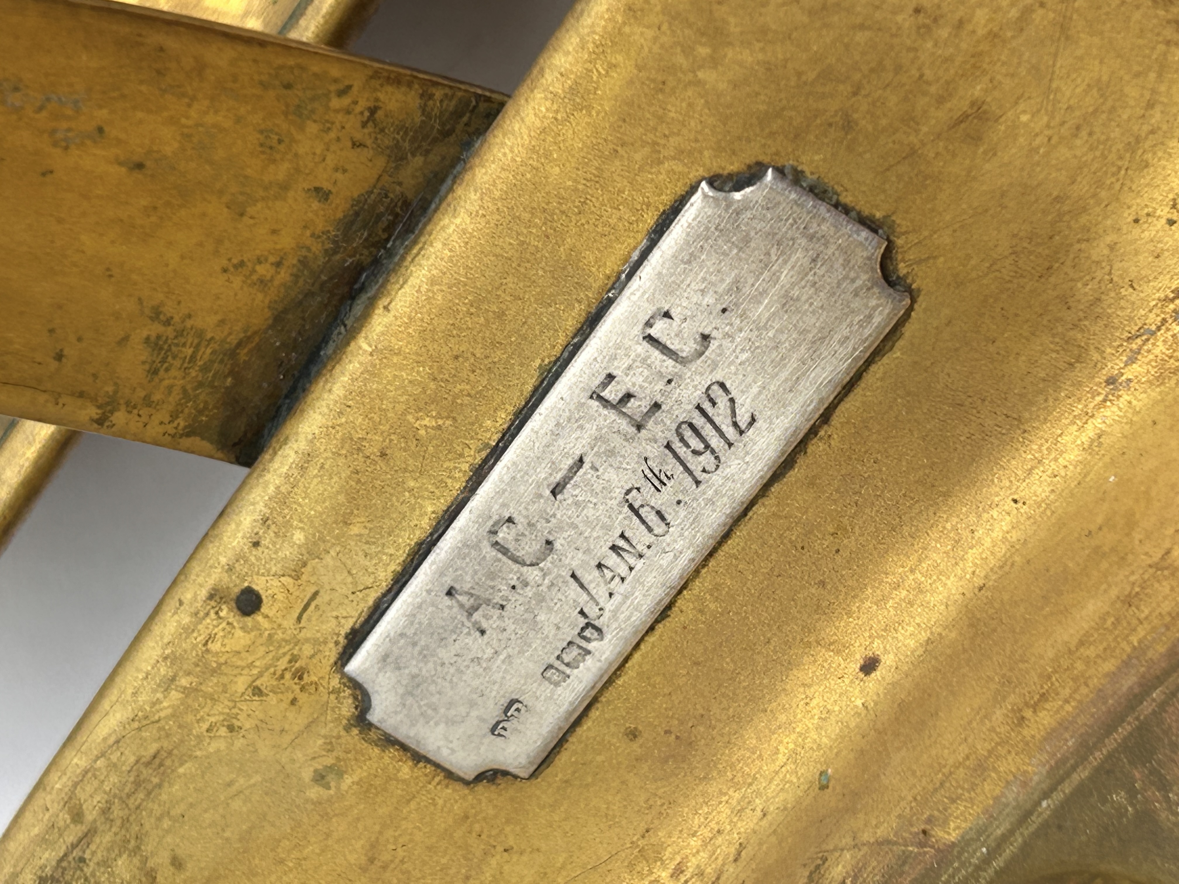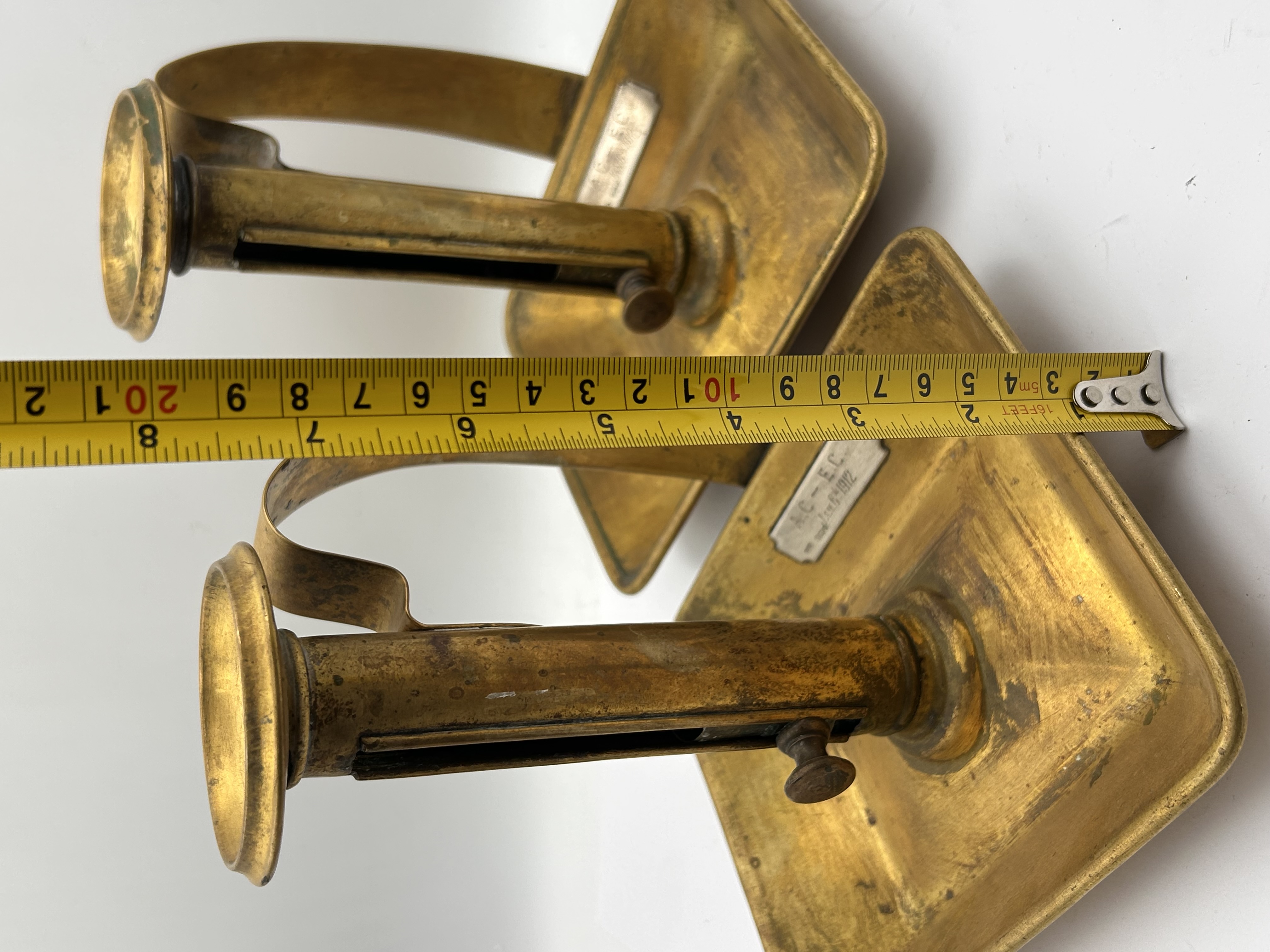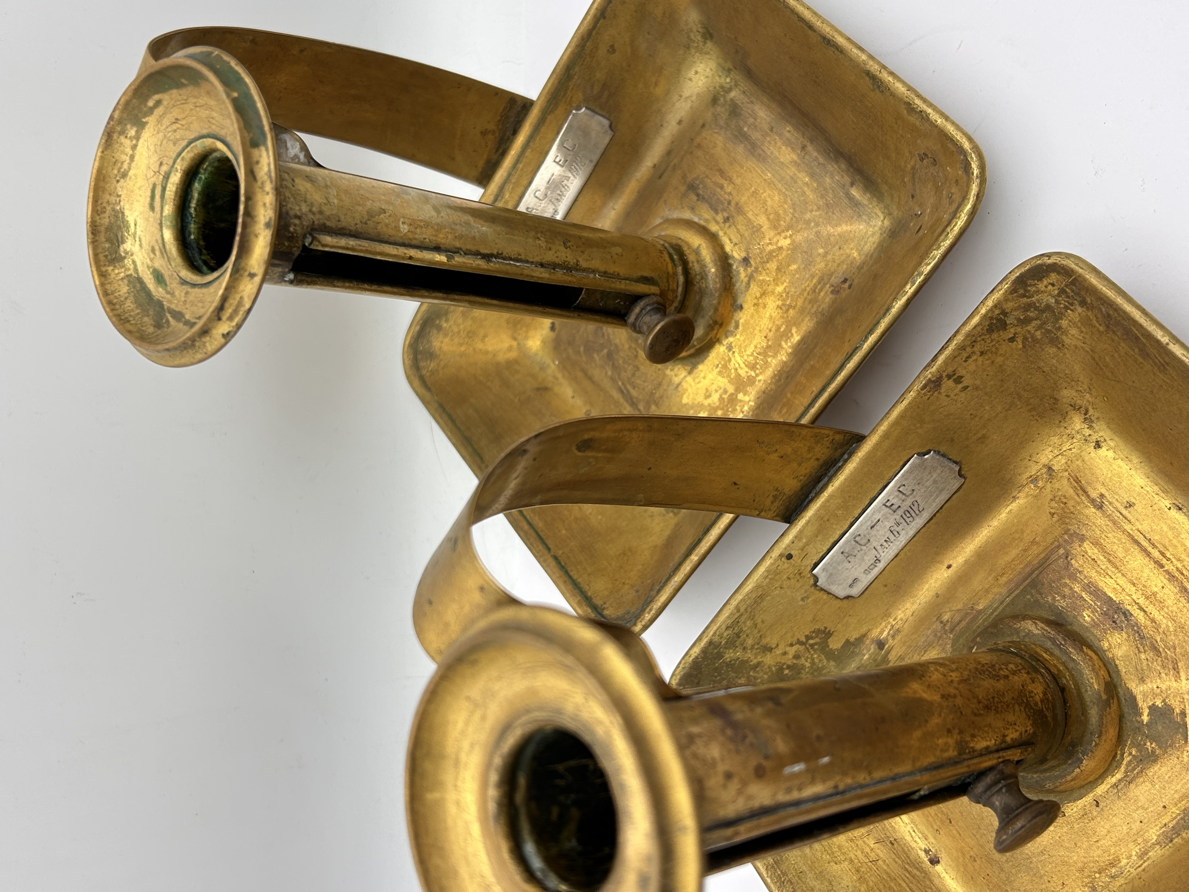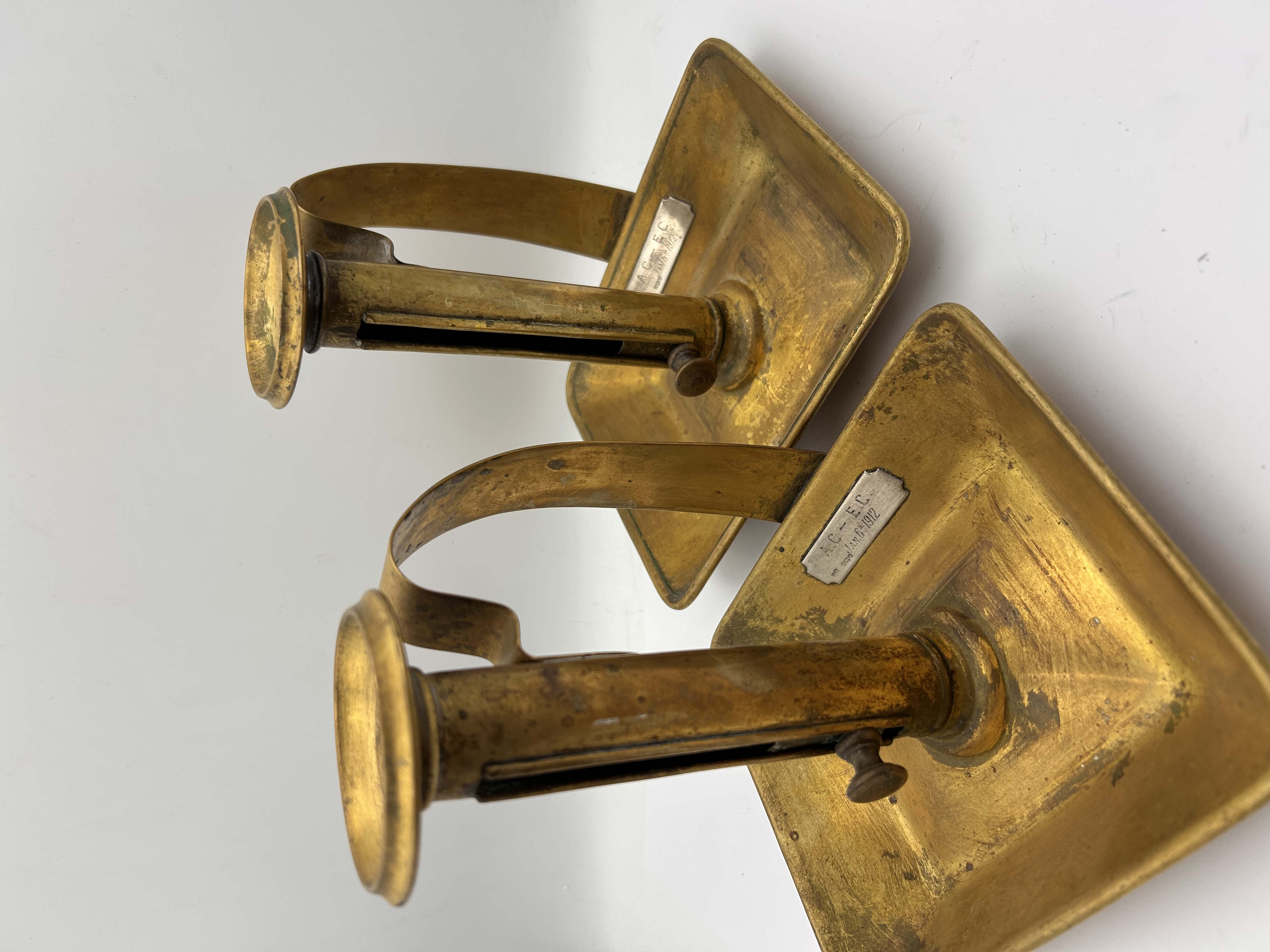 A pair of adjustable brass chambersticks, dating to the early 20th century, likely associated with the 1912 design deposit date inscribed on the base. Each chamberstick features a utilitarian design constructed entirely of brass. The form consists of a square drip-tray base, a curved carrying handle, and a cylindrical nozzle. The nozzle is equipped with an internal sliding ejector mechanism, which is adjusted and secured by a small, external thumbscrew. Affixed to the square drip-tray base of each item is a small, rectangular silver-toned plaque inscribed with the text: “A.C. – E.C.” above “dep. JAN. 6 TH 1912.”