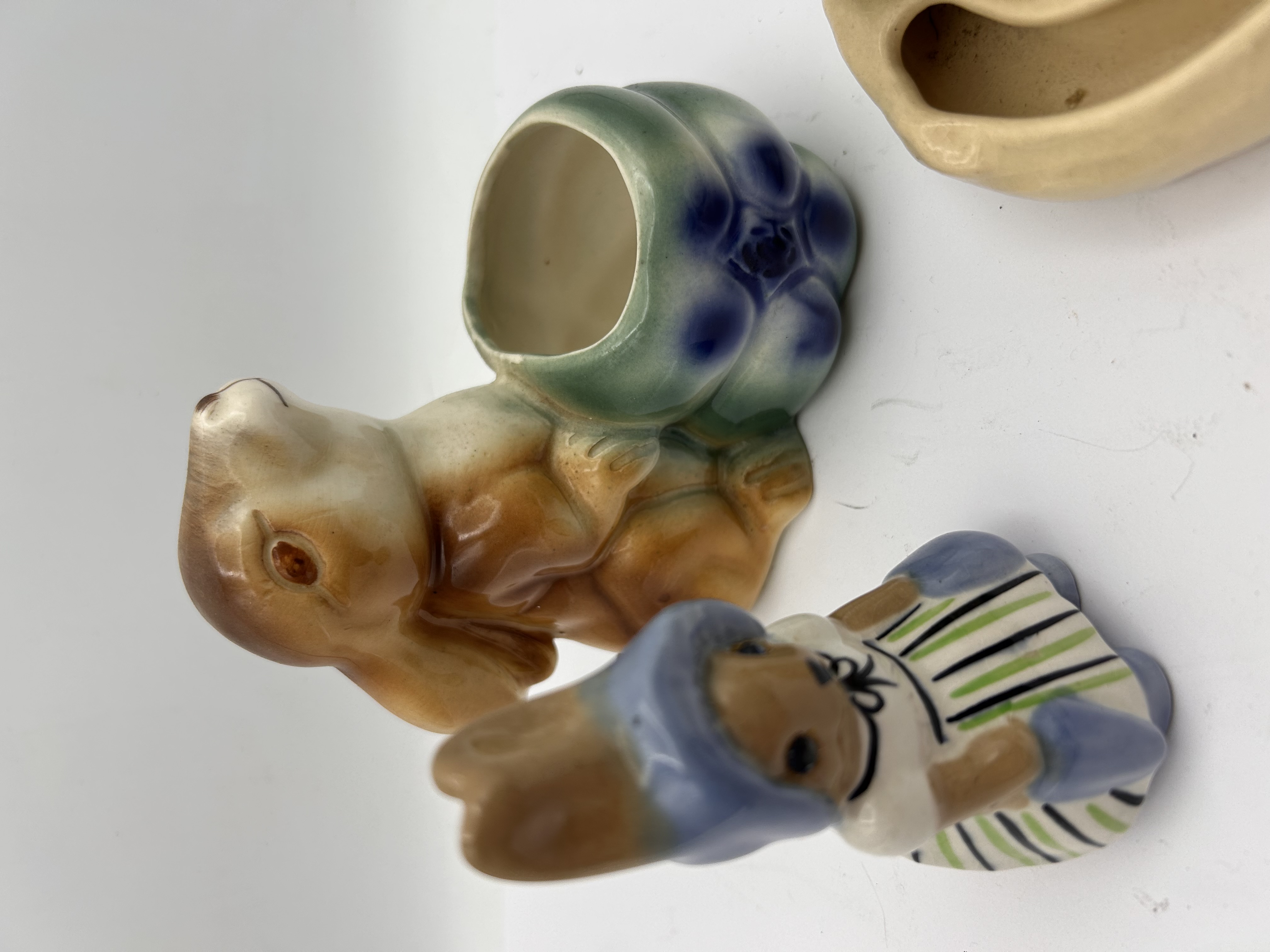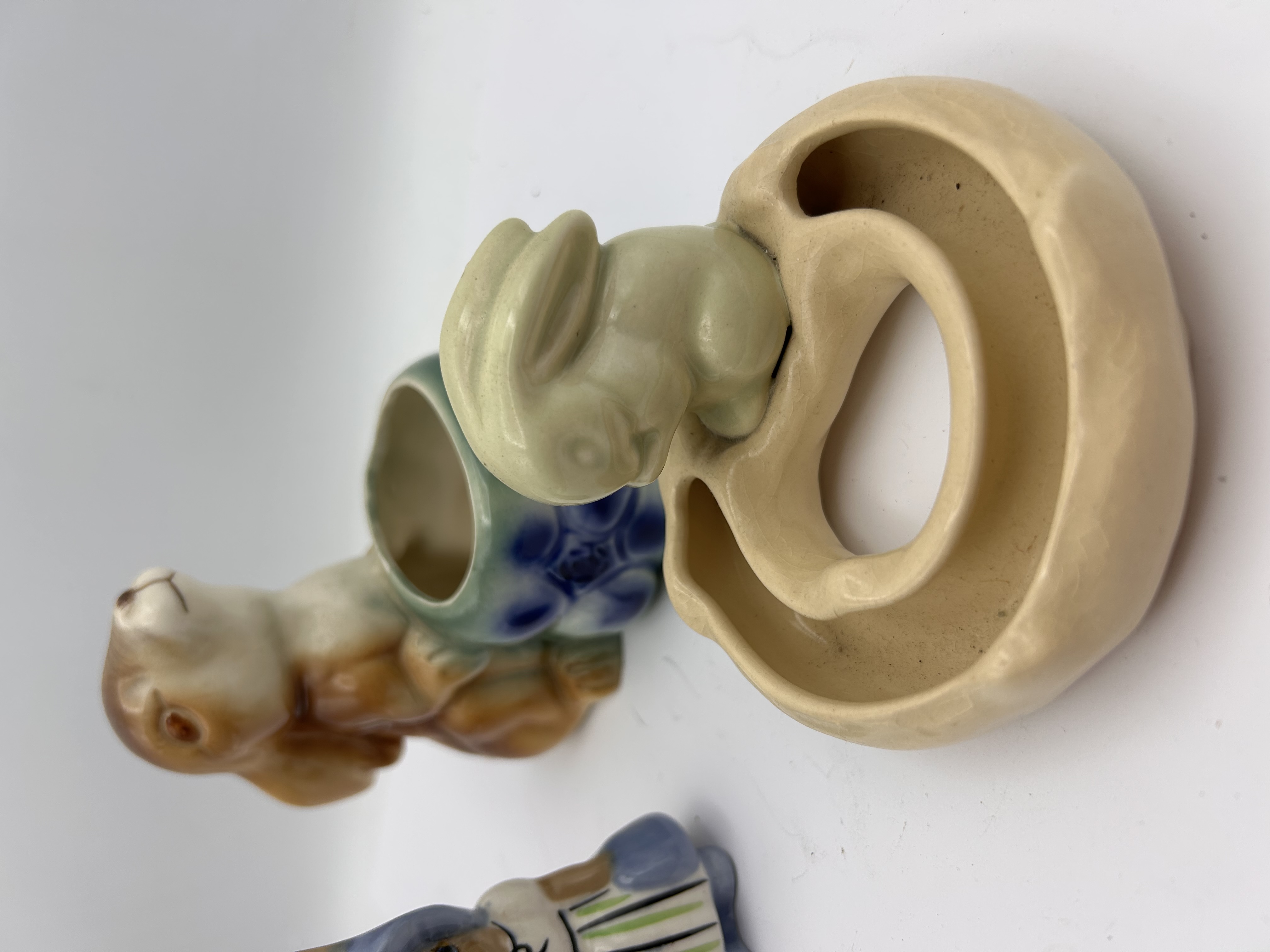 A collection of glazed ceramic novelty wares, likely dating to the mid-20th century, featuring spring and Easter motifs. The group includes a larger brown and tan rabbit figure designed as a planter or vase, holding a deep blue and green egg-shaped receptacle. Also included is a small figurine depicting a child or gnome wearing a blue bonnet and a vertically striped dress (blue, white, and green stripes). The remaining pieces are a small pale green glazed bunny figurine and a separate, segmented beige ceramic ring or tray upon which the small bunny is resting. All pieces are constructed of glazed ceramic. No manufacturer marks or text are visible.