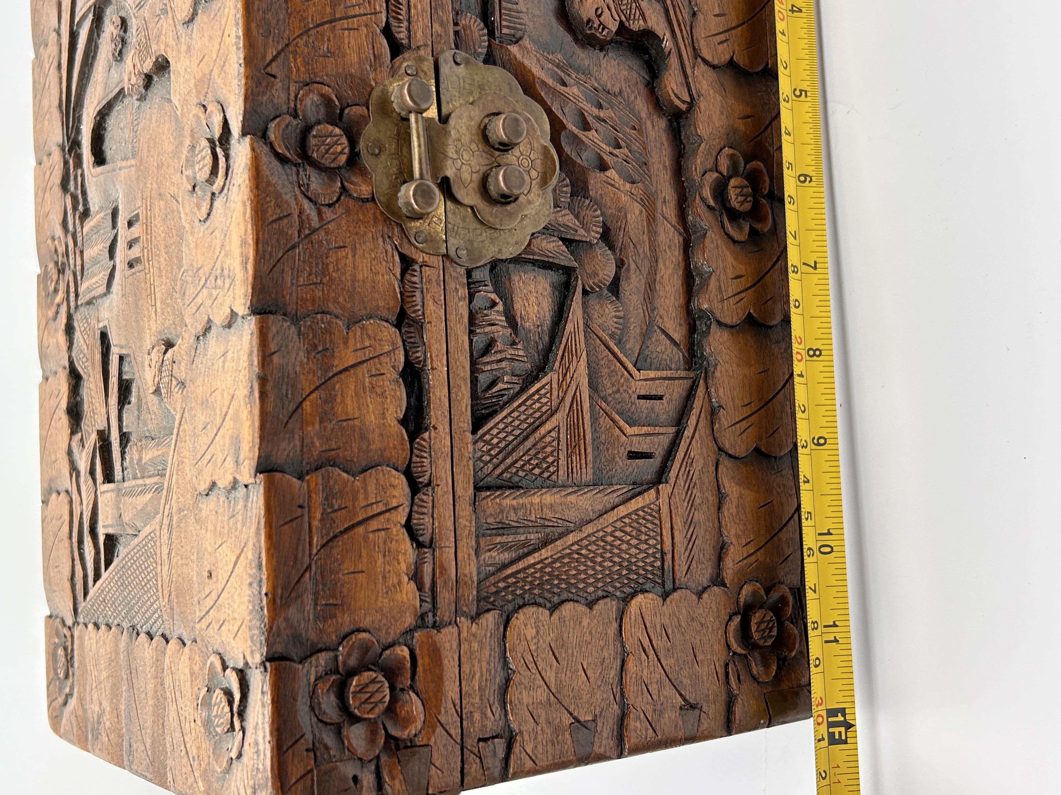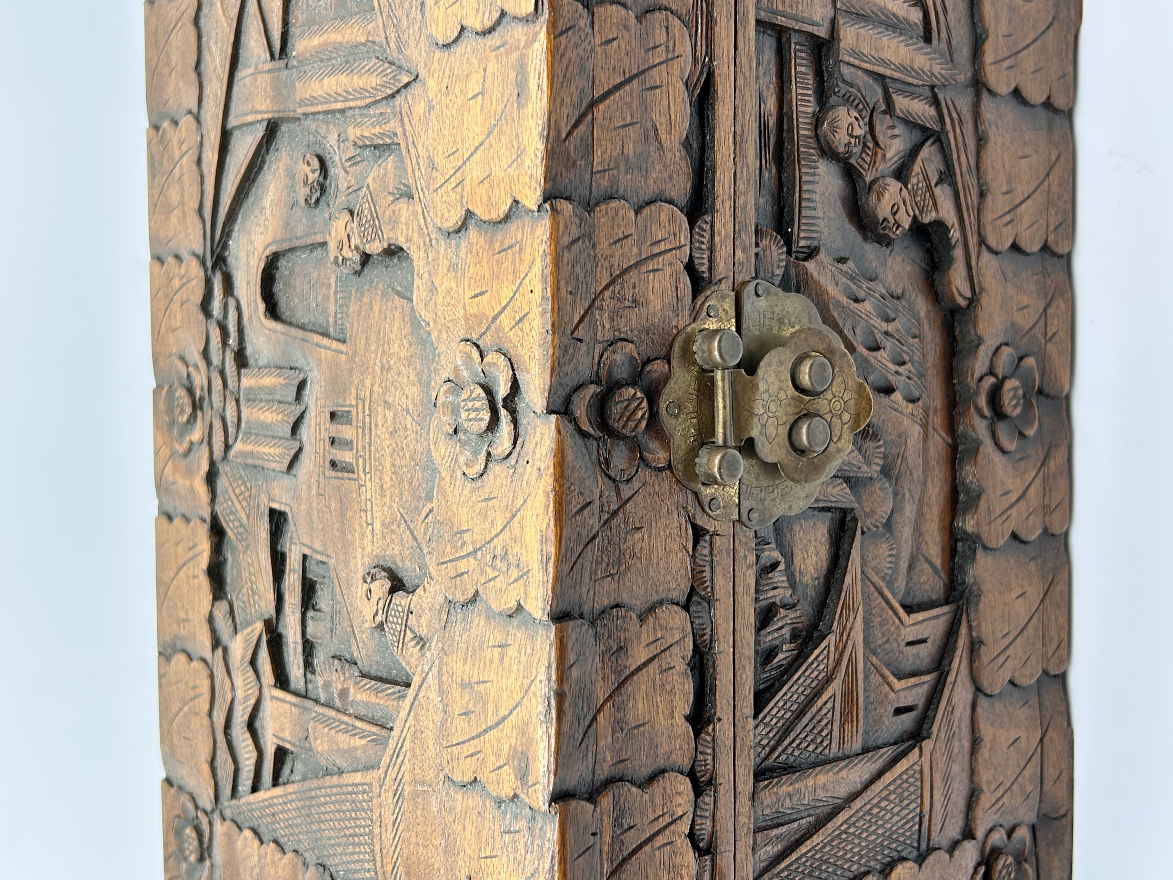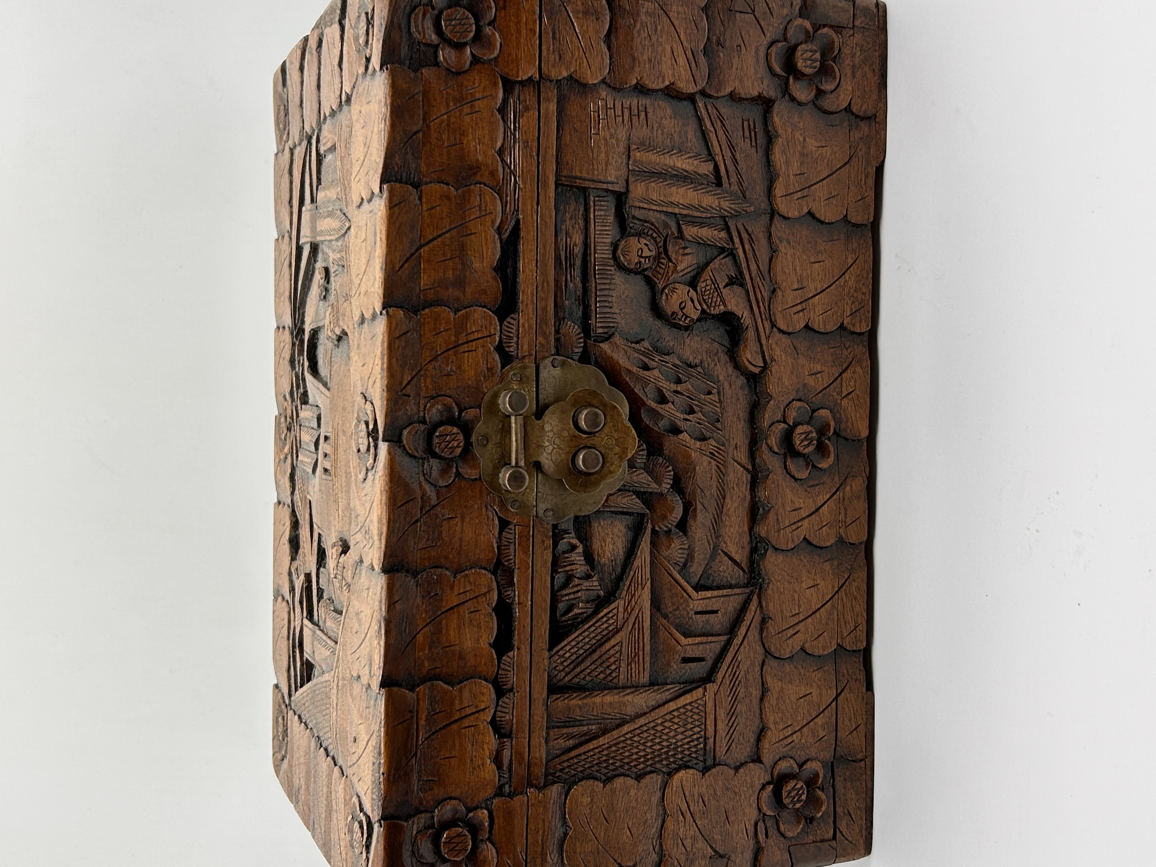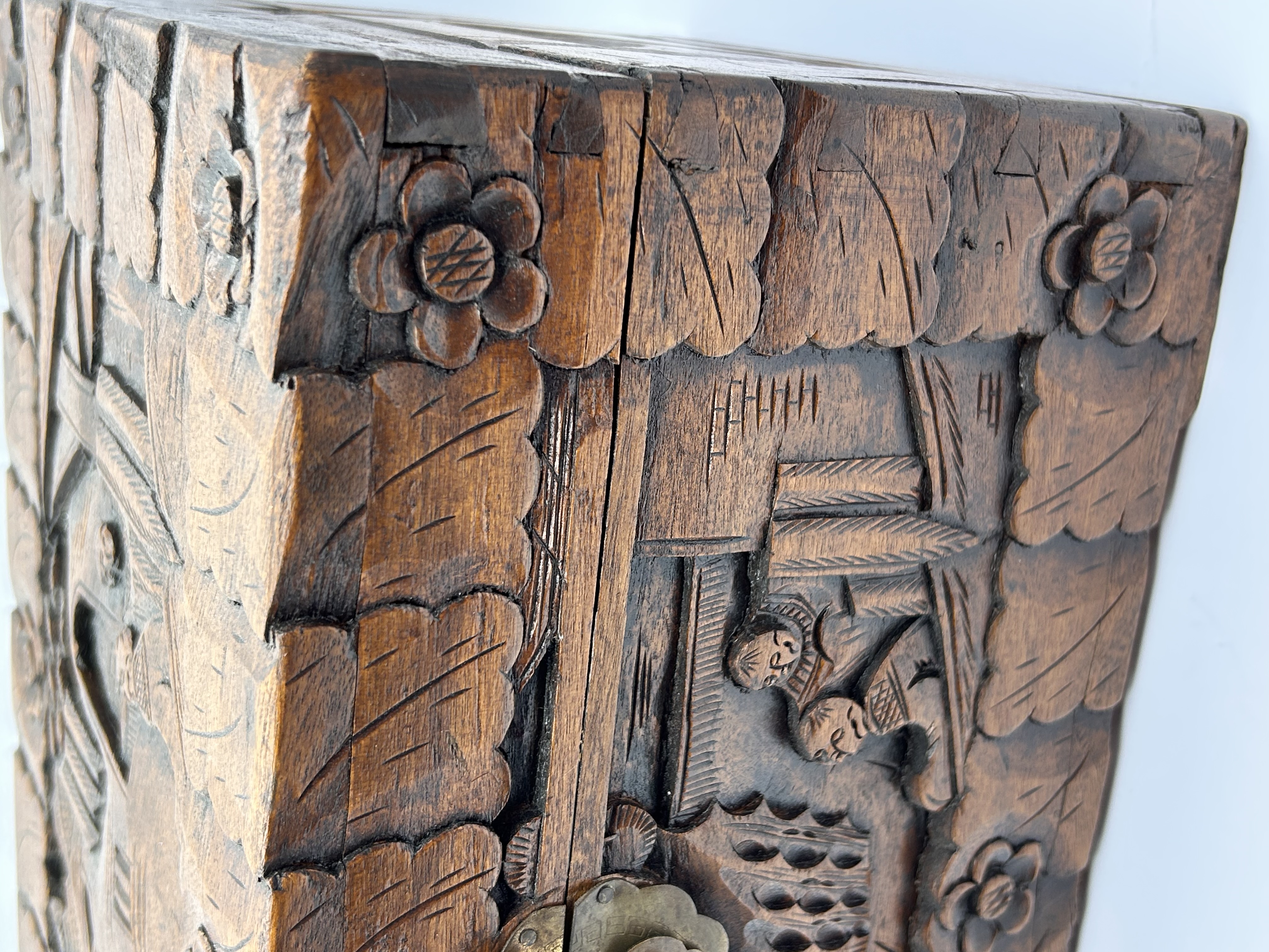 A rectangular chest identified through market consensus as an Early 20th Century Chinese Carved Camphor Wood Chest. The piece is executed in a traditional East Asian style, featuring extensive deep relief carving across the lid and front panel. The carvings depict detailed architectural scenes interspersed with figural elements. The main carved panels are framed by scalloped, leaf-like borders and punctuated by carved floral rosettes at the corners and seams. The chest is constructed of dark-stained wood and secured by a tarnished yellow metal locking clasp centered on the front panel. No external maker’s marks or inscriptions are visible.