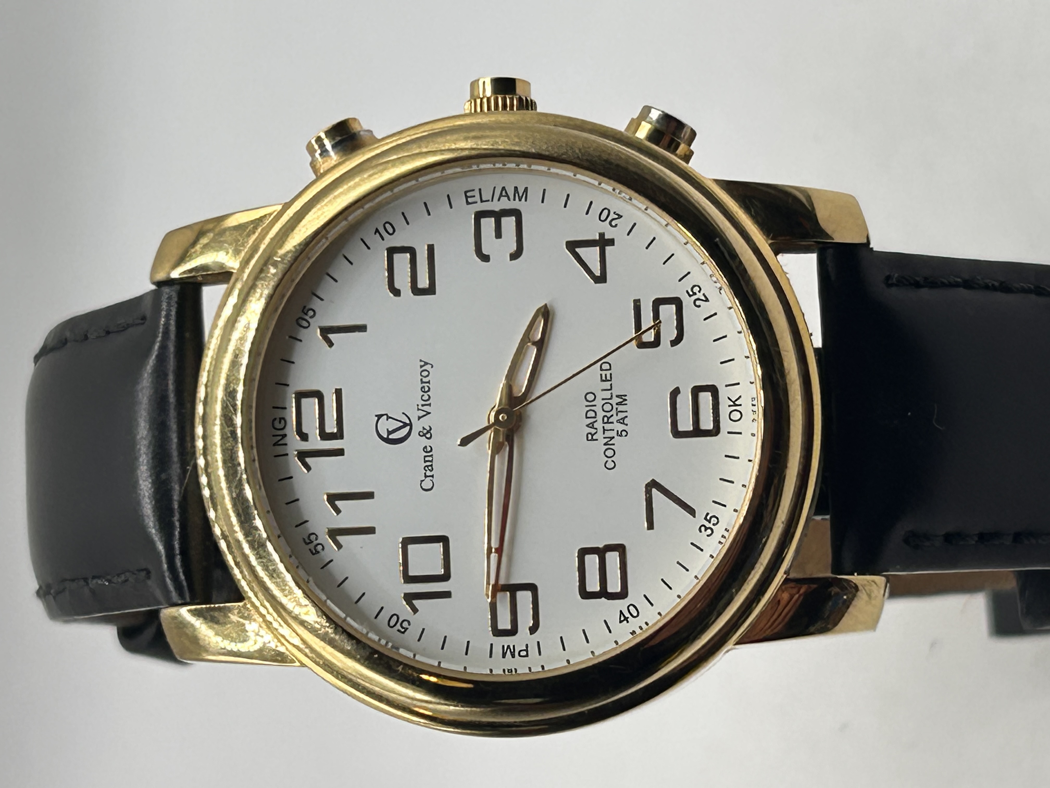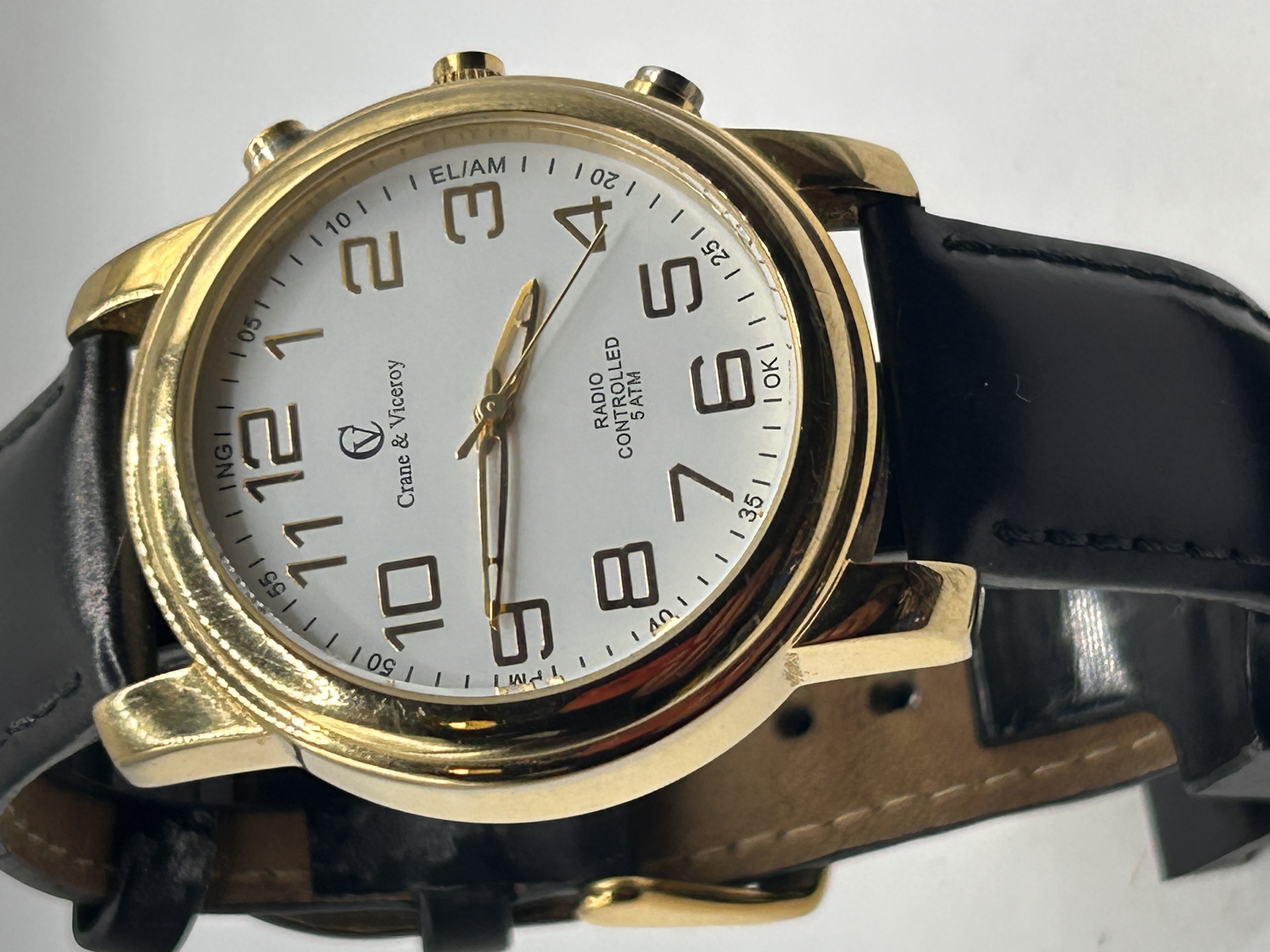A single Crane & Viceroy radio controlled wristwatch. The watch features a gold-toned round case housing a white dial. The dial is marked with bold gold-toned Arabic numeral hour markers (1-12) and three gold-toned hands. Inscriptions on the dial include the manufacturer’s mark and logo, along with the specifications RADIO CONTROLLED 5 ATM. The perimeter of the dial includes markings for various functions or settings, such as ING, EL/AM, PM, and OK. The watch is secured by a black leather strap.