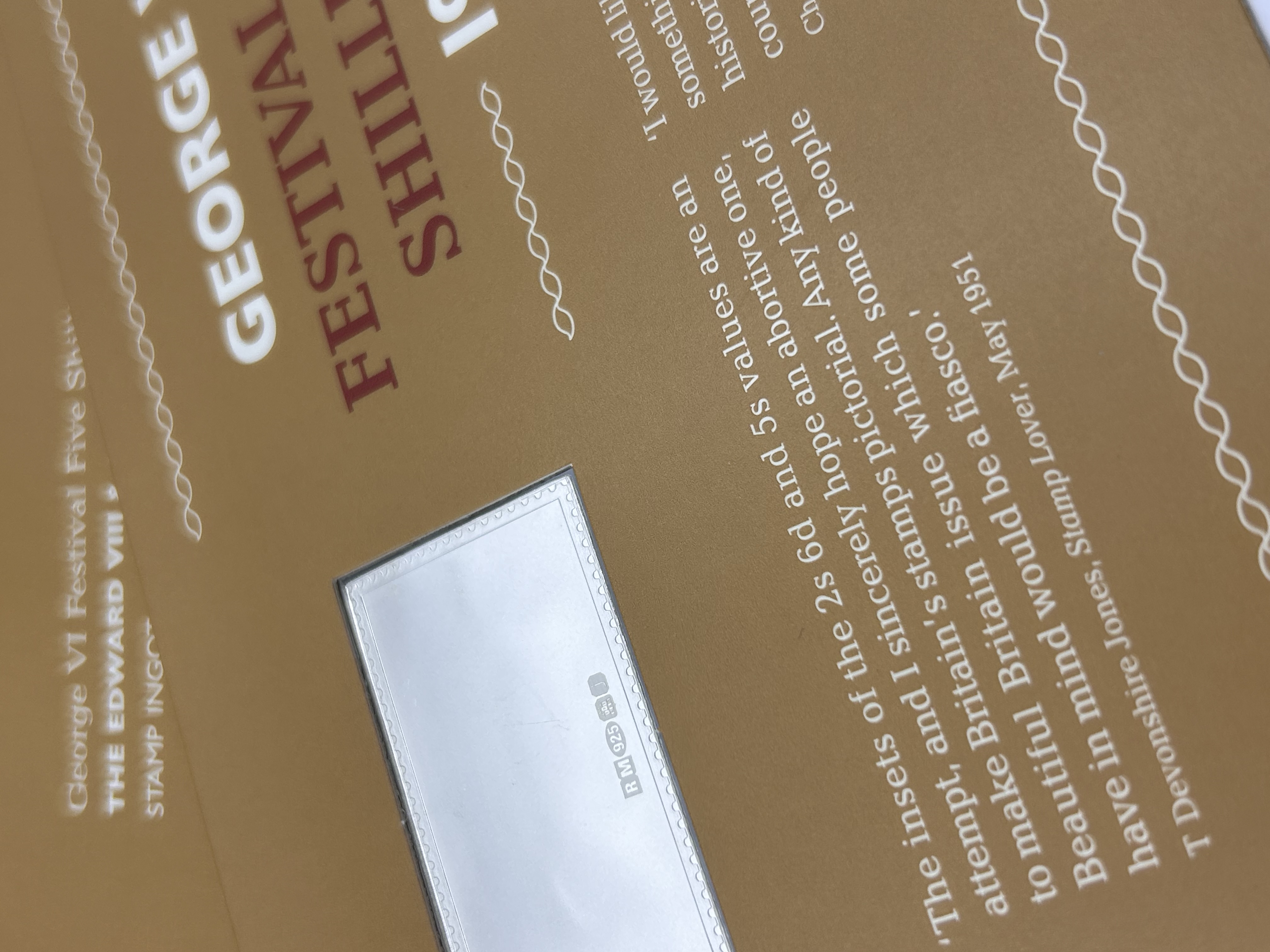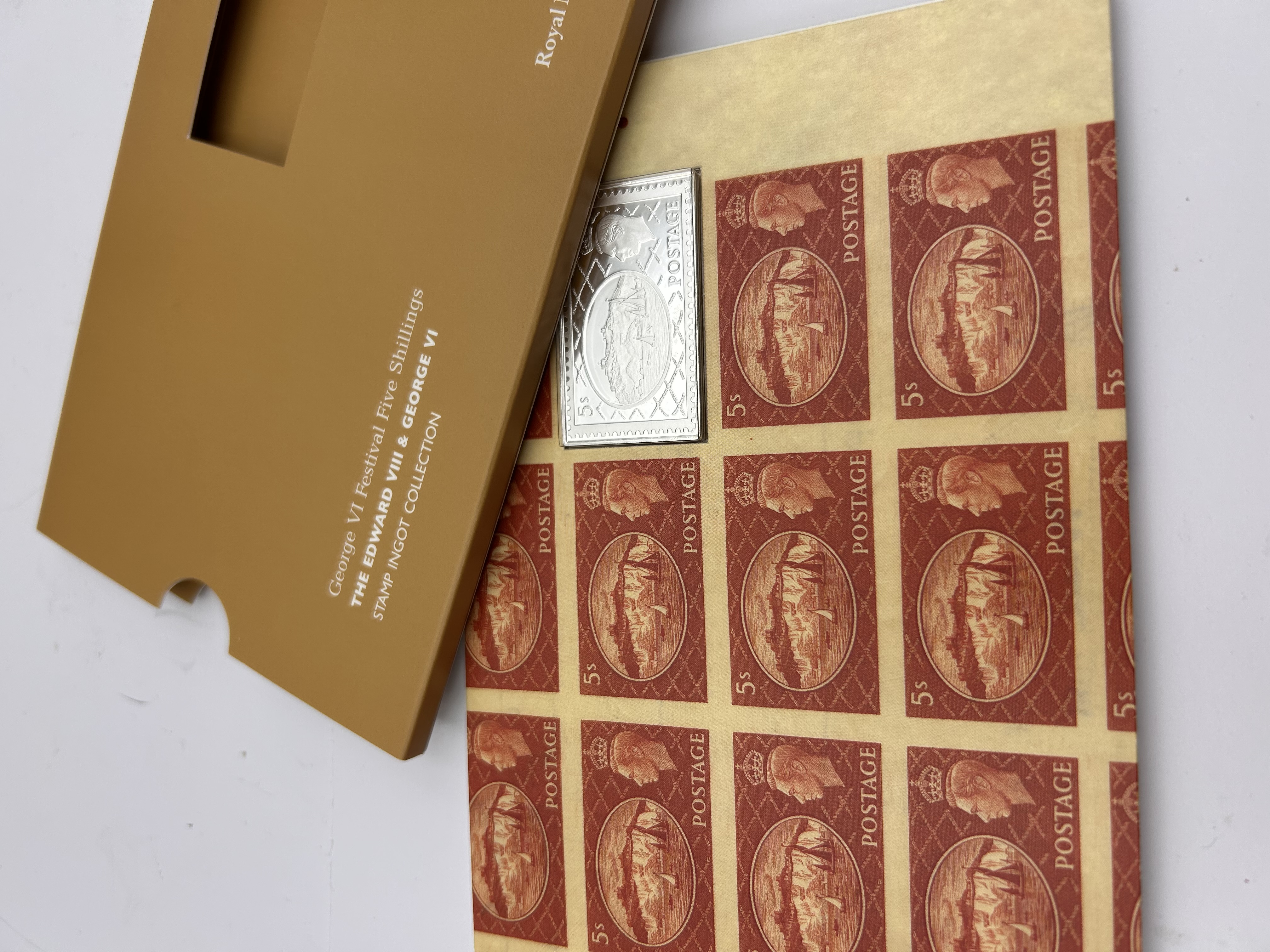 This lot comprises a collection of thirteen modern philatelic commemorative items presented within its original tan cardboard folder. The collection is identified on the packaging sleeve as the “George VI Festival Five Shillings THE EDWARD VIII & GEORGE VI STAMP INGOT COLLECTION.” The contents include a block of twelve identical printed stamp replicas and one metallic ingot. The replicas are printed in red-brown hues on a buff backing sheet, each marked “5s” and “POSTAGE,” featuring a crowned king’s profile (consistent with George VI) and a coastal scene with sailboats. The centerpiece is a rectangular metallic ingot, silver in color, styled as a serrated stamp replica bearing the same design. The ingot is marked with a visible hallmark “RM 925,” confirming its composition as sterling silver purity. The collection is consistent with a modern commemorative issue.