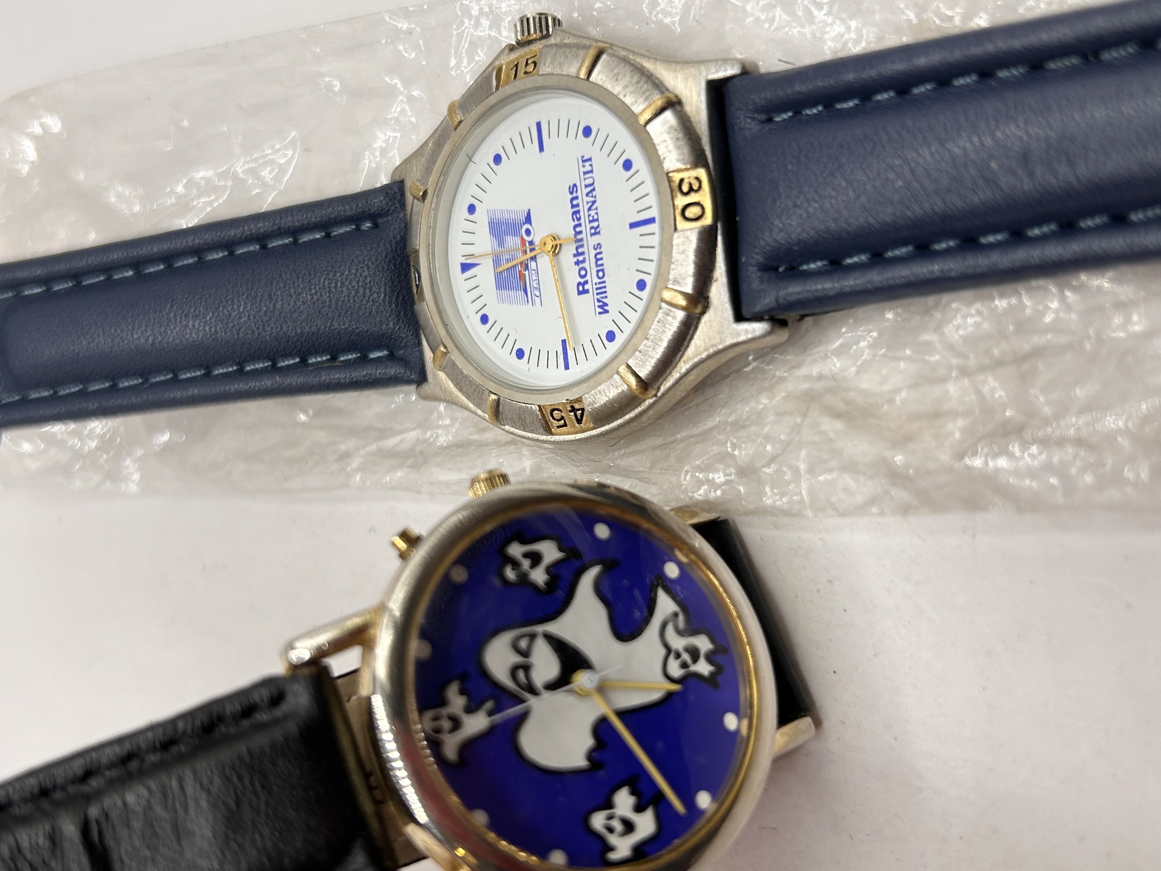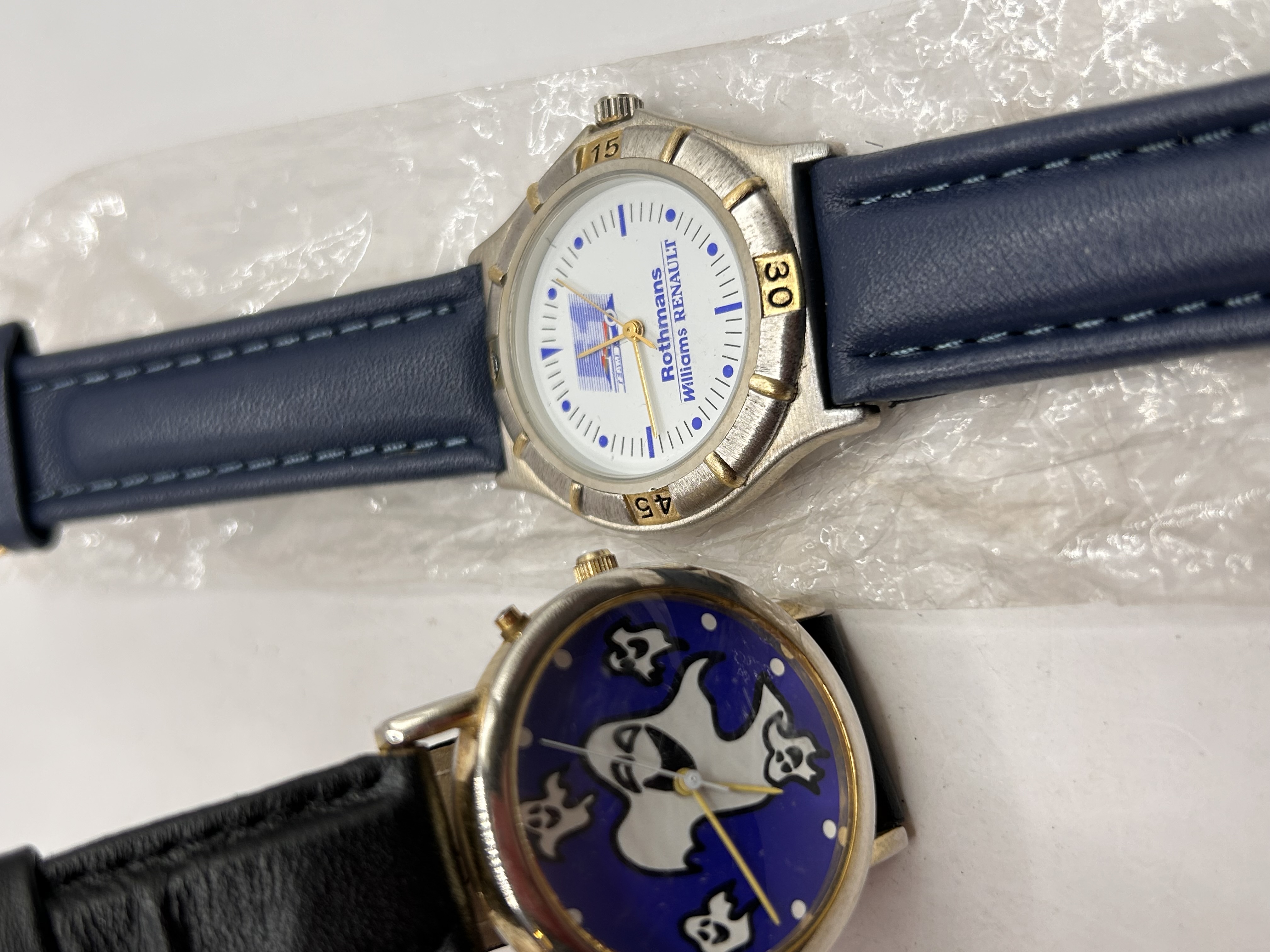 A pair of modern quartz wristwatches. The first watch is identified through market consensus as promotional merchandise for the Rothmans Williams Renault Formula 1 team, dating likely to the mid-1990s. It features a two-tone silver and gold-tone base metal case with a marked bezel and a white dial displaying the Rothmans Williams Renault logo and text beneath a racing motif. It is fitted with a dark blue faux leather or leather strap. The second watch is a novelty item featuring a round, mixed-tone case with a black strap. Its dark blue dial is decorated with a central cartoon white ghost figure surrounded by smaller floating ghosts, suggesting a novelty theme. Both watches utilize quartz movements and are constructed of base metal.