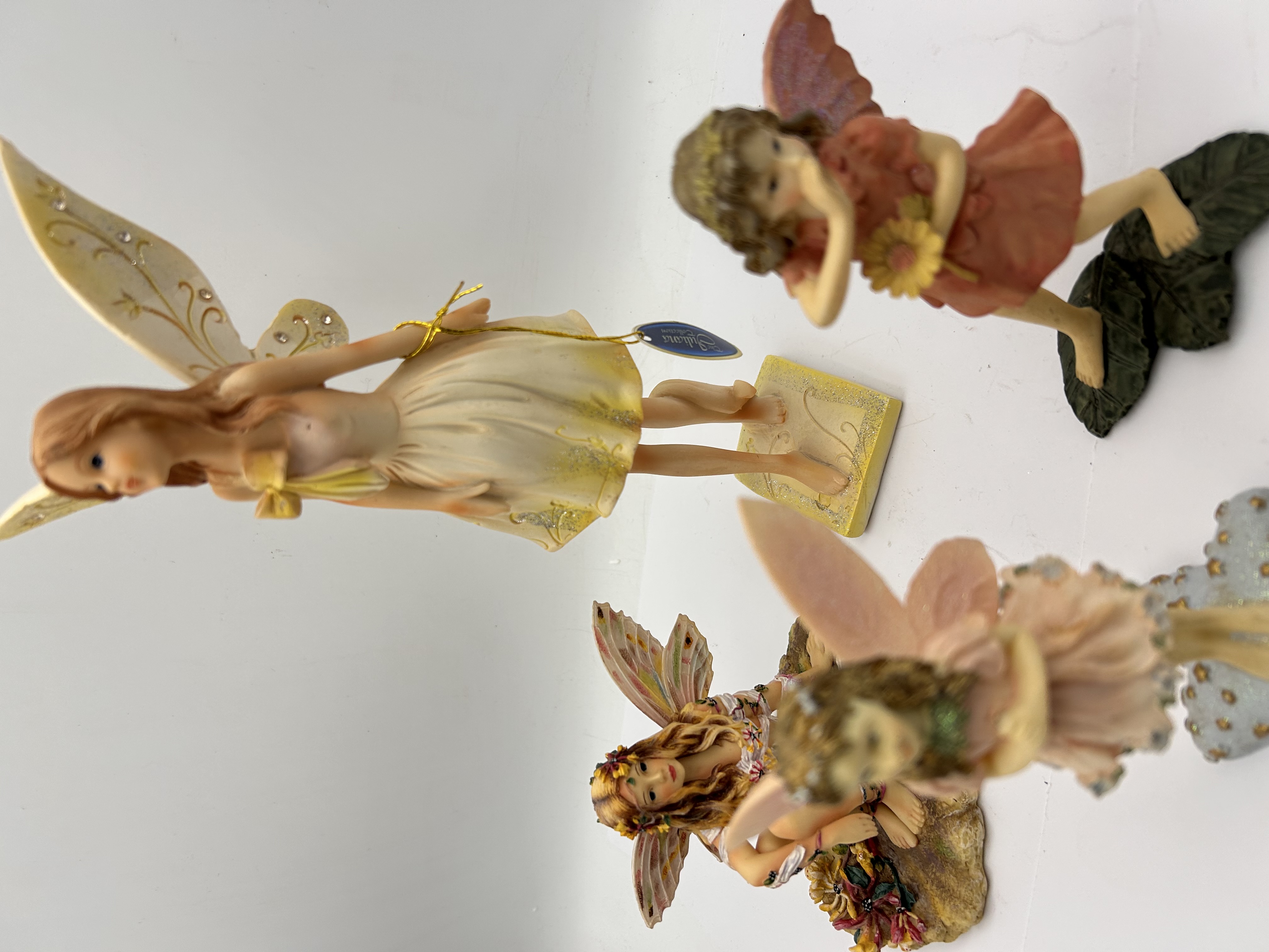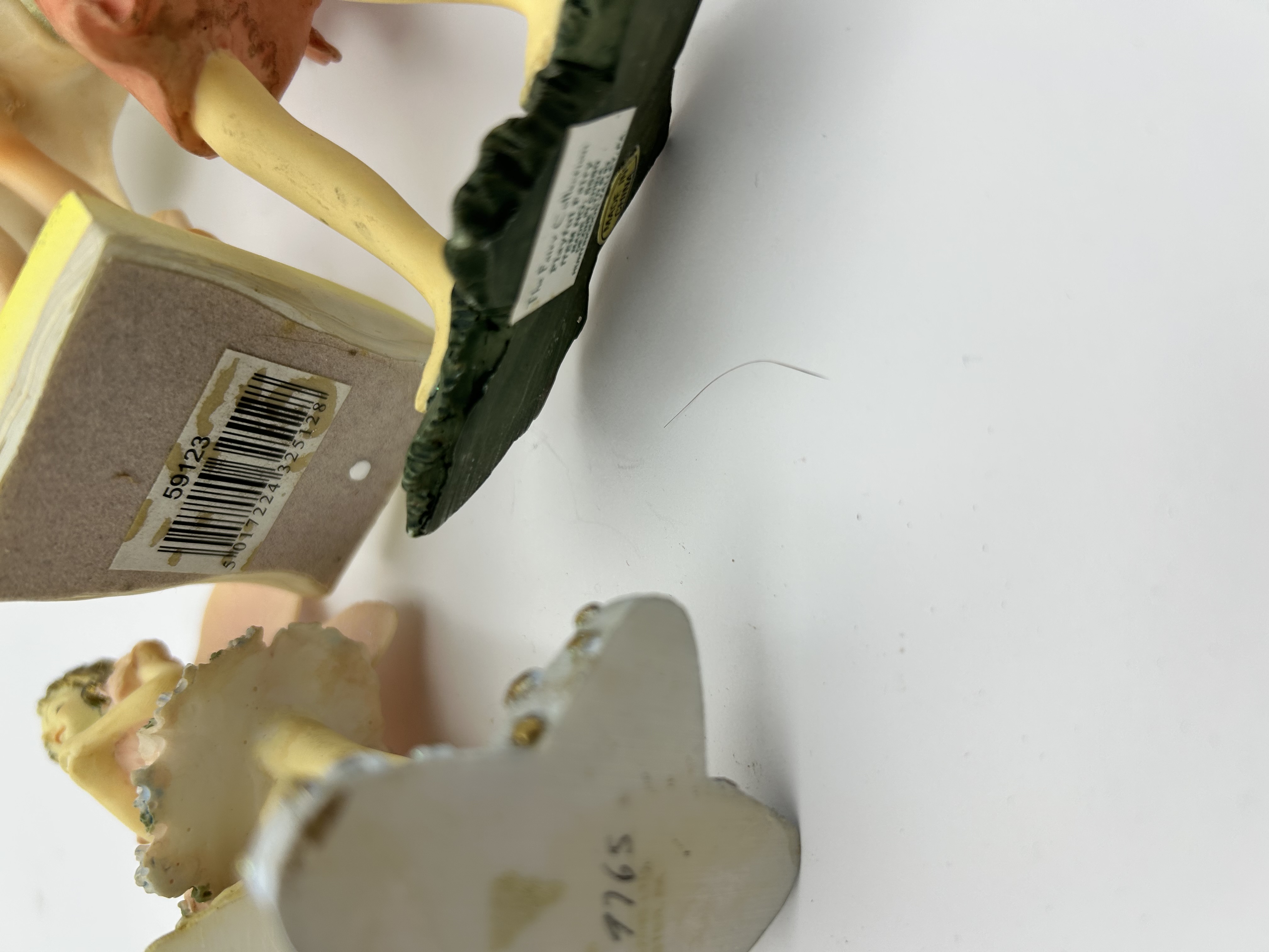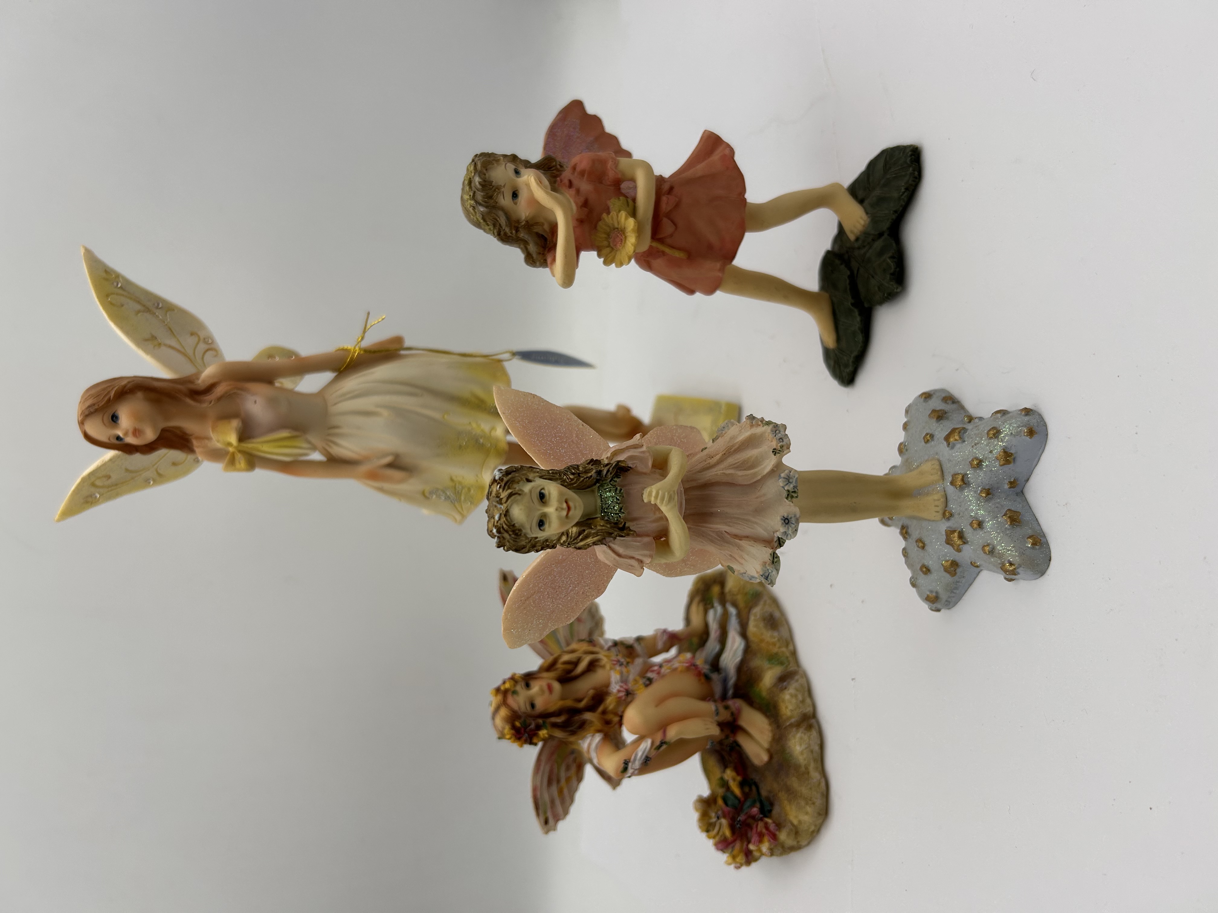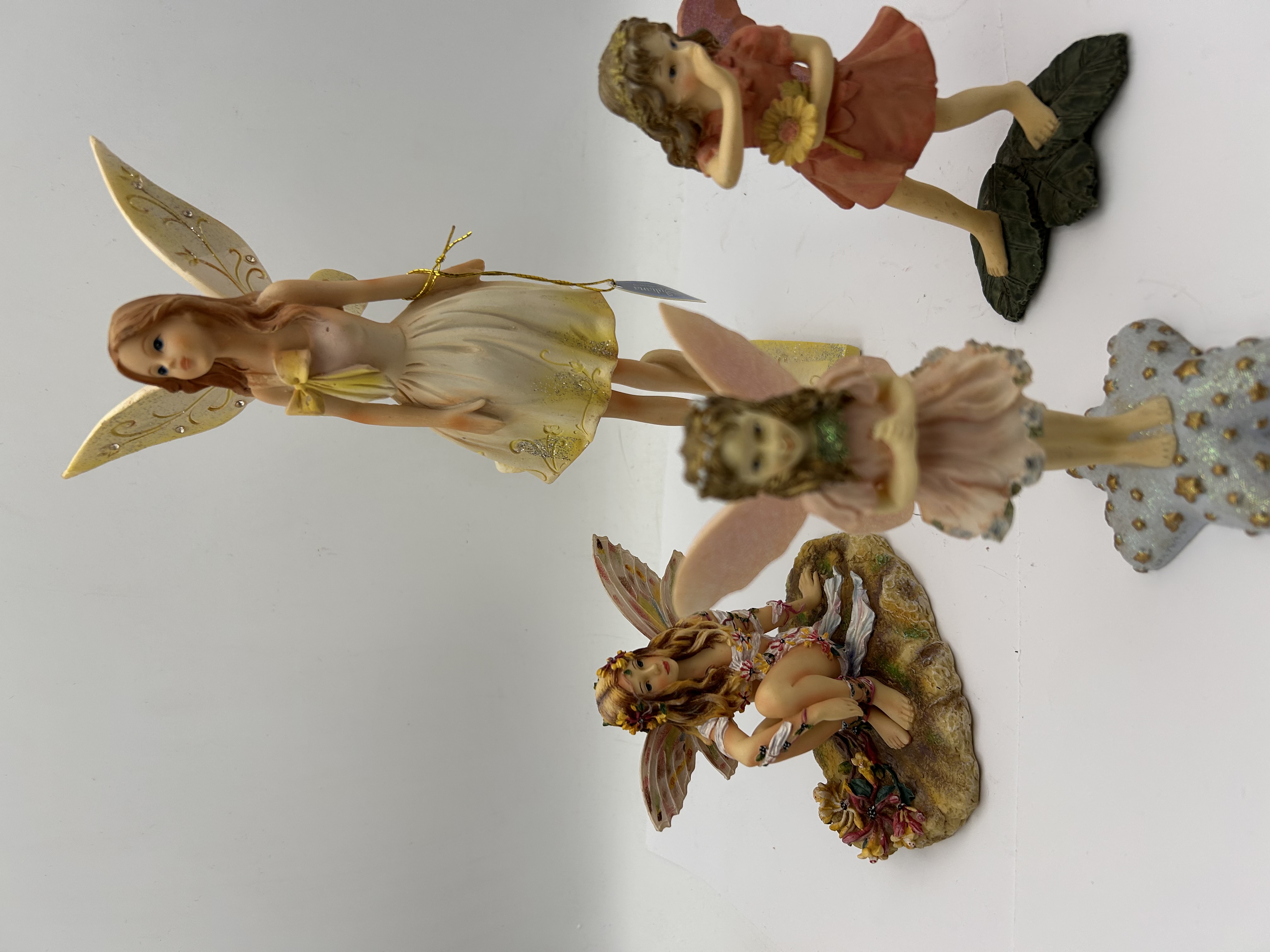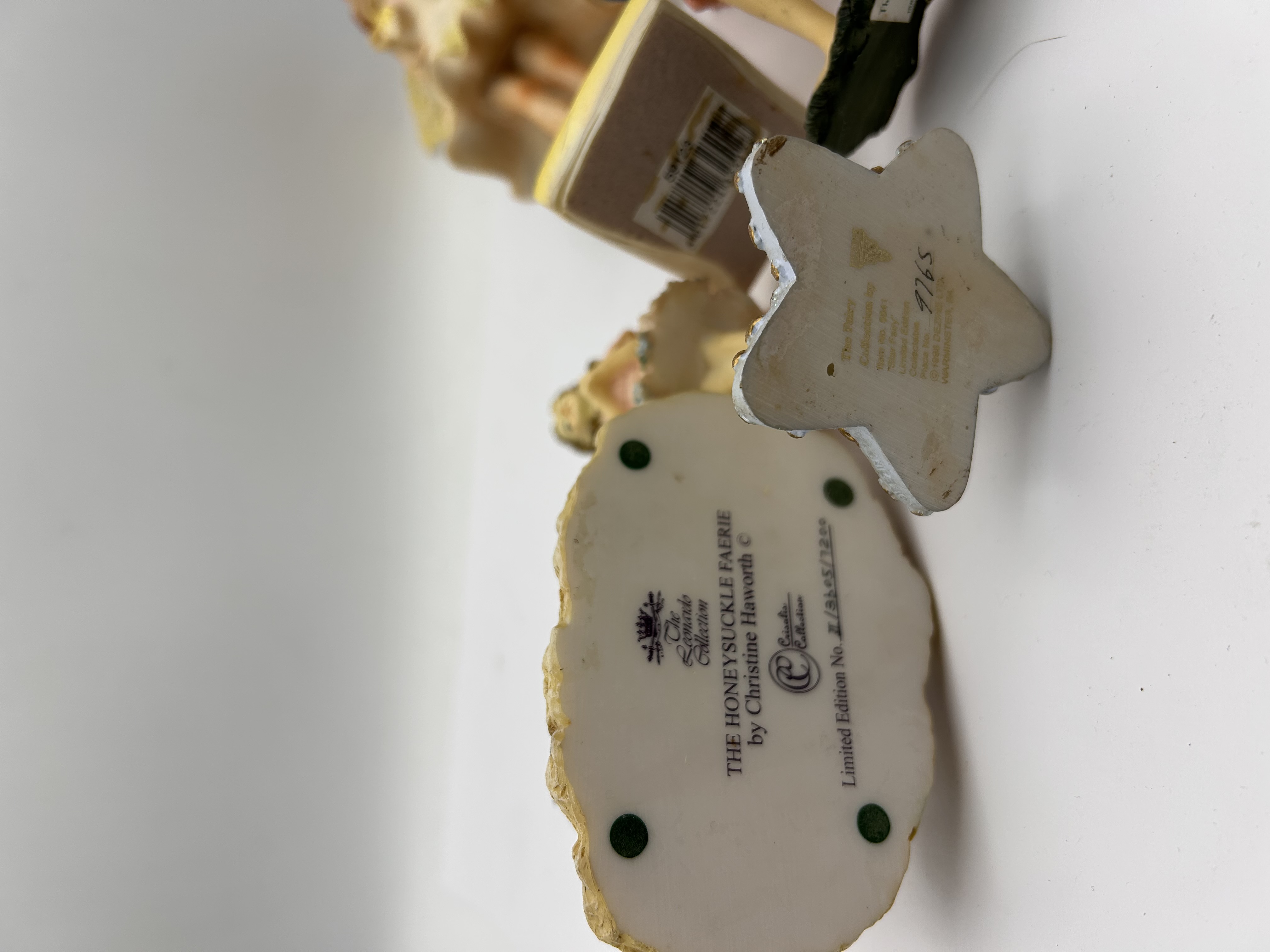 A collection of four collectible fantasy statuettes, primarily crafted from painted cold-cast resin or a similar polymer material, depicting faeries in various poses. The figures are characteristic of contemporary decorative collectibles. Two figures are explicitly identified as part of The Faerie Collection by Christine Haworth. One crouching figure is marked THE HONEYSUCKLE FAERIE and inscribed as Limited Edition No. 21/3303/7200. A second figure, standing on a star-shaped base, is marked The Folly and numbered 9765. The tallest standing fairy retains an original manufacturer’s tag and has a barcode sticker marked 59123 affixed to its rectangular base. The collection includes figures in crouching, standing, and dancing poses, featuring detailed polychrome decoration and applied glitter accents.