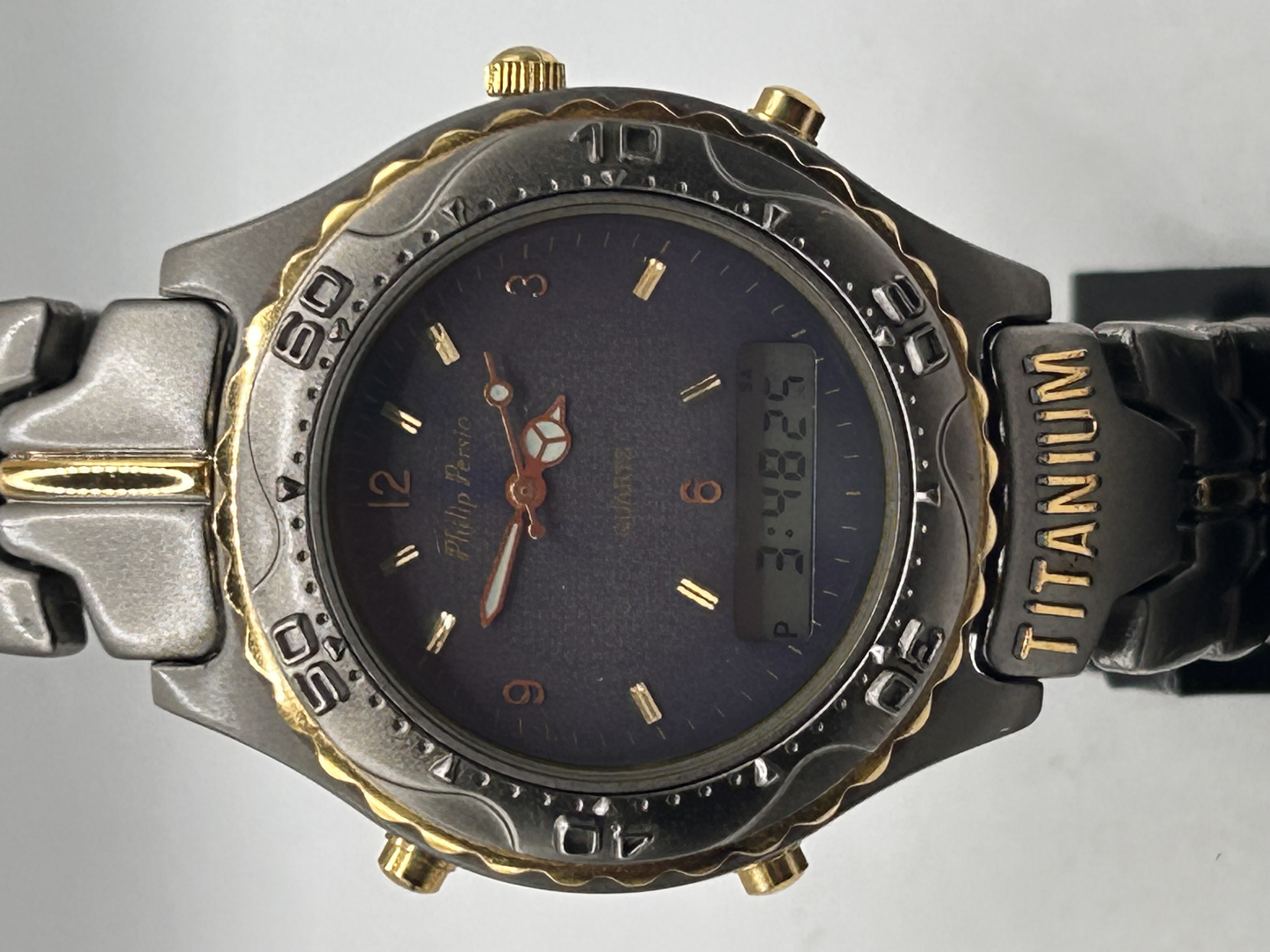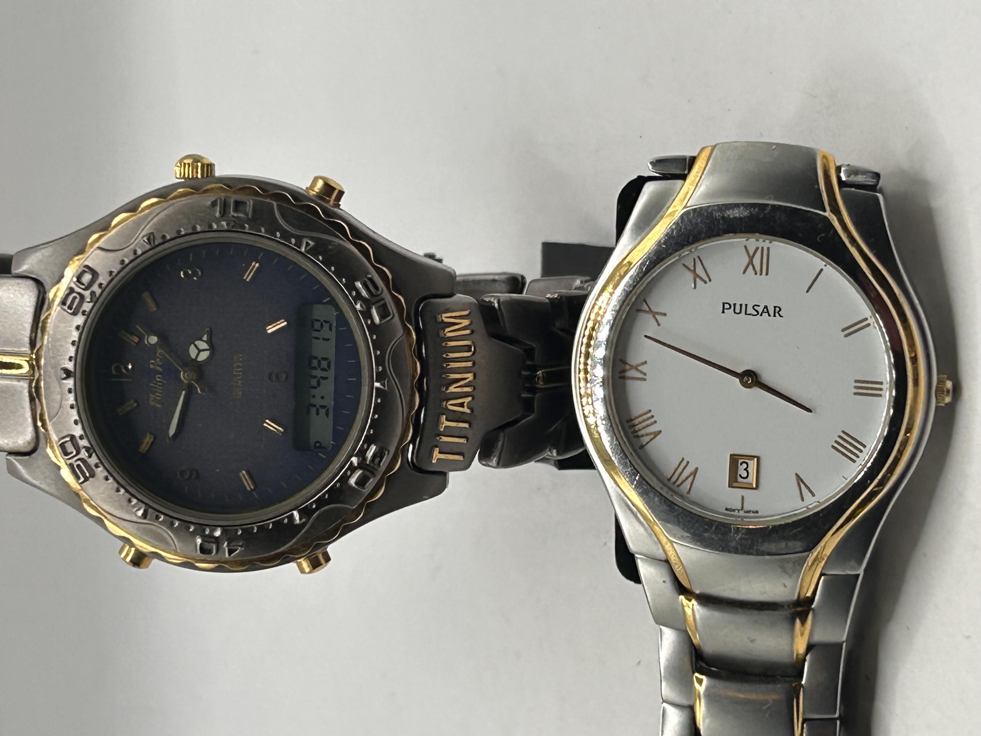 A pair of quartz two-tone wristwatches comprising one Philip Persio ana-digi model and one Pulsar analog dress model. The Philip Persio watch features a dark gray case and integrated bracelet with gold-tone accents on the crown, pushers, and textured unidirectional bezel. The bracelet is marked TITANIUM on the first link. The dark blue dial is marked Philip Persio and QUARTZ, displaying both analog hands and a digital readout. The Pulsar watch features a silver-tone case and bracelet with gold-tone accents, a white dial marked with gold-tone Roman numeral hour markers, and a date complication at the 3 o’clock position.